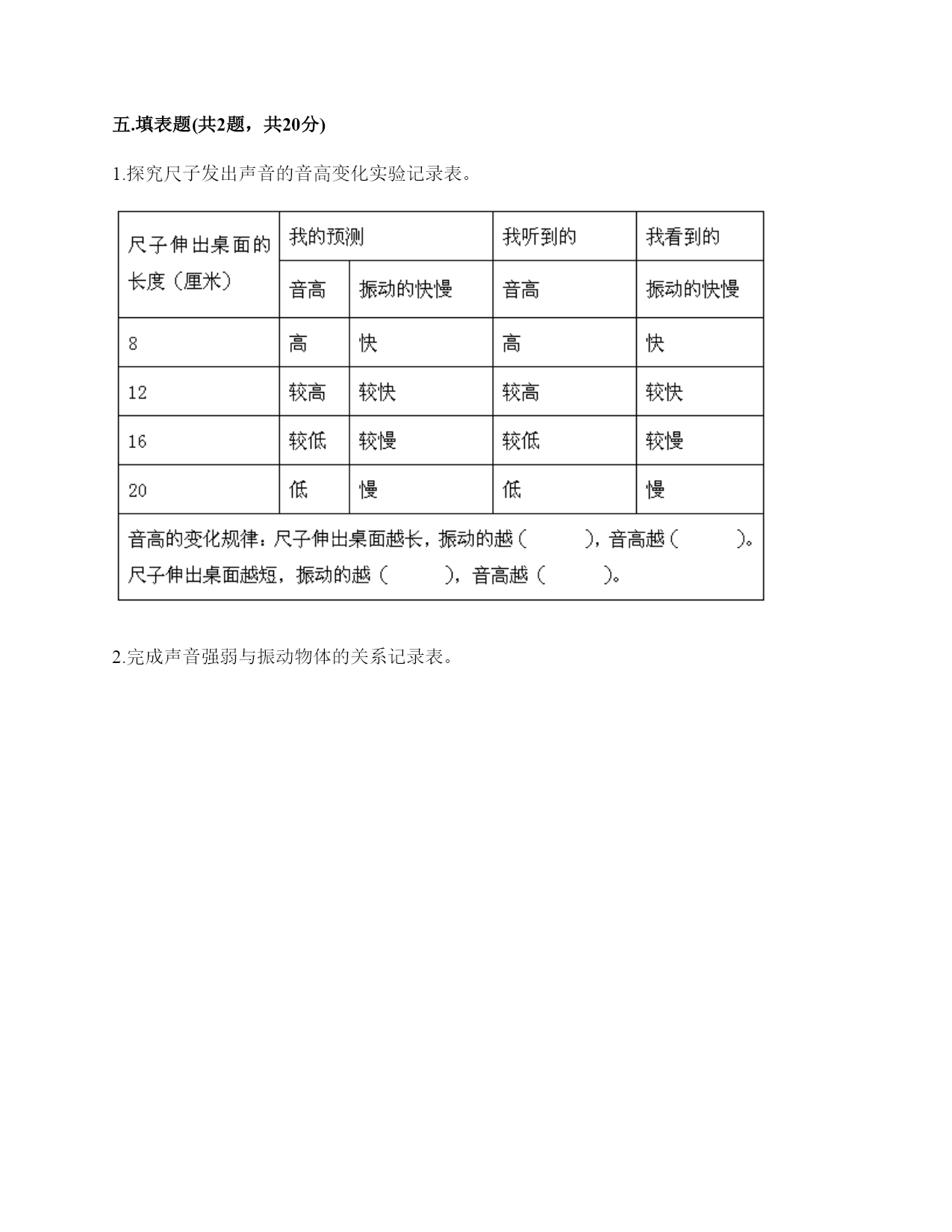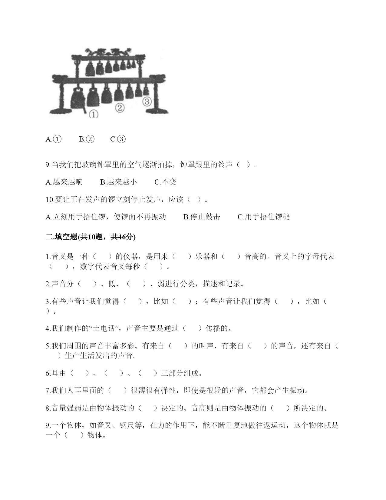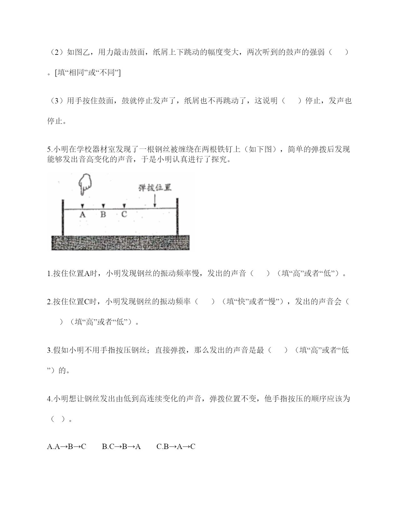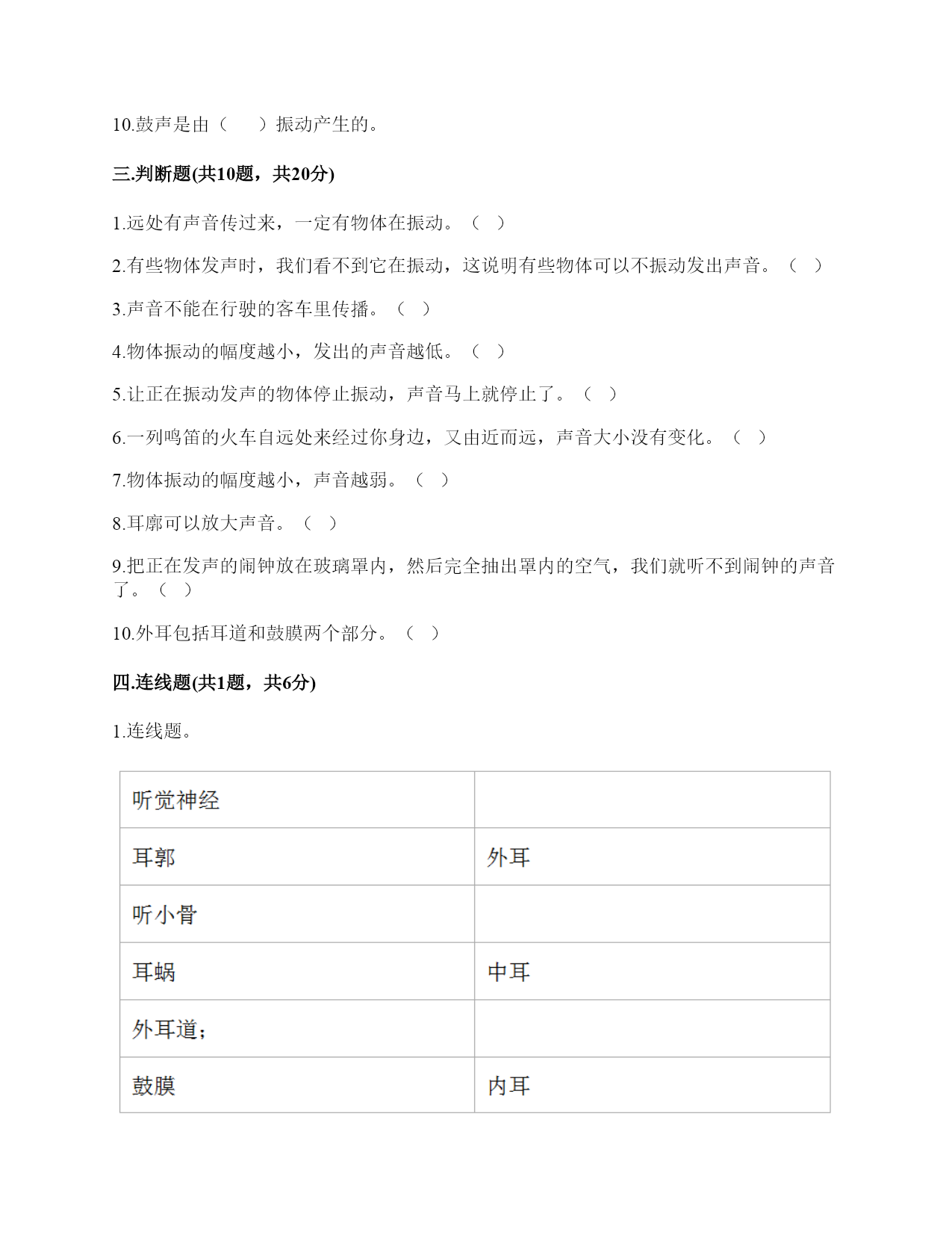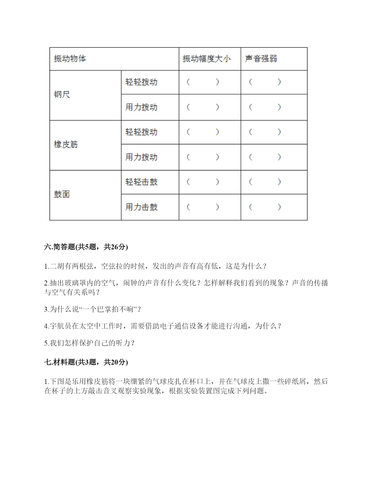 小学科学《声音》练习题一.选择题(共10题,共20分)1.流水的声音是由()。A.水的振动产生的B.空气的振动产生的C.岩石的振动产生的2.用相同的力敲击相同长度,粗细不同的钢管,发出的声音最低的是()。A.B.C.3.发生灾难时,被困在建筑物废墟里的人向外界求救的一种好方法是敲击钢管,这种方法利用了钢管的()性能好。A.传声B.导电C.通风4.将刚刚击打过的音叉触及水面,则()。A.水面没有变化B.水面产生波纹C.水位上升5.向暖水瓶中倒水时,声音会随水位的上升()。A.越来越高B.越来越低C.不会改变6.声音传播的特点有()。A.不能在液体中传播B.能在各种物体中传播C.只能在空气中传播7.我们把用力击打鼓心和轻轻击打同一鼓心时鼓发出的声音的差异称为()。A.强弱不同B.高低不同C.频率不同8.如图所示,编钟是中国古代大型打击乐器。用木锤敲打,能发出不同的乐音。图中能敲出的音高最高的编钟是()。A.①B.②C.③9.当我们把玻璃钟罩里的空气逐渐抽掉,钟罩跟里的铃声()。A.越来越响B.越来越小C.不变10.要让正在发声的锣立刻停止发声,应该()。A.立刻用手捂住锣,使锣面不再振动B.停止敲击C.用手捂住锣槌二.填空题(共10题,共46分)1.音叉是一种()的仪器,是用来()乐器和()音高的。音叉上的字母代表(),数字代表音叉每秒()。2.声音分()、低、()、弱进行分类,描述和记录。3.有些声音让我们觉得(),比如();有些声音让我们觉得(),比如()。4.我们制作的“土电话”,声音主要是通过()传播的。5.我们周围的声音丰富多彩。有来自()的叫声,有来自()的声音,还有来自()生产生活发出的声音。6.耳由()、()、()三部分组成。7.我们人耳里面的()很薄很有弹性,即使是很轻的声音,它都会产生振动。8.音量强弱是由物体振动的()决定的。音高则是由物体振动的()所决定的。9.一个物体,如音叉、钢尺等,在力的作用下,能不断重复地做往返运动,这个物体就是一个()物体。10.鼓声是由()振动产生的。三.判断题(共10题,共20分)1.远处有声音传过来,一定有物体在振动。()2.有些物体发声时,我们看不到它在振动,这说明有些物体可以不振动发出声音。()3.声音不能在行驶的客车里传播。()4.物体振动的幅度越小,发出的声音越低。()5.让正在振动发声的物体停止振动,声音马上就停止了。()6.一列鸣笛的火车自远处来经过你身边,又由近而远,声音大小没有变化。()7.物体振动的幅度越小,声音越弱。()8.耳廓可以放大声音。()9.把正在发声的闹钟放在玻璃罩内,然后完全抽出罩内的空气,我们就听不到闹钟的声音了。()10.外耳包括耳道和鼓膜两个部分。()四.连线题(共1题,共6分)1.连线题。五.填表题(共2题,共20分)1.探究尺子发出声音的音高变化实验记录表。2.完成声音强弱与振动物体的关系记录表。六.简答题(共5题,共26分)1.二胡有两根弦,空弦拉的时候,发出的声音有高有低,这是为什么?2.抽出玻璃罩内的空气,闹钟的声音有什么变化?怎样解释我们看到的现象?声音的传播与空气有关系吗?3.为什么说“一个巴掌拍不响”?4.宇航员在太空中工作时,需要借助电子通信设备才能进行沟通,为什么?5.我们怎样保护自己的听力?七.材料题(共3题,共20分)1.下图是乐用橡皮筋将一块绷紧的气球皮扎在杯口上,并在气球皮上撒一些碎纸屑,然后在杯子的上方敲击音叉观察实验现象,根据实验装置图完成下列问题。1、这是模拟()的装置。A.物体振动产生声音B.耳朵鼓膜振动C.液体溶解2、实验中敲击普叉发出的声音通过()传到气球皮上。A.音叉B.空气C.杯子3、实验时用力敲击音叉,观察到气球皮上的碎纸屑()。A.被音叉吸引B.不动C.在气球皮上跳动4、实验时用力敲音叉,气球皮上的碎纸屑跳动幅度与轻敲时相比,()。A.跳动幅度小B.跳动幅度大C.一样5、通过这个实验,我们可以知道我们耳朵里的(),它就像这个气球皮一样很薄,而且有弹性,它时时刻刻都在接收着各种声音,并产生振动。A.耳道B.鼓膜C.听小晋2.小明有3根长短相同,粗细不同的钢管,小丽说:“我可以闭上眼睛,只通过用相同的力敲击钢管就可以判断它们的粗细。”请解释其中的原理。3.用三个塑料袋分别装上沙子、水和空气封口,将三个塑料袋分别放在桌子上,一只耳朵轻轻地贴在塑料袋上,捂住另一只耳朵。在距离一臂远处,用铅笔上的橡皮轻轻敲击桌面。请分析隔着哪个塑料袋听到的声音效果好,并试着排序。八.综合题(共5题,共41分)1.唐代诗人胡令能写过一首诗:“蓬头稚子学垂纶,侧坐莓台草映