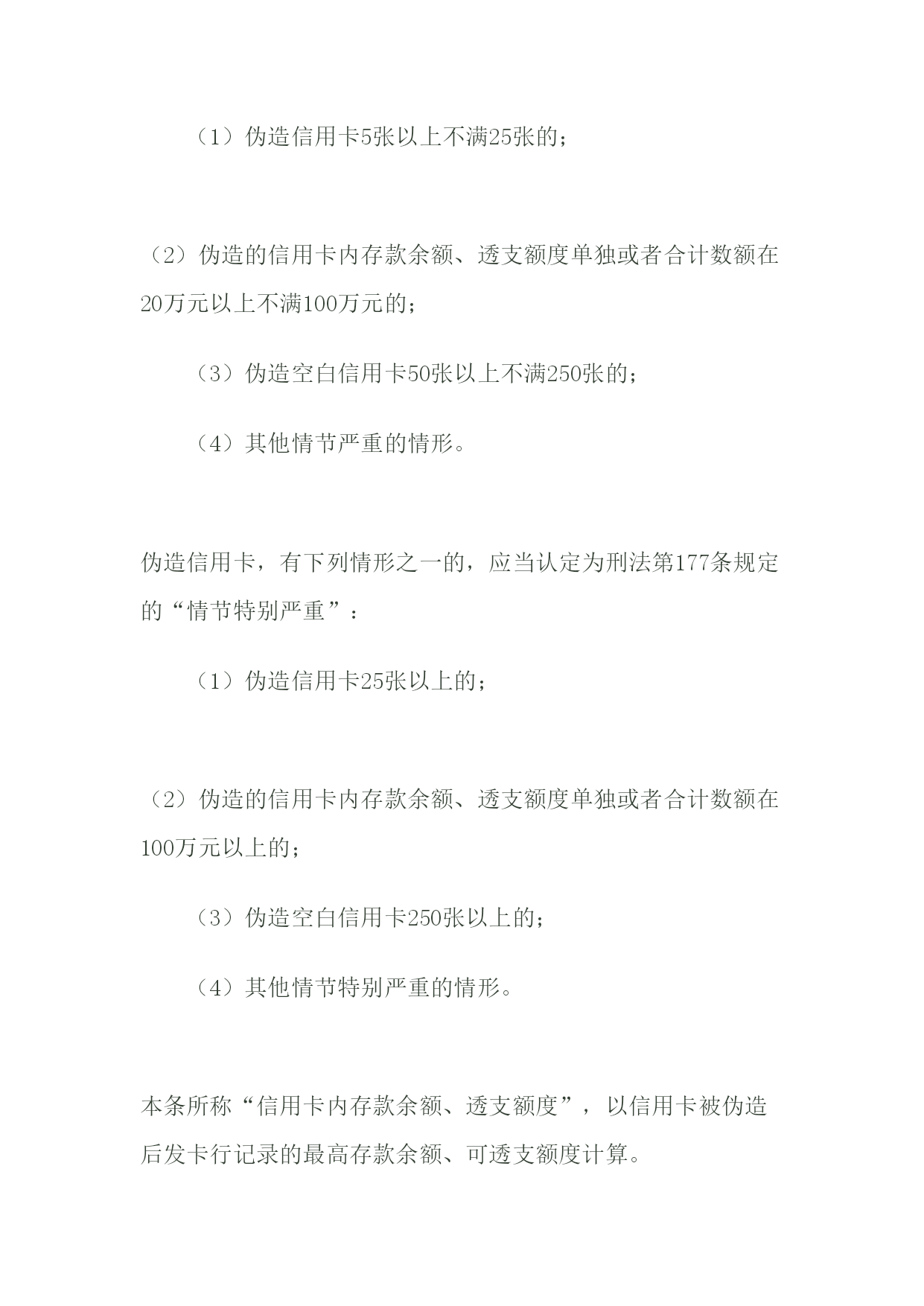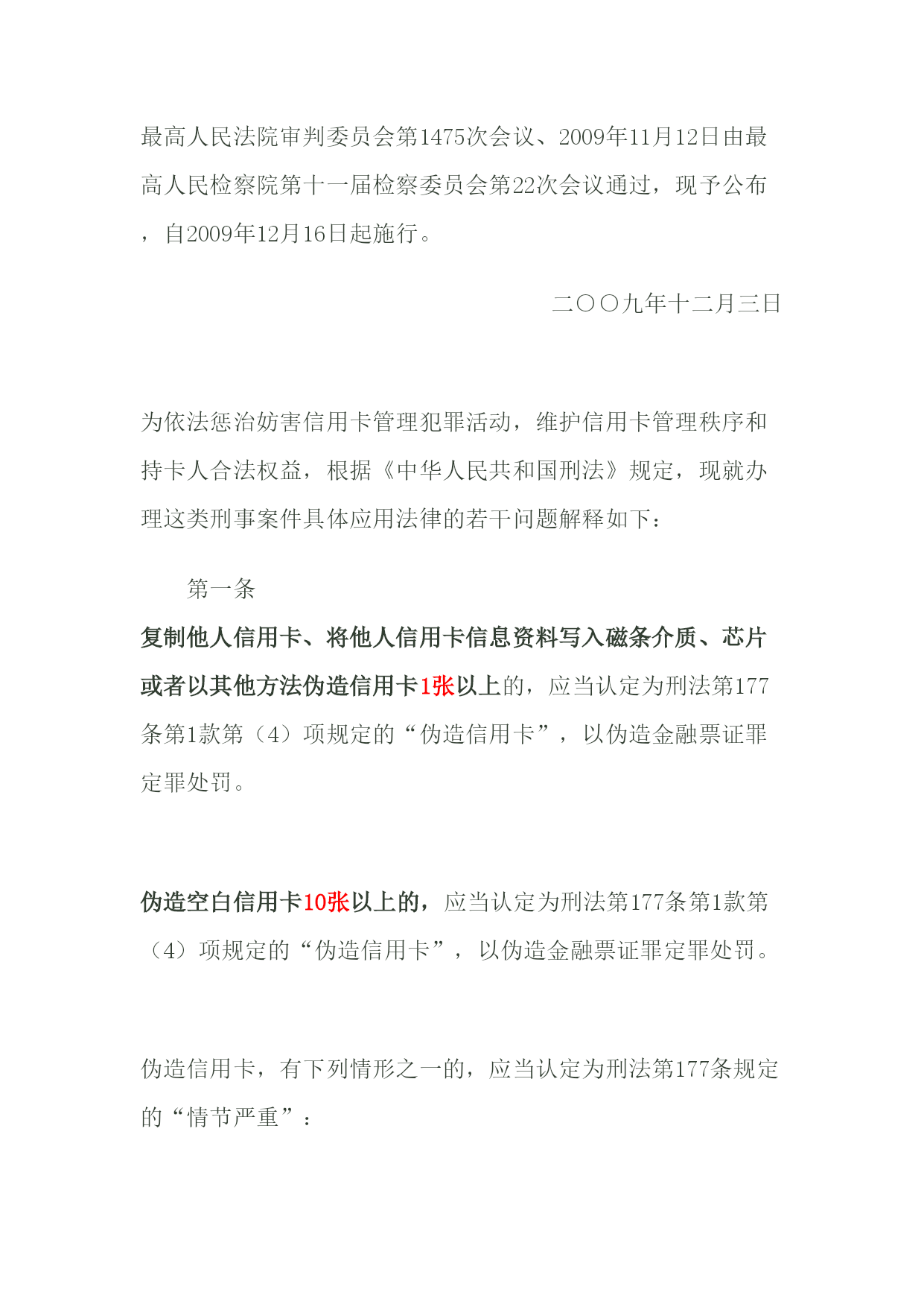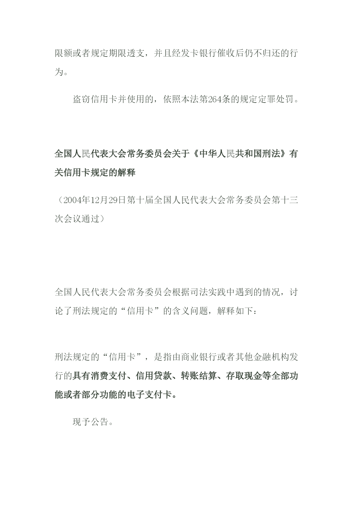 信用卡诈骗犯罪相关司法解释周铭川律师《刑法》:第177条(伪造、变造金融票证罪)有下列情形之一,伪造、变造金融票证的,处五年以下有期徒刑或者拘役,并处或者单处二万元以上二十万元以下罚金;情节严重的,处五年以上十年以下有期徒刑,并处五万元以上五十万元以下罚金;情节特别严重的,处十年以上有期徒刑或者无期徒刑,并处五万元以上五十万元以下罚金或者没收财产:(1)伪造、变造汇票、本票、支票的;(2)伪造、变造委托收款凭证、汇款凭证、银行存单等其他银行结算凭证的;(3)伪造、变造信用证或者附随的单据、文件的;(4)伪造信用卡的。单位犯前款罪的,对单位判处罚金,并对其直接负责的主管人员和其他直接责任人员,依照前款的规定处罚。第177条之一(妨害信用卡管理罪)有下列情形之一,妨害信用卡管理的,处三年以下有期徒刑或者拘役,并处或者单处一万元以上十万元以下罚金;数量巨大或者有其他严重情节的,处三年以上十年以下有期徒刑,并处二万元以上二十万元以下罚金:(1)明知是伪造的信用卡而持有、运输的,或者明知是伪造的空白信用卡而持有、运输,数量较大的;(2)非法持有他人信用卡,数量较大的;(3)使用虚假的身份证明骗领信用卡的;(4)出售、购买、为他人提供伪造的信用卡或者以虚假的身份证明骗领的信用卡的。(窃取、收买、非法提供信用卡信息资料罪)窃取、收买或者非法提供他人信用卡信息资料的,依照前款规定处罚。银行或者其他金融机构的工作人员利用职务上的便利,犯第二款罪的,从重处罚。{根据刑法修正案(五)增加此条}第196条(信用卡诈骗罪)有下列情形之一,进行信用卡诈骗活动,数额较大的,处五年以下有期徒刑或者拘役,并处二万元以上二十万元以下罚金;数额巨大或者有其他严重情节的,处五年以上十年以下有期徒刑,并处五万元以上五十万元以下罚金;数额特别巨大或者有其他特别严重情节的,处十年以上有期徒刑或者无期徒刑,并处五万元以上五十万元以下罚金或者没收财产:(1)使用伪造的信用卡,或者使用以虚假的身份证明骗领的信用卡的;(2)使用作废的信用卡的;(3)冒用他人信用卡的;(4)恶意透支的。前款所称恶意透支,是指持卡人以非法占有为目的,超过规定限额或者规定期限透支,并且经发卡银行催收后仍不归还的行为。盗窃信用卡并使用的,依照本法第264条的规定定罪处罚。全国人民代表大会常务委员会关于《中华人民共和国刑法》有关信用卡规定的解释(2004年12月29日第十届全国人民代表大会常务委员会第十三次会议通过)全国人民代表大会常务委员会根据司法实践中遇到的情况,讨论了刑法规定的“信用卡”的含义问题,解释如下:刑法规定的“信用卡”,是指由商业银行或者其他金融机构发行的具有消费支付、信用贷款、转账结算、存取现金等全部功能或者部分功能的电子支付卡。现予公告。最高人民法院关于长城万事达信用卡透支利息不应计算复利的批复法复[1996]18号颁布日期:19961129实施日期:19961129颁布单位:最高人民法院广东省高级人民法院:你院(1996)粤高法民第5号请示收悉。关于长城万事达信用卡透支利息是否可以计算复利的问题,经研究,批复如下:关于信用卡透支利息的计算方法,中国人民银行银发(1992)298号《信用卡业务管理暂行办法》作了规定,应当按该办法规定的方法计算。该办法对透支利率的规定已含有惩罚的性质。所以,信用卡透支不应当再计算复利。1996年11月29日最高人民检察院关于拾得他人信用卡并在自动柜员机(ATM机)上使用的行为如何定性问题的批复高检发释字[2008]1号颁布日期:20080418实施日期:20080507颁布单位:最高人民检察院2008年2月19日最高人民检察院第十届检察委员会第九十二次会议通过,现予公布,自2008年5月7日起施行。最高人民检察院2008年4月18日浙江省人民检察院:你院《关于拾得他人信用卡并在ATM机上使用的行为应如何定性的请示》(浙检研[2007]227号)收悉。经研究,批复如下:拾得他人信用卡并在自动柜员机(ATM机)上使用的行为,属于刑法第一百九十六条第一款第(三)项规定的“冒用他人信用卡”的情形,构成犯罪的,以信用卡诈骗罪追究刑事责任。此复。最高人民法院、最高人民检察院关于办理妨害信用卡管理刑事案件具体应用法律若干问题的解释法释[2009]19号(2009年10月12日最高人民法院审判委员会第1475次会议、2009年11月12日最高人民检察院第十一届检察委员会第22次会议通过)颁布日期:20091203实施日期:20091216颁布单位:最高人民法院、最高人民检察院《最高人民法院、最高人民检察院关于办理妨害信用卡管理刑事案件具体应用法律若干问