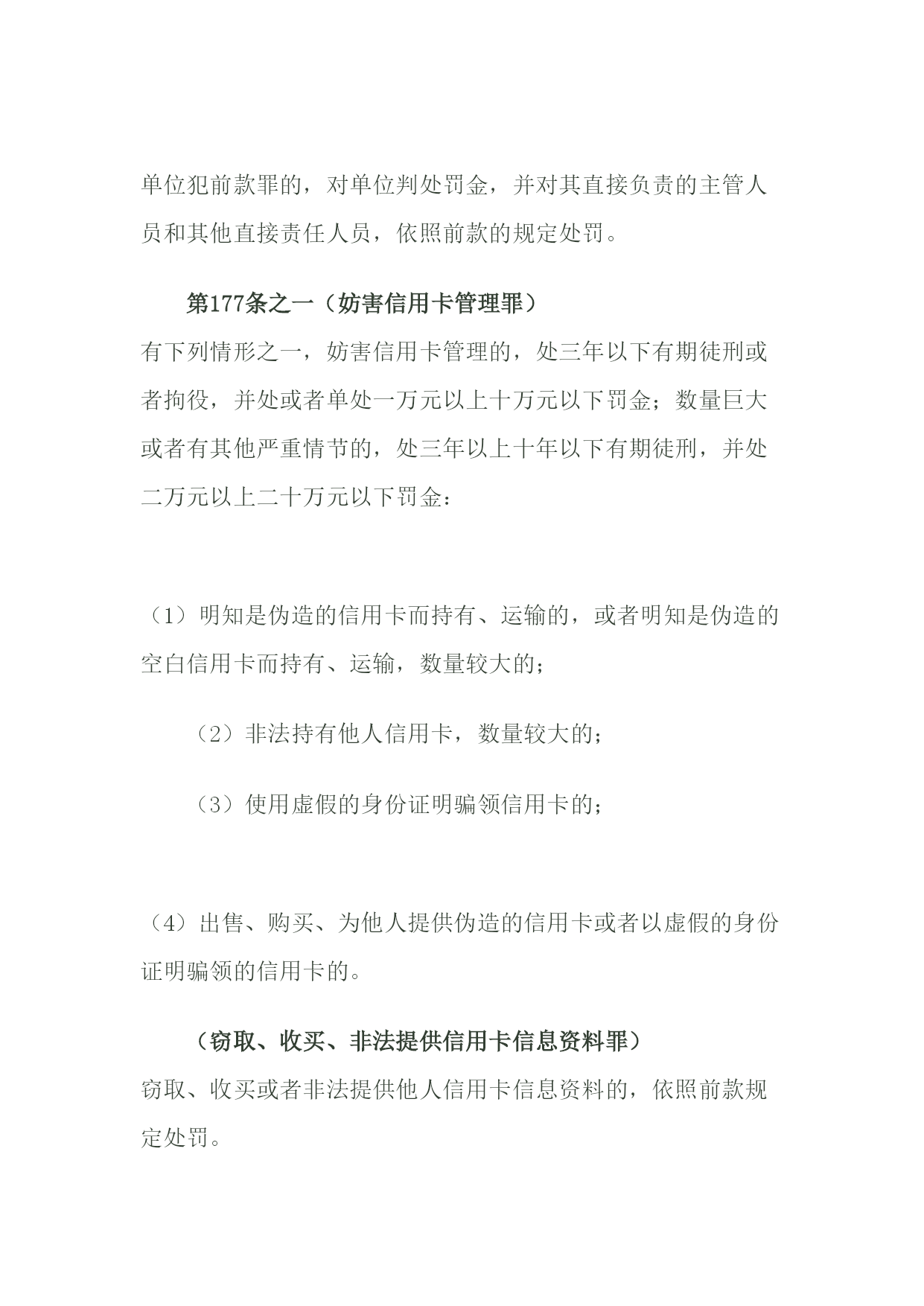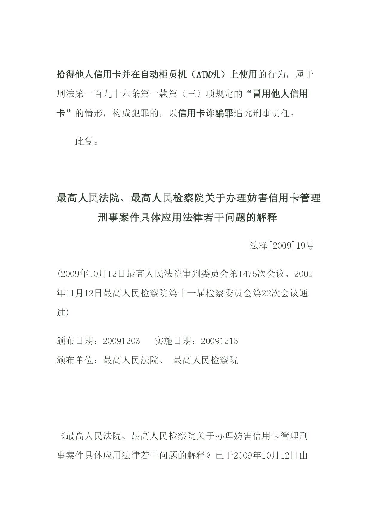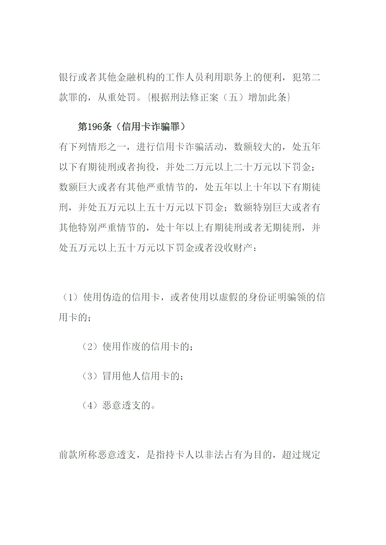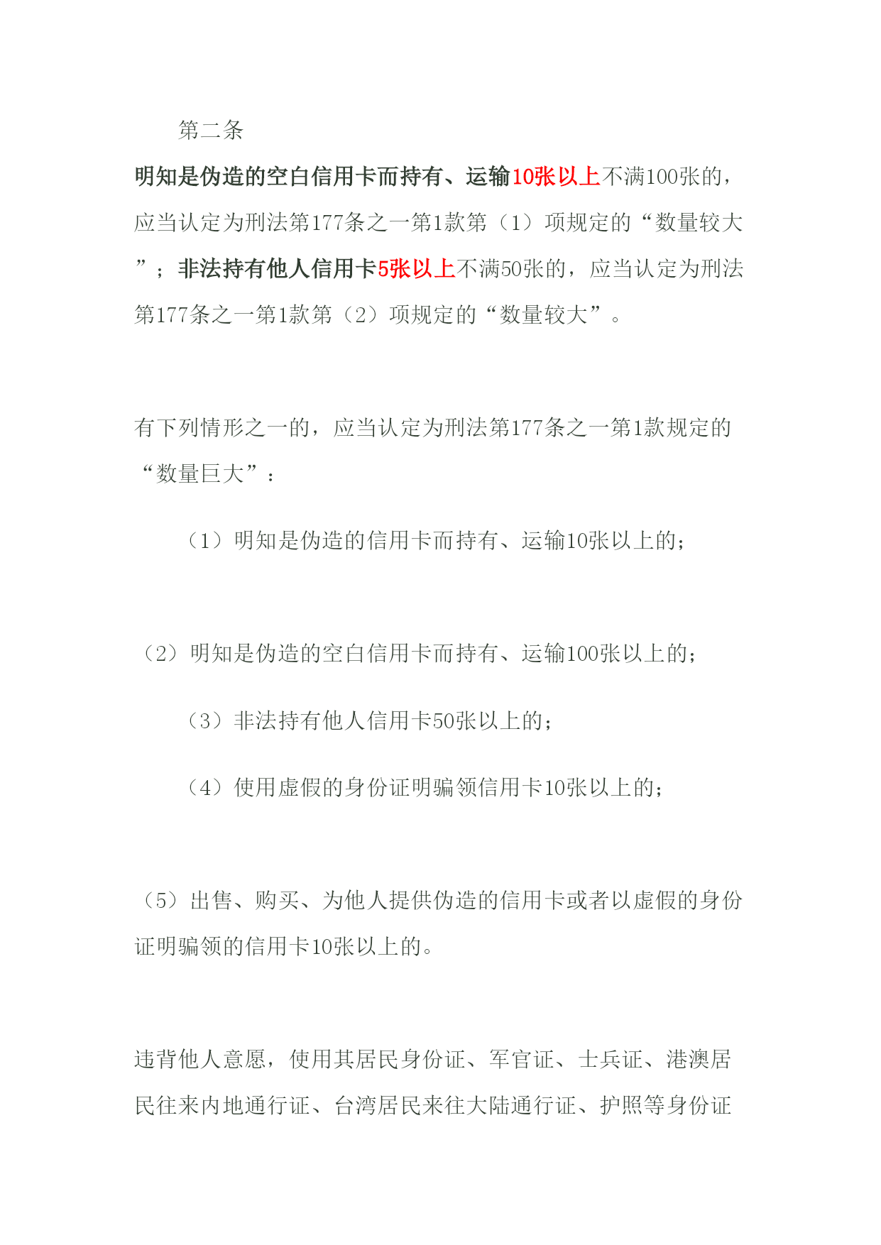 信用卡诈骗犯罪相关司法解释周铭川律师《刑法》:第177条(伪造、变造金融票证罪)有下列情形之一,伪造、变造金融票证的,处五年以下有期徒刑或者拘役,并处或者单处二万元以上二十万元以下罚金;情节严重的,处五年以上十年以下有期徒刑,并处五万元以上五十万元以下罚金;情节特别严重的,处十年以上有期徒刑或者无期徒刑,并处五万元以上五十万元以下罚金或者没收财产:(1)伪造、变造汇票、本票、支票的;(2)伪造、变造委托收款凭证、汇款凭证、银行存单等其他银行结算凭证的;(3)伪造、变造信用证或者附随的单据、文件的;(4)伪造信用卡的。单位犯前款罪的,对单位判处罚金,并对其直接负责的主管人员和其他直接责任人员,依照前款的规定处罚。第177条之一(妨害信用卡管理罪)有下列情形之一,妨害信用卡管理的,处三年以下有期徒刑或者拘役,并处或者单处一万元以上十万元以下罚金;数量巨大或者有其他严重情节的,处三年以上十年以下有期徒刑,并处二万元以上二十万元以下罚金:(1)明知是伪造的信用卡而持有、运输的,或者明知是伪造的空白信用卡而持有、运输,数量较大的;(2)非法持有他人信用卡,数量较大的;(3)使用虚假的身份证明骗领信用卡的;(4)出售、购买、为他人提供伪造的信用卡或者以虚假的身份证明骗领的信用卡的。(窃取、收买、非法提供信用卡信息资料罪)窃取、收买或者非法提供他人信用卡信息资料的,依照前款规定处罚。银行或者其他金融机构的工作人员利用职务上的便利,犯第二款罪的,从重处罚。{根据刑法修正案(五)增加此条}第196条(信用卡诈骗罪)有下列情形之一,进行信用卡诈骗活动,数额较大的,处五年以下有期徒刑或者拘役,并处二万元以上二十万元以下罚金;数额巨大或者有其他严重情节的,处五年以上十年以下有期徒刑,并处五万元以上五十万元以下罚金;数额特别巨大或者有其他特别严重情节的,处十年以上有期徒刑或者无期徒刑,并处五万元以上五十万元以下罚金或者没收财产:(1)使用伪造的信用卡,或者使用以虚假的身份证明骗领的信用卡的;(2)使用作废的信用卡的;(3)冒用他人信用卡的;(4)恶意透支的。前款所称恶意透支,是指持卡人以非法占有为目的,超过规定限额或者规定期限透支,并且经发卡银行催收后仍不归还的行为。盗窃信用卡并使用的,依照本法第264条的规定定罪处罚。全国人民代表大会常务委员会关于《中华人民共和国刑法》有关信用卡规定的解释(2004年12月29日第十届全国人民代表大会常务委员会第十三次会议通过)全国人民代表大会常务委员会根据司法实践中遇到的情况,讨论了刑法规定的“信用卡”的含义问题,解释如下:刑法规定的“信用卡”,是指由商业银行或者其他金融机构发行的具有消费支付、信用贷款、转账结算、存取现金等全部功能或者部分功能的电子支付卡。现予公告。最高人民法院关于长城万事达信用卡透支利息不应计算复利的批复法复[1996]18号颁布日期:19961129实施日期:19961129颁布单位:最高人民法院广东省高级人民法院:你院(1996)粤高法民第5号请示收悉。关于长城万事达信用卡透支利息是否可以计算复利的问题,经研究,批复如下:关于信用卡透支利息的计算方法,中国人民银行银发(1992)298号《信用卡业务管理暂行办法》作了规定,应当按该办法规定的方法计算。该办法对透支利率的规定已含有惩罚的性质。所以,信用卡透支不应当再计算复利。1996年11月29日最高人民检察院关于拾得他人信用卡并在自动柜员机(ATM机)上使用的行为如何定性问题的批复高检发释字[2008]1号颁布日期:20080418实施日期:20080507颁布单位:最高人民检察院2008年2月19日最高人民检察院第十届检察委员会第九十二次会议通过,现予公布,自2008年5月7日起施行。最高人民检察院2008年4月18日浙江省人民检察院:你院《关于拾得他人信用卡并在ATM机上使用的行为应如何定性的请示》(浙检研[2007]227号)收悉。经研究,批复如下:拾得他人信用卡并在自动柜员机(ATM机)上使用的行为,属于刑法第一百九十六条第一款第(三)项规定的“冒用他人信用卡”的情形,构成犯罪的,以信用卡诈骗罪追究刑事责任。此复。最高人民法院、最高人民检察院关于办理妨害信用卡管理刑事案件具体应用法律若干问题的解释法释[2009]19号(2009年10月12日最高人民法院审判委员会第1475次会议、2009年11月12日最高人民检察院第十一届检察委员会第22次会议通过)颁布日期:20091203实施日期:20091216颁布单位:最高人民法院、最高人民检察院《最高人民法院、最高人民检察院关于办理妨害信用卡管理刑事案件具体应用法律若干问