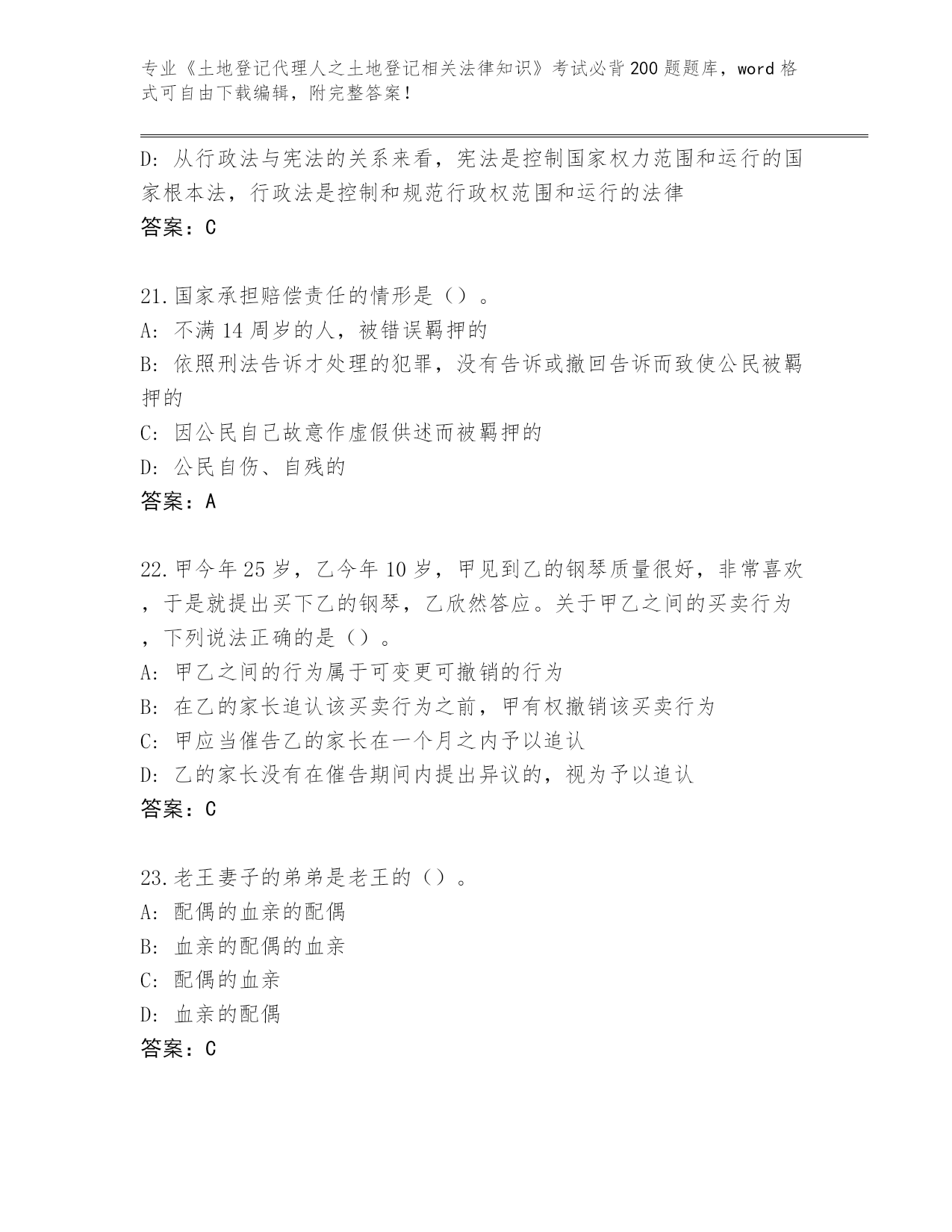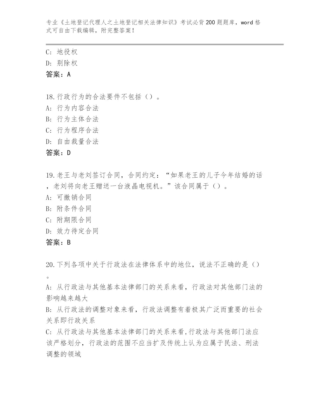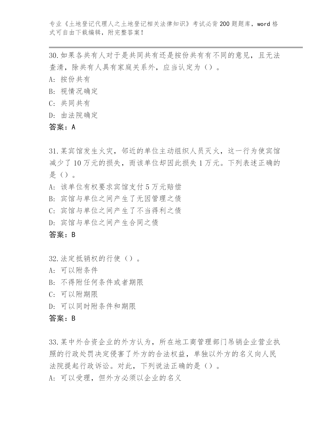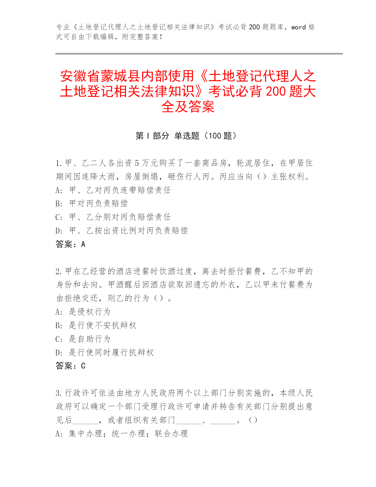 安徽省蒙城县内部使用《土地登记代理人之土地登记相关法律知识》考试必背200题大全及答案