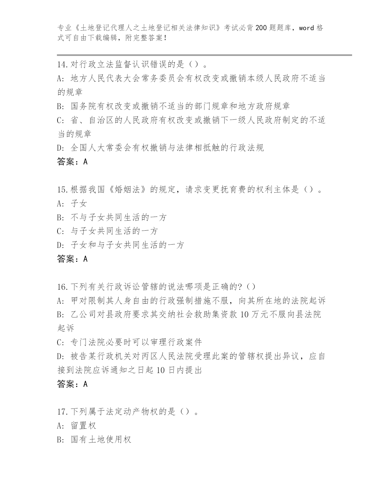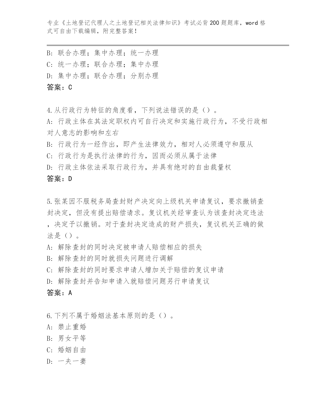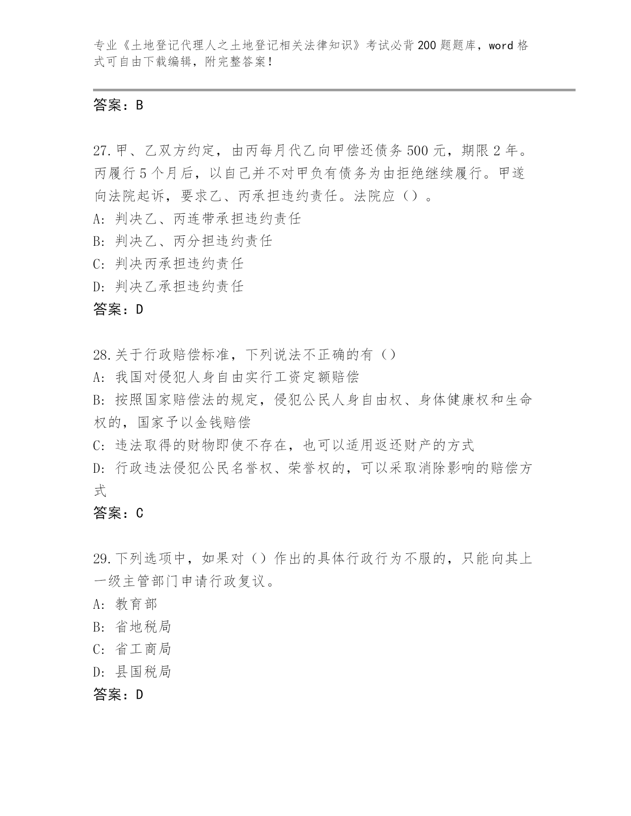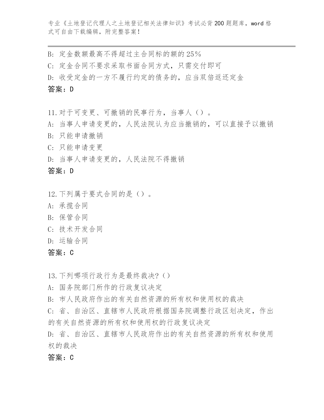 安徽省蒙城县内部使用《土地登记代理人之土地登记相关法律知识》考试必背200题大全及答案