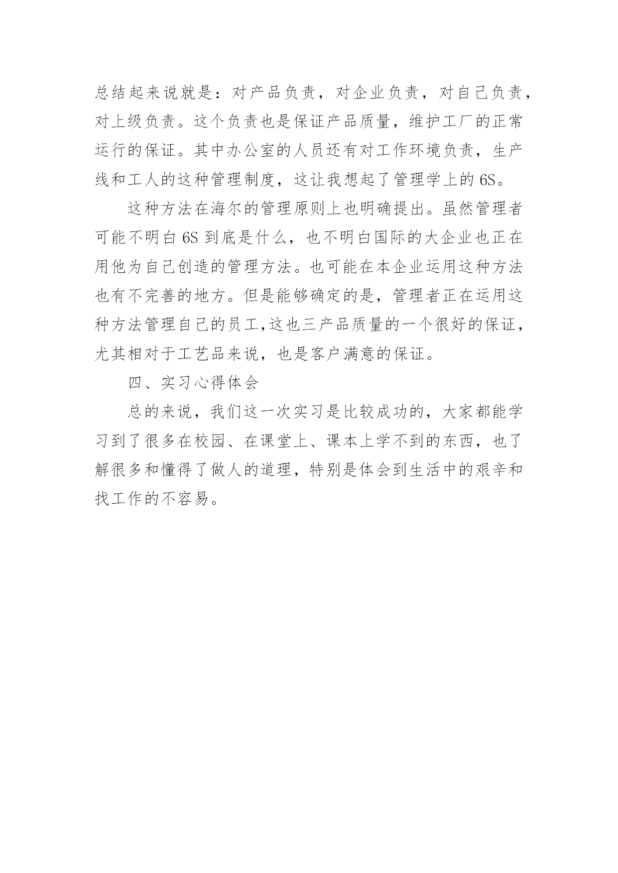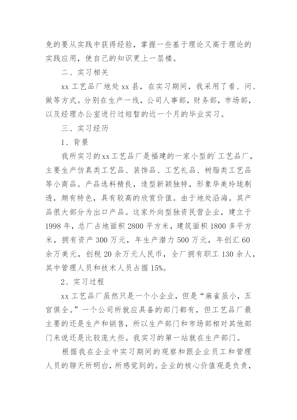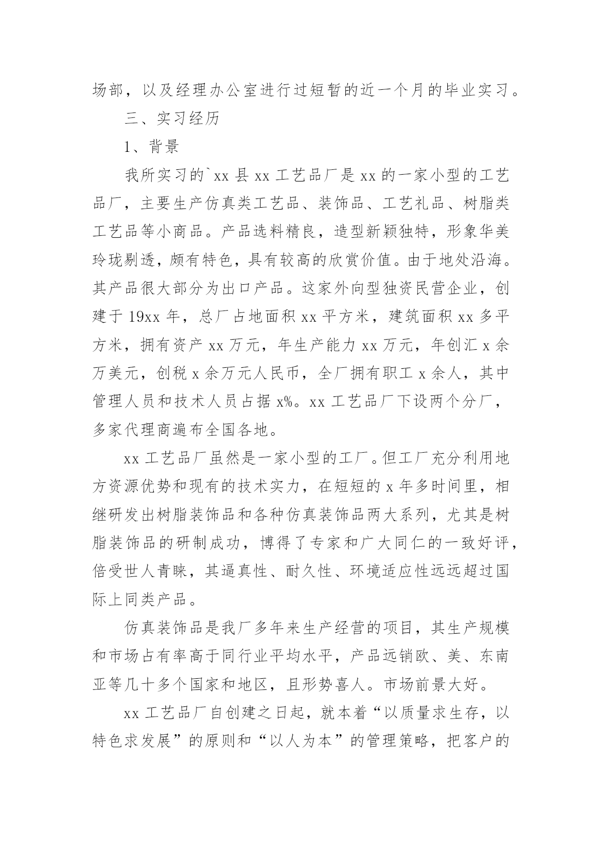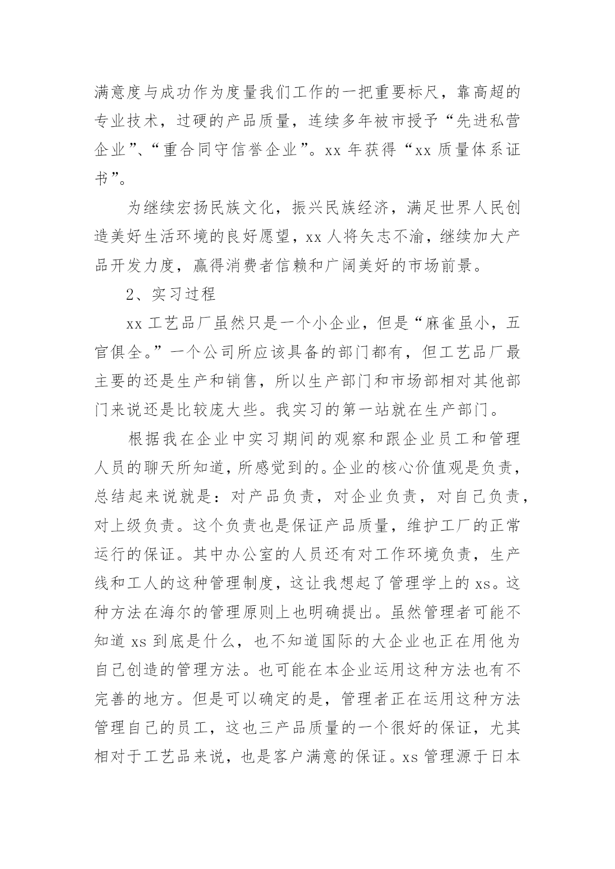工商管理专业实习报告在人们素养不断提高的今天,越来越多的事务都会使用到报告,其在写作上有一定的技巧。那么,报告到底怎么写才合适呢?下面是小编帮大家整理的工商管理专业实习报告,欢迎阅读与收藏。工商管理专业实习报告1一、实习目的经过大学四年关于工商管理理论知识的学习,我已经初步掌握了关于工商管理的基本理论知识,并逐步形成了在平常生活中有意识的应用所学知识解决平时所碰到的生活问题。对专业知识的全面了解,使得我意识到工商管理专业的特点,优势以及劣势。也全面的了解到在社会主义市场经济的形势下,以各企业要获得良好的发展所要具备的基本素质。不过这所有一切的感触和认识,都仅仅停留在理论认识的表面上,如果要从实际生活中探寻真理,把握规律,就不可避免的要从实践中获得经验,掌握一些基于理论又高于理论的实践应用,使自己的知识更上一层楼。所以今年的三月一日开始,我就开始了在xx县xx工艺品厂的实习经历。回顾实习生活,感触是很深的,收获是丰硕的。二、实习相关xx工艺品厂地处xxxx县,在实习期间,我采用了看、问、做等方式。分别在生产一线,公司人事部,财务部,市场部,以及经理办公室进行过短暂的近一个月的毕业实习。三、实习经历1、背景我所实习的`xx县xx工艺品厂是xx的一家小型的工艺品厂,主要生产仿真类工艺品、装饰品、工艺礼品、树脂类工艺品等小商品。产品选料精良,造型新颖独特,形象华美玲珑剔透,颇有特色,具有较高的欣赏价值。由于地处沿海。其产品很大部分为出口产品。这家外向型独资民营企业,创建于19xx年,总厂占地面积xx平方米,建筑面积xx多平方米,拥有资产xx万元,年生产能力xx万元,年创汇x余万美元,创税x余万元人民币,全厂拥有职工x余人,其中管理人员和技术人员占据x%。xx工艺品厂下设两个分厂,多家代理商遍布全国各地。xx工艺品厂虽然是一家小型的工厂。但工厂充分利用地方资源优势和现有的技术实力,在短短的x年多时间里,相继研发出树脂装饰品和各种仿真装饰品两大系列,尤其是树脂装饰品的研制成功,博得了专家和广大同仁的一致好评,倍受世人青睐,其逼真性、耐久性、环境适应性远远超过国际上同类产品。仿真装饰品是我厂多年来生产经营的项目,其生产规模和市场占有率高于同行业平均水平,产品远销欧、美、东南亚等几十多个国家和地区,且形势喜人。市场前景大好。xx工艺品厂自创建之日起,就本着“以质量求生存,以特色求发展”的原则和“以人为本”的管理策略,把客户的满意度与成功作为度量我们工作的一把重要标尺,靠高超的专业技术,过硬的产品质量,连续多年被市授予“先进私营企业”、“重合同守信誉企业”。xx年获得“xx质量体系证书”。为继续宏扬民族文化,振兴民族经济,满足世界人民创造美好生活环境的良好愿望,xx人将矢志不渝,继续加大产品开发力度,赢得消费者信赖和广阔美好的市场前景。2、实习过程xx工艺品厂虽然只是一个小企业,但是“麻雀虽小,五官俱全。”一个公司所应该具备的部门都有,但工艺品厂最主要的还是生产和销售,所以生产部门和市场部相对其他部门来说还是比较庞大些。我实习的第一站就在生产部门。根据我在企业中实习期间的观察和跟企业员工和管理人员的聊天所知道,所感觉到的。企业的核心价值观是负责,总结起来说就是:对产品负责,对企业负责,对自己负责,对上级负责。这个负责也是保证产品质量,维护工厂的正常运行的保证。其中办公室的人员还有对工作环境负责,生产线和工人的这种管理制度,这让我想起了管理学上的xs。这种方法在海尔的管理原则上也明确提出。虽然管理者可能不知道xs到底是什么,也不知道国际的大企业也正在用他为自己创造的管理方法。也可能在本企业运用这种方法也有不完善的地方。但是可以确定的是,管理者正在运用这种方法管理自己的员工,这也三产品质量的一个很好的保证,尤其相对于工艺品来说,也是客户满意的保证。xs管理源于日本的xs管理。xs即整理、整顿、清扫、清洁和素养。是源于车间生产现场的一种基本管理技术。中国企业根据实际需要,增加了第六个s——安全。为了应对日益激烈的竞争环境,企业对现场管理的要求在不断提高。四、实习心得体会对即将毕业的我们来说,实习是每一个毕业生必经的一段经历,它使我们在实践中了解社会,巩固知识,实习又是对每一位毕业生专业知识的一种检验,它让我们学到了很多在课堂上根本学不到的知识,既开阔了视野,又增长了见识,运用所学习的专业知识来了解会计的工作流程和工作内容,加深对会计工作的认识,将理论联系于实践,培养实际工作能力和分析解决问题的能力,达到学以致用的目的,为成功走向社会做准备。工商管理专业实习报告2一、实习目的经过大学四年关于工商管理理论知识的学习,我已经初步掌握了关于工商管理的基本理论知识,并逐步构成了在平常生活中有意识的应用所学知识解决平时所碰到的生活问题。对专业知识的全面了解,