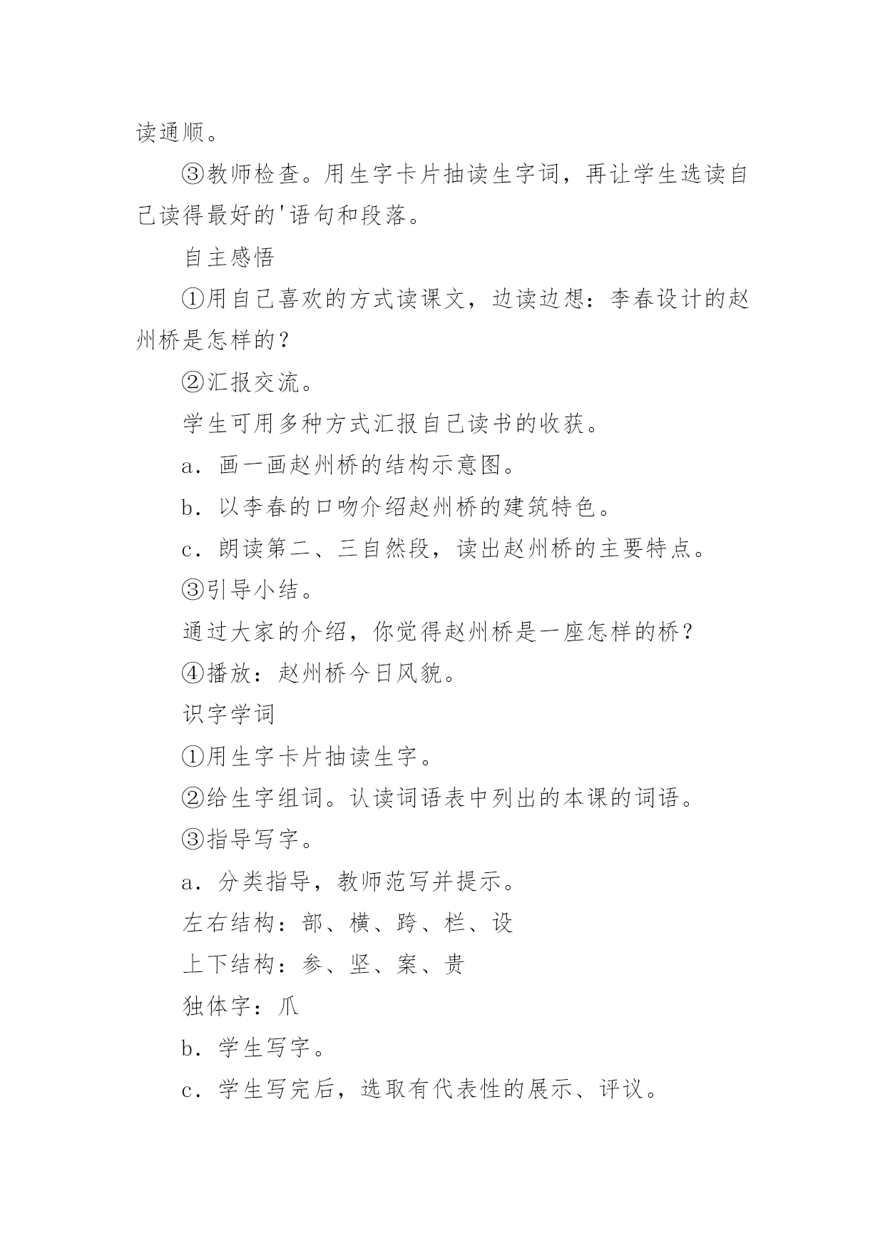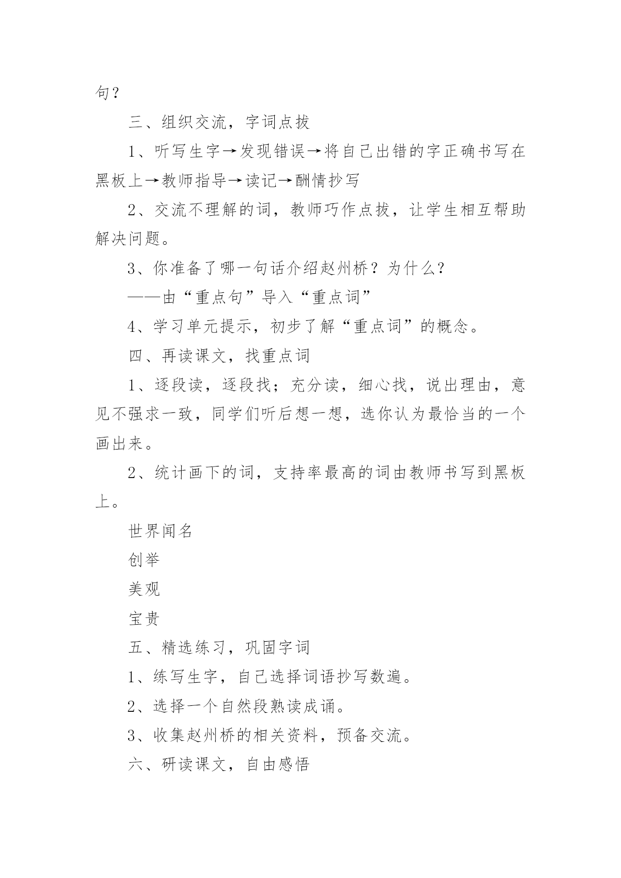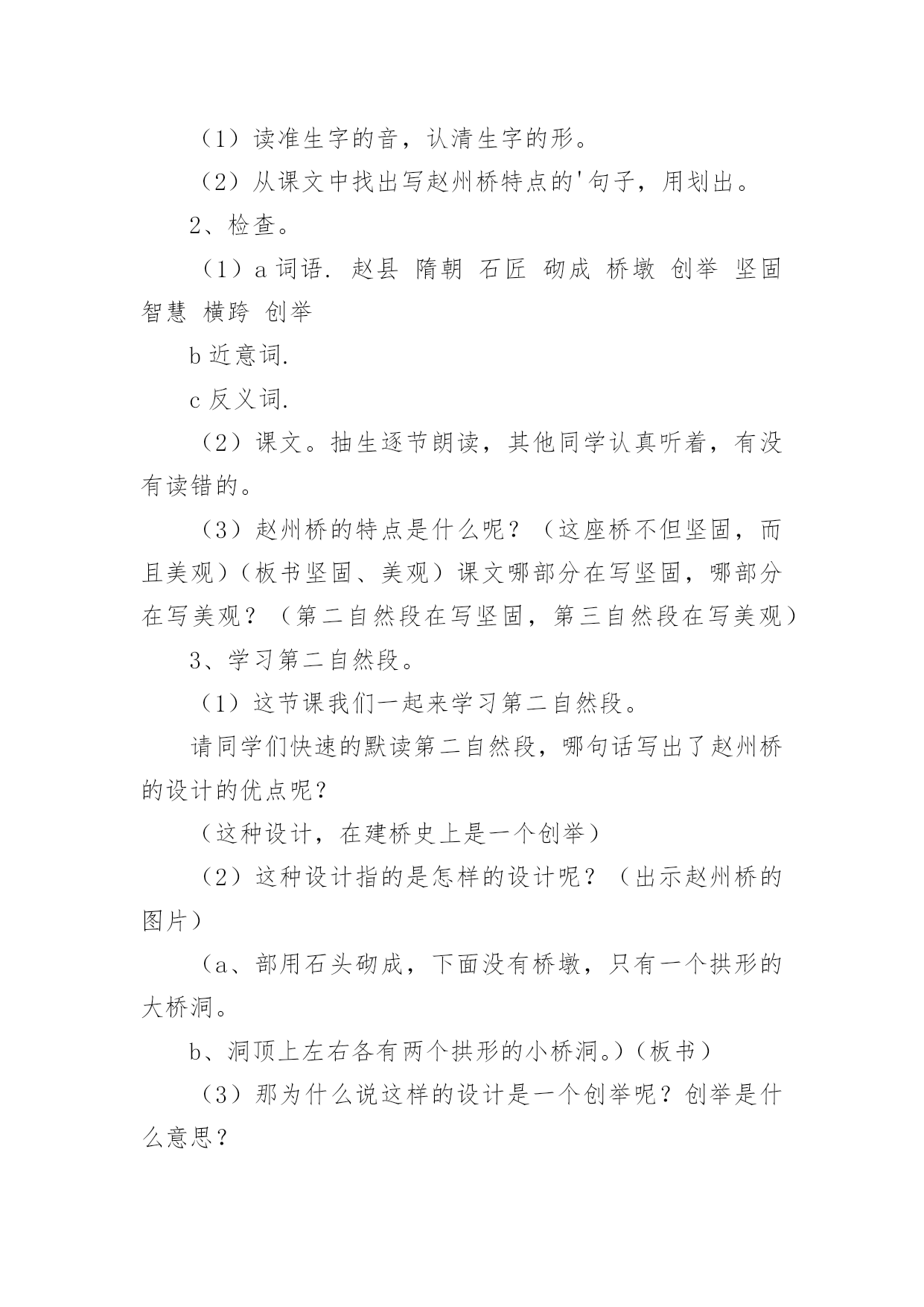 《赵州桥》的教案设计作为一位杰出的老师,就不得不需要编写教案,教案是保证教学取得成功、提高教学质量的基本条件。优秀的教案都具备一些什么特点呢?下面是小编为大家整理的《赵州桥》的教案设计,供大家参考借鉴,希望可以帮助到有需要的朋友。《赵州桥》的教案设计1一、导课1、a、随着现代化建设的不断发展,我国的建筑事业越来越发达,如高楼大厦,桥梁等。今天我们就一起来欣赏一下现代化的桥梁。(看现代化的桥梁建筑)b、同学们,看了这些图片,你有什么感想呢?(雄伟、美丽建设者非常的聪明、能干)2、早在1300多年前就有这样一个聪明能干的人,他就是李春,不但设计还亲自参加建造了一座世界闻名的石拱桥,(出示赵州桥的图片,同时出示李春的头像)叫安济桥,又叫赵州桥,被誉为华北四宝之一(板书,赵州桥)(齐读课题)它为什么会闻名世界呢?学了课文,我们就会知道了。二、新授1、自学。请同学们打开课本,轻声朗读课文,要求:(1)读准生字的音,认清生字的形。(2)从课文中找出写赵州桥特点的'句子,用划出。2、检查。(1)a词语.赵县隋朝石匠砌成桥墩创举坚固智慧横跨创举b近意词.c反义词.(2)课文。抽生逐节朗读,其他同学认真听着,有没有读错的。(3)赵州桥的特点是什么呢?(这座桥不但坚固,而且美观)(板书坚固、美观)课文哪部分在写坚固,哪部分在写美观?(第二自然段在写坚固,第三自然段在写美观)3、学习第二自然段。(1)这节课我们一起来学习第二自然段。请同学们快速的默读第二自然段,哪句话写出了赵州桥的设计的优点呢?(这种设计,在建桥史上是一个创举)(2)这种设计指的是怎样的设计呢?(出示赵州桥的图片)(a、部用石头砌成,下面没有桥墩,只有一个拱形的大桥洞。b、洞顶上左右各有两个拱形的小桥洞。)(板书)(3)那为什么说这样的设计是一个创举呢?创举是什么意思?a、帮助理解:这种设计指。它的好处,一是,因为;二是,因为。b、(这座桥全部用石头砌成,下面没有桥墩,只有一个拱形的大桥洞,洞顶上的左右两边,各有两个小桥洞。既可以减轻流水对桥身的冲击力,又减轻了桥身的重量。这种设计以前是没有的,所以说是个创举。)c、既又是什么关系呢?(并列)换成既可以减轻桥身的重量,又可以减轻流水对桥身的冲击力。意思不变。d、造句。(4)朗读。隋匠天工落奇桥,饮尽世代洪水恶,石骨长虹映燕赵,风雨梳妆岁岁立。带着崇敬之情来朗读这一自然段。(5)刚才,我们学习第二自然段的时候,是先抓住重点词创举,然后再来理解整段话的意思。现在我们一起来看一下单元提示,一段话中,有些词语或句子跟这段话的主要内容关系特别密切。阅读时,找出这些词句,想一想跟其他词句的关系,能帮助我们正确理解这段话的意思。我们下节课学习的时候就可以用上这种方法。4、做个讲解员向在坐的同学和老师介绍一下世界文明的赵州桥。《赵州桥》的教案设计2学习目标①认识“县、济、匠”等10个生字。会写“县、设”等14个字。能正确读写“设计、参加、雄伟”等23个词语。②正确、流利、有感情地朗读课文,背诵自己喜欢的段落。③了解赵州桥的结构特点和建筑特色,感受我国古代劳动人民的智慧和才干,增强民族自豪感。课前准备①多媒体。②生字生词卡片。③搜集反映我国古代劳动人民智慧和才能的资料及有关桥梁的资料。A案第一课时情境导入①播放:昔日的洨河风光。②谈话导入。洨河两岸景色优美,可阻碍了两岸文化的交流、经济的发展,官府决定在这里建一座桥梁。造一座怎样的桥呢?官座决定向社会公开招标,石匠李春设计了方案被采用了。想知道李春的设计方案吗?读读课文就清楚了。③板书课题。齐读课题。初读感知①学生自讯课文,画出生字词,结合注意多读几遍。②采用自读、同座互读的形式练读课文,把课文读正确、读通顺。③教师检查。用生字卡片抽读生字词,再让学生选读自己读得最好的'语句和段落。自主感悟①用自己喜欢的方式读课文,边读边想:李春设计的赵州桥是怎样的?②汇报交流。学生可用多种方式汇报自己读书的收获。a.画一画赵州桥的结构示意图。b.以李春的口吻介绍赵州桥的建筑特色。c.朗读第二、三自然段,读出赵州桥的主要特点。③引导小结。通过大家的介绍,你觉得赵州桥是一座怎样的桥?④播放:赵州桥今日风貌。识字学词①用生字卡片抽读生字。②给生字组词。认读词语表中列出的本课的词语。③指导写字。a.分类指导,教师范写并提示。左右结构:部、横、跨、栏、设上下结构:参、坚、案、贵独体字:爪b.学生写字。c.学生写完后,选取有代表性的展示、评议。布置作业①抄写词语表中列出的本课的词语。②搜集桥的图片和文字资料。第二课时复习巩固①听写词语。听写后,同座互相批改。②用自己的话说说赵州桥的特点。朗读体验①有感情地朗读课文,把自己喜欢的句子画下来。②试着背诵自己喜欢的部分。③抄写自己喜欢的语句。扩展交流展示课前搜集的桥的资料,用自己