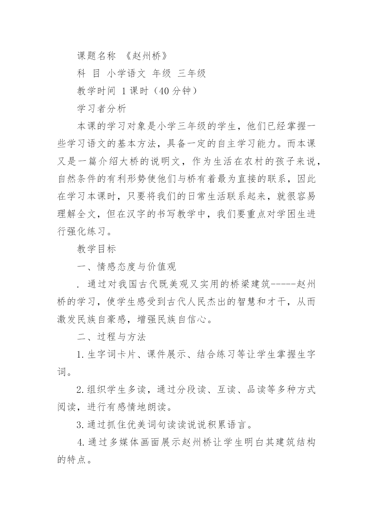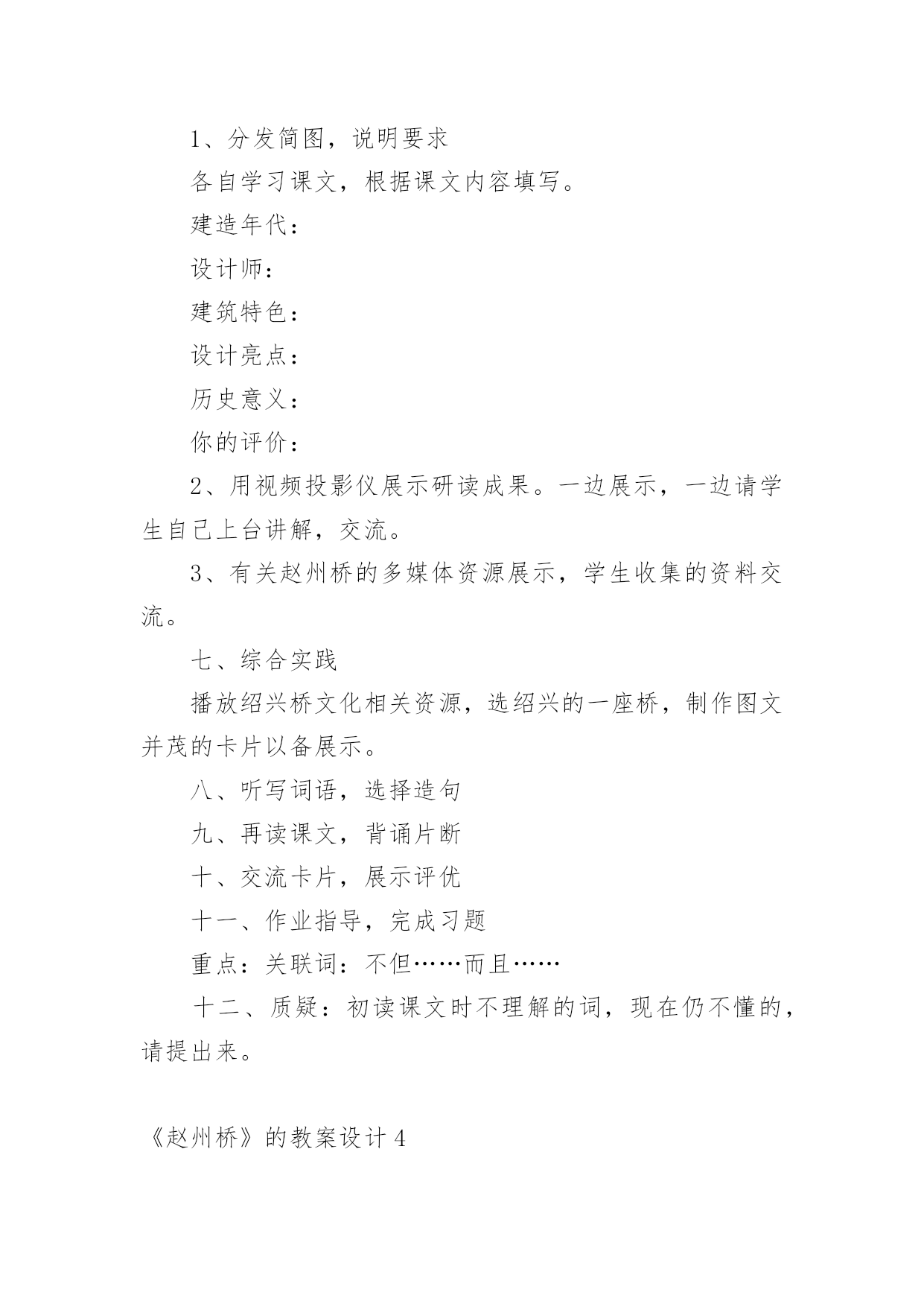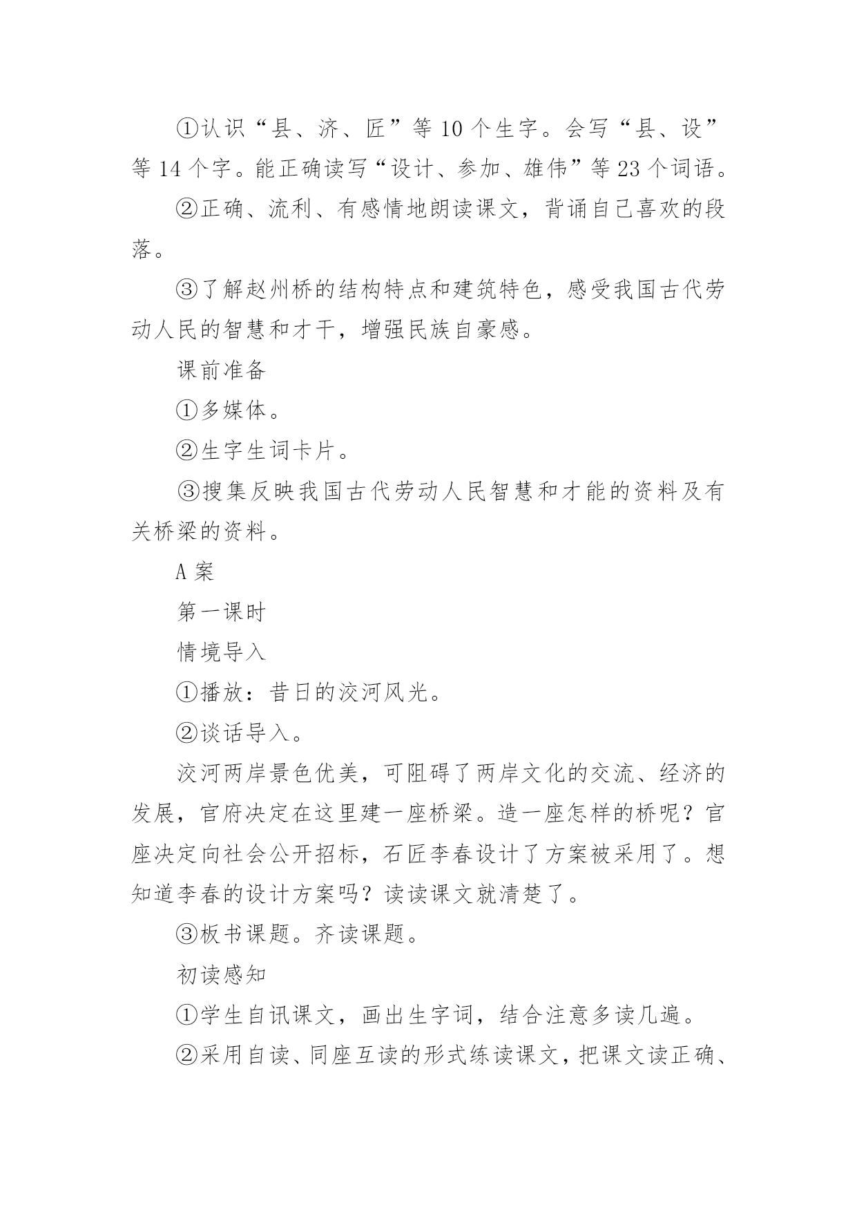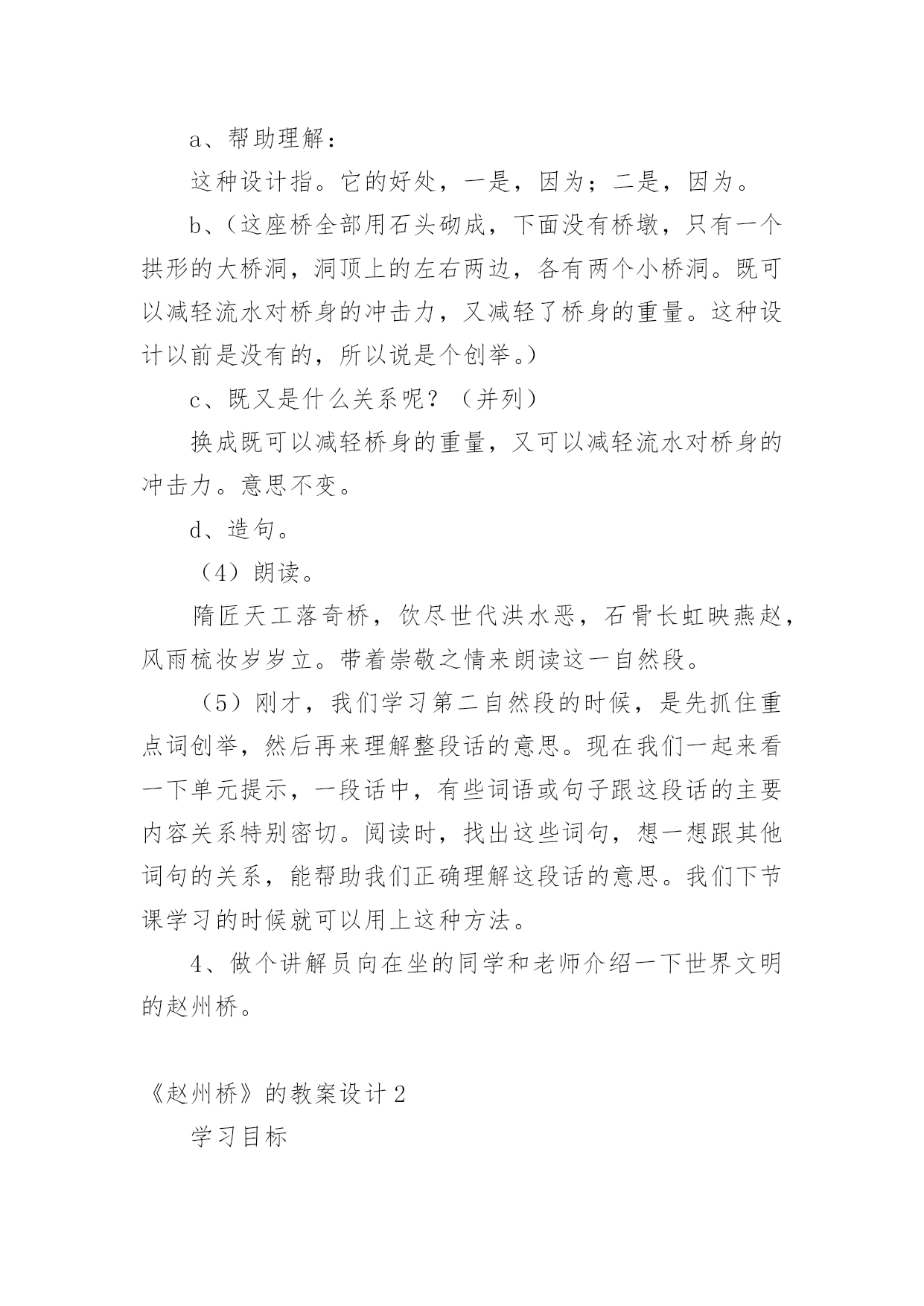 《赵州桥》的教案设计作为一位杰出的老师,就不得不需要编写教案,教案是保证教学取得成功、提高教学质量的基本条件。优秀的教案都具备一些什么特点呢?下面是小编为大家整理的《赵州桥》的教案设计,供大家参考借鉴,希望可以帮助到有需要的朋友。《赵州桥》的教案设计1一、导课1、a、随着现代化建设的不断发展,我国的建筑事业越来越发达,如高楼大厦,桥梁等。今天我们就一起来欣赏一下现代化的桥梁。(看现代化的桥梁建筑)b、同学们,看了这些图片,你有什么感想呢?(雄伟、美丽建设者非常的聪明、能干)2、早在1300多年前就有这样一个聪明能干的人,他就是李春,不但设计还亲自参加建造了一座世界闻名的石拱桥,(出示赵州桥的图片,同时出示李春的头像)叫安济桥,又叫赵州桥,被誉为华北四宝之一(板书,赵州桥)(齐读课题)它为什么会闻名世界呢?学了课文,我们就会知道了。二、新授1、自学。请同学们打开课本,轻声朗读课文,要求:(1)读准生字的音,认清生字的形。(2)从课文中找出写赵州桥特点的'句子,用划出。2、检查。(1)a词语.赵县隋朝石匠砌成桥墩创举坚固智慧横跨创举b近意词.c反义词.(2)课文。抽生逐节朗读,其他同学认真听着,有没有读错的。(3)赵州桥的特点是什么呢?(这座桥不但坚固,而且美观)(板书坚固、美观)课文哪部分在写坚固,哪部分在写美观?(第二自然段在写坚固,第三自然段在写美观)3、学习第二自然段。(1)这节课我们一起来学习第二自然段。请同学们快速的默读第二自然段,哪句话写出了赵州桥的设计的优点呢?(这种设计,在建桥史上是一个创举)(2)这种设计指的是怎样的设计呢?(出示赵州桥的图片)(a、部用石头砌成,下面没有桥墩,只有一个拱形的大桥洞。b、洞顶上左右各有两个拱形的小桥洞。)(板书)(3)那为什么说这样的设计是一个创举呢?创举是什么意思?a、帮助理解:这种设计指。它的好处,一是,因为;二是,因为。b、(这座桥全部用石头砌成,下面没有桥墩,只有一个拱形的大桥洞,洞顶上的左右两边,各有两个小桥洞。既可以减轻流水对桥身的冲击力,又减轻了桥身的重量。这种设计以前是没有的,所以说是个创举。)c、既又是什么关系呢?(并列)换成既可以减轻桥身的重量,又可以减轻流水对桥身的冲击力。意思不变。d、造句。(4)朗读。隋匠天工落奇桥,饮尽世代洪水恶,石骨长虹映燕赵,风雨梳妆岁岁立。带着崇敬之情来朗读这一自然段。(5)刚才,我们学习第二自然段的时候,是先抓住重点词创举,然后再来理解整段话的意思。现在我们一起来看一下单元提示,一段话中,有些词语或句子跟这段话的主要内容关系特别密切。阅读时,找出这些词句,想一想跟其他词句的关系,能帮助我们正确理解这段话的意思。我们下节课学习的时候就可以用上这种方法。4、做个讲解员向在坐的同学和老师介绍一下世界文明的赵州桥。《赵州桥》的教案设计2学习目标①认识“县、济、匠”等10个生字。会写“县、设”等14个字。能正确读写“设计、参加、雄伟”等23个词语。②正确、流利、有感情地朗读课文,背诵自己喜欢的段落。③了解赵州桥的结构特点和建筑特色,感受我国古代劳动人民的智慧和才干,增强民族自豪感。课前准备①多媒体。②生字生词卡片。③搜集反映我国古代劳动人民智慧和才能的资料及有关桥梁的资料。A案第一课时情境导入①播放:昔日的洨河风光。②谈话导入。洨河两岸景色优美,可阻碍了两岸文化的交流、经济的发展,官府决定在这里建一座桥梁。造一座怎样的桥呢?官座决定向社会公开招标,石匠李春设计了方案被采用了。想知道李春的设计方案吗?读读课文就清楚了。③板书课题。齐读课题。初读感知①学生自讯课文,画出生字词,结合注意多读几遍。②采用自读、同座互读的形式练读课文,把课文读正确、读通顺。③教师检查。用生字卡片抽读生字词,再让学生选读自己读得最好的'语句和段落。自主感悟①用自己喜欢的方式读课文,边读边想:李春设计的赵州桥是怎样的?②汇报交流。学生可用多种方式汇报自己读书的收获。a.画一画赵州桥的结构示意图。b.以李春的口吻介绍赵州桥的建筑特色。c.朗读第二、三自然段,读出赵州桥的主要特点。③引导小结。通过大家的介绍,你觉得赵州桥是一座怎样的桥?④播放:赵州桥今日风貌。识字学词①用生字卡片抽读生字。②给生字组词。认读词语表中列出的本课的词语。③指导写字。a.分类指导,教师范写并提示。左右结构:部、横、跨、栏、设上下结构:参、坚、案、贵独体字:爪b.学生写字。c.学生写完后,选取有代表性的展示、评议。布置作业①抄写词语表中列出的本课的词语。②搜集桥的图片和文字资料。第二课时复习巩固①听写词语。听写后,同座互相批改。②用自己的话说说赵州桥的特点。朗读体验①有感情地朗读课文,把自己喜欢的句子画下来。②试着背诵自己喜欢的部分。③抄写自己喜欢的语句。扩展交流展示课前搜集的桥的资料,用自己