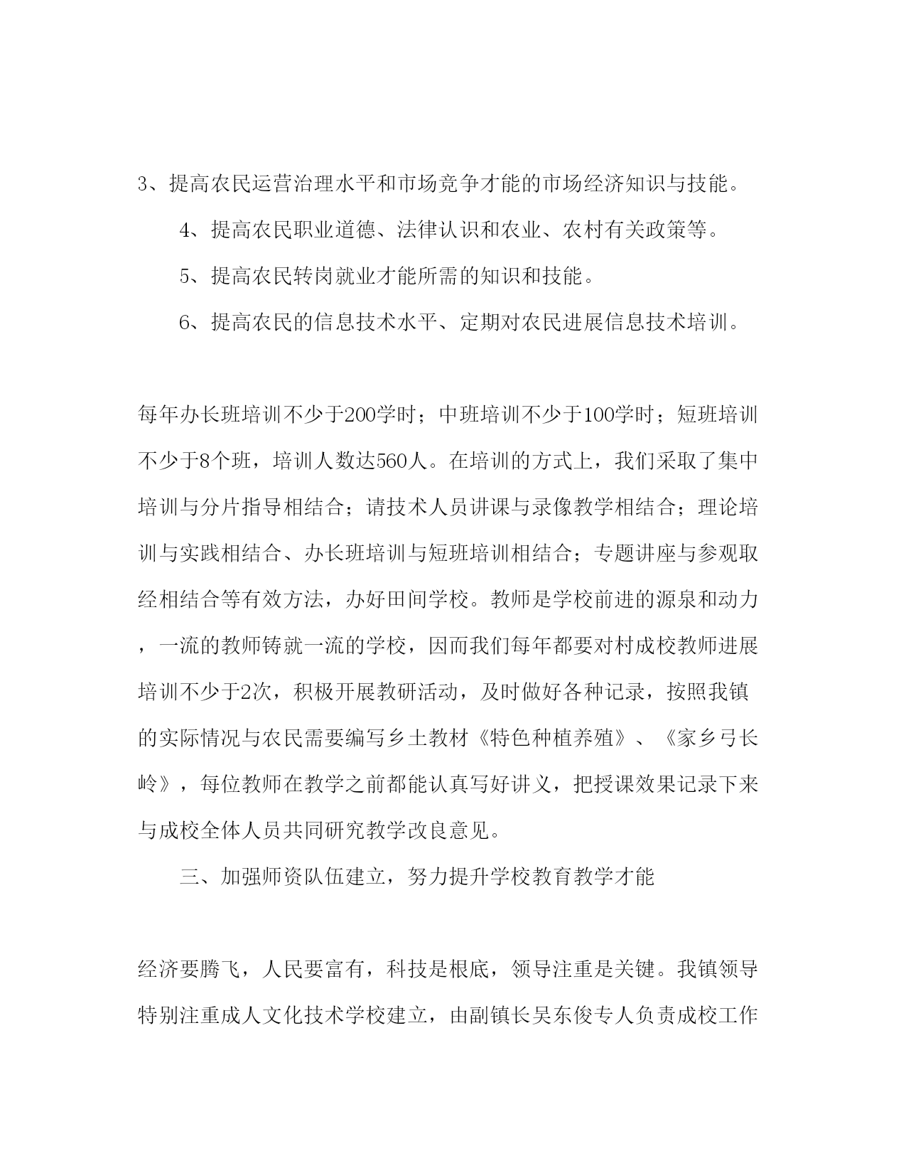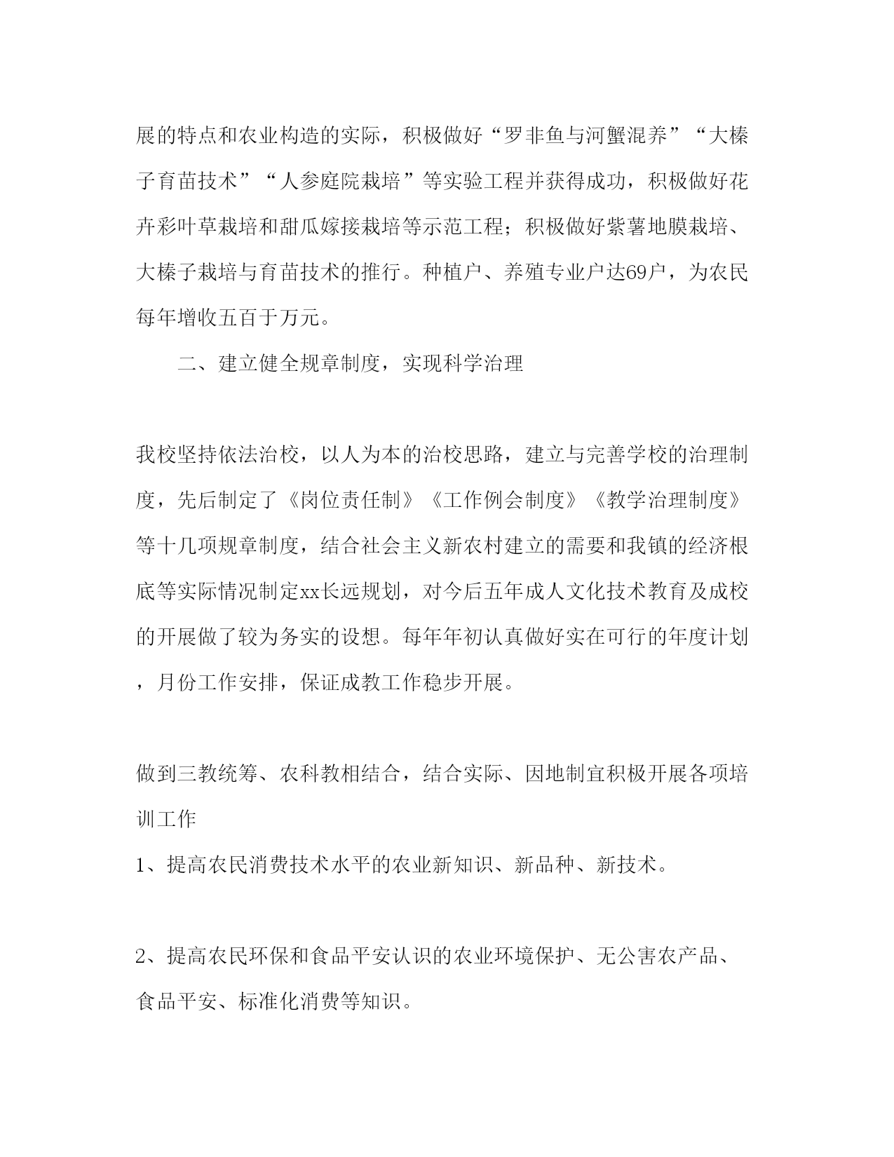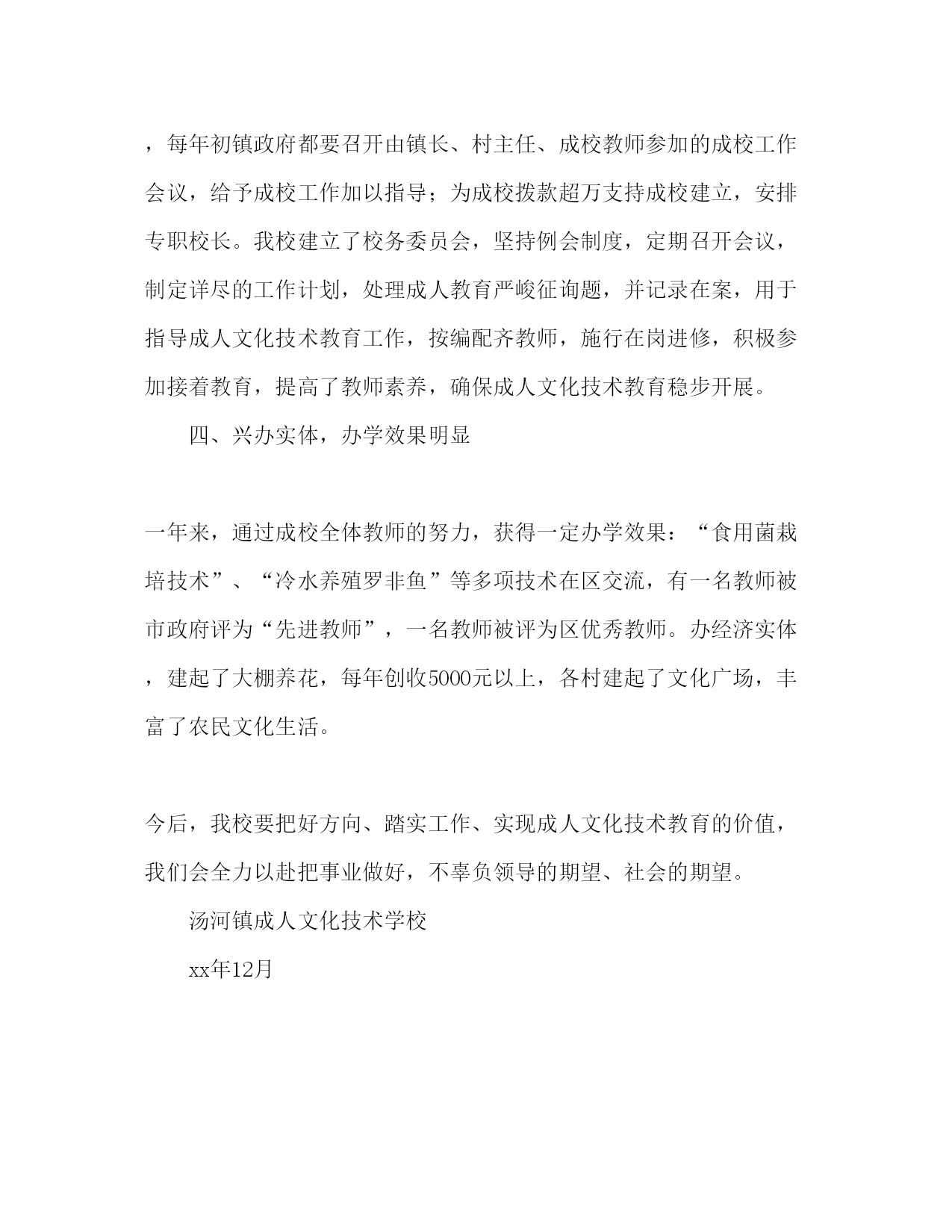 2021文化技术学校工作参考总结范文我们汤河镇成人文化技术学校不断坚持以党的方针、政策为指导,坚持稳中求进的方针,坚持科教兴农的开展战略,在广大农民中积极开展思想政治教育、文化科学教育和有用技术培训,积极推行新技术、新工艺、新品种,向广大农民倡导科学文明、健康的生活方式。破除封建迷信,改善落后风俗,推进了我镇两个文明建立和和谐社会的健康开展。几年来为推进新农村建立做出了一定奉献。一、改善办学条件,为成人教育奠定坚实根底。汤河镇成人文化技术学校在各级领导关心、扶持下,在全校教师的团结协作、努力工作下,建起了独立标准化教室,购置标准化桌椅68套,配齐了档案柜,标准了档案治理,有独立办公室、综合室,新购进档案柜2组、标本柜2组、图书柜3组,图书材料达二十几种,共计xx余册;标本达10个类别以上,培训设备齐全:有电脑、电视、vcd、摄像机、投影等,各类培训光碟齐全,建有四处实验实习基地,总面积达38亩,在本校建有小果园、塑料大棚各0.8亩,为确保成人文化技术教育到达高质量、高水平,不走过场,我校按照全镇农村经济开展的特点和农业构造的实际,积极做好“罗非鱼与河蟹混养”“大榛子育苗技术”“人参庭院栽培”等实验工程并获得成功,积极做好花卉彩叶草栽培和甜瓜嫁接栽培等示范工程;积极做好紫薯地膜栽培、大榛子栽培与育苗技术的推行。种植户、养殖专业户达69户,为农民每年增收五百于万元。二、建立健全规章制度,实现科学治理我校坚持依法治校,以人为本的治校思路,建立与完善学校的治理制度,先后制定了《岗位责任制》《工作例会制度》《教学治理制度》等十几项规章制度,结合社会主义新农村建立的需要和我镇的经济根底等实际情况制定xx长远规划,对今后五年成人文化技术教育及成校的开展做了较为务实的设想。每年年初认真做好实在可行的年度计划,月份工作安排,保证成教工作稳步开展。做到三教统筹、农科教相结合,结合实际、因地制宜积极开展各项培训工作1、提高农民消费技术水平的农业新知识、新品种、新技术。2、提高农民环保和食品平安认识的农业环境保护、无公害农产品、食品平安、标准化消费等知识。3、提高农民运营治理水平和市场竞争才能的市场经济知识与技能。4、提高农民职业道德、法律认识和农业、农村有关政策等。5、提高农民转岗就业才能所需的知识和技能。6、提高农民的信息技术水平、定期对农民进展信息技术培训。每年办长班培训不少于200学时;中班培训不少于100学时;短班培训不少于8个班,培训人数达560人。在培训的方式上,我们采取了集中培训与分片指导相结合;请技术人员讲课与录像教学相结合;理论培训与实践相结合、办长班培训与短班培训相结合;专题讲座与参观取经相结合等有效方法,办好田间学校。教师是学校前进的源泉和动力,一流的教师铸就一流的学校,因而我们每年都要对村成校教师进展培训不少于2次,积极开展教研活动,及时做好各种记录,按照我镇的实际情况与农民需要编写乡土教材《特色种植养殖》、《家乡弓长岭》,每位教师在教学之前都能认真写好讲义,把授课效果记录下来与成校全体人员共同研究教学改良意见。三、加强师资队伍建立,努力提升学校教育教学才能经济要腾飞,人民要富有,科技是根底,领导注重是关键。我镇领导特别注重成人文化技术学校建立,由副镇长吴东俊专人负责成校工作,每年初镇政府都要召开由镇长、村主任、成校教师参加的成校工作会议,给予成校工作加以指导;为成校拨款超万支持成校建立,安排专职校长。我校建立了校务委员会,坚持例会制度,定期召开会议,制定详尽的工作计划,处理成人教育严峻征询题,并记录在案,用于指导成人文化技术教育工作,按编配齐教师,施行在岗进修,积极参加接着教育,提高了教师素养,确保成人文化技术教育稳步开展。四、兴办实体,办学效果明显一年来,通过成校全体教师的努力,获得一定办学效果:“食用菌栽培技术”、“冷水养殖罗非鱼”等多项技术在区交流,有一名教师被市政府评为“先进教师”,一名教师被评为区优秀教师。办经济实体,建起了大棚养花,每年创收5000元以上,各村建起了文化广场,丰富了农民文化生活。今后,我校要把好方向、踏实工作、实现成人文化技术教育的价值,我们会全力以赴把事业做好,不辜负领导的期望、社会的期望。汤河镇成人文化技术学校xx年12月