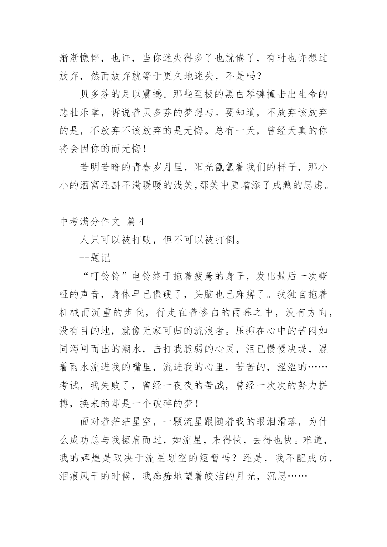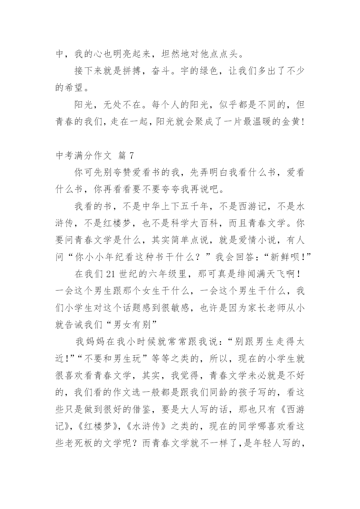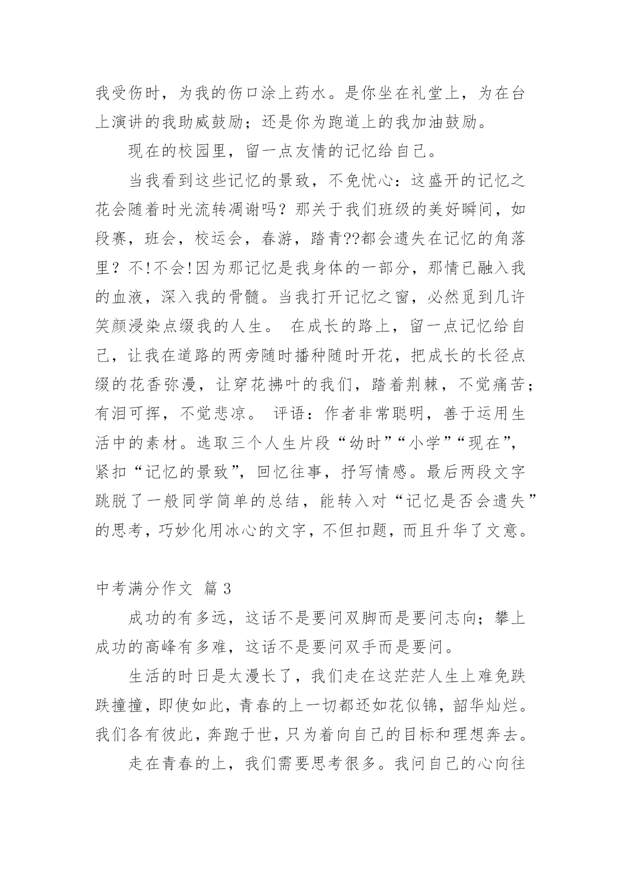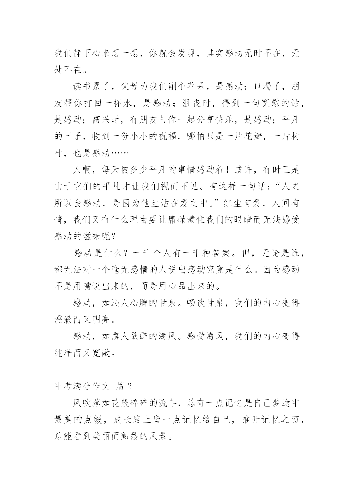 中考满分作文【精品】中考满分作文锦集10篇在平日的学习、工作和生活里,许多人都写过作文吧,作文是经过人的思想考虑和语言组织,通过文字来表达一个主题意义的记叙方法。那么一般作文是怎么写的呢?以下是小编精心整理的中考满分作文10篇,欢迎阅读,希望大家能够喜欢。中考满分作文篇1我弯腰,拾起,惊觉这是初中毕业时同桌送给我的,背面上写着“珍重,朋友!”不记得当时是否有种想哭的冲动,只是现在,枯黄的叶片上早已是滴滴泪痕。想起,这世上还有一种心情叫感动。很长一段时间,我似乎已经忘了感动的滋味,是我心已冷漠,还是我的心被一些无关紧要的`东西充斥得没有了空间?曾有朋友写给我这样一句话:“我们之所以会擦肩而过,不是因为无缘,而是我们的生活中少了两个字——感动。”的确,我们的心因此不再敏感,我们不再用心收藏起身边的一丝一毫感动,只有当我们错过它,再回首时,才发现原来我们真的失去了很多。总有人抱怨这世上可感动的事情越来越少。可是,只要我们静下心来想一想,你就会发现,其实感动无时不在,无处不在。读书累了,父母为我们削个苹果,是感动;口渴了,朋友帮你打回一杯水,是感动;沮丧时,得到一句宽慰的话,是感动;高兴时,有朋友与你一起分享快乐,是感动;平凡的日子,收到一份小小的祝福,哪怕只是一片花瓣,一片树叶,也是感动……人啊,每天被多少平凡的事情感动着!或许,有时正是由于它们的平凡才让我们视而不见。有这样一句话:“人之所以会感动,是因为他生活在爱之中。”红尘有爱,人间有情,我们又有什么理由要让庸碌蒙住我们的眼睛而无法感受感动的滋味呢?感动是什么?一千个人有一千种答案。但,无论是谁,都无法对一个毫无感情的人说出感动究竟是什么。因为感动不是用嘴说出来的,而是用心品出来的。感动,如沁人心脾的甘泉。畅饮甘泉,我们的内心变得澄澈而又明亮。感动,如熏人欲醉的海风。感受海风,我们的内心变得纯净而又宽敞。中考满分作文篇2风吹落如花般碎碎的流年,总有一点记忆是自己梦途中最美的点缀,成长路上留一点记忆给自己,推开记忆之窗,总能看到美丽而熟悉的风景。推开第一扇记忆这窗,那是幼时的风景。外婆家旁侧老樟树下的空地,那星汉满天流萤飞舞的夜。我和邻家小孩从裤兜中掏出早已准备的透明瓶儿,拿着蒲扇,穿棱在平地上的凉床间,捕捉小星星的飞萤。流萤忽上忽下,忽明忽暗,嬉戏地飞舞着。天真烂漫的笑声和着清亮明洁的月光绽放。幼年的月光下,微微摆动的樟树叶享受着抚摩,憩静憩静。儿时的'月影中,留一点童真的记忆给自己。推开另一扇窗,那是小学的风景,承载了我多少美好的时光。夏天的体育课,和朋友坐在单杠上聊天,头顶是繁盛的木棉,旁边是苍翠的古榕。凉风习习,带来鸟儿的呢喃和桅子花的清。闭上眼,猛然觉得生命就该美好如斯。还有老师带我们栽种的小番茄也未被流年带走。其间花了多少心血,流了多少汗水已全然忘却。而那绿叶间摇曳的小番茄,依然在记忆中红得发亮。打开记忆之窗,总能寻得昔日笑颜,躲在云端向我微笑。童年的汗水中,留一点充实的记忆给自己。然后,我打开那唤作“现在”的窗。凤凰花已经绽放出云蒸霞蔚的景致;落英缤纷着也在路边弥散开一片火的海洋。友谊的海洋,有了你让我的生活更加如意。是你看到我因饥饿而流汗和痛苦的表情。为我送来饼干和水;还是你在我受伤时,为我的伤口涂上药水。是你坐在礼堂上,为在台上演讲的我助威鼓励;还是你为跑道上的我加油鼓励。现在的校园里,留一点友情的记忆给自己。当我看到这些记忆的景致,不免忧心:这盛开的记忆之花会随着时光流转凋谢吗?那关于我们班级的美好瞬间,如段赛,班会,校运会,春游,踏青??都会遗失在记忆的角落里?不!不会!因为那记忆是我身体的一部分,那情已融入我的血液,深入我的骨髓。当我打开记忆之窗,必然觅到几许笑颜浸染点缀我的人生。在成长的路上,留一点记忆给自己,让我在道路的两旁随时播种随时开花,把成长的长径点缀的花香弥漫,让穿花拂叶的我们,踏着荆棘,不觉痛苦;有泪可挥,不觉悲凉。评语:作者非常聪明,善于运用生活中的素材。选取三个人生片段“幼时”“小学”“现在”,紧扣“记忆的景致”,回忆往事,抒写情感。最后两段文字跳脱了一般同学简单的总结,能转入对“记忆是否会遗失”的思考,巧妙化用冰心的文字,不但扣题,而且升华了文意。中考满分作文篇3成功的有多远,这话不是要问双脚而是要问志向;攀上成功的高峰有多难,这话不是要问双手而是要问。生活的时日是太漫长了,我们走在这茫茫人生上难免跌跌撞撞,即使如此,青春的上一切都还如花似锦,韶华灿烂。我们各有彼此,奔跑于世,只为着向自己的目标和理想奔去。走在青春的上,我们需要思考很多。我问自己的心向往着什么,也许应当是种淡淡的又不乏滋味的人生。冰心曾说:“白的花胜似绿的叶,浓的酒不如淡的茶。”我想,人生亦是如此吧,淡一点何尝不好?作为一名正为高考奋斗的高中生,学习生活亦更如此。当