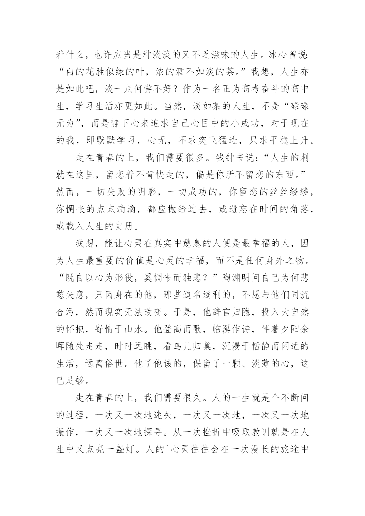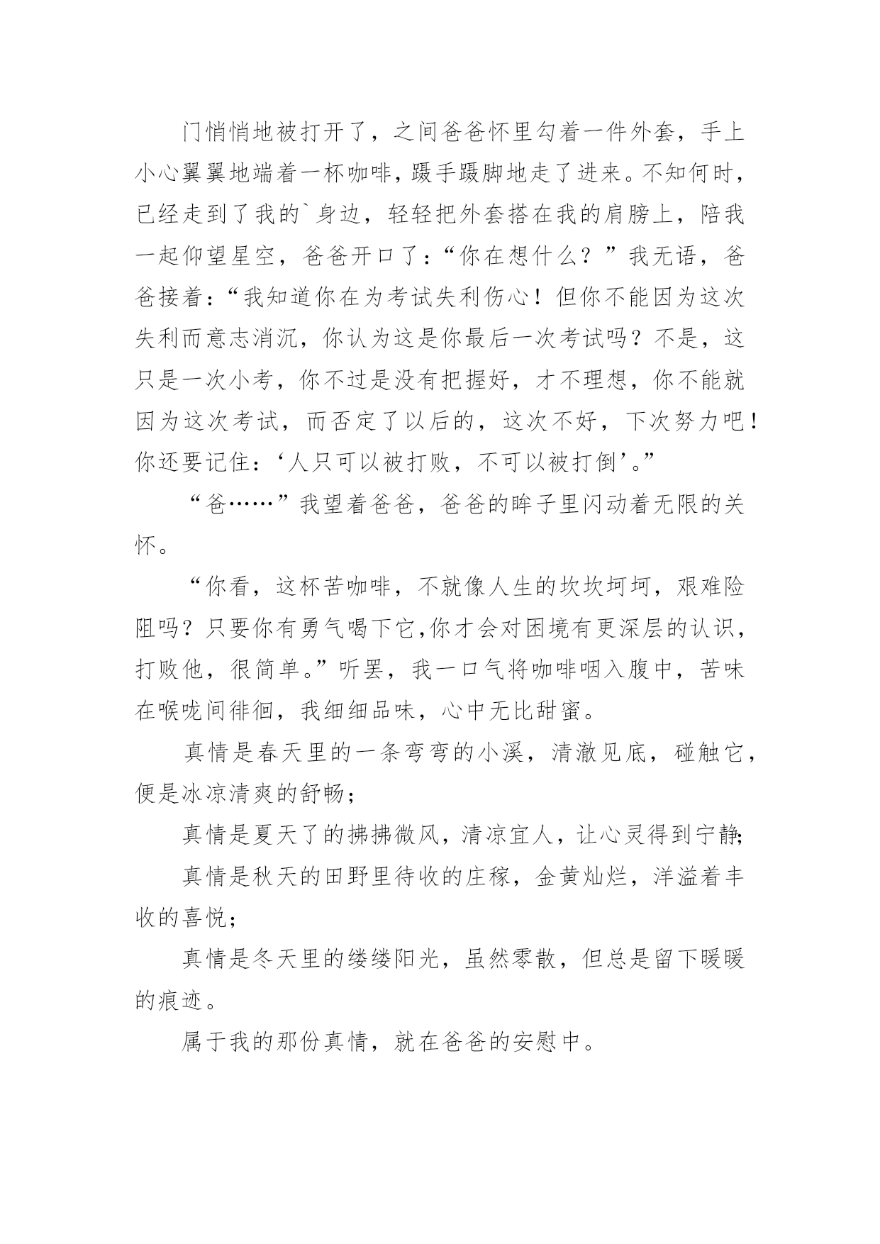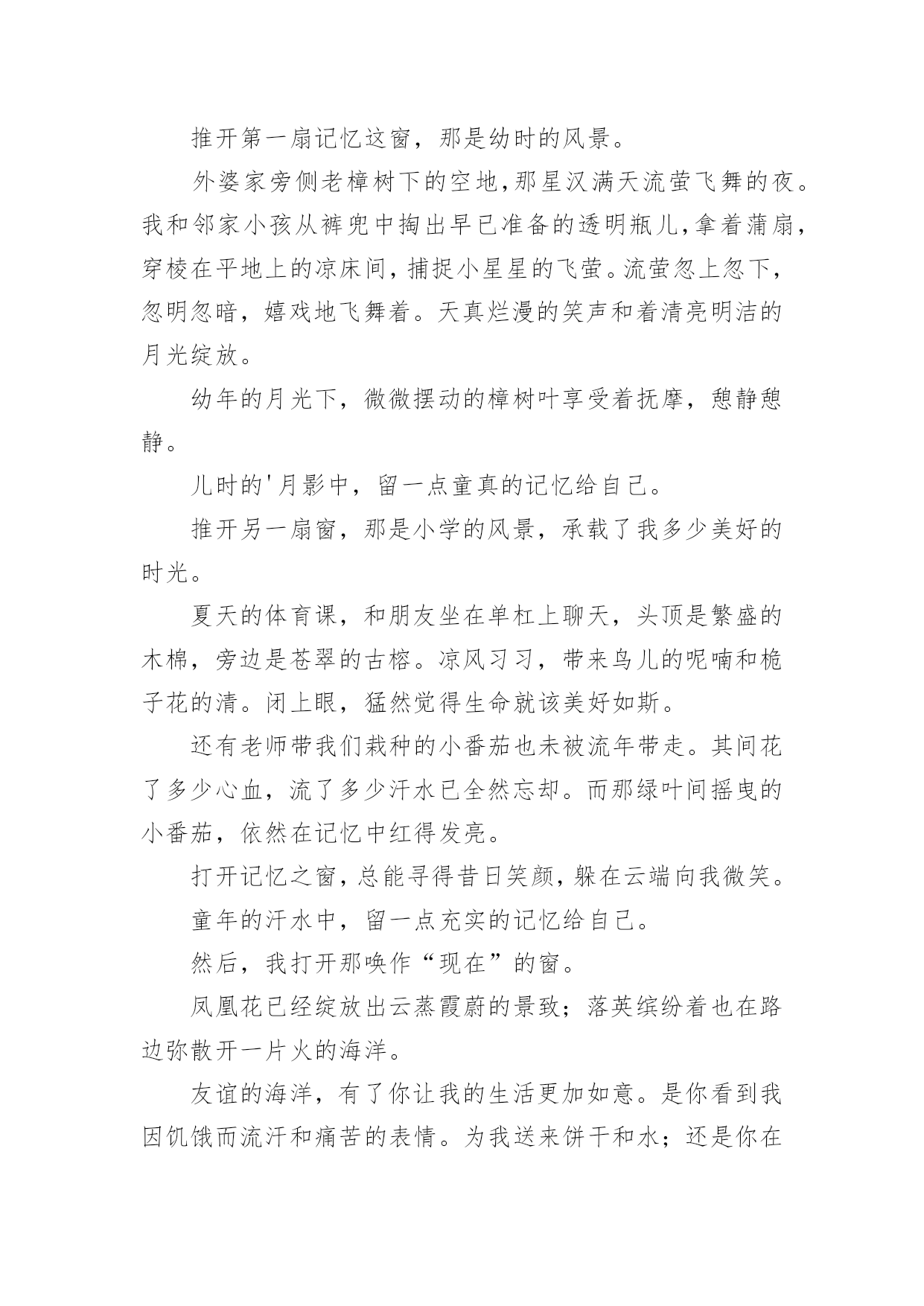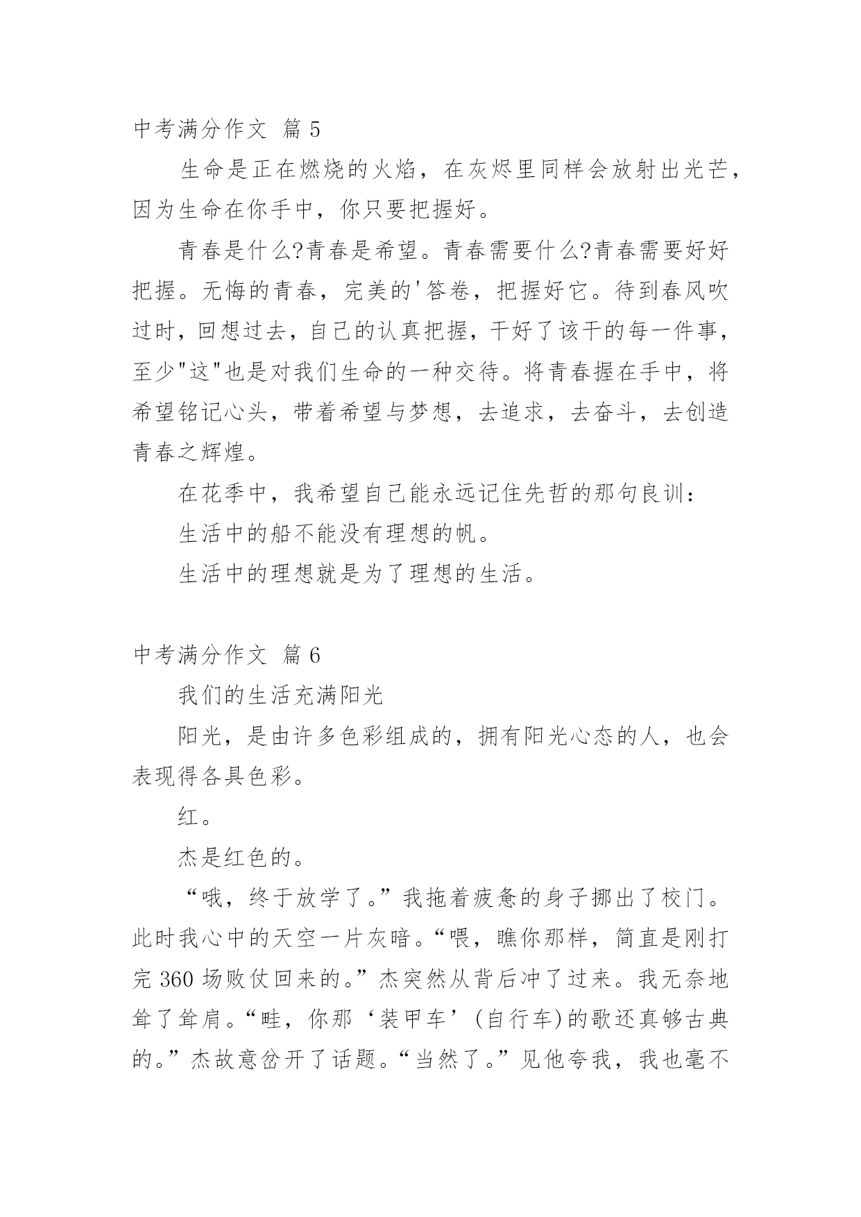 中考满分作文【精品】中考满分作文锦集10篇在平日的学习、工作和生活里,许多人都写过作文吧,作文是经过人的思想考虑和语言组织,通过文字来表达一个主题意义的记叙方法。那么一般作文是怎么写的呢?以下是小编精心整理的中考满分作文10篇,欢迎阅读,希望大家能够喜欢。中考满分作文篇1我弯腰,拾起,惊觉这是初中毕业时同桌送给我的,背面上写着“珍重,朋友!”不记得当时是否有种想哭的冲动,只是现在,枯黄的叶片上早已是滴滴泪痕。想起,这世上还有一种心情叫感动。很长一段时间,我似乎已经忘了感动的滋味,是我心已冷漠,还是我的心被一些无关紧要的`东西充斥得没有了空间?曾有朋友写给我这样一句话:“我们之所以会擦肩而过,不是因为无缘,而是我们的生活中少了两个字——感动。”的确,我们的心因此不再敏感,我们不再用心收藏起身边的一丝一毫感动,只有当我们错过它,再回首时,才发现原来我们真的失去了很多。总有人抱怨这世上可感动的事情越来越少。可是,只要我们静下心来想一想,你就会发现,其实感动无时不在,无处不在。读书累了,父母为我们削个苹果,是感动;口渴了,朋友帮你打回一杯水,是感动;沮丧时,得到一句宽慰的话,是感动;高兴时,有朋友与你一起分享快乐,是感动;平凡的日子,收到一份小小的祝福,哪怕只是一片花瓣,一片树叶,也是感动……人啊,每天被多少平凡的事情感动着!或许,有时正是由于它们的平凡才让我们视而不见。有这样一句话:“人之所以会感动,是因为他生活在爱之中。”红尘有爱,人间有情,我们又有什么理由要让庸碌蒙住我们的眼睛而无法感受感动的滋味呢?感动是什么?一千个人有一千种答案。但,无论是谁,都无法对一个毫无感情的人说出感动究竟是什么。因为感动不是用嘴说出来的,而是用心品出来的。感动,如沁人心脾的甘泉。畅饮甘泉,我们的内心变得澄澈而又明亮。感动,如熏人欲醉的海风。感受海风,我们的内心变得纯净而又宽敞。中考满分作文篇2风吹落如花般碎碎的流年,总有一点记忆是自己梦途中最美的点缀,成长路上留一点记忆给自己,推开记忆之窗,总能看到美丽而熟悉的风景。推开第一扇记忆这窗,那是幼时的风景。外婆家旁侧老樟树下的空地,那星汉满天流萤飞舞的夜。我和邻家小孩从裤兜中掏出早已准备的透明瓶儿,拿着蒲扇,穿棱在平地上的凉床间,捕捉小星星的飞萤。流萤忽上忽下,忽明忽暗,嬉戏地飞舞着。天真烂漫的笑声和着清亮明洁的月光绽放。幼年的月光下,微微摆动的樟树叶享受着抚摩,憩静憩静。儿时的'月影中,留一点童真的记忆给自己。推开另一扇窗,那是小学的风景,承载了我多少美好的时光。夏天的体育课,和朋友坐在单杠上聊天,头顶是繁盛的木棉,旁边是苍翠的古榕。凉风习习,带来鸟儿的呢喃和桅子花的清。闭上眼,猛然觉得生命就该美好如斯。还有老师带我们栽种的小番茄也未被流年带走。其间花了多少心血,流了多少汗水已全然忘却。而那绿叶间摇曳的小番茄,依然在记忆中红得发亮。打开记忆之窗,总能寻得昔日笑颜,躲在云端向我微笑。童年的汗水中,留一点充实的记忆给自己。然后,我打开那唤作“现在”的窗。凤凰花已经绽放出云蒸霞蔚的景致;落英缤纷着也在路边弥散开一片火的海洋。友谊的海洋,有了你让我的生活更加如意。是你看到我因饥饿而流汗和痛苦的表情。为我送来饼干和水;还是你在我受伤时,为我的伤口涂上药水。是你坐在礼堂上,为在台上演讲的我助威鼓励;还是你为跑道上的我加油鼓励。现在的校园里,留一点友情的记忆给自己。当我看到这些记忆的景致,不免忧心:这盛开的记忆之花会随着时光流转凋谢吗?那关于我们班级的美好瞬间,如段赛,班会,校运会,春游,踏青??都会遗失在记忆的角落里?不!不会!因为那记忆是我身体的一部分,那情已融入我的血液,深入我的骨髓。当我打开记忆之窗,必然觅到几许笑颜浸染点缀我的人生。在成长的路上,留一点记忆给自己,让我在道路的两旁随时播种随时开花,把成长的长径点缀的花香弥漫,让穿花拂叶的我们,踏着荆棘,不觉痛苦;有泪可挥,不觉悲凉。评语:作者非常聪明,善于运用生活中的素材。选取三个人生片段“幼时”“小学”“现在”,紧扣“记忆的景致”,回忆往事,抒写情感。最后两段文字跳脱了一般同学简单的总结,能转入对“记忆是否会遗失”的思考,巧妙化用冰心的文字,不但扣题,而且升华了文意。中考满分作文篇3成功的有多远,这话不是要问双脚而是要问志向;攀上成功的高峰有多难,这话不是要问双手而是要问。生活的时日是太漫长了,我们走在这茫茫人生上难免跌跌撞撞,即使如此,青春的上一切都还如花似锦,韶华灿烂。我们各有彼此,奔跑于世,只为着向自己的目标和理想奔去。走在青春的上,我们需要思考很多。我问自己的心向往着什么,也许应当是种淡淡的又不乏滋味的人生。冰心曾说:“白的花胜似绿的叶,浓的酒不如淡的茶。”我想,人生亦是如此吧,淡一点何尝不好?作为一名正为高考奋斗的高中生,学习生活亦更如此。当