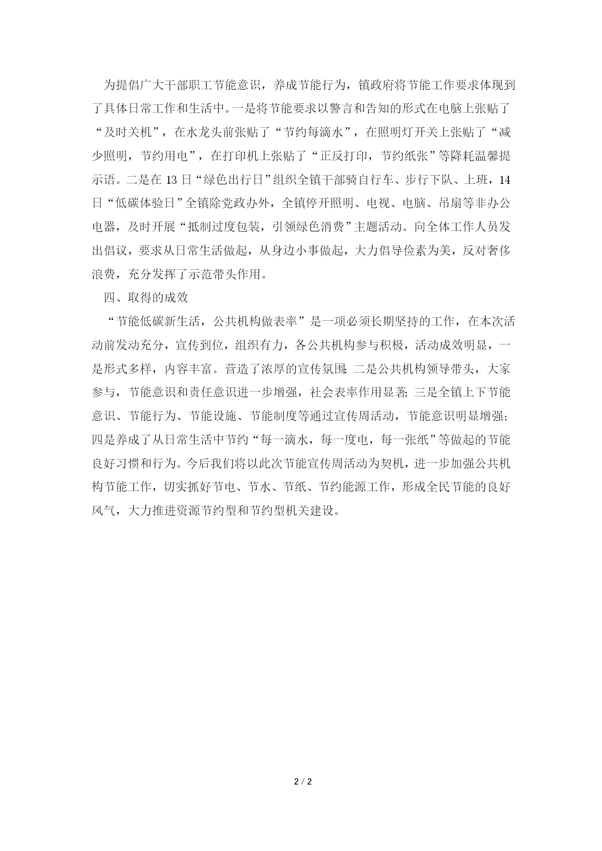 PAGE2/NUMPAGES2公共节能宣传周工作总结一、指导思想以科学发展观为指导,以《节约能源法》、《公共机构节能条例》、《省公共机构节能办法》为依据,以建设资源节约型机关为目标,宣传节约资源基本国策,突出宣传节能形势和节能法律法规、方针政策、新技术、新经验等主题内容,增强公共机构工作人员的节能意识,提高节能管理水平和能源利用效率,加快节约型机关建设。二、活动主题年我县公共机构节能宣传周活动的主题是“节能低碳新生活,公共机构做表率”。三、主要措施1、加强领导,狠抓落实在节能宣传周活动一开始镇上成立了镇公共机构节能领导小组,制定了《镇公共机构宣传周活动实施方案》召开工作会议,布置了此次宣传活动周的工作要求,传达学习了《年县公共机构节能宣传周活动组织方案》的通知,对日常工作电脑、照明灯、供水设施、纸张、用电器使用要求进行了规范,并落实了具体责任人和违规处罚制度,从制度上促进了节能降耗工作的开展。2、广泛宣传、增强实效为进一步提高全体干部职工节能降耗意识,养成良好的习惯行为,形成机关节约能源的浓厚氛围,自11日开始,全镇上下积极着手宣传周活动的筹备工作,进行了宣传发动,通过张贴标语和宣传画,悬挂横幅,印发宣传资料等形式广泛开展宣传,营造了浓厚的氛围,倡导“全民行动、青年为先、节能先行、科学发展”的节能理念,整个宣传周共召开大小会议4次,张贴标语2幅,悬挂宣传横幅1幅,发放宣传资料60多份,管理制度60多份,确保全镇干部职工人手一份,节能宣传单、制度,增强了开展节约能源低碳新生活,公共机构做表率节能降耗工作的紧迫感和责任感。3、采取措施,加强管理为提倡广大干部职工节能意识,养成节能行为,镇政府将节能工作要求体现到了具体日常工作和生活中。一是将节能要求以警言和告知的形式在电脑上张贴了“及时关机”,在水龙头前张贴了“节约每滴水”,在照明灯开关上张贴了“减少照明,节约用电”,在打印机上张贴了“正反打印,节约纸张”等降耗温馨提示语。二是在13日“绿色出行日”组织全镇干部骑自行车、步行下队、上班,14日“低碳体验日”全镇除党政办外,全镇停开照明、电视、电脑、吊扇等非办公电器,及时开展“抵制过度包装,引领绿色消费”主题活动。向全体工作人员发出倡议,要求从日常生活做起,从身边小事做起,大力倡导俭素为美,反对奢侈浪费,充分发挥了示范带头作用。四、取得的成效“节能低碳新生活,公共机构做表率”是一项必须长期坚持的工作,在本次活动前发动充分,宣传到位,组织有力,各公共机构参与积极,活动成效明显,一是形式多样,内容丰富。营造了浓厚的宣传氛围;二是公共机构领导带头,大家参与,节能意识和责任意识进一步增强,社会表率作用显著;三是全镇上下节能意识、节能行为、节能设施、节能制度等通过宣传周活动,节能意识明显增强;四是养成了从日常生活中节约“每一滴水,每一度电,每一张纸”等做起的节能良好习惯和行为。今后我们将以此次节能宣传周活动为契机,进一步加强公共机构节能工作,切实抓好节电、节水、节纸、节约能源工作,形成全民节能的良好风气,大力推进资源节约型和节约型机关建设。