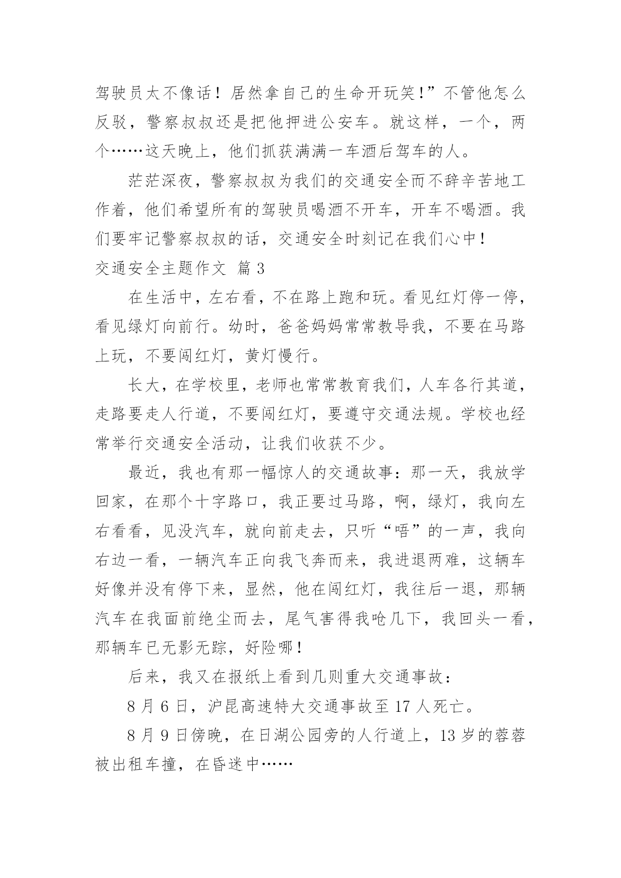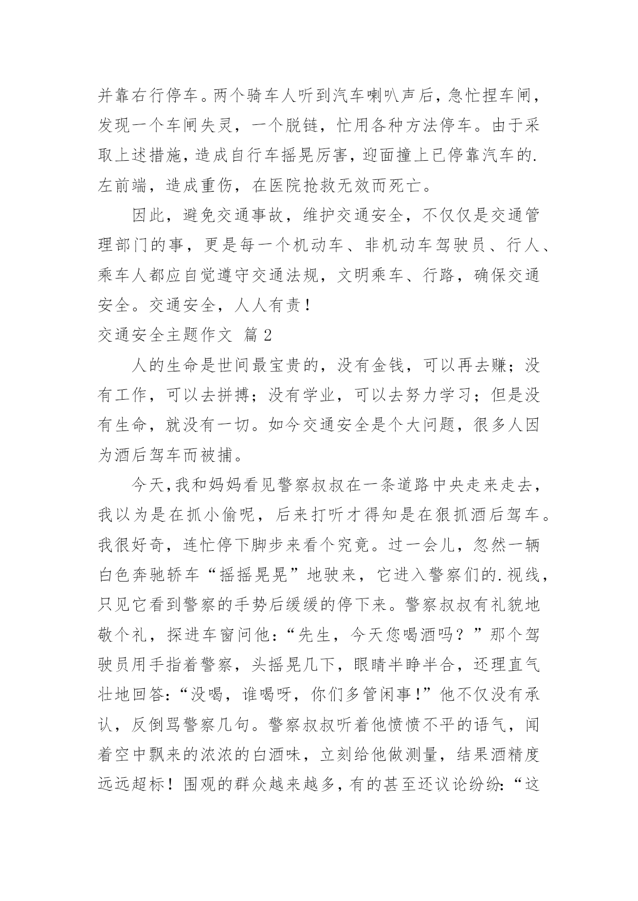交通安全主题作文【精选】交通安全主题作文3篇在平日的学习、工作和生活里,大家都写过作文,肯定对各类作文都很熟悉吧,通过作文可以把我们那些零零散散的思想,聚集在一块。相信很多朋友都对写作文感到非常苦恼吧,下面是小编为大家整理的交通安全主题作文3篇,欢迎阅读,希望大家能够喜欢。交通安全主题作文篇1今天,我看一段关于交通安全的光碟,使我感触颇深。在小学生们非正常死亡人数中,交通事故死亡人数占有一定的比例。于是,学校在今天——全国中小学生安全教育日,给我们上一堂生动的课——在看中学会交通规则,在看中学会自救方法!汽车是现代重要的交通工具,人们在享受汽车带来的方便、快捷的同时,也不得不面对交通事故带来的困扰。车祸,现在已成为人类第一杀手。学生谭某去同学家玩,在返回学校时,因为与同学嬉戏打闹、互相追逐。中途因贪玩,被汽车撞倒、辗压,当场死亡。某校6名学生相约一起外出郊游,途中,马某某与李某骑车打闹,自行车失去平衡,行至下坡路,还是敞开滑行。这时,对面驶来一辆面包车,驾驶员发现两人后,急忙鸣笛并靠右行停车。两个骑车人听到汽车喇叭声后,急忙捏车闸,发现一个车闸失灵,一个脱链,忙用各种方法停车。由于采取上述措施,造成自行车摇晃厉害,迎面撞上已停靠汽车的.左前端,造成重伤,在医院抢救无效而死亡。因此,避免交通事故,维护交通安全,不仅仅是交通管理部门的事,更是每一个机动车、非机动车驾驶员、行人、乘车人都应自觉遵守交通法规,文明乘车、行路,确保交通安全。交通安全,人人有责!交通安全主题作文篇2人的生命是世间最宝贵的,没有金钱,可以再去赚;没有工作,可以去拼搏;没有学业,可以去努力学习;但是没有生命,就没有一切。如今交通安全是个大问题,很多人因为酒后驾车而被捕。今天,我和妈妈看见警察叔叔在一条道路中央走来走去,我以为是在抓小偷呢,后来打听才得知是在狠抓酒后驾车。我很好奇,连忙停下脚步来看个究竟。过一会儿,忽然一辆白色奔驰轿车“摇摇晃晃”地驶来,它进入警察们的.视线,只见它看到警察的手势后缓缓的停下来。警察叔叔有礼貌地敬个礼,探进车窗问他:“先生,今天您喝酒吗?”那个驾驶员用手指着警察,头摇晃几下,眼睛半睁半合,还理直气壮地回答:“没喝,谁喝呀,你们多管闲事!”他不仅没有承认,反倒骂警察几句。警察叔叔听着他愤愤不平的语气,闻着空中飘来的浓浓的白酒味,立刻给他做测量,结果酒精度远远超标!围观的群众越来越多,有的甚至还议论纷纷:“这驾驶员太不像话!居然拿自己的生命开玩笑!”不管他怎么反驳,警察叔叔还是把他押进公安车。就这样,一个,两个……这天晚上,他们抓获满满一车酒后驾车的人。茫茫深夜,警察叔叔为我们的交通安全而不辞辛苦地工作着,他们希望所有的驾驶员喝酒不开车,开车不喝酒。我们要牢记警察叔叔的话,交通安全时刻记在我们心中!交通安全主题作文篇3在生活中,左右看,不在路上跑和玩。看见红灯停一停,看见绿灯向前行。幼时,爸爸妈妈常常教导我,不要在马路上玩,不要闯红灯,黄灯慢行。长大,在学校里,老师也常常教育我们,人车各行其道,走路要走人行道,不要闯红灯,要遵守交通法规。学校也经常举行交通安全活动,让我们收获不少。最近,我也有那一幅惊人的交通故事:那一天,我放学回家,在那个十字路口,我正要过马路,啊,绿灯,我向左右看看,见没汽车,就向前走去,只听“唔”的一声,我向右边一看,一辆汽车正向我飞奔而来,我进退两难,这辆车好像并没有停下来,显然,他在闯红灯,我往后一退,那辆汽车在我面前绝尘而去,尾气害得我呛几下,我回头一看,那辆车已无影无踪,好险哪!后来,我又在报纸上看到几则重大交通事故:8月6日,沪昆高速特大交通事故至17人死亡。8月9日傍晚,在日湖公园旁的人行道上,13岁的蓉蓉被出租车撞,在昏迷中……现在我已经将交通规则牢牢地记在心上:当我们走在繁忙的`大街上,我会拉着爸爸妈妈的手,靠街道的右边走;穿过马路时,我们先左右看再走在斑马线上;有一天,爸爸送我上学,嗨!又是红灯,虽然我心急万分,但还是提醒他不要闯红灯,爸爸也是一个遵守交通的人。朋友们:让我们一起自觉准受交通规则,让明天,更加美好。