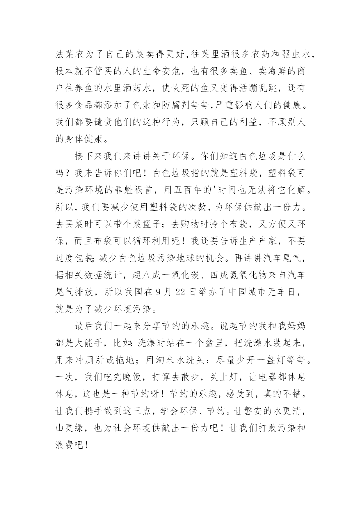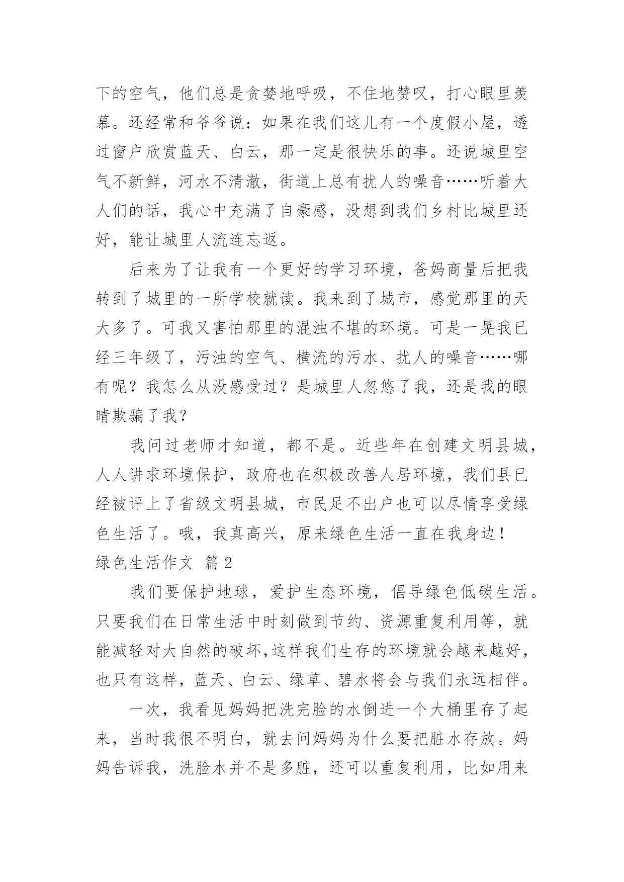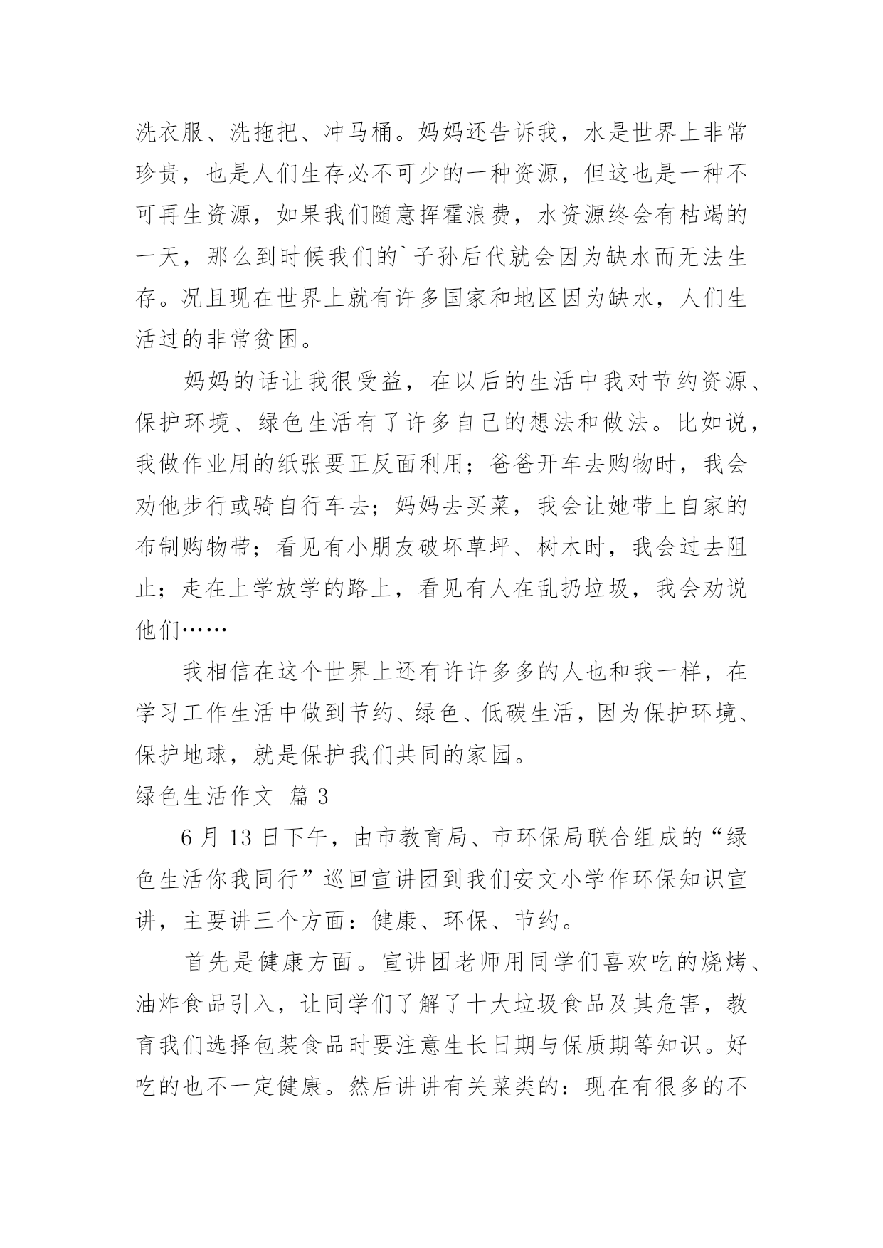绿色生活作文【热门】绿色生活作文三篇在学习、工作或生活中,大家都经常看到作文的身影吧,借助作文人们可以反映客观事物、表达思想感情、传递知识信息。为了让您在写作文时更加简单方便,以下是小编为大家收集的绿色生活作文3篇,供大家参考借鉴,希望可以帮助到有需要的朋友。绿色生活作文篇1说起我的老家——绩溪县瀛洲村,可能人人皆知,那是一个依山傍水的好地方。屋后面的小山上,树木葱茏,花团锦簇。门前有一条清可见底的登源河,清凌凌的河水在阳光照射下闪闪发光,哗哗的流水弹奏着永不休止的欢快的乐曲。这乐曲与林中鸟儿们的欢唱融合在一起,这是大自然献给我们乡下孩子最美妙动听的歌。记得小时候爷爷是村里的干部,家里经常会来些城里的客人。客人到家后,奶奶也不着急着中午吃些什么。上回后山,去趟菜园,便满载而归。不大工夫,香椿炒鸡蛋、排骨炖草菇、土鸡烩板栗、野菜拌花生、春笋红烧肉……满桌清一色“绿色菜肴”,别说吃,就听着这菜名,没准你已经垂涎三尺了。每一次客人们都在尽情享受着农家的“绿色”美餐。城里的亲戚不仅喜欢我们农家的.菜肴,还喜欢我们乡下的空气,他们总是贪婪地呼吸,不住地赞叹,打心眼里羡慕。还经常和爷爷说:如果在我们这儿有一个度假小屋,透过窗户欣赏蓝天、白云,那一定是很快乐的事。还说城里空气不新鲜,河水不清澈,街道上总有扰人的噪音……听着大人们的话,我心中充满了自豪感,没想到我们乡村比城里还好,能让城里人流连忘返。后来为了让我有一个更好的学习环境,爸妈商量后把我转到了城里的一所学校就读。我来到了城市,感觉那里的天大多了。可我又害怕那里的混浊不堪的环境。可是一晃我已经三年级了,污浊的空气、横流的污水、扰人的噪音……哪有呢?我怎么从没感受过?是城里人忽悠了我,还是我的眼睛欺骗了我?我问过老师才知道,都不是。近些年在创建文明县城,人人讲求环境保护,政府也在积极改善人居环境,我们县已经被评上了省级文明县城,市民足不出户也可以尽情享受绿色生活了。哦,我真高兴,原来绿色生活一直在我身边!绿色生活作文篇2我们要保护地球,爱护生态环境,倡导绿色低碳生活。只要我们在日常生活中时刻做到节约、资源重复利用等,就能减轻对大自然的破坏,这样我们生存的环境就会越来越好,也只有这样,蓝天、白云、绿草、碧水将会与我们永远相伴。一次,我看见妈妈把洗完脸的水倒进一个大桶里存了起来,当时我很不明白,就去问妈妈为什么要把脏水存放。妈妈告诉我,洗脸水并不是多脏,还可以重复利用,比如用来洗衣服、洗拖把、冲马桶。妈妈还告诉我,水是世界上非常珍贵,也是人们生存必不可少的一种资源,但这也是一种不可再生资源,如果我们随意挥霍浪费,水资源终会有枯竭的一天,那么到时候我们的`子孙后代就会因为缺水而无法生存。况且现在世界上就有许多国家和地区因为缺水,人们生活过的非常贫困。妈妈的话让我很受益,在以后的生活中我对节约资源、保护环境、绿色生活有了许多自己的想法和做法。比如说,我做作业用的纸张要正反面利用;爸爸开车去购物时,我会劝他步行或骑自行车去;妈妈去买菜,我会让她带上自家的布制购物带;看见有小朋友破坏草坪、树木时,我会过去阻止;走在上学放学的路上,看见有人在乱扔垃圾,我会劝说他们……我相信在这个世界上还有许许多多的人也和我一样,在学习工作生活中做到节约、绿色、低碳生活,因为保护环境、保护地球,就是保护我们共同的家园。绿色生活作文篇36月13日下午,由市教育局、市环保局联合组成的“绿色生活你我同行”巡回宣讲团到我们安文小学作环保知识宣讲,主要讲三个方面:健康、环保、节约。首先是健康方面。宣讲团老师用同学们喜欢吃的烧烤、油炸食品引入,让同学们了解了十大垃圾食品及其危害,教育我们选择包装食品时要注意生长日期与保质期等知识。好吃的也不一定健康。然后讲讲有关菜类的:现在有很多的不法菜农为了自己的菜卖得更好,往菜里洒很多农药和驱虫水,根本就不管买的人的生命安危,也有很多卖鱼、卖海鲜的商户往养鱼的水里洒药水,使快死的鱼又变得活蹦乱跳,还有很多食品都添加了色素和防腐剂等等,严重影响人们的健康。我们都要谴责他们的这种行为,只顾自己的利益,不顾别人的身体健康。接下来我们来讲讲关于环保。你们知道白色垃圾是什么吗?我来告诉你们吧!白色垃圾指的就是塑料袋,塑料袋可是污染环境的罪魁祸首,用五百年的'时间也无法将它化解。所以,我们要减少使用塑料袋的次数,为环保供献出一份力。去买菜时可以带个菜篮子;去购物时拎个布袋,又方便又环保,而且布袋可以循环利用呢!我还要告诉生产产家,不要过度包装;减少白色垃圾污染地球的机会。再讲讲汽车尾气,据相关数据统计,超八成一氧化碳、四成氮氧化物来自汽车尾气排放,所以我国在9月22日举办了中国城市无车日,就是为了减少环境污染。最后我们一起来分享节约的乐趣。说起节约我和我妈妈都是大能手,比如:洗澡时站在一个盆里,把洗
