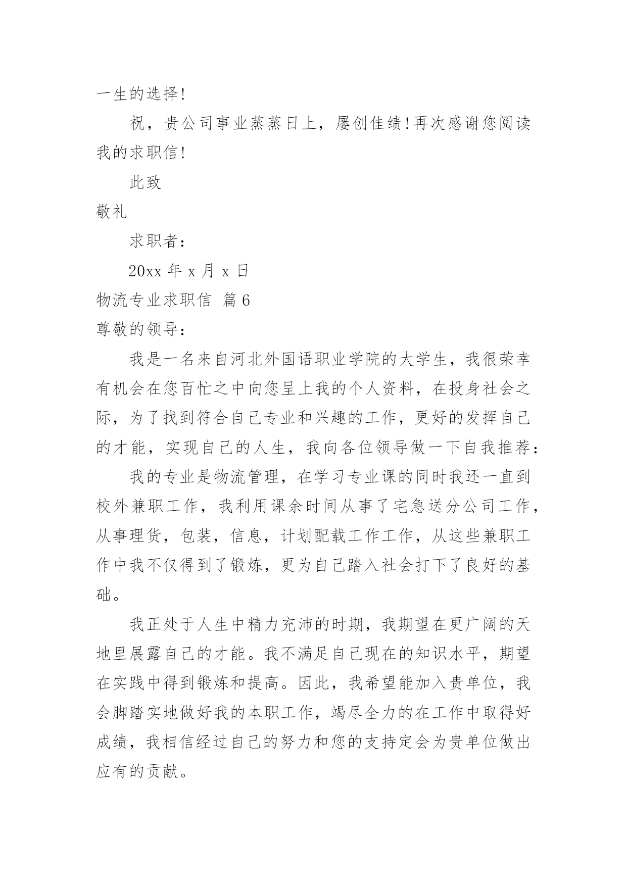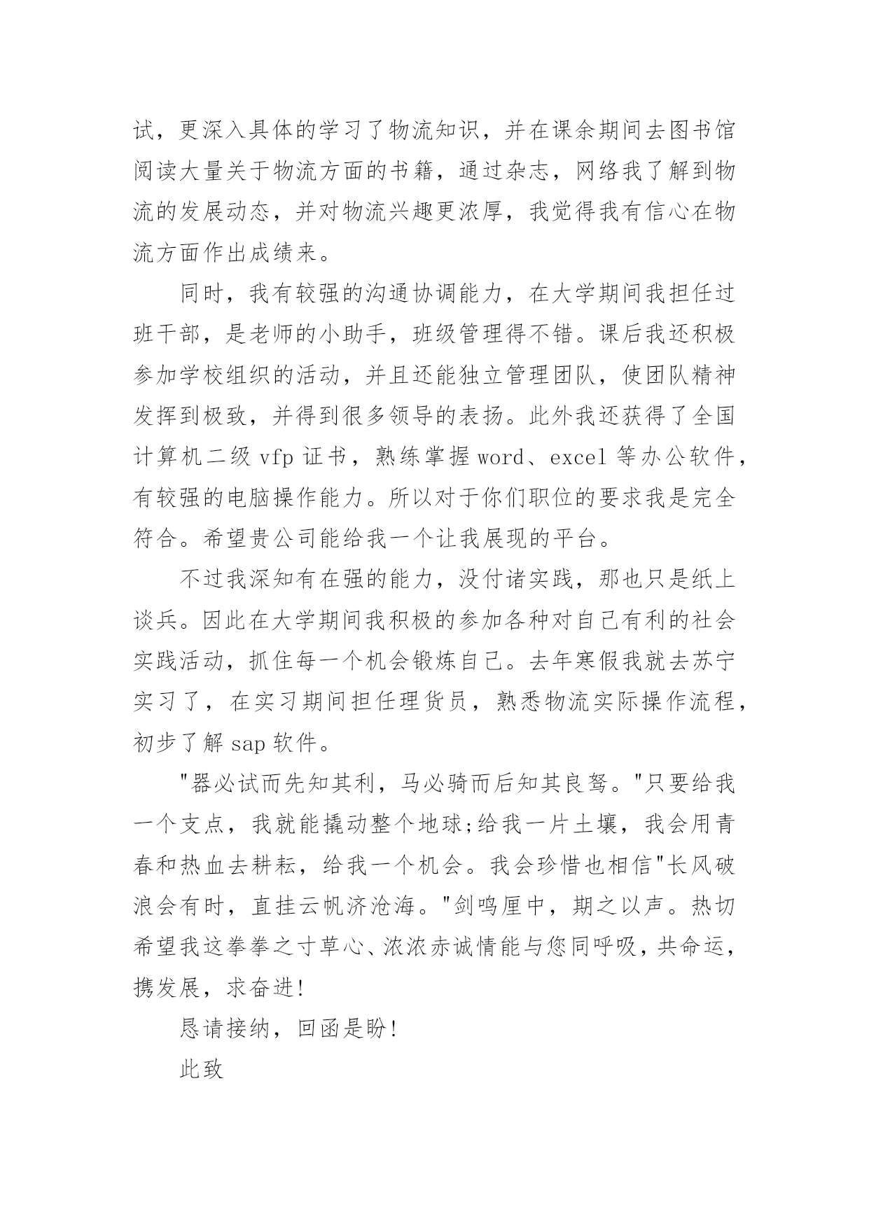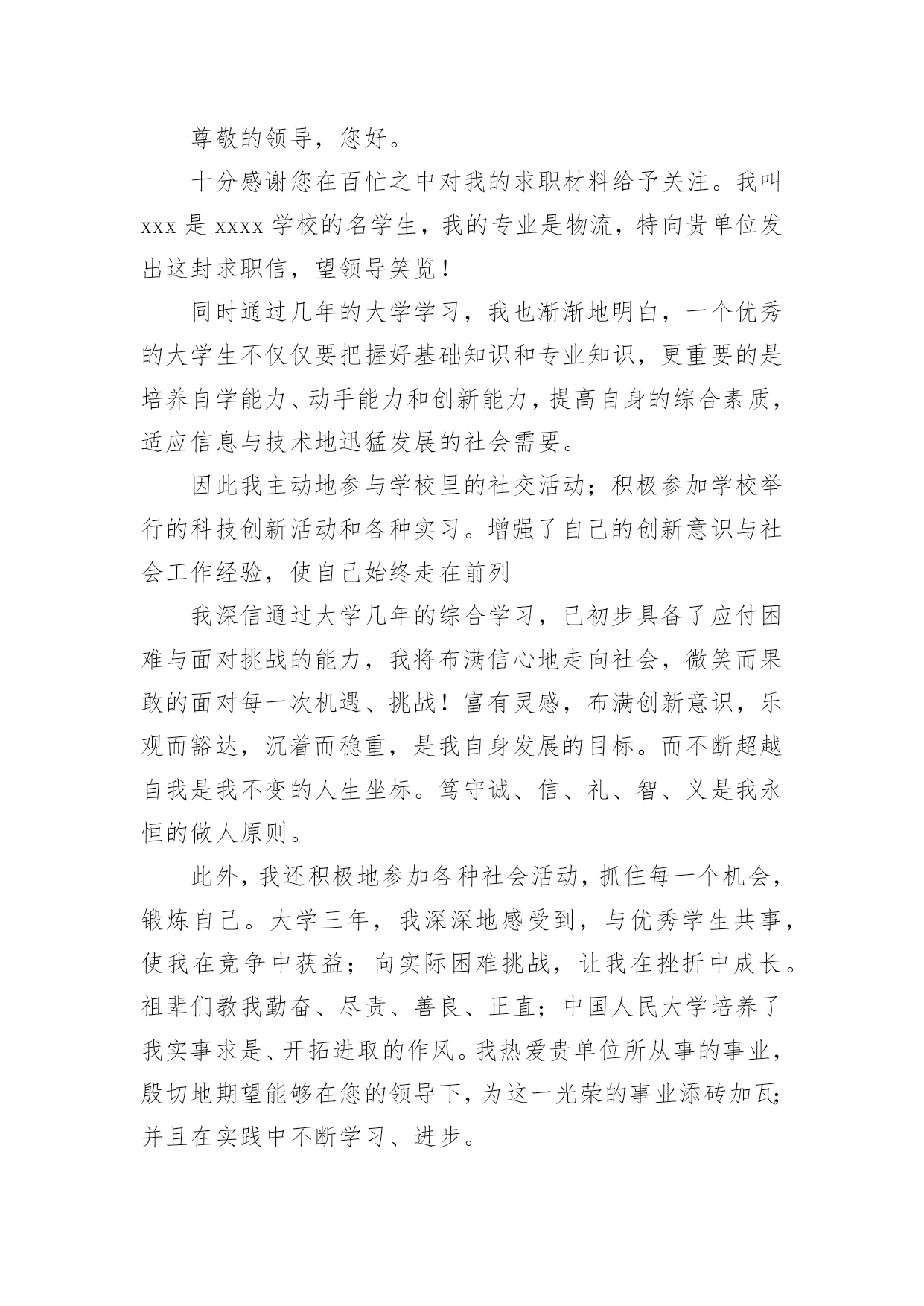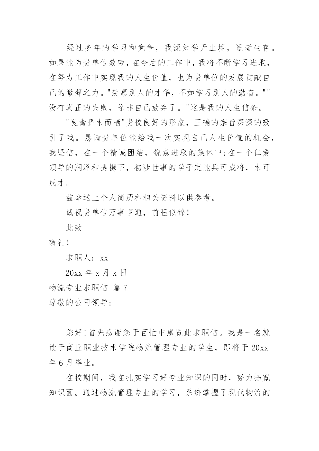 物流专业求职信关于物流专业求职信模板七篇时间一晃而过,我们又将面临求职找工作的挑战,需要为此写一封求职信了哦。写求职信需要注意哪些问题呢?以下是小编整理的物流专业求职信7篇,仅供参考,欢迎大家阅读。物流专业求职信篇1尊敬的领导:您好!我叫奉贻辉。是湖南岳阳职业技术学院流管理专业的应届毕业生,与众多莘莘学子一样,毕业在即,收获在望,等待社会的检验,期待您的选择。感谢您在百忙之中能抽空审阅我的求职信。大学期间,我的成绩优异,在扎实学习好专业知识的同时,努力拓宽知识面。通过物流管理专业的学习,我在不断的学习和实践中提高了自己的综合素质,已把自己塑造成为一个专业功底扎实、知识结构完善、适应能力强、富于协作精神的时代青年。在校期间通过专业实训和国家正规机关考核后获得了助理物流师和报关员职业资格从业证书。通过学习,我分别获得了省计算机A级证书和全国A级证书。能熟练的操作office办公软件。在校期间,我积极参与院系的各类活动,我通过加入学生会和参与各种社团活动,培养了组织、协调和社会交往能力;同时,利用寒暑假期间,去工厂打工和去物流公司实习,较好地培养了社会实践和与顾客沟通交流的能力。作为一名物流管理专业应届毕业生,毕业之际,我迫切希望能找到一份适合自己的工作。我想从事物流助理、物流专员的职位,我期望从一线职位做起,把所学到的专业知识,与实际工作情况相结合,快速积累最基础的工作经验,所以工作初期阶段,本人期望从事物流实际操作。如在仓储部、快递部门、配送部门。把在校学到的理论知识和自己潜隐的创造力赋之于实践,最重要的是在实践中不断地学习,锻炼和壮大自己,从而实现自己的人生价值。今天自信的我、努力的我希望贵公司能给我提供一个创造梦想的舞台,我将坚持不懈地努力回报公司的垂爱。作为一名应届大学毕业生,我所拥有的是年轻与活力、知识与闯劲。年轻或许意味着缺乏经验,但是年轻也意味着热情与活力,我自信能凭自己的能力和学识在毕业以后的工作和生活中克服各种困难,不断实现自我的人生价值和追求的目标。我真诚希望成为你们的一员,我相信贵公司是我不会后悔的选择。“给我一个机会,还您一个回报”。我恭候您的佳音!我相信自己能力,更相信您的正确选择!此致敬礼!物流专业求职信篇2尊敬的领导,您好。十分感谢您在百忙之中对我的求职材料给予关注。我叫xxx是xxxx学校的名学生,我的专业是物流,特向贵单位发出这封求职信,望领导笑览!同时通过几年的大学学习,我也渐渐地明白,一个优秀的大学生不仅仅要把握好基础知识和专业知识,更重要的是培养自学能力、动手能力和创新能力,提高自身的综合素质,适应信息与技术地迅猛发展的社会需要。因此我主动地参与学校里的社交活动;积极参加学校举行的科技创新活动和各种实习。增强了自己的创新意识与社会工作经验,使自己始终走在前列我深信通过大学几年的综合学习,已初步具备了应付困难与面对挑战的能力,我将布满信心地走向社会,微笑而果敢的面对每一次机遇、挑战!富有灵感,布满创新意识,乐观而豁达,沉着而稳重,是我自身发展的目标。而不断超越自我是我不变的人生坐标。笃守诚、信、礼、智、义是我永恒的做人原则。此外,我还积极地参加各种社会活动,抓住每一个机会,锻炼自己。大学三年,我深深地感受到,与优秀学生共事,使我在竞争中获益;向实际困难挑战,让我在挫折中成长。祖辈们教我勤奋、尽责、善良、正直;中国人民大学培养了我实事求是、开拓进取的作风。我热爱贵单位所从事的事业,殷切地期望能够在您的领导下,为这一光荣的事业添砖加瓦;并且在实践中不断学习、进步。收笔之际,郑重地提一个小小的要求:无论您是否选择我,尊敬的领导,希望您能够接受我诚恳的谢意!祝愿贵单位事业蒸蒸日上!此致敬礼!求职信:xxxxxxx年xx月xx日物流专业求职信篇3尊敬的领导:您好!感谢您在百忙之中抽时间看我的简历;本人女,xx年出生在湘潭,xx年被湖南化工职业技术学院录取,并选择了适合自己学习的物流管理专业。一直以来我学习刻苦,勤于钻研,在三年内,学院给了我得智体美全面的教育,科学的安排了;物流概论、配送实务、仓储管理与实务、市场营销、市场调研与预测等课程。三年期间修完全部课程并顺利地通过了助理物流师考证;适应社会和公司对人才的.要求。为了锻炼自己、服务大家,在大学期间我竞选了班上的生活委员;积极地参与学校的社团活动;由于对唱歌和感兴趣,曾两次获得校园十佳歌手的称号。大一、大二暑假期间为了培养自己的能力,了解社会,我先后两次做过暑期工,(客服信息管理员与电子厂补线员)而且两次所选的工作属于两个不同的行业,这使得我接触和了解了更多的事物,积累了一定的社会实践经验。我真诚地希望加盟贵公司,我定会以饱满的热情和坚韧的性格勤奋工作,与同事精诚合作,为贵单位的发展尽自己的绵薄之力。敬请勘酌,恳请接纳,回函是盼,我恭候您的佳音!