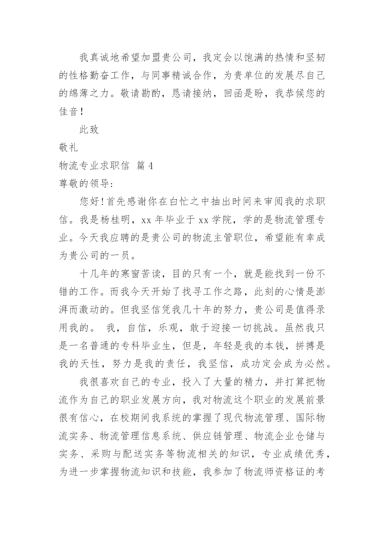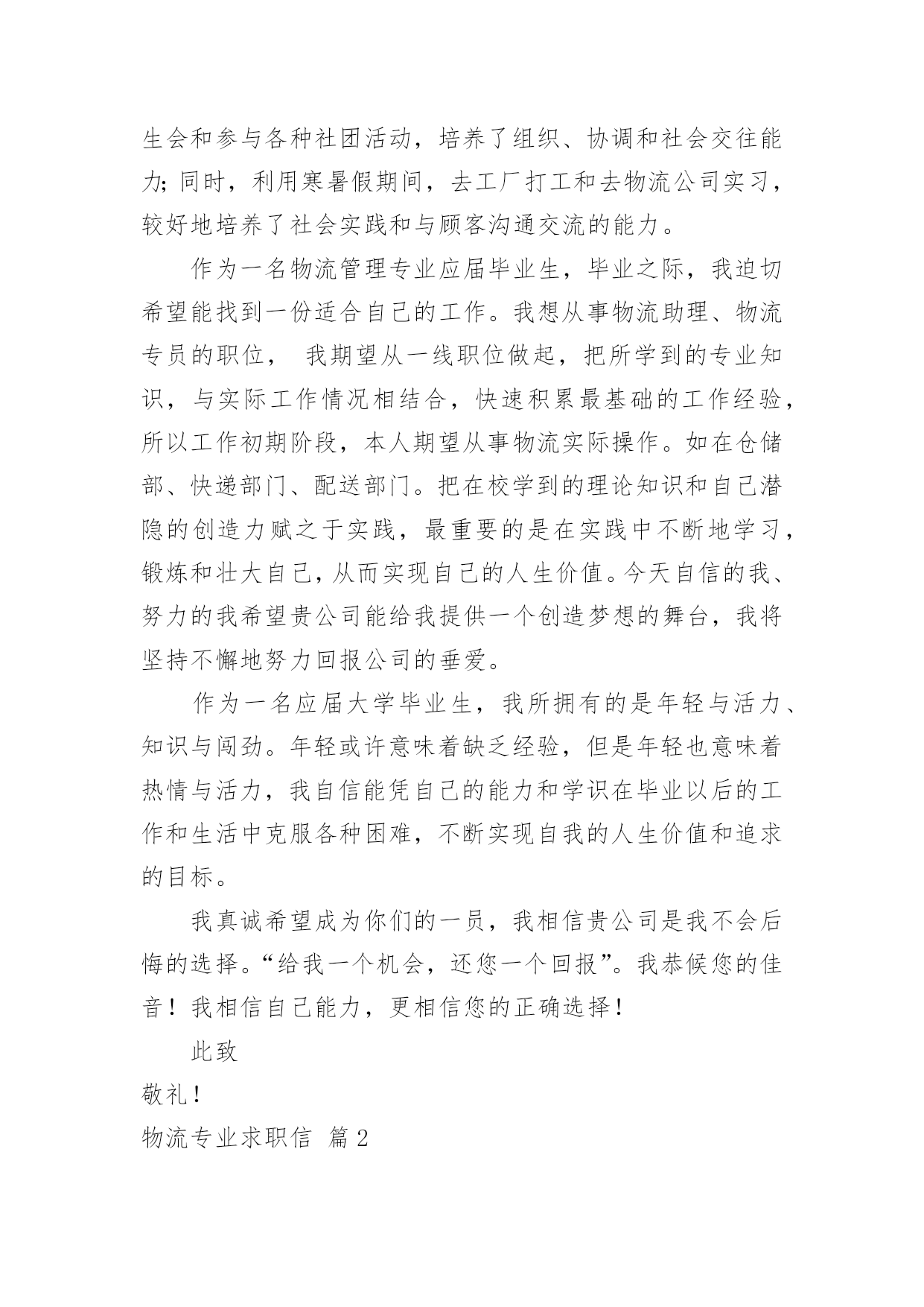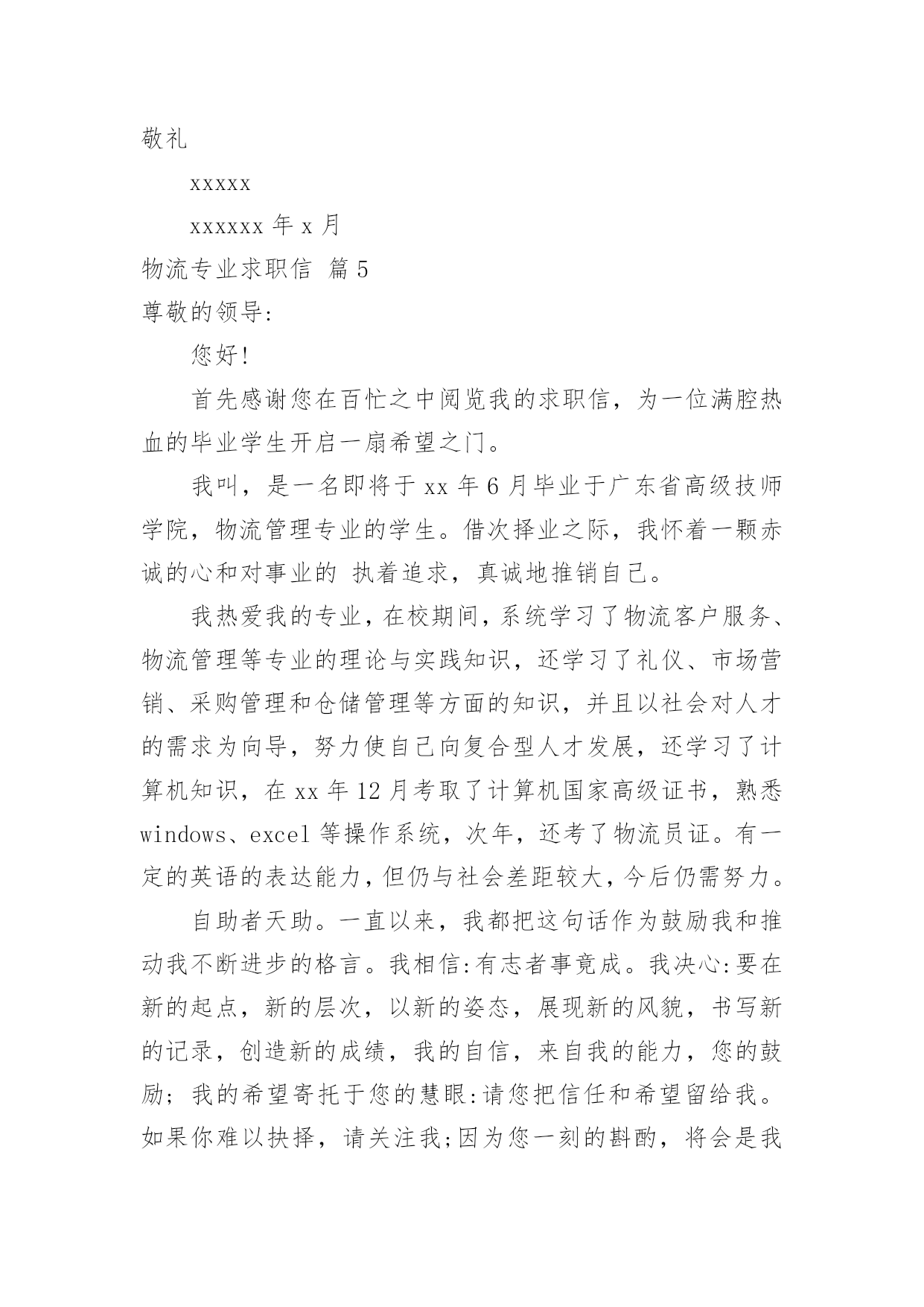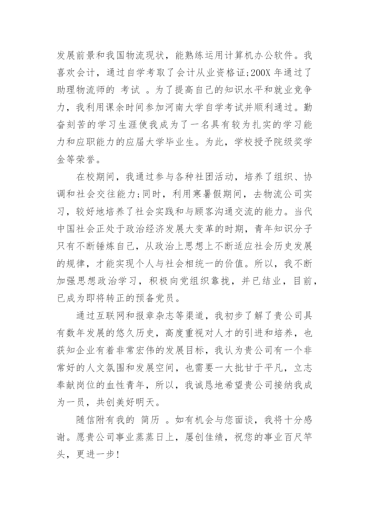 物流专业求职信关于物流专业求职信模板七篇时间一晃而过,我们又将面临求职找工作的挑战,需要为此写一封求职信了哦。写求职信需要注意哪些问题呢?以下是小编整理的物流专业求职信7篇,仅供参考,欢迎大家阅读。物流专业求职信篇1尊敬的领导:您好!我叫奉贻辉。是湖南岳阳职业技术学院流管理专业的应届毕业生,与众多莘莘学子一样,毕业在即,收获在望,等待社会的检验,期待您的选择。感谢您在百忙之中能抽空审阅我的求职信。大学期间,我的成绩优异,在扎实学习好专业知识的同时,努力拓宽知识面。通过物流管理专业的学习,我在不断的学习和实践中提高了自己的综合素质,已把自己塑造成为一个专业功底扎实、知识结构完善、适应能力强、富于协作精神的时代青年。在校期间通过专业实训和国家正规机关考核后获得了助理物流师和报关员职业资格从业证书。通过学习,我分别获得了省计算机A级证书和全国A级证书。能熟练的操作office办公软件。在校期间,我积极参与院系的各类活动,我通过加入学生会和参与各种社团活动,培养了组织、协调和社会交往能力;同时,利用寒暑假期间,去工厂打工和去物流公司实习,较好地培养了社会实践和与顾客沟通交流的能力。作为一名物流管理专业应届毕业生,毕业之际,我迫切希望能找到一份适合自己的工作。我想从事物流助理、物流专员的职位,我期望从一线职位做起,把所学到的专业知识,与实际工作情况相结合,快速积累最基础的工作经验,所以工作初期阶段,本人期望从事物流实际操作。如在仓储部、快递部门、配送部门。把在校学到的理论知识和自己潜隐的创造力赋之于实践,最重要的是在实践中不断地学习,锻炼和壮大自己,从而实现自己的人生价值。今天自信的我、努力的我希望贵公司能给我提供一个创造梦想的舞台,我将坚持不懈地努力回报公司的垂爱。作为一名应届大学毕业生,我所拥有的是年轻与活力、知识与闯劲。年轻或许意味着缺乏经验,但是年轻也意味着热情与活力,我自信能凭自己的能力和学识在毕业以后的工作和生活中克服各种困难,不断实现自我的人生价值和追求的目标。我真诚希望成为你们的一员,我相信贵公司是我不会后悔的选择。“给我一个机会,还您一个回报”。我恭候您的佳音!我相信自己能力,更相信您的正确选择!此致敬礼!物流专业求职信篇2尊敬的领导,您好。十分感谢您在百忙之中对我的求职材料给予关注。我叫xxx是xxxx学校的名学生,我的专业是物流,特向贵单位发出这封求职信,望领导笑览!同时通过几年的大学学习,我也渐渐地明白,一个优秀的大学生不仅仅要把握好基础知识和专业知识,更重要的是培养自学能力、动手能力和创新能力,提高自身的综合素质,适应信息与技术地迅猛发展的社会需要。因此我主动地参与学校里的社交活动;积极参加学校举行的科技创新活动和各种实习。增强了自己的创新意识与社会工作经验,使自己始终走在前列我深信通过大学几年的综合学习,已初步具备了应付困难与面对挑战的能力,我将布满信心地走向社会,微笑而果敢的面对每一次机遇、挑战!富有灵感,布满创新意识,乐观而豁达,沉着而稳重,是我自身发展的目标。而不断超越自我是我不变的人生坐标。笃守诚、信、礼、智、义是我永恒的做人原则。此外,我还积极地参加各种社会活动,抓住每一个机会,锻炼自己。大学三年,我深深地感受到,与优秀学生共事,使我在竞争中获益;向实际困难挑战,让我在挫折中成长。祖辈们教我勤奋、尽责、善良、正直;中国人民大学培养了我实事求是、开拓进取的作风。我热爱贵单位所从事的事业,殷切地期望能够在您的领导下,为这一光荣的事业添砖加瓦;并且在实践中不断学习、进步。收笔之际,郑重地提一个小小的要求:无论您是否选择我,尊敬的领导,希望您能够接受我诚恳的谢意!祝愿贵单位事业蒸蒸日上!此致敬礼!求职信:xxxxxxx年xx月xx日物流专业求职信篇3尊敬的领导:您好!感谢您在百忙之中抽时间看我的简历;本人女,xx年出生在湘潭,xx年被湖南化工职业技术学院录取,并选择了适合自己学习的物流管理专业。一直以来我学习刻苦,勤于钻研,在三年内,学院给了我得智体美全面的教育,科学的安排了;物流概论、配送实务、仓储管理与实务、市场营销、市场调研与预测等课程。三年期间修完全部课程并顺利地通过了助理物流师考证;适应社会和公司对人才的.要求。为了锻炼自己、服务大家,在大学期间我竞选了班上的生活委员;积极地参与学校的社团活动;由于对唱歌和感兴趣,曾两次获得校园十佳歌手的称号。大一、大二暑假期间为了培养自己的能力,了解社会,我先后两次做过暑期工,(客服信息管理员与电子厂补线员)而且两次所选的工作属于两个不同的行业,这使得我接触和了解了更多的事物,积累了一定的社会实践经验。我真诚地希望加盟贵公司,我定会以饱满的热情和坚韧的性格勤奋工作,与同事精诚合作,为贵单位的发展尽自己的绵薄之力。敬请勘酌,恳请接纳,回函是盼,我恭候您的佳音!