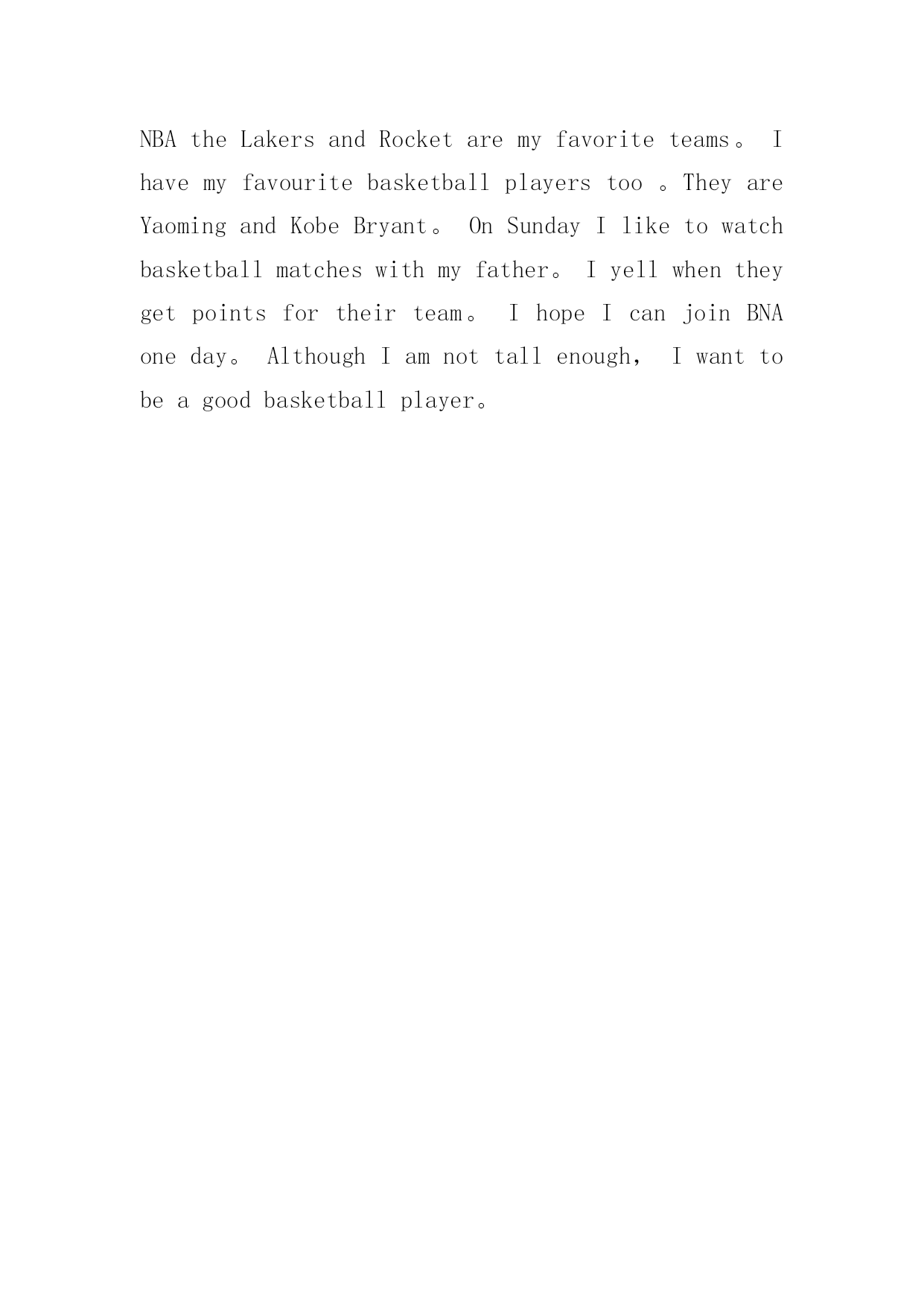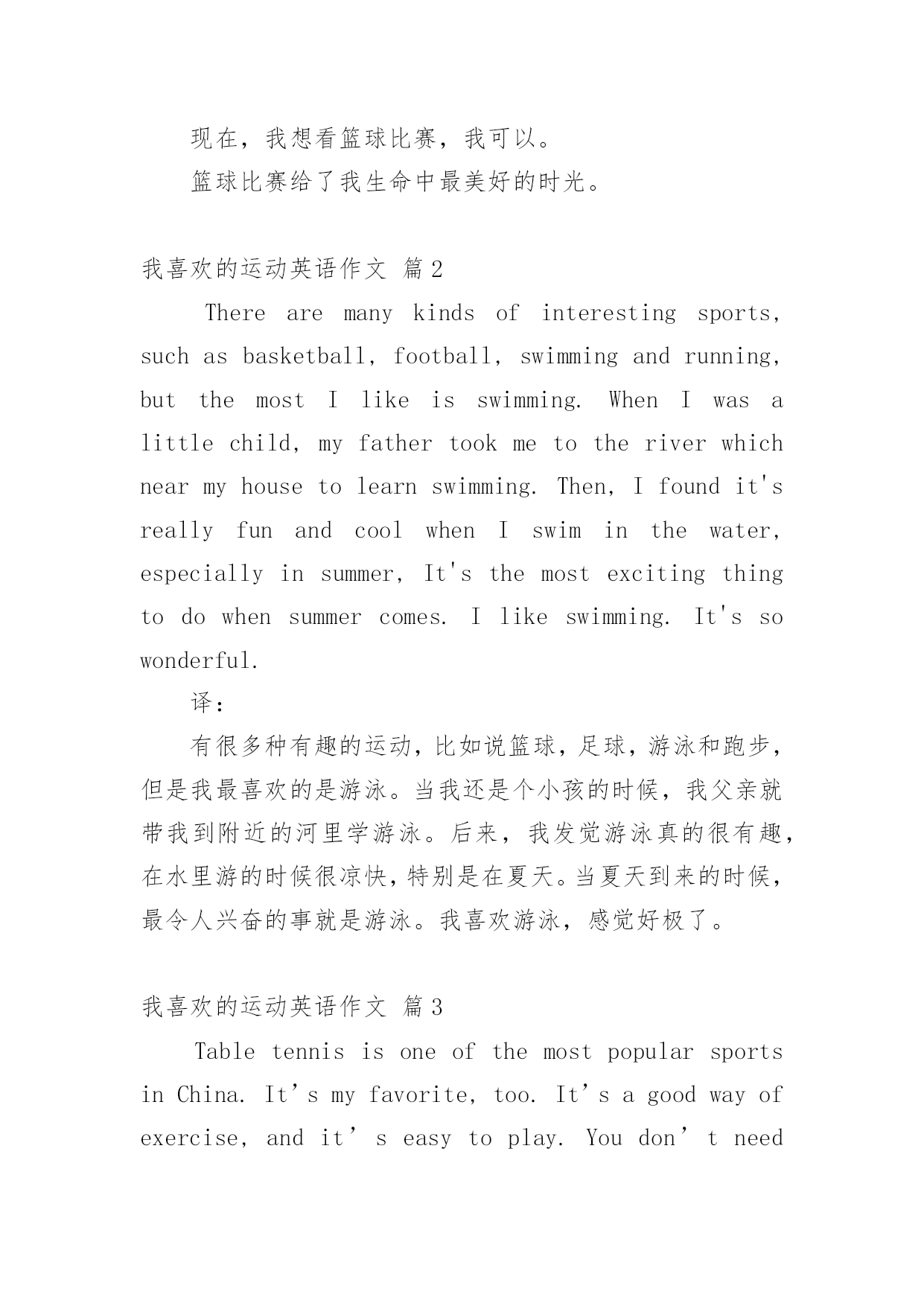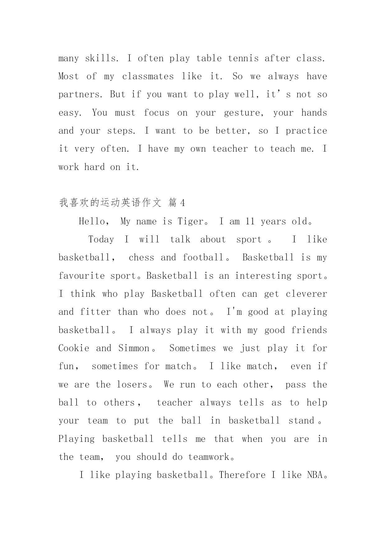 我喜欢的运动英语作文【精华】我喜欢的运动英语作文4篇在平凡的学习、工作、生活中,许多人都有过写作文的经历,对作文都不陌生吧,写作文可以锻炼我们的独处习惯,让自己的心静下来,思考自己未来的方向。如何写一篇有思想、有文采的作文呢?下面是小编为大家收集的我喜欢的运动英语作文4篇,欢迎大家分享。我喜欢的运动英语作文篇1TherearemanykindsofsportsthatIenjoy,suchasswimming,running,anddancing.However,thesportthatIlikemostisbasketball.WhenIwasinjuniorhigh,Istartedtoplaybasketballinschool.Atthattime,IfoundIhadloveddeeplythissport.Now,IwouldliketowatchbasketballgamesasmuchasIcan.Thebasketballgameshavegivenmethemostwonderfultimeinmylife.我喜欢的'运动有很多种,比如游泳、跑步和跳舞。然而,我最喜欢的运动是篮球。当我在初中时,我开始在学校打篮球。那时,我发现我已经深深地爱上了这项运动。现在,我想看篮球比赛,我可以。篮球比赛给了我生命中最美好的时光。我喜欢的运动英语作文篇2Therearemanykindsofinterestingsports,suchasbasketball,football,swimmingandrunning,butthemostIlikeisswimming.WhenIwasalittlechild,myfathertookmetotheriverwhichnearmyhousetolearnswimming.Then,Ifoundit'sreallyfunandcoolwhenIswiminthewater,especiallyinsummer,It'sthemostexcitingthingtodowhensummercomes.Ilikeswimming.It'ssowonderful.译:有很多种有趣的运动,比如说篮球,足球,游泳和跑步,但是我最喜欢的是游泳。当我还是个小孩的时候,我父亲就带我到附近的河里学游泳。后来,我发觉游泳真的很有趣,在水里游的时候很凉快,特别是在夏天。当夏天到来的时候,最令人兴奋的事就是游泳。我喜欢游泳,感觉好极了。我喜欢的运动英语作文篇3TabletennisisoneofthemostpopularsportsinChina.It’smyfavorite,too.It’sagoodwayofexercise,andit’seasytoplay.Youdon’tneedmanyskills.Ioftenplaytabletennisafterclass.Mostofmyclassmateslikeit.Sowealwayshavepartners.Butifyouwanttoplaywell,it’snotsoeasy.Youmustfocusonyourgesture,yourhandsandyoursteps.Iwanttobebetter,soIpracticeitveryoften.Ihavemyownteachertoteachme.Iworkhardonit.我喜欢的运动英语作文篇4Hello,MynameisTiger。Iam11yearsold。TodayIwilltalkaboutsport。Ilikebasketball,chessandfootball。Basketballismyfavouritesport。Basketballisaninterestingsport。IthinkwhoplayBasketballoftencangetclevererandfitterthanwhodoesnot。I'mgoodatplayingbasketball。IalwaysplayitwithmygoodfriendsCookieandSimmon。Sometimeswejustplayitforfun,sometimesformatch。Ilikematch,evenifwearethelosers。Weruntoeachother,passtheballtoothers,teacheralwaystellsastohelpyourteamtoputtheballinbasketballstand。Playingbasketballtellsmethatwhenyouareintheteam,youshoulddoteamwork。Ilikeplayingba