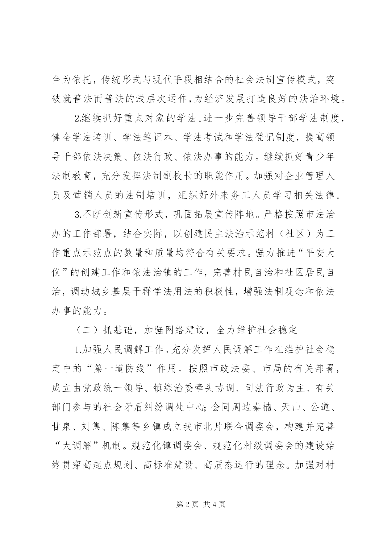第PAGE\*Arabic\*MERGEFORMAT4页共NUMPAGES\*MERGEFORMAT4页司法所年度工作计划司法所××年度工作计划一、指导思想以邓小平理论和“三个代表”重要思想为指导,认真贯彻落实党的十六大、十六届三中全会和市局会。议精神,大力加强基层依法治理,全面贯彻实施依法治国基本方略,紧紧围绕发展地方经济和维护社会稳定的主题,全面推动“四五”普法向纵深发展,认真开展各项司法行政业务,服务于“苏中争第一、跨江争位次、全国争百强”的宏伟目标,大力推进创建“安全大仪”的进程,为我镇三个文明建设发挥应有的职能作用。二、工作目标规范化司法所、规范化调委会和民主法治示范村(社区)的创建工作均达上级要求,努力争创“人民满意司法所”,各项司法行政业务居于全市上游。三、工作任务(一)抓普法,推进依法治镇工作深入开展××年是全面实施“四五”普法和开展安全创建活动的决战之年。法制宣传工作按照“四五”普法规划和依法治镇规划的总体要求,着力打造改革发展的法治氛围。⒈围绕中心工作开展相关法律法规宣传。今年我们将以广播、橱窗、电视、横幅、戗牌、标语等媒体为主渠道,法制宣传咨询台为依托,传统形式与现代手段相结合的社会法制宣传模式,突破就普法而普法的浅层次运作,为经济发展打造良好的法治环境。⒉继续抓好重点对象的学法。进一步完善领导干部学法制度,健全学法培训、学法笔记本、学法考试和学法登记制度,提高领导干部依法决策、依法行政、依法办事的能力。继续抓好青少年法制教育,充分发挥法制副校长的职能作用。加强对企业管理人员及营销人员的法制培训,组织好外来务工人员学习相关法律。⒊不断创新宣传形式,巩固拓展宣传阵地。严格按照市法治办的工作部署,结合实际,以创建民主法治示范村(社区)为工作重点示范点的数量和质量均符合有关要求。强力推进“平安大仪”的创建工作和依法治镇的工作,完善村民自治和社区居民自治,调动城乡基层干群学法用法的积极性,增强法制观念和依法办事的能力。(二)抓基础,加强网络建设,全力维护社会稳定⒈加强人民调解工作。充分发挥人民调解工作在维护社会稳定中的“第一道防线”作用。按照市政法委、市局的有关部署,成立由党政统一领导、镇综治委牵头协调、司法行政为主、有关部门参与的社会矛盾纠纷调处中心;会同周边秦楠、天山、公道、甘泉、刘集、陈集等乡镇成立我市北片联合调委会,构建并完善“大调解”机制。规范化镇调委会、规范化村级调委会的建设始终贯穿高起点规划、高标准建设、高质态运行的理念。加强对村级调委会的工作指导力度,加强基层调解员的业务培训,坚持重大纠纷快报制度和社情分析制度,做到抓早抓小抓苗头,努力从行政执法的源头减少矛盾纠纷,确保年内无上访、集访,矛盾纠纷调解率,调处成功率达以上,着力提高人民调解工作实效。⒉强化司法所规范化建设。按照省司法厅规范化司法所“六有”的要求,立足我镇实际,在市级规范化司法所的基础上,争取镇党委、政府的关心和支持,筹建省级规范化司法所,争创“人民满意司。法所”。⒊落实各项安置帮教工作措施。进一步加大刑释解教人员回归衔接和管理力度,定期召开例会,明确职责,各项工作做到有安排、有措施、有检查、有结果,及时向上汇报情况。探索并做好社区矫正工作,做好刑释解教人员的就业安置和生活保障工作,减少刑释解教人员的重新犯罪率。⒋做好信息调研工作。时刻围绕党委、政府中心工作,抓住重点,及时报送反映我镇司法行政服务经济发展、改革开放和维护社会稳定等方面动态的信息,力争圆满完成年初市局下达的工作任务。(三)抓业务,全力推进“平安大仪”创建工作认真贯彻落实我镇关于开展“创建最安全地区”活动的实施意见,按照“三年创建”的总体要求,扎扎实实做好各项司法行政工作,紧紧围绕“六个不发生”、“七个较低水平”的工作目标,确保稳定的社会环境、良好的治安环境、诚信的发展环境、安全的生产生活环境等五大环境建设取得新的成就,为大仪镇继续保持“社会治安先进乡镇”荣誉称号进一步夯实基础。(四)抓队伍,不断提升司法行政干警素质狠抓本所工作人员思想素质的提高,确立终身学习的理念,内强素质,外树形象,以立党为公、执政为民为宗旨,按照“政治坚定、业务精通、作风优良、执法公正”总要求,抓好反腐倡廉各项措施的落实,确保党风廉政建设取得新的成效,不断改进工作作风,提高工作效率。(五)抓服务,全