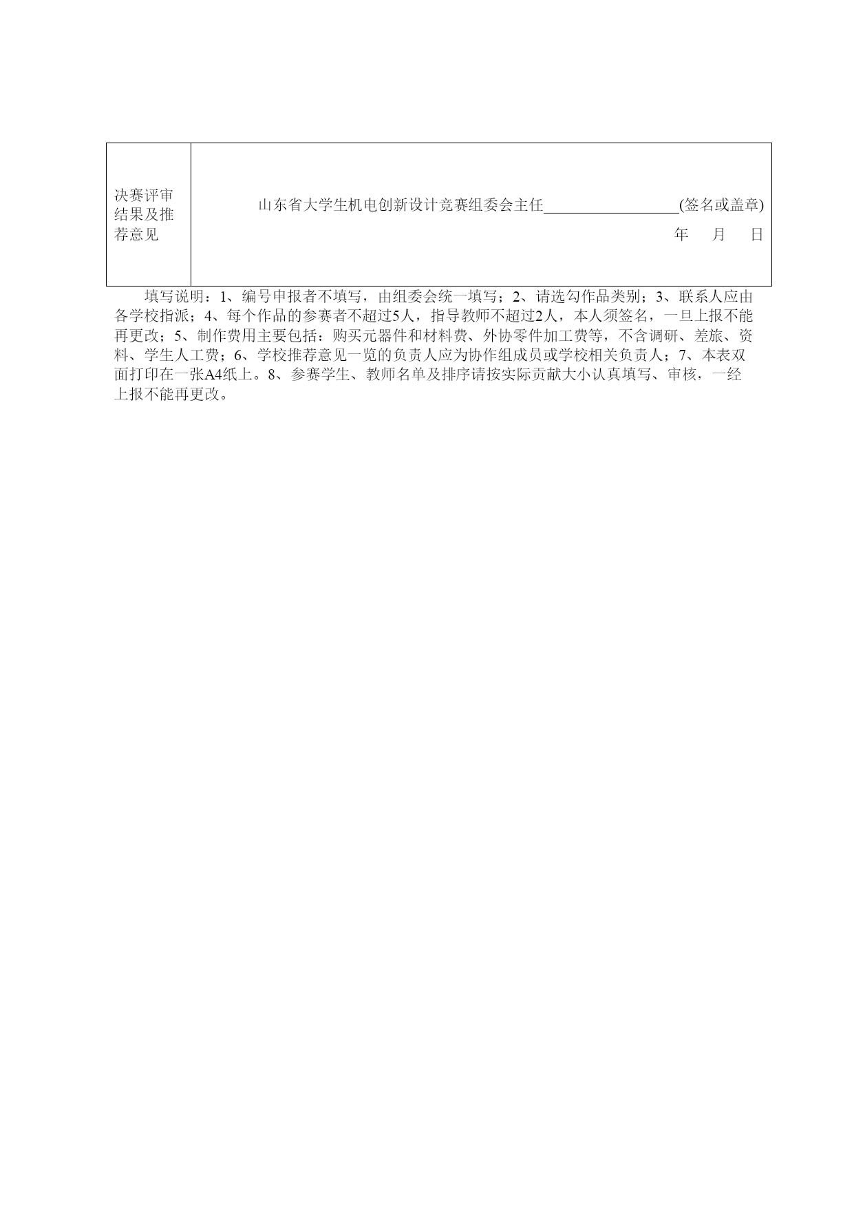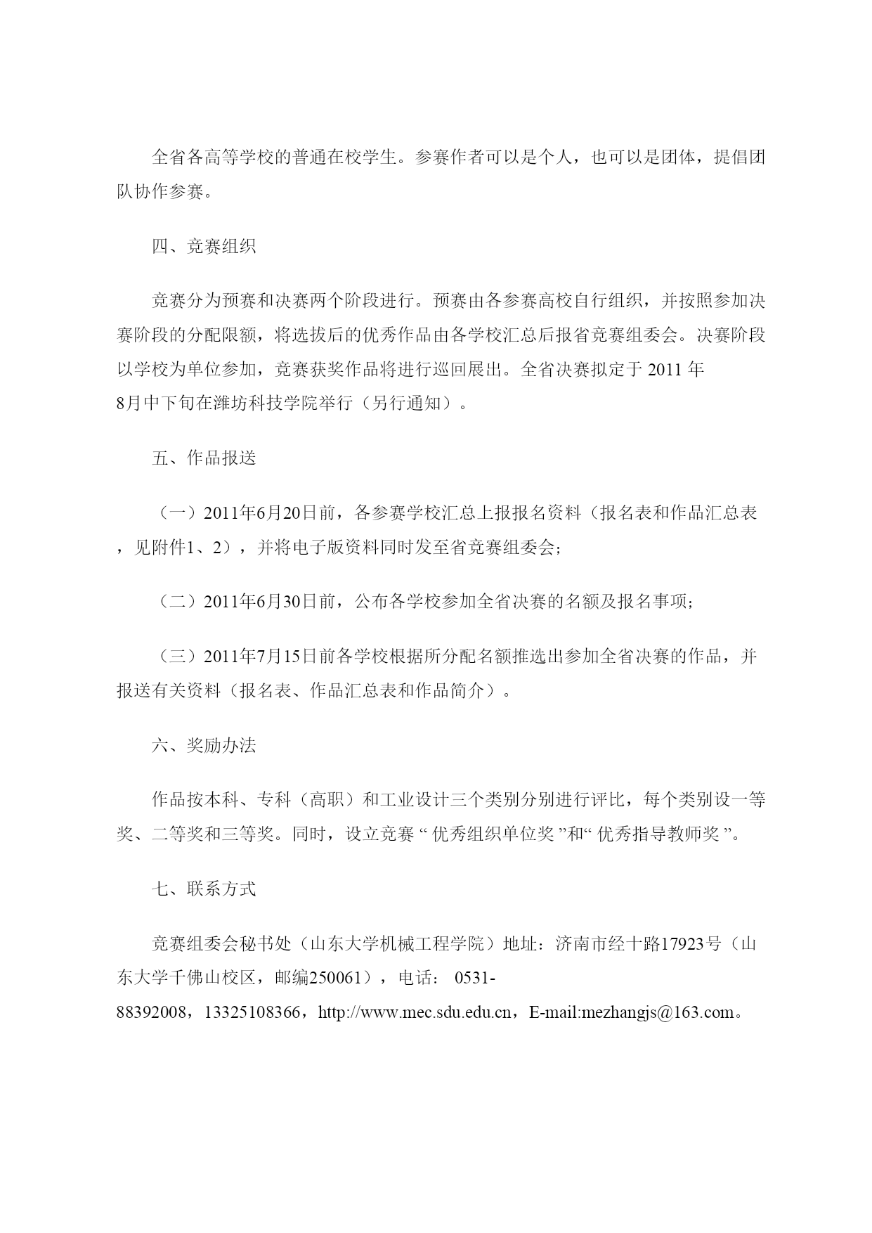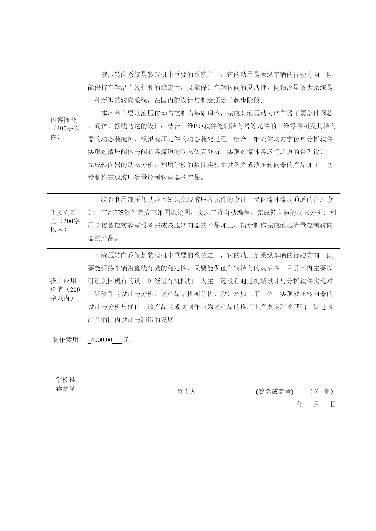 关于举办2011年山东省大学生机电产品创新设计竞赛的通知鲁教高处函(2011)6号各高等学校教务处:为加强大学生创新意识、合作精神和实践创新能力的培养,激发大学生科学研究与探索的兴趣和潜能,促进全省高校机电类专业教育教学改革,经研究,决定举办2011年山东省大学生机电产品创新设计竞赛(以下简称竞赛),现将有关事项通知如下:一、竞赛主题与内容(一)竞赛主题:节能低碳绿色健康(二)具体内容:1、现实生活中有助于提高效率、降低能耗与劳动强度、提升生活质量、减少浪费的实用机具的创新设计与制作。2、社会、企业适时公布的有关创新主题内容。二、作品形式产品实物;样机模型;生产过程中现代节能减排技术应用总结;数字控制系统软件作品;工业设计创意作品等。三、参赛人员全省各高等学校的普通在校学生。参赛作者可以是个人,也可以是团体,提倡团队协作参赛。四、竞赛组织竞赛分为预赛和决赛两个阶段进行。预赛由各参赛高校自行组织,并按照参加决赛阶段的分配限额,将选拔后的优秀作品由各学校汇总后报省竞赛组委会。决赛阶段以学校为单位参加,竞赛获奖作品将进行巡回展出。全省决赛拟定于2011年8月中下旬在潍坊科技学院举行(另行通知)。五、作品报送(一)2011年6月20日前,各参赛学校汇总上报报名资料(报名表和作品汇总表,见附件1、2),并将电子版资料同时发至省竞赛组委会;(二)2011年6月30日前,公布各学校参加全省决赛的名额及报名事项;(三)2011年7月15日前各学校根据所分配名额推选出参加全省决赛的作品,并报送有关资料(报名表、作品汇总表和作品简介)。六、奖励办法作品按本科、专科(高职)和工业设计三个类别分别进行评比,每个类别设一等奖、二等奖和三等奖。同时,设立竞赛“优秀组织单位奖”和“优秀指导教师奖”。七、联系方式竞赛组委会秘书处(山东大学机械工程学院)地址:济南市经十路17923号(山东大学千佛山校区,邮编250061),电话:0531-88392008,13325108366,http://HYPERLINK"http://www.mec.sdu.edu.cn/"www.mec.sdu.edu.cn,E-mail:mezhangjs@163.com。附件1:编号2011年山东省大学生机电产品创新设计竞赛作品报名表参赛作品名称液力转向器设计与制作作品参赛类别本科组√/专科(高职)组□/工业设计作品□作品主题类别机械类所在学校山东科技大学邮政编码271019联系人徐瑞银联系人通讯地址泰安市岱宗大街223号电话3076030手机15053816131Emailjdxyth@163.com参赛者姓名性别班级所学专业签名1赵磊男2009级2班机械设计制造及其自动化2丁健男2008级1班机械设计制造及其自动化3潘聚刚男2008级1班机械设计制造及其自动化4薛彬男2008级1班机械设计制造及其自动化5杜军山男2008级1班机械设计制造及其自动化指导教师姓名性别职称专业签名1徐瑞银男副教授机械设计理论2程百林男讲师机械设计内容简介(400字以内)液压转向系统是装载机中重要的系统之一,它的功用是操纵车辆的行驶方向,既能保持车辆沿直线行驶的稳定性,又能保证车辆转向的灵活性。同轴流量放大系统是一种新型的转向系统,在国内的设计与制造还处于起步阶段。本产品主要以液压传动与控制为基础理论,完成对液压动力转向器主要部件阀芯、阀体、摆线马达的设计;结合三维PRE软件绘制转向器等元件的三维零件图及其转向器的动态装配图,模拟液压元件的动态装配过程;结合三维流体动力学仿真分析软件实现对液压阀体与阀芯各流道的动态仿真分析,实现对流体各运行通道的合理设计,完成转向器的动态分析;利用学校的数控实验室设备完成液压转向器的产品加工,初步制作完成液压流量控制转向器的产品。主要创新点(200字以内)综合利用液压传动基本知识实现液压各元件的设计,优化流体流动通道的合理设计、三维PRE软件完成三维图纸绘图,实现三维自动编程,完成转向器的动态分析;利用学校数控实验室设备完成液压转向器的产品加工,初步制作完成液压流量控制转向器的产品。推广应用价值(200字以内)液压转向系统是装载机中重要的系统之一,它的功用是操纵车辆的行驶方向,既要能保持车辆沿直线行驶的稳定性,又要能保证车辆转向的灵活性。目前国内主要以引进美国现有的设计图纸进行机械加工为主,还没有通过机械设计与分析软件实现对主题软件的设计与分析,该产品集机械分析、设计及加工于一体,实现液压转向器的设计与分析与优化,该产品的成功制作将为该产品的推广生产奠定理论基础,促进该产品的国内设计与制造的发展。制作费用_4000.00___元。学校推荐意见负责人_________________