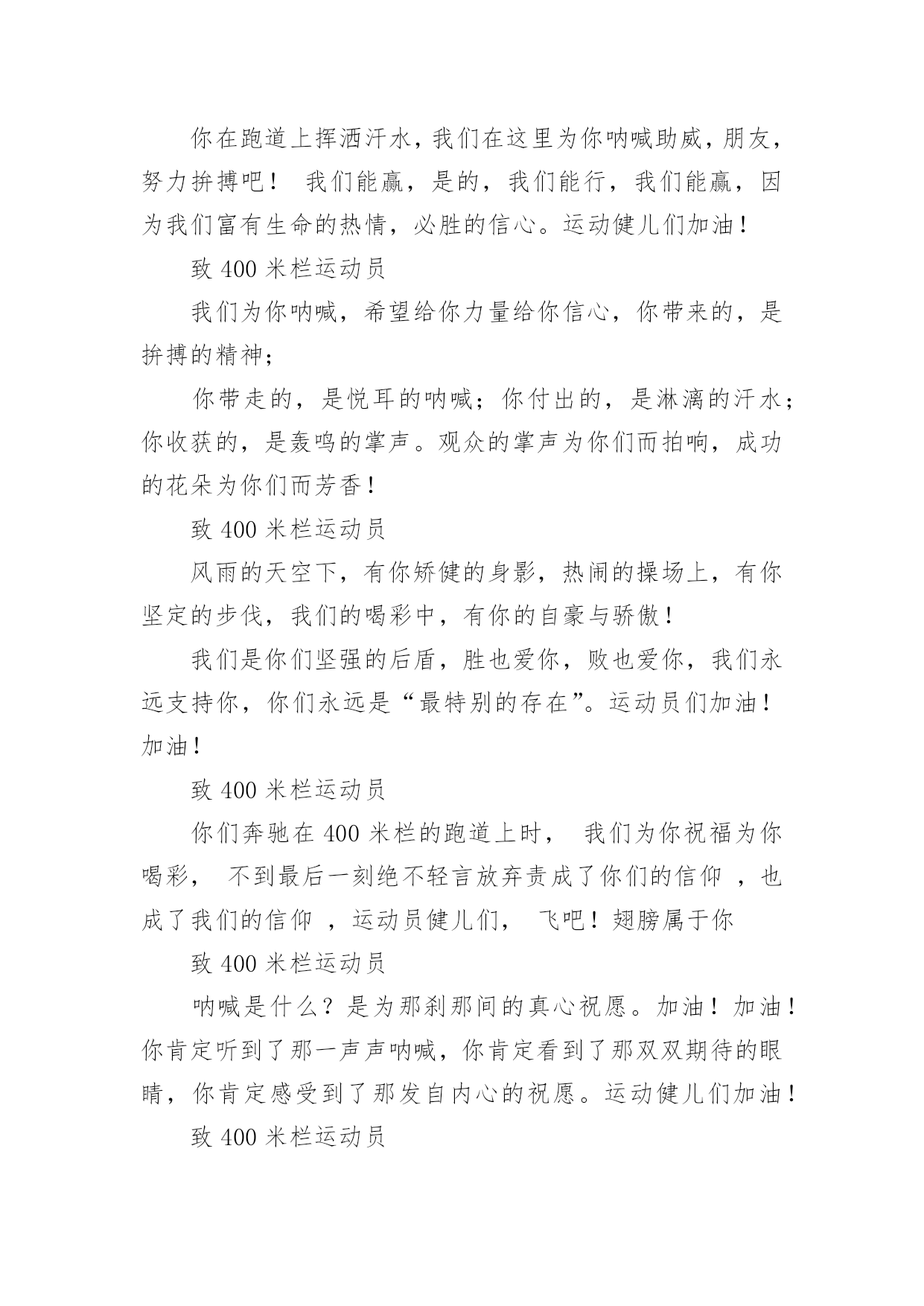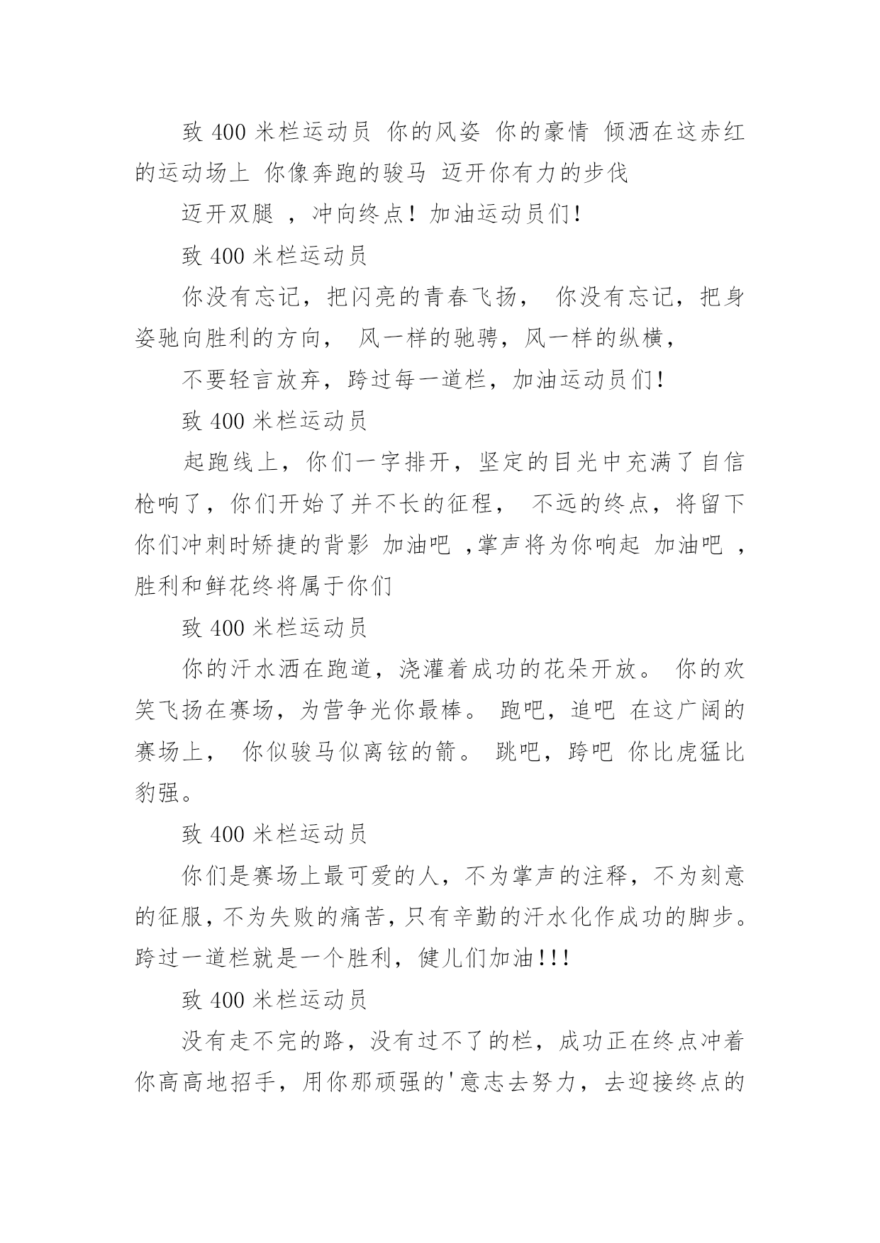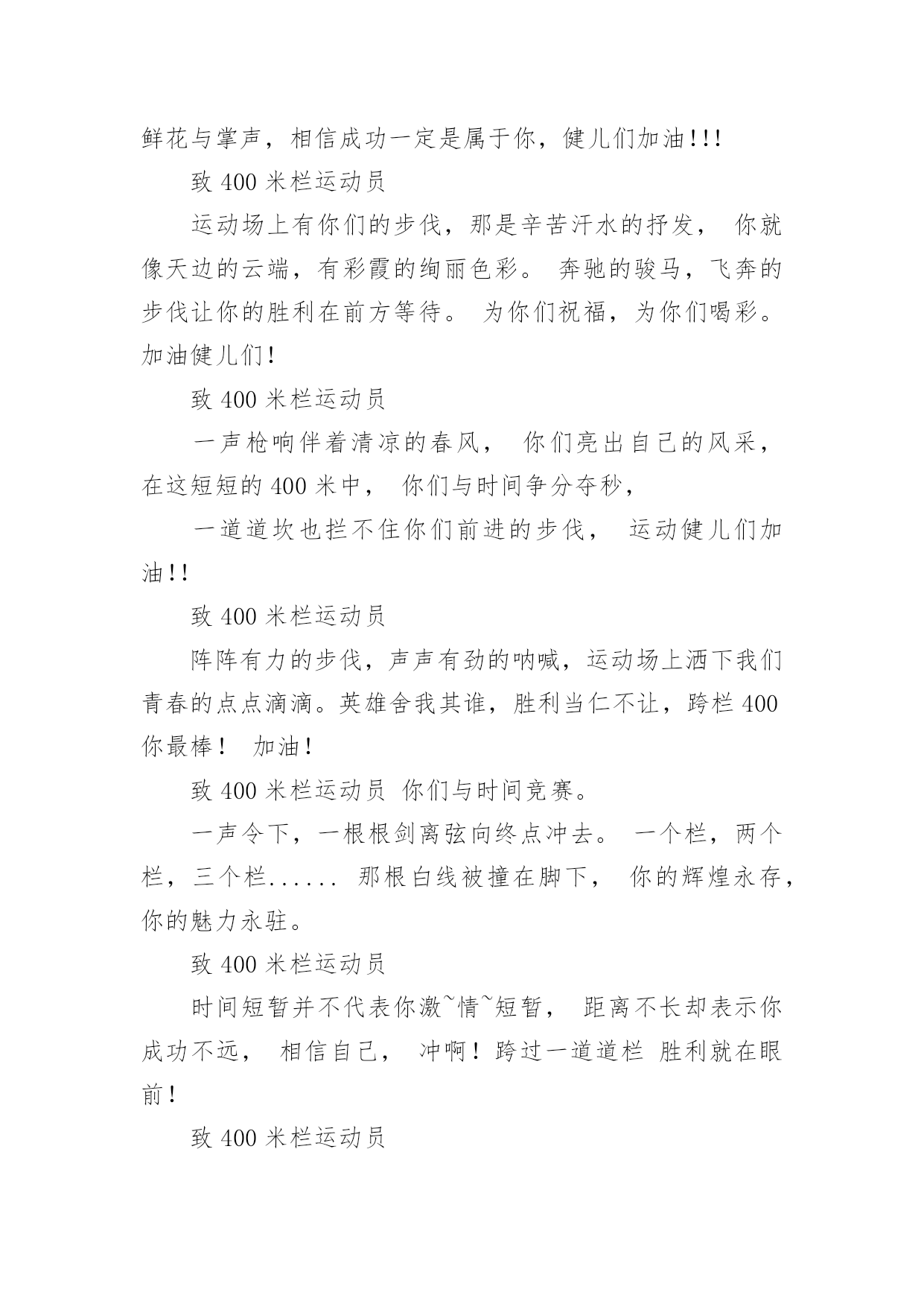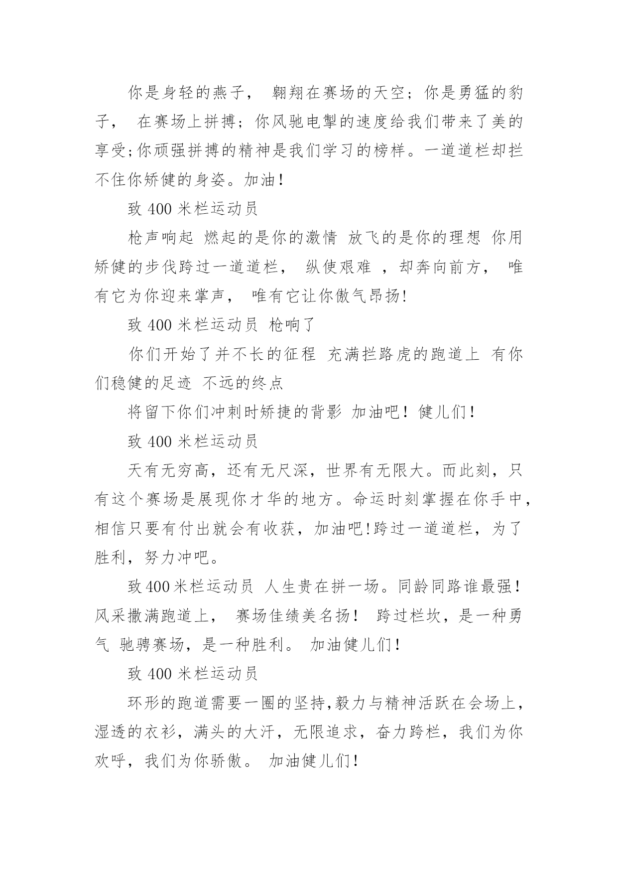 跨栏运动员加油稿跨栏运动员加油稿10篇在不断进步的时代,需要使用加油稿的场合越来越多,借助加油稿可以激励他人的士气。那么你有了解过加油稿吗?以下是小编精心整理的跨栏运动员加油稿,希望对大家有所帮助。跨栏运动员加油稿1你们,有山一样的气魄你们,有水一样的流畅你们,有鹰一样的速度你们,有龙一样的神奇你们,又是一样的沉着你们,有虎一样的'霸气你们,就是天空中夺目的太阳放射光芒,照亮每个人的心底傲视四方,使每个人都为你赞叹不已冲吧,相信自己跨栏运动员加油稿2冲,冲,冲!加油啊,你一定行的。身边的拉拉队员们,嘶声呐喊。你后脚一蹬,向前冲了过去而摆在你眼前的是十个障碍栏,或许是因为同学们的加油,你勇敢地跨过了第一个栏,接下去一个,二个,三个……你跨过了所有的'障碍栏,虽然你曾经恐惧过,可是,你在最后跑完了全程。运动员们,你们是最勇敢的虽然你没有获得名次,但是你坚持到了最后。运动员们,我们为你感到骄傲。在我们心中,你永远是NumberOne!跨栏运动员加油稿3枪声伴你踏上征程,你昂着自信的头,带着必胜的信念,冲去,奔去。那一刻时光仿佛都为你停住,你的.勇气振动了一切,震撼了每一个人的心灵。终点。你赢了。虽然只是那短短的十几秒,但你在我们心中留下了永恒。百米跑道虽不长,运动健儿志高扬。摸拳擦掌跃欲试,分秒必争勇夺魁。实验学校有勇女,巾帼岂将须眉让。古有木兰冲杀场,今有郎萍跑百米。立志创新校记录,勇夺奥运第一枚。跨栏运动员加油稿4冲,冲,冲!加油啊,你一定行的。身边的拉拉队员们,嘶声呐喊。你后脚一蹬,向前冲了过去而摆在你眼前的是十个障碍栏,或许是因为同学们的'加油,你勇敢地跨过了第一个栏,接下去一个,二个,三个……你跨过了所有的障碍栏,虽然你曾经恐惧过,可是,你在最后跑完了全程。运动员们,你们是最勇敢的。虽然你没有获得名次,但是你坚持到了最后。运动员们,我们为你感到骄傲。在我们心中,你永远是NumberOne!跨栏运动员加油稿510米,是太阳在地平线上的微长20米,是微微的增长30米,太阳已跳出了地平线40米,风正狂奔50米,一片欢呼60米,一鼓作气70米,气力微余80米,有了顺序90米,坚持坚持100米,终点线就在眼前110米,胜利属于你跨栏运动员加油稿6致400米栏运动员有人说,运动场上狂奔的男儿,是一匹匹黑色的骏马。有人说,运动场上活跃的巾帼,是一道道亮丽的风景。这力量源源不息,只因你是我心中的英雄,十四营的运动员们加油!致400米栏运动员你在跑道上挥洒汗水,我们在这里为你呐喊助威,朋友,努力拚搏吧!我们能赢,是的,我们能行,我们能赢,因为我们富有生命的热情,必胜的信心。运动健儿们加油!致400米栏运动员我们为你呐喊,希望给你力量给你信心,你带来的,是拚搏的精神;你带走的,是悦耳的呐喊;你付出的,是淋漓的汗水;你收获的,是轰鸣的掌声。观众的掌声为你们而拍响,成功的花朵为你们而芳香!致400米栏运动员风雨的天空下,有你矫健的身影,热闹的操场上,有你坚定的步伐,我们的喝彩中,有你的自豪与骄傲!我们是你们坚强的后盾,胜也爱你,败也爱你,我们永远支持你,你们永远是“最特别的存在”。运动员们加油!加油!致400米栏运动员你们奔驰在400米栏的跑道上时,我们为你祝福为你喝彩,不到最后一刻绝不轻言放弃责成了你们的信仰,也成了我们的信仰,运动员健儿们,飞吧!翅膀属于你致400米栏运动员呐喊是什么?是为那刹那间的真心祝愿。加油!加油!你肯定听到了那一声声呐喊,你肯定看到了那双双期待的眼睛,你肯定感受到了那发自内心的祝愿。运动健儿们加油!致400米栏运动员凉爽的风一阵阵拂过,却难以抚平健儿们心中的激情,蹲在起跑线摩拳擦掌,迫不及待那刹那间释放的力量,那如风的速度如龙腾,如虎跃。你是我心中的英雄!加油运动健儿!加油!致400米栏运动员你是赛场上最亮的点。在你的心中,只有不停拼搏的信念,不断跨越的身姿,用坚实的步伐去迈开人生新的旅程。场上的拼搏者,你是我们永远的骄傲!致400米栏运动员胯下丛生的荆棘等你去砍伐,前方胜利女神在向你招手。要得到胜利女神的青睐,必须战胜道路上的重重险阻。有的稳步越过,展示了他的实力,有的人虽然尽了力,但栏架被踢翻,那是一种艰苦的拼搏。但只要到终点,就都是胜利者。致400米栏运动员你的风姿你的豪情倾洒在这赤红的运动场上你像奔跑的骏马迈开你有力的步伐迈开双腿,冲向终点!加油运动员们!致400米栏运动员你没有忘记,把闪亮的青春飞扬,你没有忘记,把身姿驰向胜利的方向,风一样的驰骋,风一样的纵横,不要轻言放弃,跨过每一道栏,加油运动员们!致400米栏运动员起跑线上,你们一字排开,坚定的目光中充满了自信枪响了,你们开始了并不长的征程,不远的终点,将留下你们冲刺时矫捷的背影加油吧,掌声将为你响起加油吧,胜利和鲜花终将属于你们致400米栏运动员你