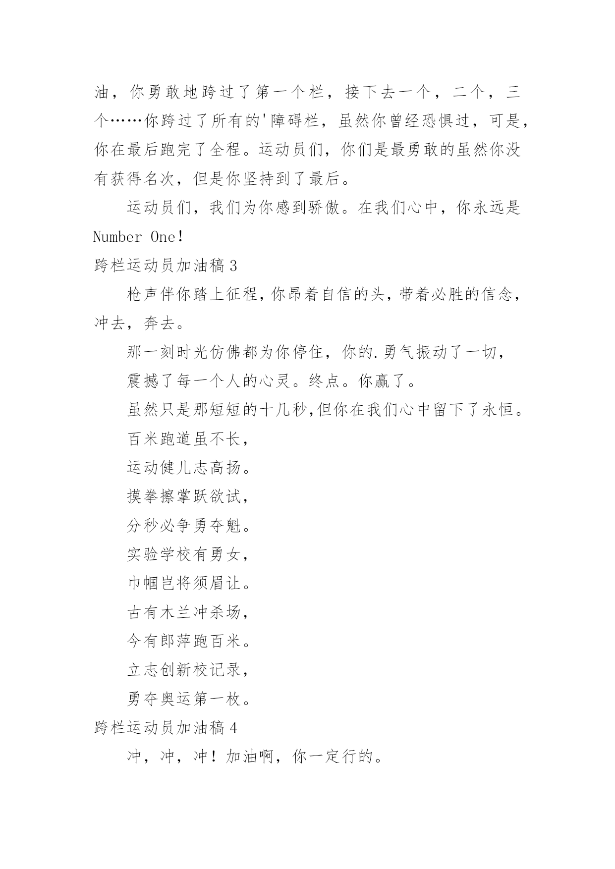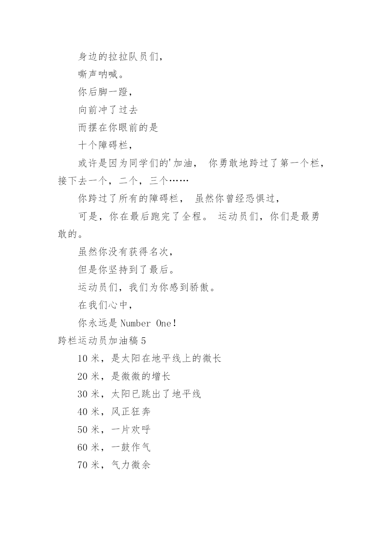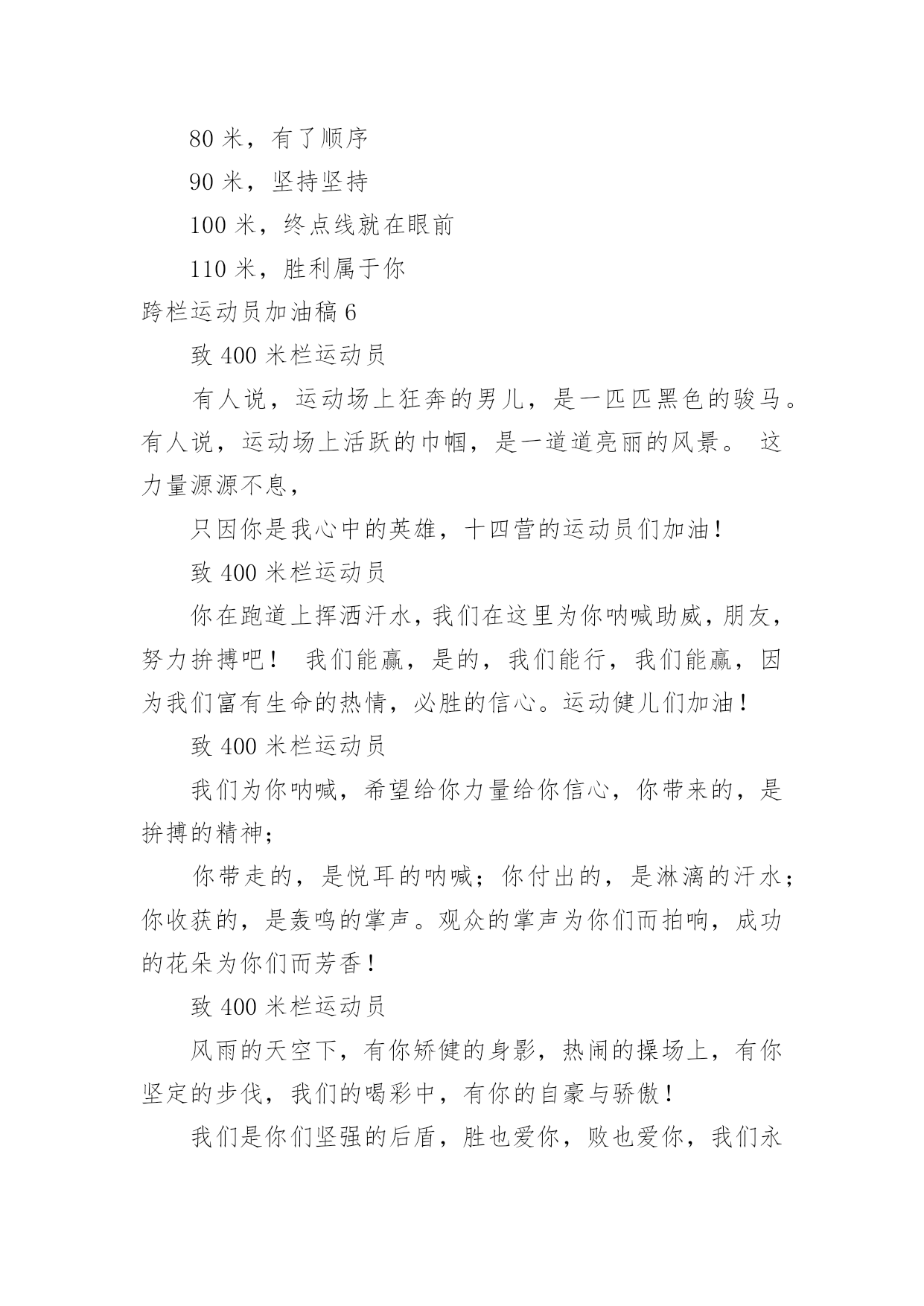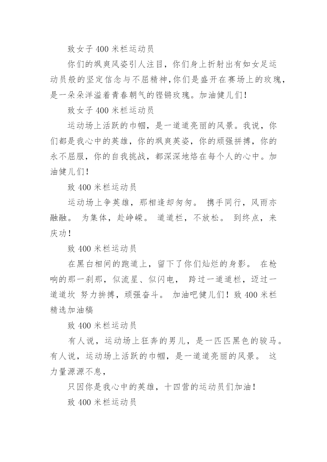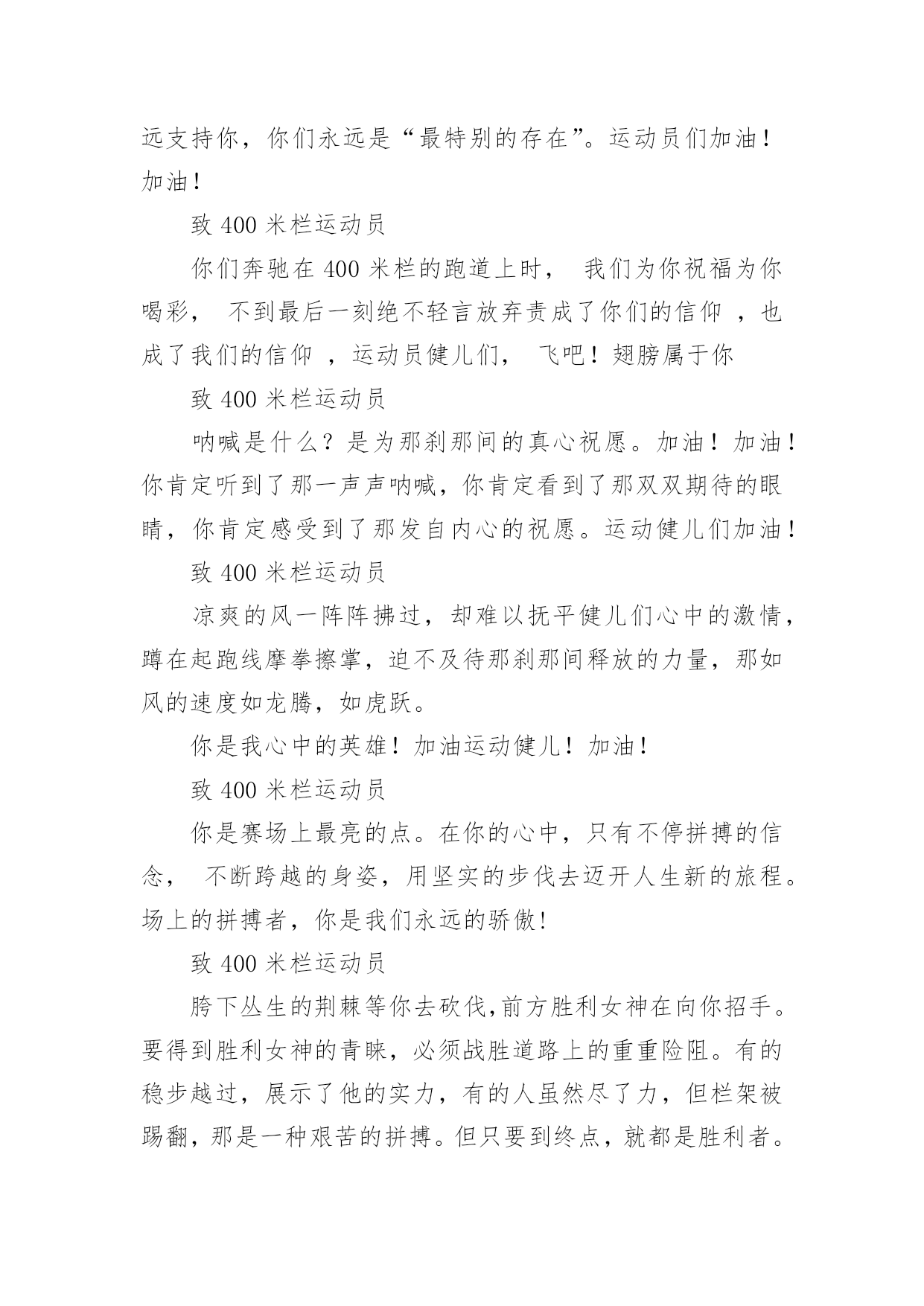 跨栏运动员加油稿跨栏运动员加油稿10篇在不断进步的时代,需要使用加油稿的场合越来越多,借助加油稿可以激励他人的士气。那么你有了解过加油稿吗?以下是小编精心整理的跨栏运动员加油稿,希望对大家有所帮助。跨栏运动员加油稿1你们,有山一样的气魄你们,有水一样的流畅你们,有鹰一样的速度你们,有龙一样的神奇你们,又是一样的沉着你们,有虎一样的'霸气你们,就是天空中夺目的太阳放射光芒,照亮每个人的心底傲视四方,使每个人都为你赞叹不已冲吧,相信自己跨栏运动员加油稿2冲,冲,冲!加油啊,你一定行的。身边的拉拉队员们,嘶声呐喊。你后脚一蹬,向前冲了过去而摆在你眼前的是十个障碍栏,或许是因为同学们的加油,你勇敢地跨过了第一个栏,接下去一个,二个,三个……你跨过了所有的'障碍栏,虽然你曾经恐惧过,可是,你在最后跑完了全程。运动员们,你们是最勇敢的虽然你没有获得名次,但是你坚持到了最后。运动员们,我们为你感到骄傲。在我们心中,你永远是NumberOne!跨栏运动员加油稿3枪声伴你踏上征程,你昂着自信的头,带着必胜的信念,冲去,奔去。那一刻时光仿佛都为你停住,你的.勇气振动了一切,震撼了每一个人的心灵。终点。你赢了。虽然只是那短短的十几秒,但你在我们心中留下了永恒。百米跑道虽不长,运动健儿志高扬。摸拳擦掌跃欲试,分秒必争勇夺魁。实验学校有勇女,巾帼岂将须眉让。古有木兰冲杀场,今有郎萍跑百米。立志创新校记录,勇夺奥运第一枚。跨栏运动员加油稿4冲,冲,冲!加油啊,你一定行的。身边的拉拉队员们,嘶声呐喊。你后脚一蹬,向前冲了过去而摆在你眼前的是十个障碍栏,或许是因为同学们的'加油,你勇敢地跨过了第一个栏,接下去一个,二个,三个……你跨过了所有的障碍栏,虽然你曾经恐惧过,可是,你在最后跑完了全程。运动员们,你们是最勇敢的。虽然你没有获得名次,但是你坚持到了最后。运动员们,我们为你感到骄傲。在我们心中,你永远是NumberOne!跨栏运动员加油稿510米,是太阳在地平线上的微长20米,是微微的增长30米,太阳已跳出了地平线40米,风正狂奔50米,一片欢呼60米,一鼓作气70米,气力微余80米,有了顺序90米,坚持坚持100米,终点线就在眼前110米,胜利属于你跨栏运动员加油稿6致400米栏运动员有人说,运动场上狂奔的男儿,是一匹匹黑色的骏马。有人说,运动场上活跃的巾帼,是一道道亮丽的风景。这力量源源不息,只因你是我心中的英雄,十四营的运动员们加油!致400米栏运动员你在跑道上挥洒汗水,我们在这里为你呐喊助威,朋友,努力拚搏吧!我们能赢,是的,我们能行,我们能赢,因为我们富有生命的热情,必胜的信心。运动健儿们加油!致400米栏运动员我们为你呐喊,希望给你力量给你信心,你带来的,是拚搏的精神;你带走的,是悦耳的呐喊;你付出的,是淋漓的汗水;你收获的,是轰鸣的掌声。观众的掌声为你们而拍响,成功的花朵为你们而芳香!致400米栏运动员风雨的天空下,有你矫健的身影,热闹的操场上,有你坚定的步伐,我们的喝彩中,有你的自豪与骄傲!我们是你们坚强的后盾,胜也爱你,败也爱你,我们永远支持你,你们永远是“最特别的存在”。运动员们加油!加油!致400米栏运动员你们奔驰在400米栏的跑道上时,我们为你祝福为你喝彩,不到最后一刻绝不轻言放弃责成了你们的信仰,也成了我们的信仰,运动员健儿们,飞吧!翅膀属于你致400米栏运动员呐喊是什么?是为那刹那间的真心祝愿。加油!加油!你肯定听到了那一声声呐喊,你肯定看到了那双双期待的眼睛,你肯定感受到了那发自内心的祝愿。运动健儿们加油!致400米栏运动员凉爽的风一阵阵拂过,却难以抚平健儿们心中的激情,蹲在起跑线摩拳擦掌,迫不及待那刹那间释放的力量,那如风的速度如龙腾,如虎跃。你是我心中的英雄!加油运动健儿!加油!致400米栏运动员你是赛场上最亮的点。在你的心中,只有不停拼搏的信念,不断跨越的身姿,用坚实的步伐去迈开人生新的旅程。场上的拼搏者,你是我们永远的骄傲!致400米栏运动员胯下丛生的荆棘等你去砍伐,前方胜利女神在向你招手。要得到胜利女神的青睐,必须战胜道路上的重重险阻。有的稳步越过,展示了他的实力,有的人虽然尽了力,但栏架被踢翻,那是一种艰苦的拼搏。但只要到终点,就都是胜利者。致400米栏运动员你的风姿你的豪情倾洒在这赤红的运动场上你像奔跑的骏马迈开你有力的步伐迈开双腿,冲向终点!加油运动员们!致400米栏运动员你没有忘记,把闪亮的青春飞扬,你没有忘记,把身姿驰向胜利的方向,风一样的驰骋,风一样的纵横,不要轻言放弃,跨过每一道栏,加油运动员们!致400米栏运动员起跑线上,你们一字排开,坚定的目光中充满了自信枪响了,你们开始了并不长的征程,不远的终点,将留下你们冲刺时矫捷的背影加油吧,掌声将为你响起加油吧,胜利和鲜花终将属于你们致400米栏运动员你