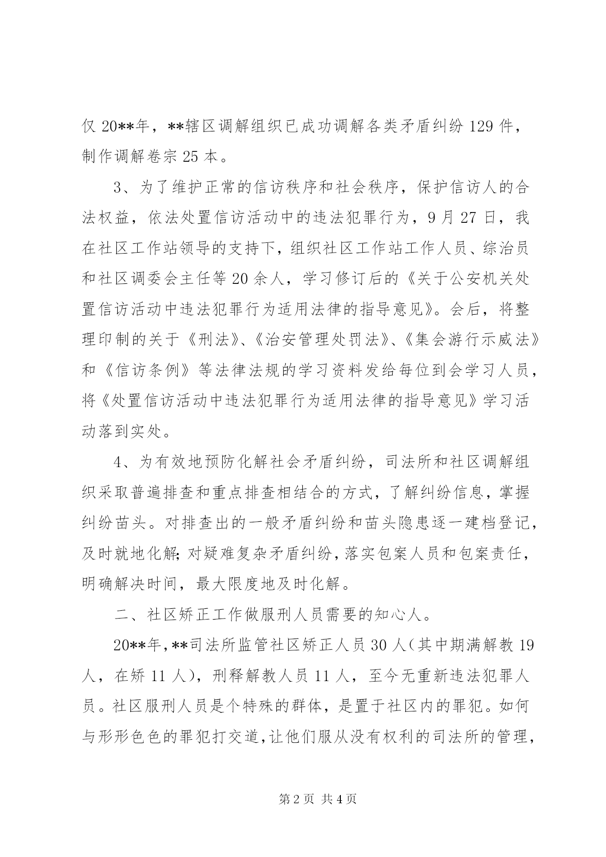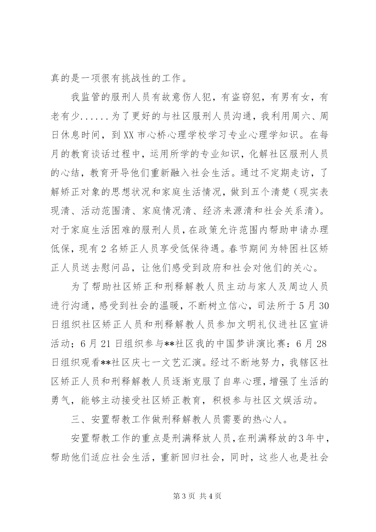 第PAGE\*Arabic\*MERGEFORMAT4页共NUMPAGES\*MERGEFORMAT4页司法所所长个人总结自20**年11月任**司法所所长以来,从事基层司法工作已经七年了,日复一日的繁杂工作事务并没有让我觉得厌烦,相反,我越来越热爱这个岗位,因为基层司法工作真的会让人觉得每一天都是充实而有意义的。一、调解民间纠纷做居民需要的明白人。1、曾经以为老百姓有纠纷,大事去找法院起诉,急事就报警或是找新闻媒体解决,司法所没有权利职能,谁会到司法所调解呢。民间矛盾纠纷多数是亲戚间邻居朋友间的小事情,没必要花钱起诉解决,又不想让太多人知道,自己有解决不了的事,找到司法所既不用花钱,又节省时间,居民还是很愿意到司法所来调解的。每次受理纠纷心里也是有压力的,居民在无助的时候想到司法所来解决问题,这种沉甸甸的信任是不能辜负的,认真或是敷衍了事,当事人都是能感觉到的。通过几年来的历练和经验积累,经我调解的纠纷成功率达100%。2、开展普法和业务知识培训。仅仅依靠个人力量是不能满足基层调解工作的,在调委会走访调研过程中,了解基层工作人员和人民调解员,日常经常接触到的法律问题,我邀请资深律师和法律服务工作者为调解员、调访信息员和综治员开展人民调解业务培训,促进了工作人员发现、控制、化解矛盾纠纷的能力有所提高,居民选择调解作为解决矛盾纠纷途径的意识逐步提高。仅20**年,**辖区调解组织已成功调解各类矛盾纠纷129件,制作调解卷宗25本。3、为了维护正常的信访秩序和社会秩序,保护信访人的合法权益,依法处置信访活动中的违法犯罪行为,9月27日,我在社区工作站领导的支持下,组织社区工作站工作人员、综治员和社区调委会主任等20余人,学习修订后的《关于公安机关处置信访活动中违法犯罪行为适用法律的指导意见》。会后,将整理印制的关于《刑法》、《治安管理处罚法》、《集会游行示威法》和《信访条例》等法律法规的学习资料发给每位到会学习人员,将《处置信访活动中违法犯罪行为适用法律的指导意见》学习活动落到实处。4、为有效地预防化解社会矛盾纠纷,司法所和社区调解组织采取普遍排查和重点排查相结合的方式,了解纠纷信息,掌握纠纷苗头。对排查出的一般矛盾纠纷和苗头隐患逐一建档登记,及时就地化解;对疑难复杂矛盾纠纷,落实包案人员和包案责任,明确解决时间,最大限度地及时化解。二、社区矫正工作做服刑人员需要的知心人。20**年,**司法所监管社区矫正人员30人(其中期满解教19人,在矫11人),刑释解教人员11人,至今无重新违法犯罪人员。社区服刑人员是个特殊的群体,是置于社区内的罪犯。如何与形形色色的罪犯打交道,让他们服从没有权利的司法所的管理,真的是一项很有挑战性的工作。我监管的服刑人员有故意伤人犯,有盗窃犯,有男有女,有老有少......为了更好的与社区服刑人员沟通,我利用周六、周日休息时间,到XX市心桥心理学校学习专业心理学知识。在每月的教育谈话过程中,运用所学的专业知识,化解社区服刑人员的心结,教育开导他们重新融入社会生活。通过不定期走访,了解矫正对象的思想状况和家庭生活情况,做到五个清楚(现实表现清、活动范围清、家庭情况清、经济来源清和社会关系清)。对于家庭生活困难的服刑人员,在政策允许范围内帮助申请办理低保,现有2名矫正人员享受低保待遇。春节期间为特困社区矫正人员送去慰问品,让他们感受到政府和社会对他们的关心。为了帮助社区矫正和刑释解教人员主动与家人及周边人员进行沟通,感受到社会的温暖,不断树立信心,司法所于5月30日组织社区矫正人员和刑释解教人员参加文明礼仪进社区宣讲活动;6月21日组织参与**社区我的中国梦讲演比赛:6月28日组织观看**社区庆七一文艺汇演。经过不断地努力,我辖区社区矫正人员和刑释解教人员逐渐克服了自卑心理,增强了生活的勇气,能够主动接受社区矫正教育,积极参与社区文娱活动。三、安置帮教工作做刑释解教人员需要的热心人。安置帮教工作的重点是刑满释放人员,在刑满释放的3年中,帮助他们适应社会生活,重新回归社会,同时,这些人也是社会治安的重点人,为了掌握辖区内刑满释放人员的详实资料,我坚持每季度组织工作人员对辖区刑满释放人员和解除劳教人员展开走访核实工作。信息核实过程中,将登记在册的刑释解教人员根据户籍地或居住地划分到各个社区进行核实,了解刑释解教人员的具体情况核对基本信息,建立帮教档案。**辖区现有解除社区矫正人员5人,均已签订安置帮教合同。截至目前,**辖区解除劳教人员3人,刑满释放人员11人,均已进行登记,并落实帮教人员。