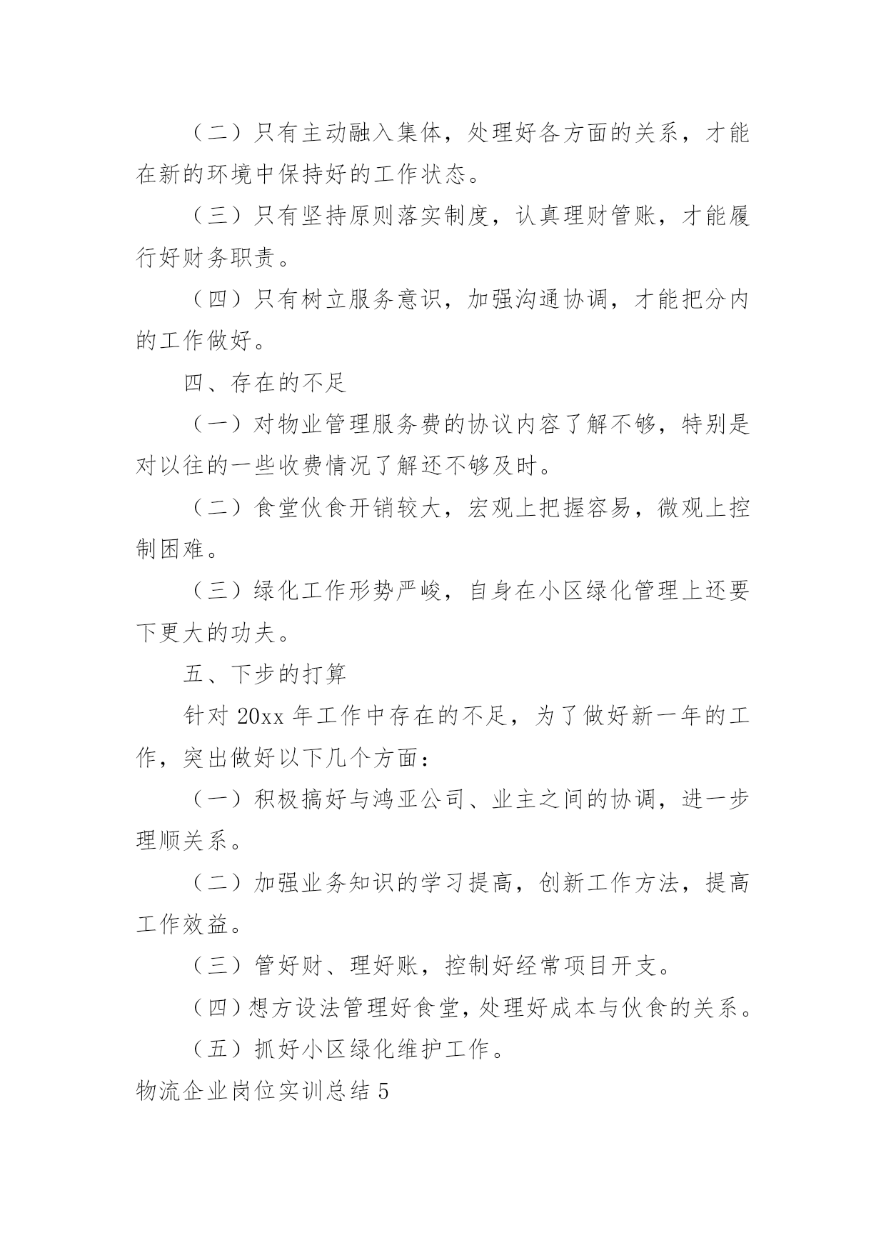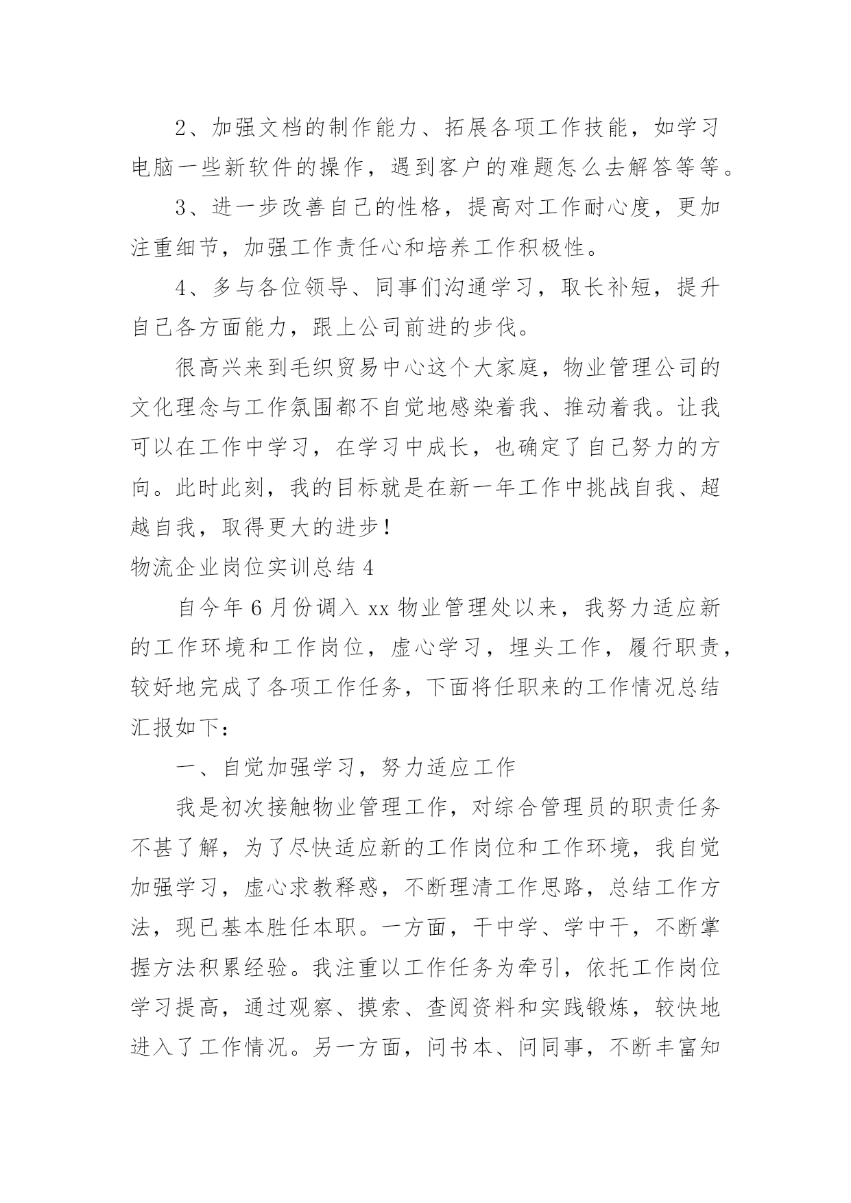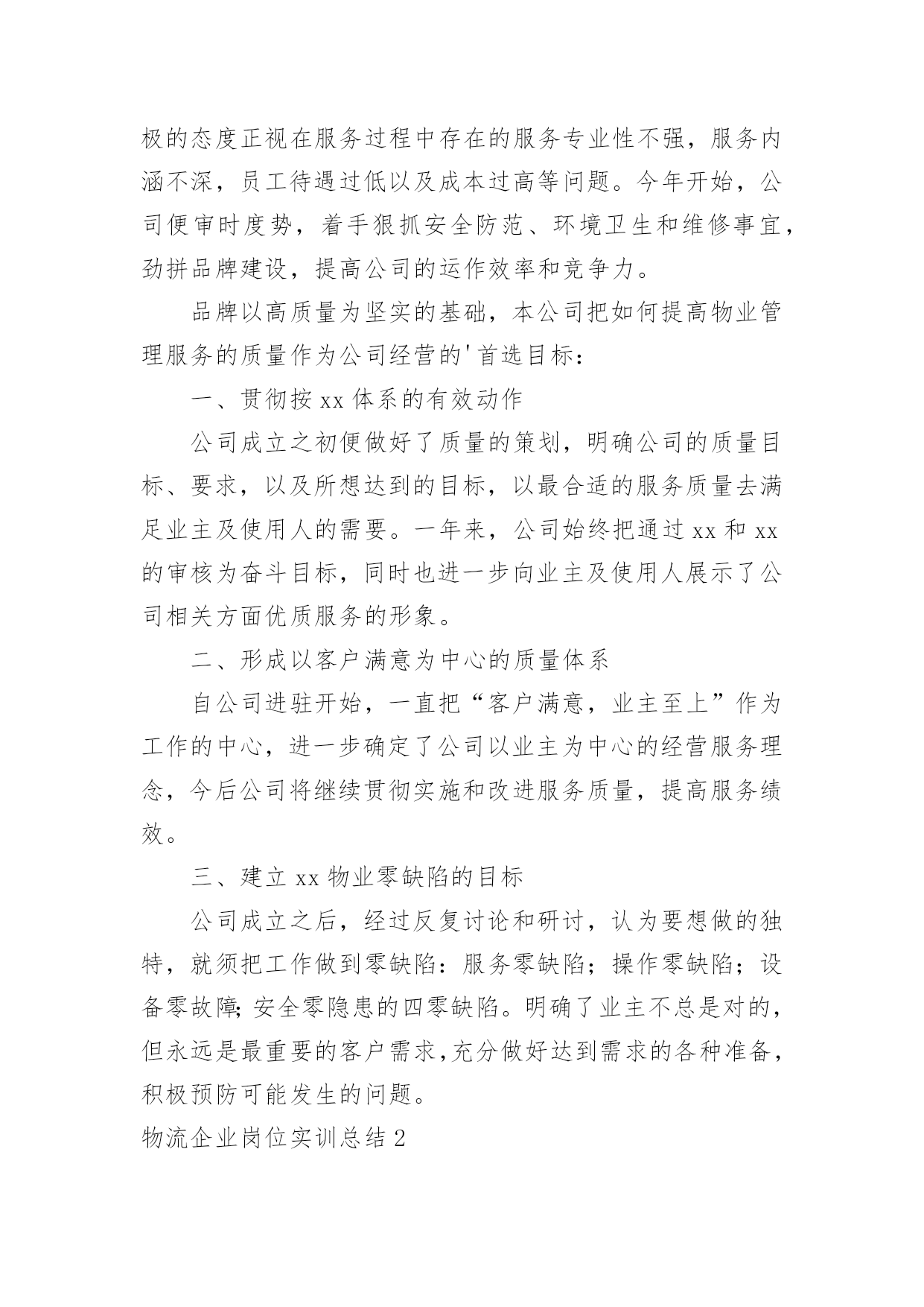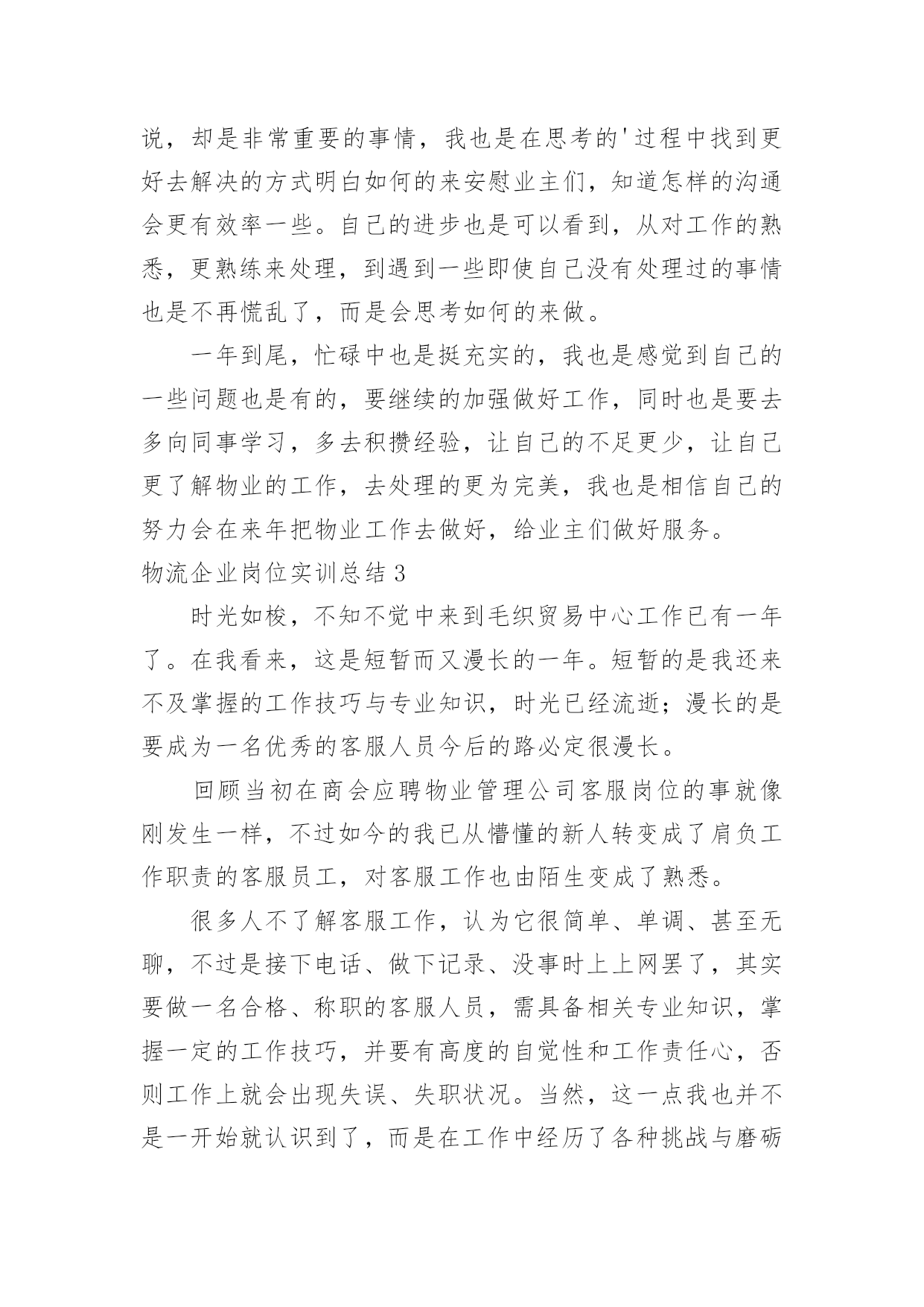 物流企业岗位实训总结物流企业岗位实训总结总结就是对一个时期的学习、工作或其完成情况进行一次全面系统的回顾和分析的书面材料,它能够使头脑更加清醒,目标更加明确,不如立即行动起来写一份总结吧。我们该怎么去写总结呢?下面是小编帮大家整理的物流企业岗位实训总结,仅供参考,希望能够帮助到大家。物流企业岗位实训总结120xx年xx月xx日,我物业公司进驻xx小区,这一年来,我全体员工团结一心,艰苦奋斗,勇于拼搏,不断创新,进一步完善和改进了公司的管理和服务质量,取得了可喜的成绩:组建了一支优秀的物业管理团队,创建了一种科学的管理模式和先进的管理理念、管理方法,以及严格的质量标准和工作程序;形成了服务与管理相结合的专业分工体系。一年以来,我们紧紧围绕战略规划、品牌建设、内部管理、信息沟通、服务绩效来展开一系列的工作。xx物业公司自成立以来,管理理念经历了从“管理型”到“服务型”的深刻转变,抛弃了过去以管理者自居的姿态,倡导了“服务育人,业主至上”的全新服务理念。我物业公司在发展过程中即使遭遇到了内外环境的严重挑战,但为业主、使用人服务的理念也一直在沿伸,同时也得到了广泛的好评。但公司管理层并没有满足可喜成绩的取得,而是以积极的态度正视在服务过程中存在的服务专业性不强,服务内涵不深,员工待遇过低以及成本过高等问题。今年开始,公司便审时度势,着手狠抓安全防范、环境卫生和维修事宜,劲拼品牌建设,提高公司的运作效率和竞争力。品牌以高质量为坚实的基础,本公司把如何提高物业管理服务的质量作为公司经营的'首选目标:一、贯彻按xx体系的有效动作公司成立之初便做好了质量的策划,明确公司的质量目标、要求,以及所想达到的目标,以最合适的服务质量去满足业主及使用人的需要。一年来,公司始终把通过xx和xx的审核为奋斗目标,同时也进一步向业主及使用人展示了公司相关方面优质服务的形象。二、形成以客户满意为中心的质量体系自公司进驻开始,一直把“客户满意,业主至上”作为工作的中心,进一步确定了公司以业主为中心的经营服务理念,今后公司将继续贯彻实施和改进服务质量,提高服务绩效。三、建立xx物业零缺陷的目标公司成立之后,经过反复讨论和研讨,认为要想做的独特,就须把工作做到零缺陷:服务零缺陷;操作零缺陷;设备零故障;安全零隐患的四零缺陷。明确了业主不总是对的,但永远是最重要的客户需求,充分做好达到需求的各种准备,积极预防可能发生的问题。物流企业岗位实训总结2经过这一年的沉淀,我也是有了很大的进步,不再是那个刚出校门不久的学生了,一年的时间也是让我更加的感受到作为职场中的一员,自己更懂得和他人去沟通,明白如何的处理一些事情,而一年工作的经历也是让我进步很多,在此也是就这一年在物业公司的工作来做个总结。作为物业前台,自己平时的工作也是比较的繁忙,从接听电话,给业主们处理好一些问题,和公司的同事一起配合来为业主们的事情而忙碌,也是对于这个行业有了更多的了解和明白,虽然忙,但是我也是有条理的去忙,知道每天是干了些什么,又是去反思了当天工作然后去改进,一年下来,其实收获还是挺多的,特别是年初的时候,配合社区的工作人员做好防控的工作,让我也是第一次的对于传染病有了一个很深入的了解,知道如何的来做防控的工作,同事们也是积极的配合,而业主们也是清楚这个事情的重要性,配合起来也是比较的默契,大家都是为了安全,也是不会觉得一些事情是繁琐的,而我也是尽责的处理好自己的工作,去配合。积极的参与到工作里头,我也是有了很多学习的机会,一些事情刚上手的时候的确不容易去做好,但是只有经历了,那么才会懂得一个物业工作该如何的开展,对于业主们的一些需求,我也是积极的配合同事去帮忙处理,有些事情可能做的多了,自己会感觉枯燥,但是其实站在业主们的角度来看,这都是他们不愿意经历的一些事情,一些维修,一些要去处理的事情都是要多站在他们的角度去考虑,也是明白自己的工作很多时候琐碎而且有些枯燥但其实对于业主们来说,却是非常重要的事情,我也是在思考的'过程中找到更好去解决的方式明白如何的来安慰业主们,知道怎样的沟通会更有效率一些。自己的进步也是可以看到,从对工作的熟悉,更熟练来处理,到遇到一些即使自己没有处理过的事情也是不再慌乱了,而是会思考如何的来做。一年到尾,忙碌中也是挺充实的,我也是感觉到自己的一些问题也是有的,要继续的加强做好工作,同时也是要去多向同事学习,多去积攒经验,让自己的不足更少,让自己更了解物业的工作,去处理的更为完美,我也是相信自己的努力会在来年把物业工作去做好,给业主们做好服务。物流企业岗位实训总结3时光如梭,不知不觉中来到毛织贸易中心工作已有一年了。在我看来,这是短暂而又漫长的一年。短暂的是我还来不及掌握的工作技巧与专业知识,时光已经流逝;漫长的是要成为一名优秀的客服人员今后的路必定很漫长。回顾当初在