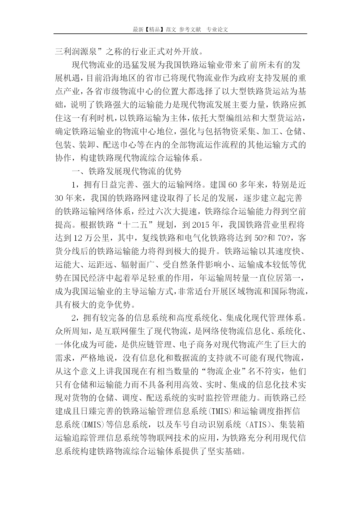 最新【精品】范文参考文献专业论文发展铁路现代物流的思考发展铁路现代物流的思考摘要:现代物流业的迅猛发展为我国铁路运输业带来了前所未有的发展机遇,应实现铁路运输与其他运输方式的开放式对接,铁路现代物流体系对物流市场的开放式对接。而建设铁路物流园区不失为在这一思路下的一个良好举措。关键词:铁路运输物流园区建设原则中图分类号:F530.3文献标识码:A文章编号:“物流”一词最早于1915年出现在美国阿齐萧的《市场流通中的若干问题》一书中。在第二次世界大战中,围绕战争供应,美国军队建立了“后勤”理论,并将其应用于战争活动中,其中所提出的“后勤”是指将战时物资的生产、采购、运输、配给等活动作为一个整体进行统一布置,以求战略物资补给的费用更低、速度更快、服务更好。1956年日本派团考察美国的流通技术,引进了物流的概念,到了70年代,日本已成为世界上物流最发达的国家之一。80年代初随着“市场营销”理论的引入而逐渐传入我国,受到经济界的重视。近年来,随着中国经济的飞速发展和世界经济的日益全球化,一方面,国际现代物流业加快了向中国市场的渗透,另一方面,国内企业的现代物流的发展也得到了广泛的重视。2001年3月国家经贸委会同铁道部、交通部、信息产业部、外经贸部、民航总局联合下发了“关于加快我国现代物流的若干意见”。2001年6月六部委在上海召开了全国物流工作座谈会。很多省市把发展物流提到了政府议事日程.成立机构,制定规划,加快发展。国家经贸委委托北京中交协物流研究院于2002年7月完成了《我国物流发展政策研究》的研究报告,并以此为重要参考拟定了《关于促进我国现代物流业发展若干政策措施的意见》,2003年8月外经贸部《开展外商投资物流业试点》政策出台,明确将江苏、浙江、广东三省和北京、天津、上海、重庆四个直辖市及特区深圳作为外商投资物流企业的试点,这标志着物流业这个有着“第三利润源泉”之称的行业正式对外开放。现代物流业的迅猛发展为我国铁路运输业带来了前所未有的发展机遇,目前沿海地区的省市已将现代物流业作为政府支持发展的重点产业,各省市级物流中心的位置大都选择了以大型铁路货运站为基础,说明了铁路强大的运输能力是现代物流发展主要力量,铁路应抓住这一有利时机,以铁路运输为主体,依托大型编组站和大型货运站,确定铁路运输业的物流中心地位,强化与包括物资采集、加工、仓储、包装、装卸、配送巾心等在内的全部物流运作流程的其他运输方式的协作,构建铁路现代物流综合运输体系。一、铁路发展现代物流的优势1,拥有日益完善、强大的运输网络。建国60多年来,特别是近30年来,我国的铁路路网建设取得了长足的发展,逐步建立起完善的铁路运输网络体系,经过六次大提速,铁路综合运输能力得到空前提高。根据铁路“十二五”规划,到2015年,我国铁路营业里程将达到12万公里,其中,复线铁路和电气化铁路将达到50?和70?,客货分线后的铁路运输能力将得到极大的提升。铁路运输以其速度快、运能大、运距远、辐射面广、受自然条件影响小、运输成本较低等优势在国民经济中起着举足轻重的作用,年运输周转量一直位居第一,成为我国运输业的主导运输方式,非常适台开展区域物流和国际物流,具有极大的竞争优势。2,拥有较完备的信息系统和高度系统化、集成化现代管理体系。众所周知,是互联网催生了现代物流,是网络使物流信息化、系统化、一体化成为可能,是供应链管理、电子商务对现代物流产生了巨大的需求,严格地说,没有信息化和数据流的支持就不可能有现代物流,从这个意义上讲我国现在有相当数量的“物流企业”名不符实,他们只有仓储和运输能力而不具备利用高效、实时、集成的信息化技术实现对货物的仓储、调度、配送系统的实时监控管理能力。而铁路已经建成且日臻完善的铁路运输管理信息系统(TMIS)和运输调度指挥信息系统(DMIS)等信息系统,以及车号自动识别系统(ATIS)、集装箱运输追踪管理信息系统等物联网技术的应用,为铁路充分利用现代信息系统构建铁路物流综合运输体系提供了坚实基础。3,拥有高素质的专业人才、较强的研发、设计和管理能力。从某种意义上说,铁路是传统的物流企业,有着丰富的物资运输管理经验,基础好,向现代物流转型比较方便。铁路索以高度集中和半军事化著称,系统内有众多的院校、科研设计机构和施工单位,为科学地规划、设计、修建和运用管理铁路物流园区提供了可靠的保证。二、铁路发展现代物流的“软肋”在现代物流服务中,强调的是从供应者到需求者的物理移动的整个过程,即要实现点到点、门到门、桌到桌的服务,而一个完整的运输过程是由干线运输和集散运输共同构成的。在干线运输中,铁路的龙头地位几乎无可替代,而集散运输铁路显得有些鞭长莫及,成为铁路发展现代物流的“软肋”。解决这一问题的思路应是以铁路运输为主干、以经济中心城市、物流基