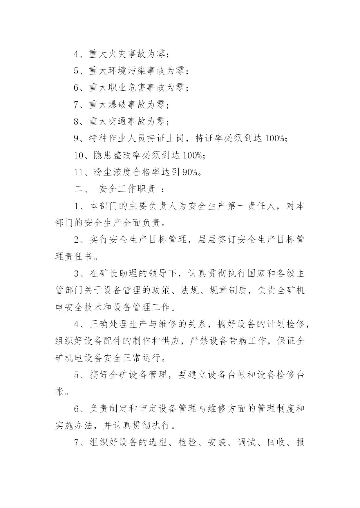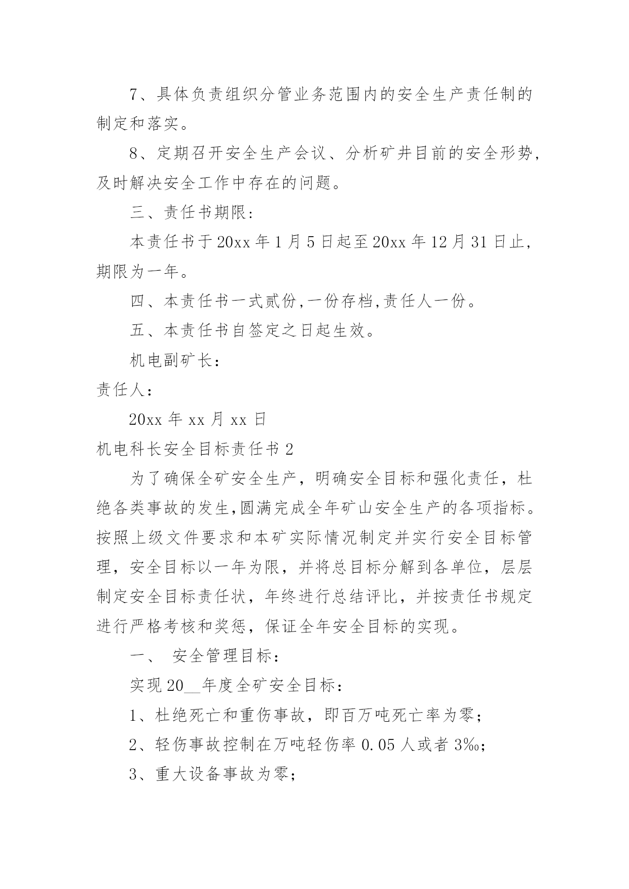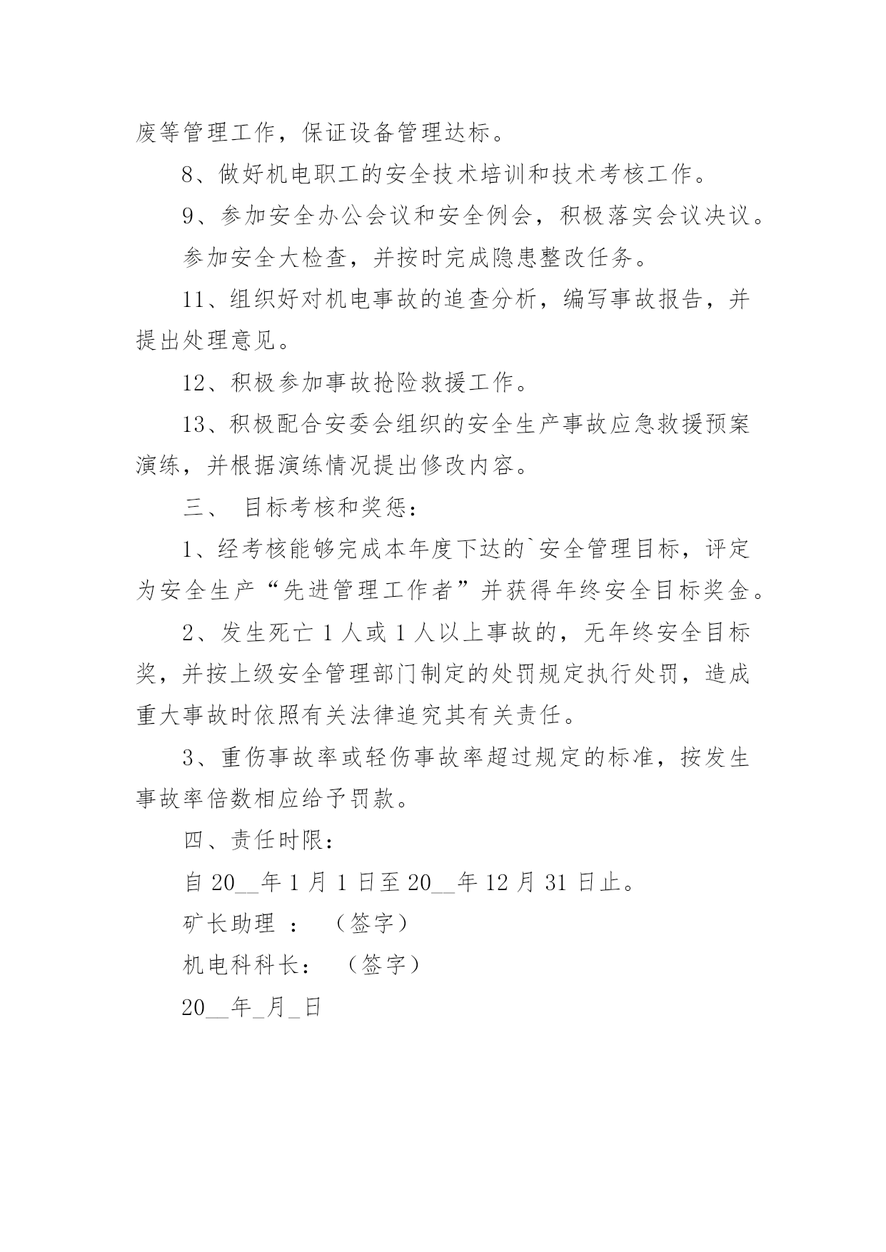 机电科长安全目标责任书机电科长安全目标责任书在社会发展不断提速的今天,越来越多地方需要用到责任书,责任书可以让我们充分意识到责任的重要性。到底应如何拟定责任书呢?下面是小编帮大家整理的机电科长安全目标责任书,欢迎阅读与收藏。机电科长安全目标责任书1一、为认真贯彻落实各项安全生产责任制,努力提高企业安全管理水平和不断改善职工的劳动素质,切实有效的遏制矿井事故的发生。特制定本安全生产目标责任书。二、安全管理目标:1、在机电副矿长的领导下,全面负责机电、运输安全生产监管工作,并对分管业务范围内的安全生产负直接责任。2、认真贯彻“五同时”原则,坚持不安全不生产。3、具体负责组织制定分管范围内的安全生产规章制度、安全操作规程、安全技术措施计划,监督检查执行情况。4、组织分管范围内的安全检查,事故隐患排查,制定落实重大事故隐患整改措施。5、负责分管部门的`安全教育培训与特殊工种持证上岗培训计划工作。6、按规定组织分管业务范围内的事故调查和处理。7、具体负责组织分管业务范围内的安全生产责任制的制定和落实。8、定期召开安全生产会议、分析矿井目前的安全形势,及时解决安全工作中存在的问题。三、责任书期限:本责任书于20xx年1月5日起至20xx年12月31日止,期限为一年。四、本责任书一式贰份,一份存档,责任人一份。五、本责任书自签定之日起生效。机电副矿长:责任人:20xx年xx月xx日机电科长安全目标责任书2为了确保全矿安全生产,明确安全目标和强化责任,杜绝各类事故的发生,圆满完成全年矿山安全生产的各项指标。按照上级文件要求和本矿实际情况制定并实行安全目标管理,安全目标以一年为限,并将总目标分解到各单位,层层制定安全目标责任状,年终进行总结评比,并按责任书规定进行严格考核和奖惩,保证全年安全目标的实现。一、安全管理目标:实现20__年度全矿安全目标:1、杜绝死亡和重伤事故,即百万吨死亡率为零;2、轻伤事故控制在万吨轻伤率0.05人或者3‰;3、重大设备事故为零;4、重大火灾事故为零;5、重大环境污染事故为零;6、重大职业危害事故为零;7、重大爆破事故为零;8、重大交通事故为零;9、特种作业人员持证上岗,持证率必须到达100%;10、隐患整改率必须到达100%;11、粉尘浓度合格率达到90%。二、安全工作职责:1、本部门的主要负责人为安全生产第一责任人,对本部门的安全生产全面负责。2、实行安全生产目标管理,层层签订安全生产目标管理责任书。3、在矿长助理的领导下,认真贯彻执行国家和各级主管部门关于设备管理的政策、法规、规章制度,负责全矿机电安全技术和设备管理工作。4、正确处理生产与维修的关系,搞好设备的计划检修,组织好设备配件的制作和供应,严禁设备带病工作,保证全矿机电设备安全正常运行。5、搞好全矿设备管理,要建立设备台帐和设备检修台帐。6、负责制定和审定设备管理与维修方面的管理制度和实施办法,并认真贯彻执行。7、组织好设备的选型、检验、安装、调试、回收、报废等管理工作,保证设备管理达标。8、做好机电职工的安全技术培训和技术考核工作。9、参加安全办公会议和安全例会,积极落实会议决议。参加安全大检查,并按时完成隐患整改任务。11、组织好对机电事故的追查分析,编写事故报告,并提出处理意见。12、积极参加事故抢险救援工作。13、积极配合安委会组织的安全生产事故应急救援预案演练,并根据演练情况提出修改内容。三、目标考核和奖惩:1、经考核能够完成本年度下达的`安全管理目标,评定为安全生产“先进管理工作者”并获得年终安全目标奖金。2、发生死亡1人或1人以上事故的,无年终安全目标奖,并按上级安全管理部门制定的处罚规定执行处罚,造成重大事故时依照有关法律追究其有关责任。3、重伤事故率或轻伤事故率超过规定的标准,按发生事故率倍数相应给予罚款。四、责任时限:自20__年1月1日至20__年12月31日止。矿长助理:(签字)机电科科长:(签字)20__年_月_日