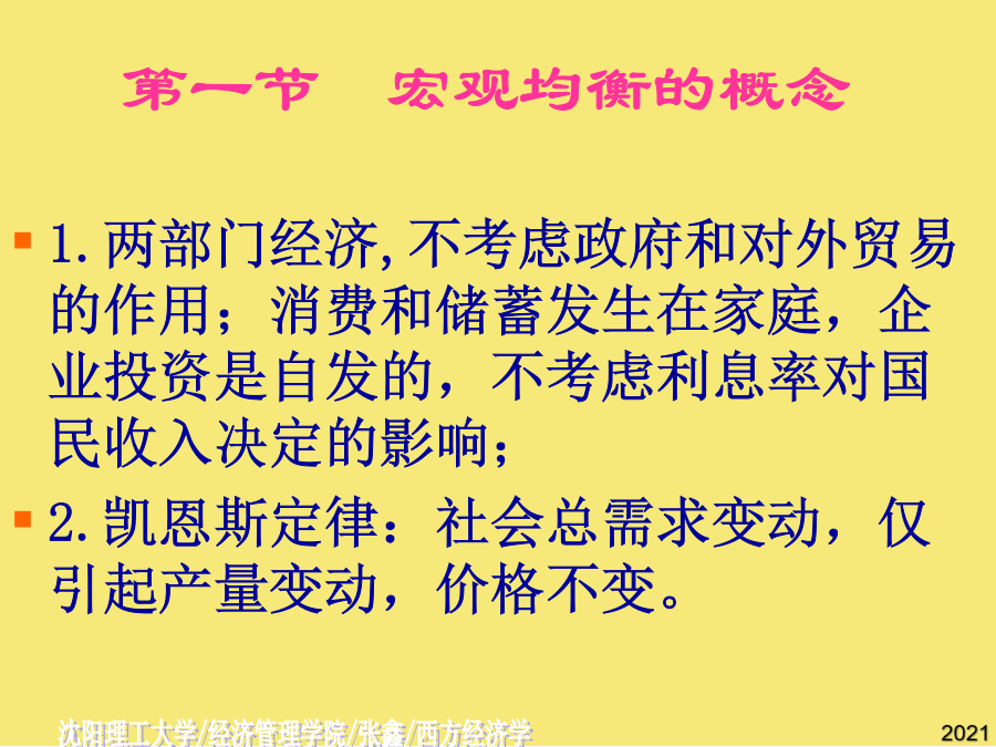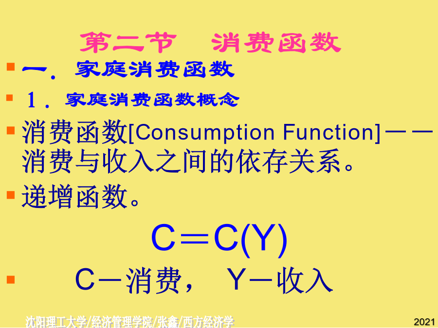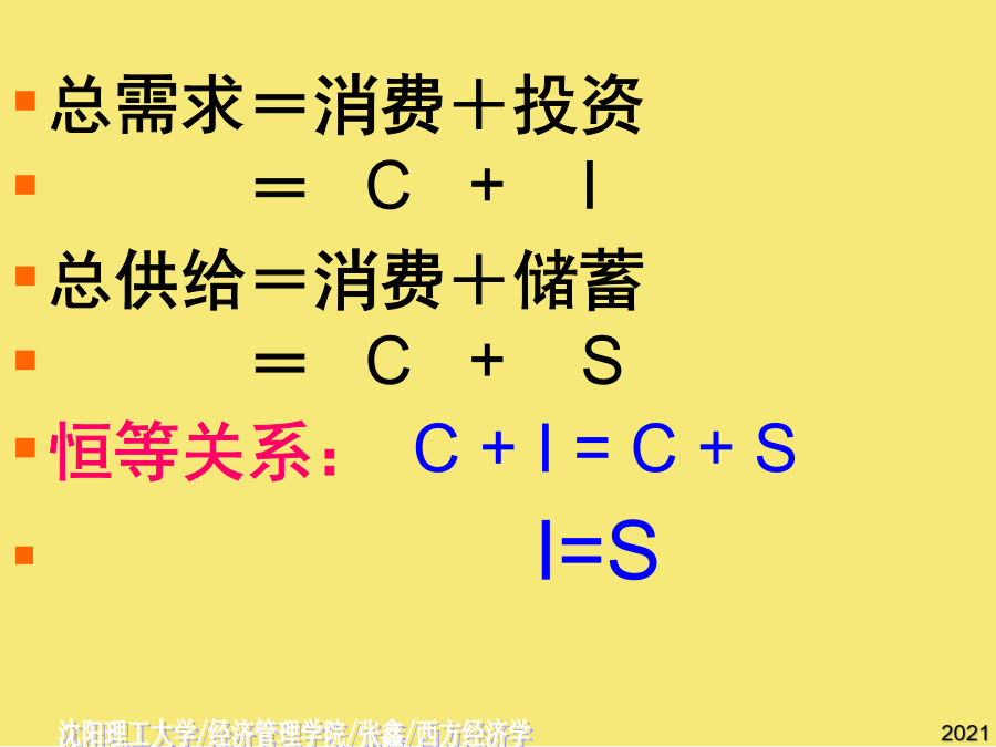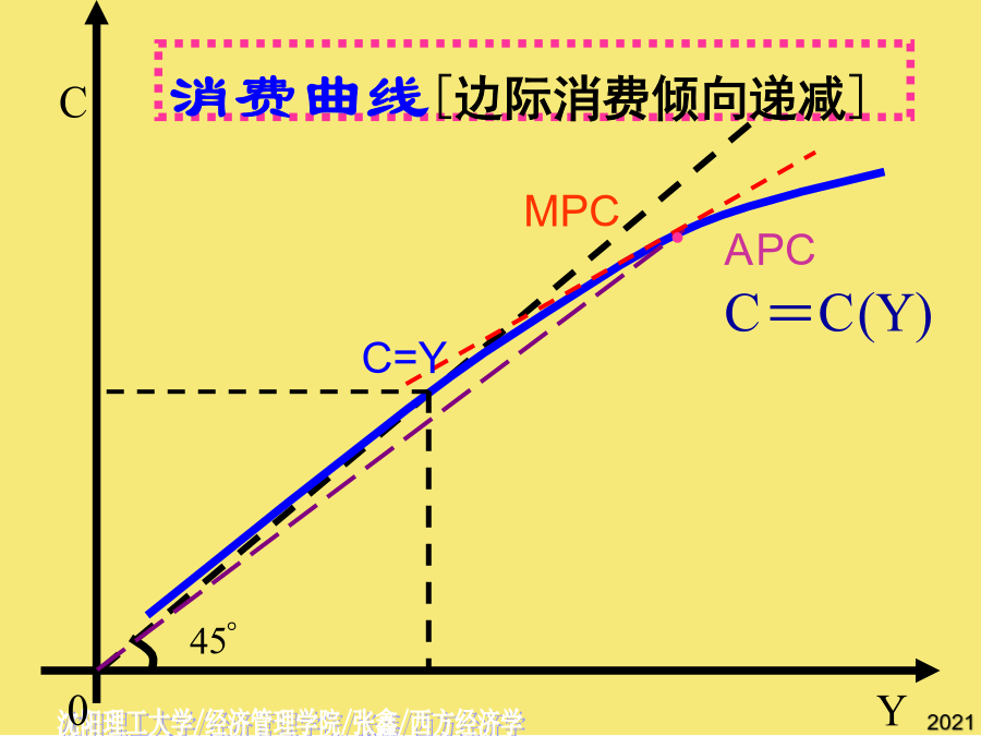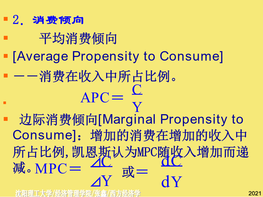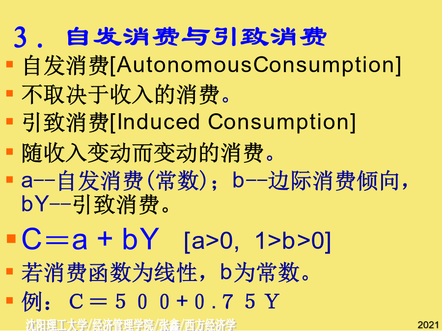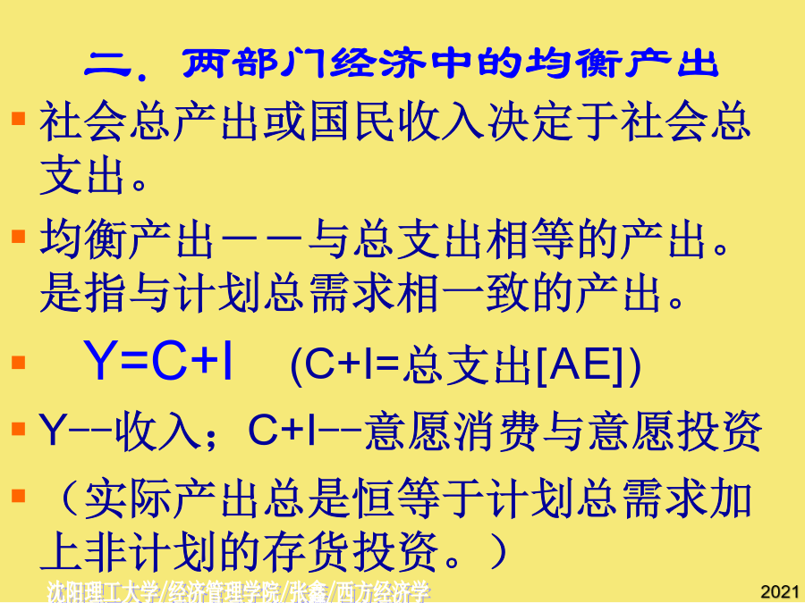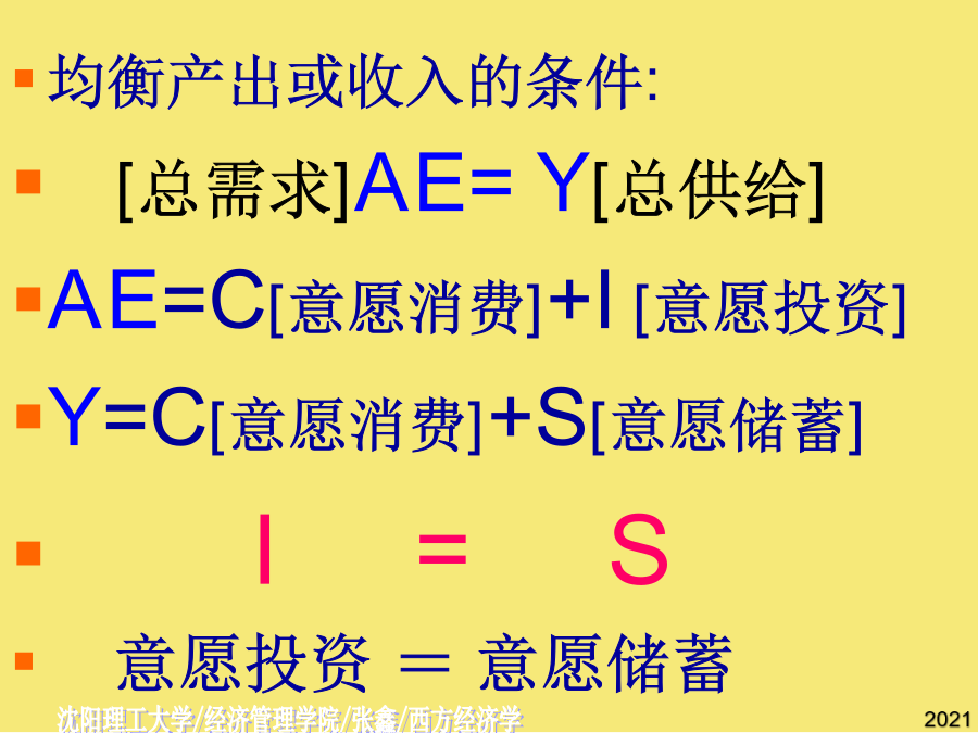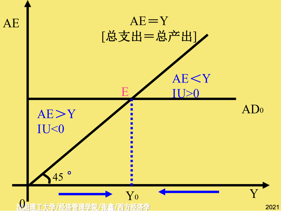 第十三章国民收入的决定:收入-支出模型[Income-ExpenditureModel]第一节宏观均衡的概念二.两部门经济中的均衡产出AE均衡产出或收入的条件:[总需求]AE=Y[总供给]AE=C[意愿消费]+I[意愿投资]Y=C[意愿消费]+S[意愿储蓄]I=S意愿投资=意愿储蓄总需求=消费+投资=C+I总供给=消费+储蓄=C+S恒等关系:C+I=C+SI=S第二节消费函数2.消费倾向平均消费倾向[AveragePropensitytoConsume]--消费在收入中所占比例。边际消费倾向[MarginalPropensitytoConsume]:增加的消费在增加的收入中所占比例,凯恩斯认为MPC随收入增加而递减。C自发消费[AutonomousConsumption]不取决于收入的消费。引致消费[InducedConsumption]随收入变动而变动的消费。a--自发消费(常数);b--边际消费倾向,bY--引致消费。C=a+bY[a>0,1>b>0]若消费函数为线性,b为常数。例:C=500+0.75YC例题二.储蓄函数2.储蓄倾向平均储蓄倾向[AveragePropensitytoSave]--储蓄在收入中所占比例。边际储蓄倾向[MarginalPropensitytoSave]:增加的储蓄在增加的收入中所占比例。SS三.消费函数与储蓄函数的关系∵Y=C+S∴APC+APS=1∵⊿Y=⊿C+⊿S∴MPC+MPS=1例题四.家庭消费函数与社会消费函数假定投资为自发投资,即不随国民收入的变化而变化。∵C=a+bY∴AD=C+I=(a+I)+bY∵Y=C+I(收入恒等式)C=a+bY(消费函数)∴Y=(a+I)+bYY-bY=(a+I)AD[C+I]二、储蓄对国民收入的影响S45例题自发总需求变动对国民收入的影响例题AD例题三、乘数理论AD[C+I]AD[C+I]乘数的大小取决于边际消费倾向的高低:MPC越大乘数越大,MPC越小乘数越小。乘数发挥作用的前提条件是资源尚未充分利用;乘数的作用是双向的。一、政府的收入和支出1.政府收入:税收税收特征:强制性、无偿性和固定性税收分类:直接税(税负不能转嫁)间接税(可转嫁)政府支出:政府购买和转移支付乘数发挥作用的前提条件是资源尚未充分利用;乘数的大小取决于边际消费倾向的高低:MPC越大乘数越大,MPC越小乘数越小。第五节潜在国民收入与缺口⊿Y=⊿AD=⊿(a+I)+b⊿Y三部门经济的均衡国民收入∴AD=C+I=(a+I)+bYY=C+I=1000+0.[AveragePropensitytoConsume](实际产出总是恒等于计划总需求加上非计划的存货投资。二.两部门经济中的均衡产出二.两部门经济中的均衡产出=Y-(a+bY)S=I-1000+0.税收对消费的影响YD=Y-T=Y-T0-tY=Y(1-t)-T0C=a+bYC´=a+bYD=a+b[Y(1-t)-T0]=a-bT0+b(1-t)Y净税收与消费函数⊿Y=⊿AD=⊿(a+I)+b⊿YYD=-T0+(1-t)Y--储蓄在收入中所占比例。I=S(实际产出总是恒等于计划总需求加上非计划的存货投资。边际储蓄倾向为,投资支出增加60亿元,将导致均衡GDP增加()b--边际消费倾向,bY--引致消费。消费函数[ConsumptionFunction]--消费与收入之间的依存关系。I=S政府购买指在商品和劳务上的支出,包括教育、卫生、防务、警察和公共投资的支出及其他经常性支出。收入100元中,80元用于消费,其余20元用于储蓄,求平均储蓄倾向.C=a+bY(消费函数)公司未分配利润所占比例2Y=1800Y=9000假设某经济的消费函数是,投资i=50,政府购买性支出g=200,政府转移支付,税率。若消费函数为线性,b为常数。T=T0+tYC=a+bYD∵YD=Y-TT=T0+tYYD=-T0+(1-t)Y∴C=a-bT0+b(1-t)YY=a-bT0+b(1-t)Y+I+G3.三部门经济的乘数税收乘数平衡预算乘数BS=T-TR-G若TR不变,则⊿BS=⊿T-⊿G=0⊿T=⊿GY=C+I+G其中假定I不变则⊿Y=⊿C+⊿G⊿Y=b*(⊿Y-⊿T)+⊿G⊿Y=b⊿Y-b⊿T+⊿G,已知⊿G=⊿T,则有(1-b)⊿Y=(1-b)⊿G二、储蓄对国民收入的影响(实际产出总是恒等于计划总需求加上非计划的存货投资。第三节两部门经济国民收入的决定一、消费对国民收入决定的影响边际消费倾向变动对国民收入的影响自发总需求变动对国民收入的影响[T-