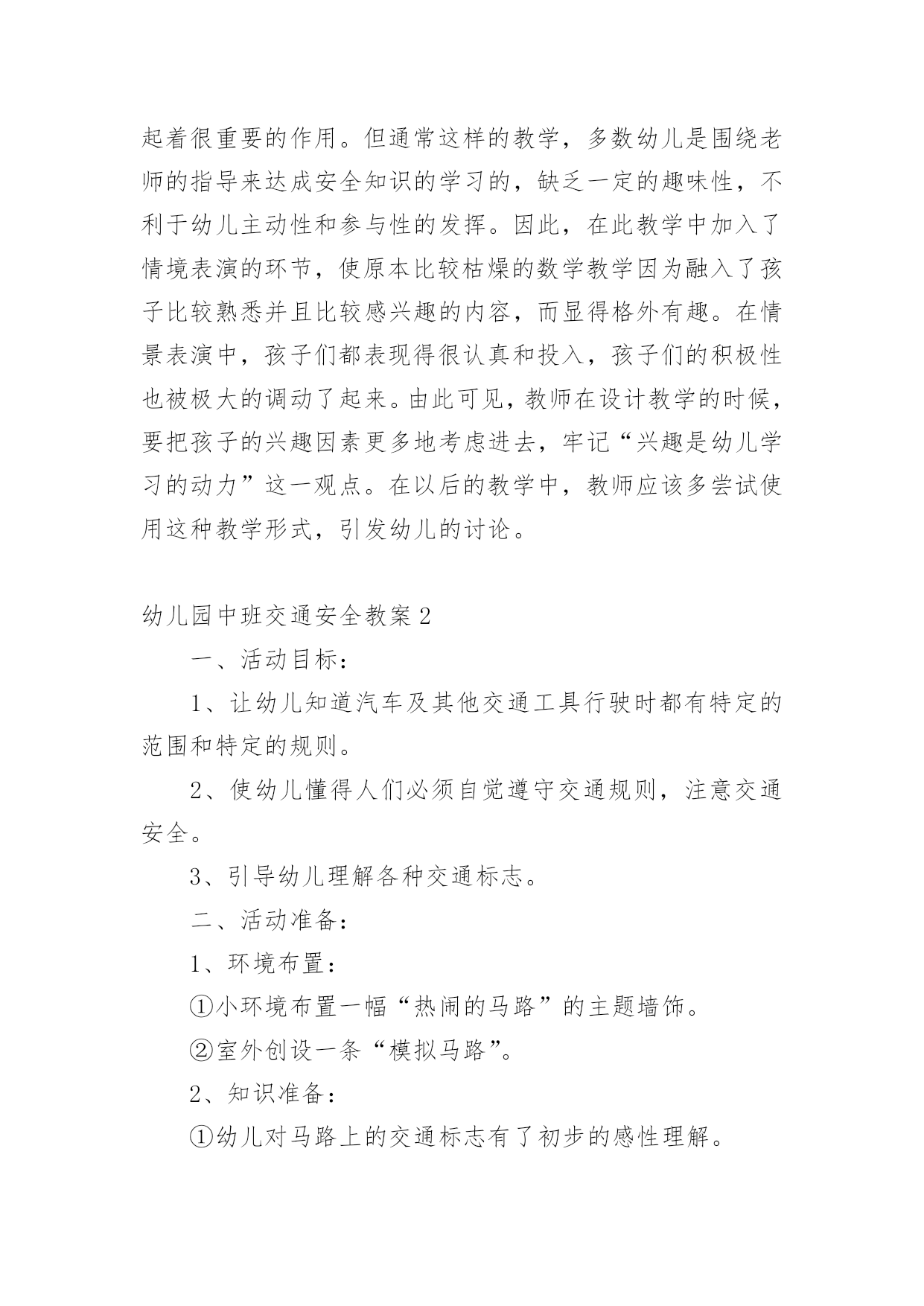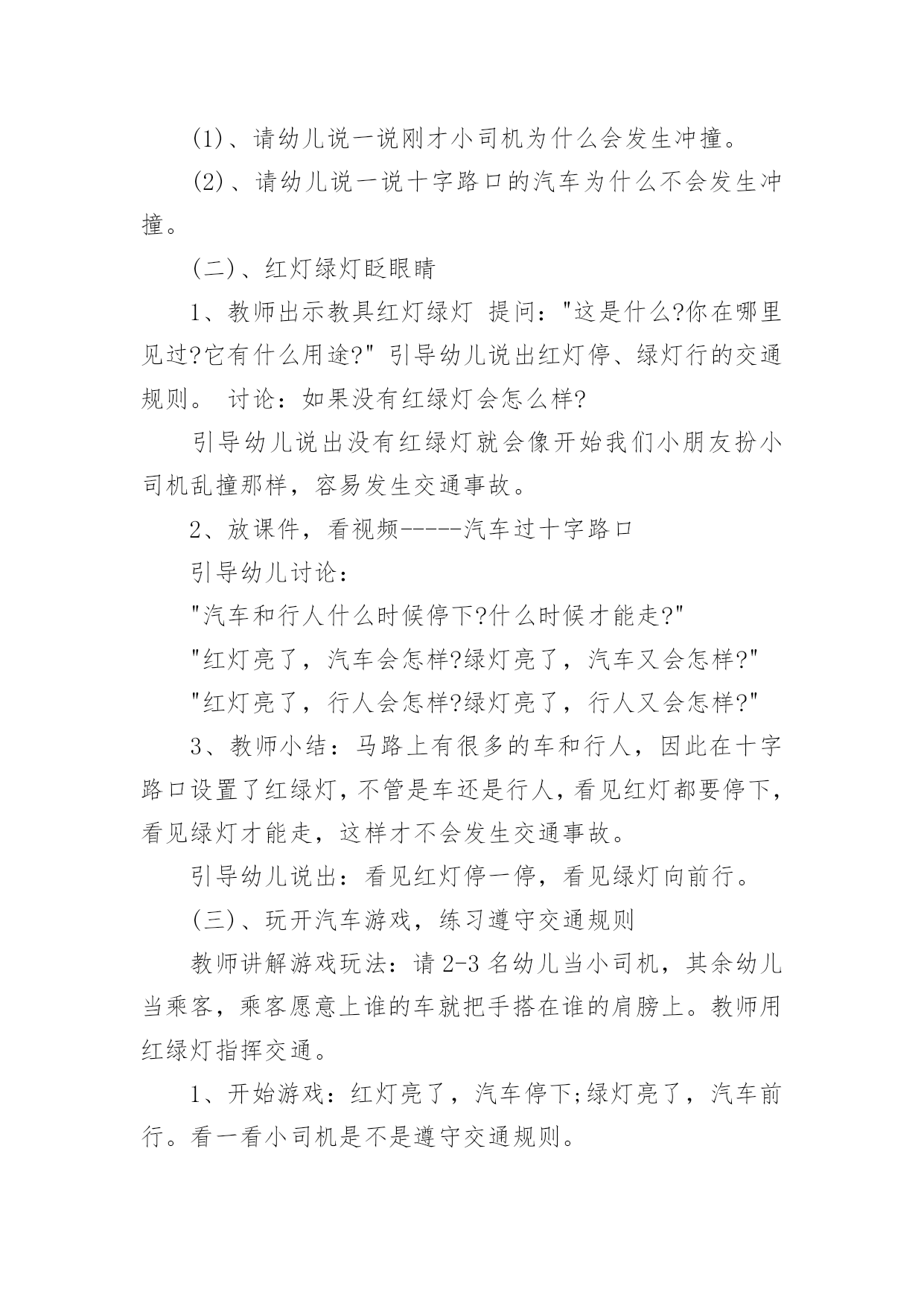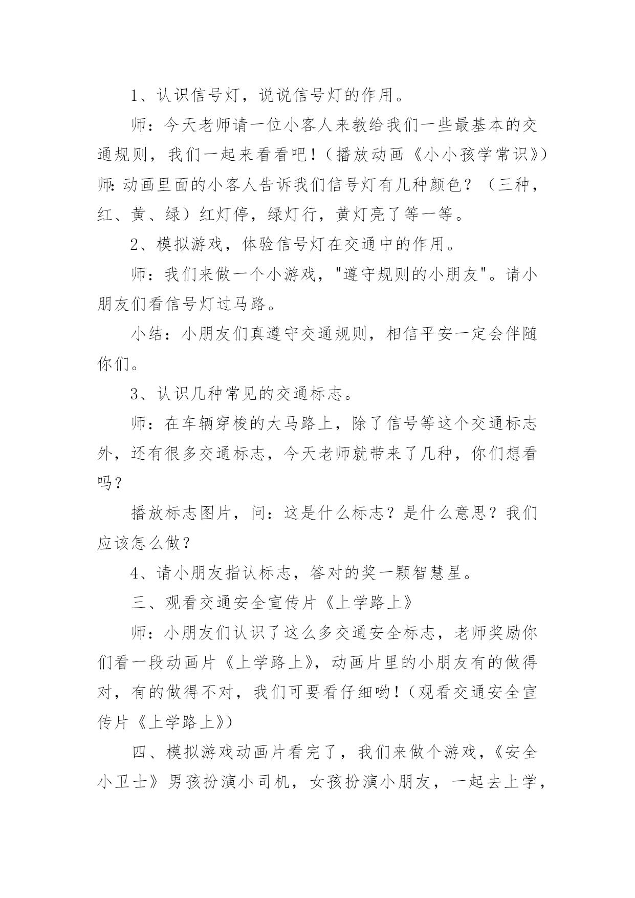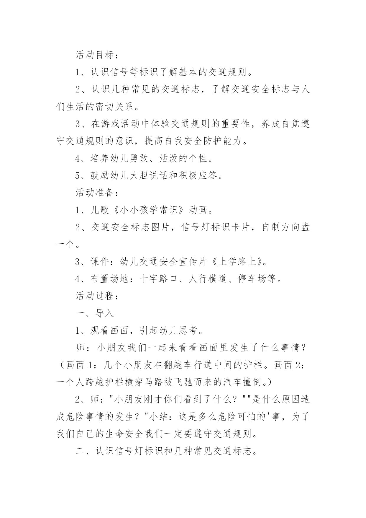幼儿园中班交通安全教案幼儿园中班交通安全教案【热】作为一名教师,就不得不需要编写教案,通过教案准备可以更好地根据具体情况对教学进程做适当的必要的调整。怎样写教案才更能起到其作用呢?下面是小编整理的幼儿园中班交通安全教案,供大家参考借鉴,希望可以帮助到有需要的朋友。幼儿园中班交通安全教案1教学目标:1、使幼儿知道交警叔叔工作很辛苦,很重要,教育幼儿要热爱他们。2、让幼儿初步了解红绿灯和人行横道的作用,能根据信号做动作,听从红绿灯的指挥,教育他们不要在马路上乱跑,提醒幼儿注意安全。3、培养幼儿自我保护能力。4、培养幼儿动脑思考问题、解决问题的能力。5、能积极参加游戏教学,并学会自我保护。教学准备:1、交警叔叔的图片一张。2、孩子们以前做的手工礼物。3、准备交警帽子一顶。教学过程:一、以刚出厂的小汽车请求帮助引出课题。老师:有辆小汽车刚从汽车制造厂里出来,对一切都感到很奇怪,它看到马路上这么热闹,开心得“滴滴”直叫,正走着呢,他看见马路中间站着一个人(出示交警叔叔图片)1、这是谁?2、他在干什么?3、他会对小汽车说什么?二、坚守岗位的交警叔叔。(出示幻灯片)出示交警冒雨雪执勤以及扶盲人过马路的图片,让幼儿感受交警工作的辛苦,激发对交警叔叔的热爱。提问:1、交警叔叔都作了哪些事情?2、你们喜欢他吗?3、请每位幼儿跟交警叔叔说一句甜甜的话。三、给交警叔叔送礼物让幼儿自选一种礼物,然后跟老师出去一起把礼物送给交警叔叔,把幼儿带出场地。(在此期间要提醒幼儿出去送礼物的时候要注意安全,过马路要走人行横道)。教学反思:孩子们对交通安全有一定的认知,能较客观的认定其他人行为的对与错。在教学中,幼儿的语言表达能力有了很大的进步,尤其是对于自己比较了解的`事情,语言的条理性很强。由此可见,生活经验的积累对幼儿的思维、语言发展起着很重要的作用。但通常这样的教学,多数幼儿是围绕老师的指导来达成安全知识的学习的,缺乏一定的趣味性,不利于幼儿主动性和参与性的发挥。因此,在此教学中加入了情境表演的环节,使原本比较枯燥的数学教学因为融入了孩子比较熟悉并且比较感兴趣的内容,而显得格外有趣。在情景表演中,孩子们都表现得很认真和投入,孩子们的积极性也被极大的调动了起来。由此可见,教师在设计教学的时候,要把孩子的兴趣因素更多地考虑进去,牢记“兴趣是幼儿学习的动力”这一观点。在以后的教学中,教师应该多尝试使用这种教学形式,引发幼儿的讨论。幼儿园中班交通安全教案2一、活动目标:1、让幼儿知道汽车及其他交通工具行驶时都有特定的范围和特定的规则。2、使幼儿懂得人们必须自觉遵守交通规则,注意交通安全。3、引导幼儿理解各种交通标志。二、活动准备:1、环境布置:①小环境布置一幅“热闹的马路”的主题墙饰。②室外创设一条“模拟马路”。2、知识准备:①幼儿对马路上的交通标志有了初步的感性理解。②幼儿已有一定的安全意识。3、物质准备:马路范图一张,小老鼠开车卡片一张,常见的交通标志一套,“人、汽车、自行车”等标志人手一个。三、活动过程:1、故事引入。以故事《乡下老鼠逛公园》引入话题,教育幼儿理解各种标志。2、理解标志。以帮小老鼠的.忙,逐一出示交通标志,提问:这是什么标志?标志上画有什么?表示什么意思?3、游戏:我指你说。老师指出某一交通标志,让幼儿说出该标志所代表的意思。4、游戏:过马路。让幼儿挂上各种交通标志,(人、或车)扮演各种交通工具,在模拟的马路上亲自体验各种交通标志的作用。幼儿园中班交通安全教案3设计意图:中班年龄阶段的幼儿,具有活泼好动、好奇、模仿力强等特点,是最容易引发交通事故的群体。虽然他们出去一般都有成人监护,但稍有不慎,就会严重影响幼儿的身心健康甚至酿成悲剧,独自穿越马路,独自活动的机会增多了。通过此次活动,让幼儿了解交通信号灯及安全标志与人们生活的密切关系。初步养成自觉遵守交通规则的意识,提高自我安全防护能力。活动目标:1、认识信号等标识了解基本的交通规则。2、认识几种常见的交通标志,了解交通安全标志与人们生活的密切关系。3、在游戏活动中体验交通规则的重要性,养成自觉遵守交通规则的意识,提高自我安全防护能力。4、培养幼儿勇敢、活泼的个性。5、鼓励幼儿大胆说话和积极应答。活动准备:1、儿歌《小小孩学常识》动画。2、交通安全标志图片,信号灯标识卡片,自制方向盘一个。3、课件:幼儿交通安全宣传片《上学路上》。4、布置场地:十字路口、人行横道、停车场等。活动过程:一、导入1、观看画面,引起幼儿思考。师:小朋友我们一起来看看画面里发生了什么事情?(画面1:几个小朋友在翻越车行道中间的护栏。画面2:一个人跨越护栏横穿马路被飞驰而来的汽车撞倒。)2、师:"小朋友刚才你们看到了什么?""是什么原因造成危险事情的发生?"小结:这是多么危险可怕的'事,为了我们自己的生命安全我们一定要