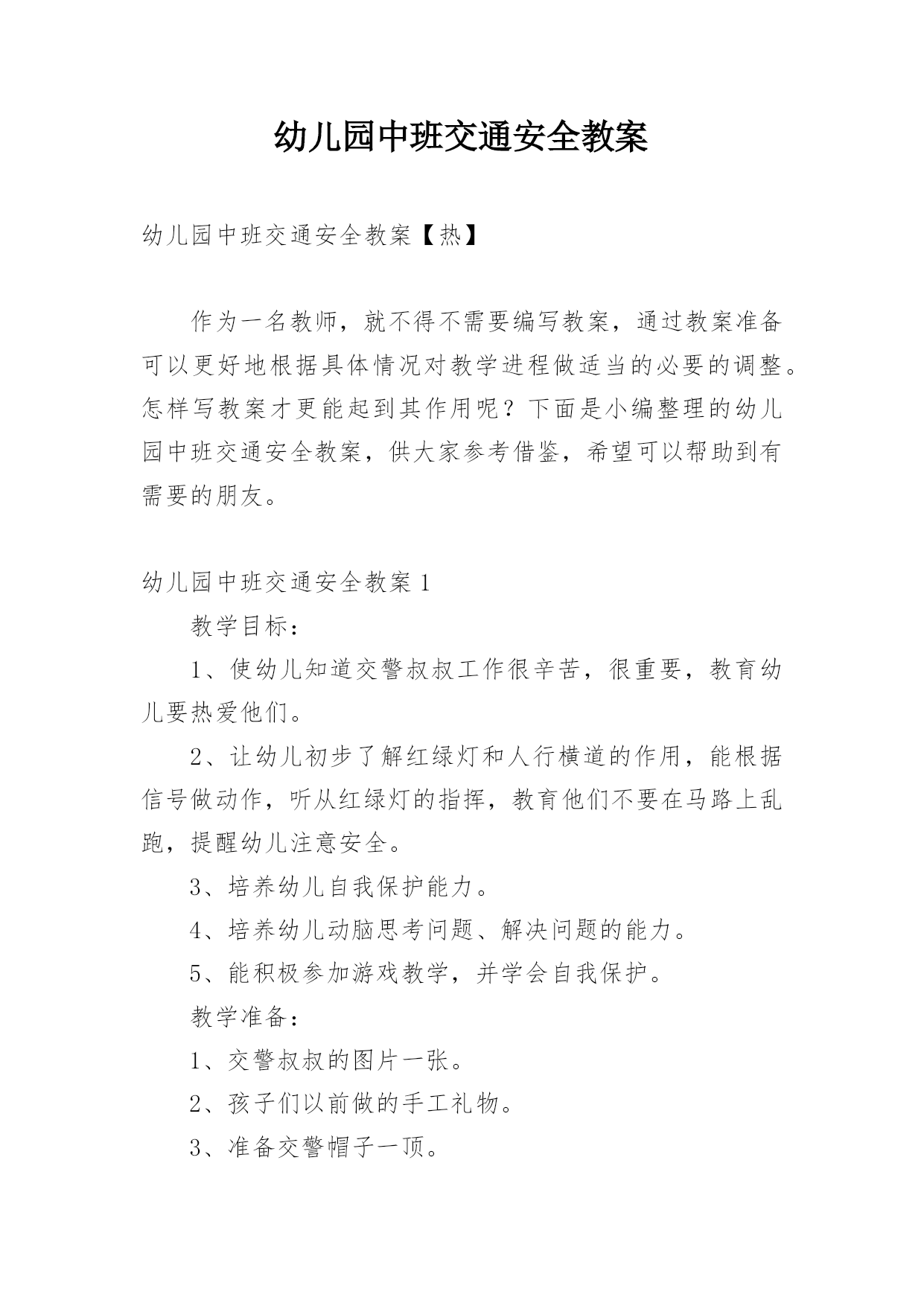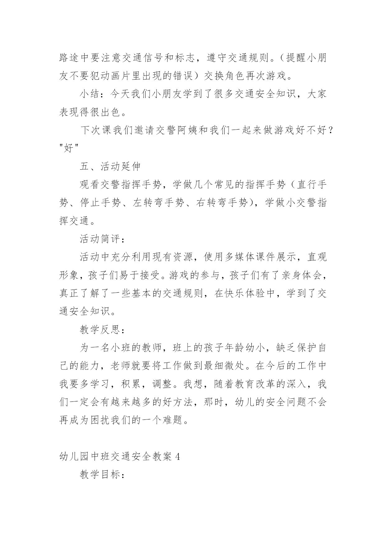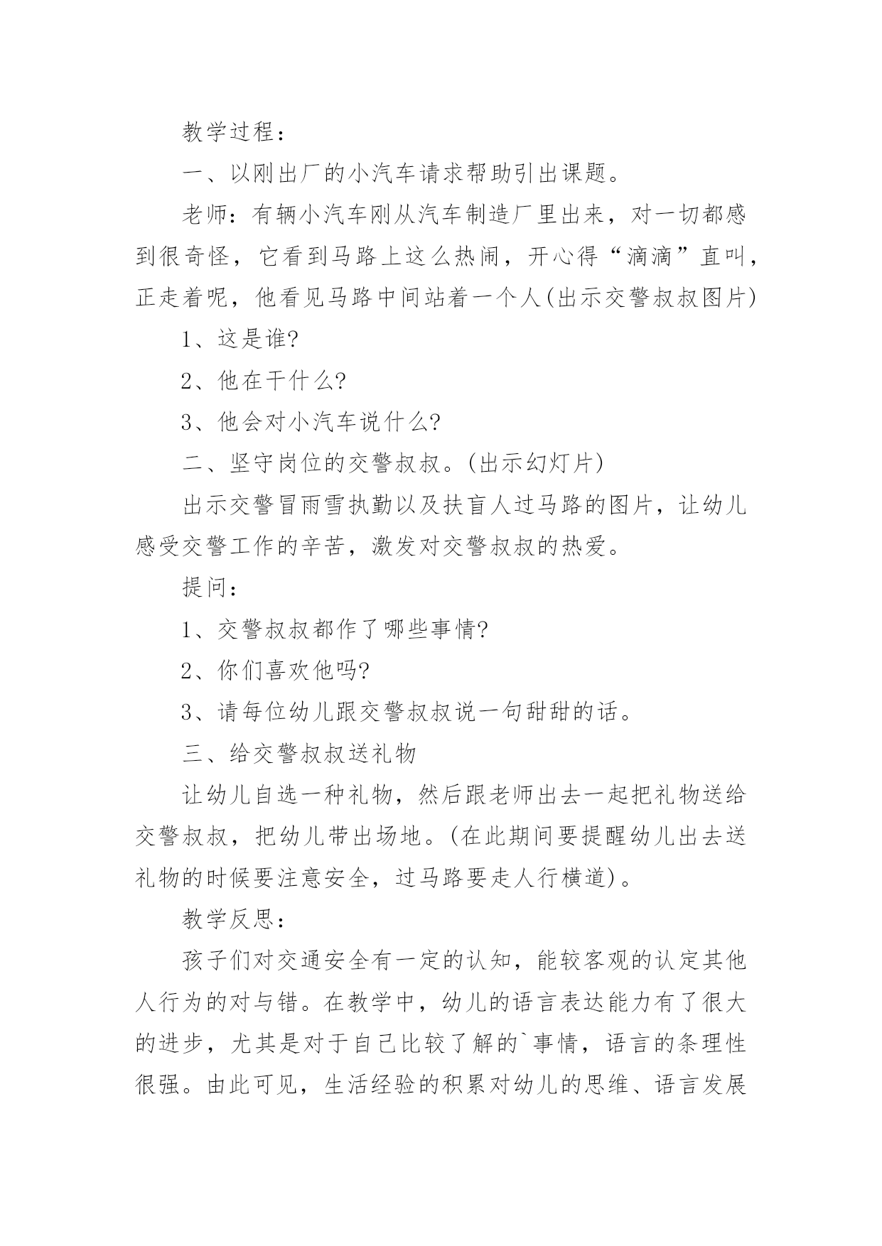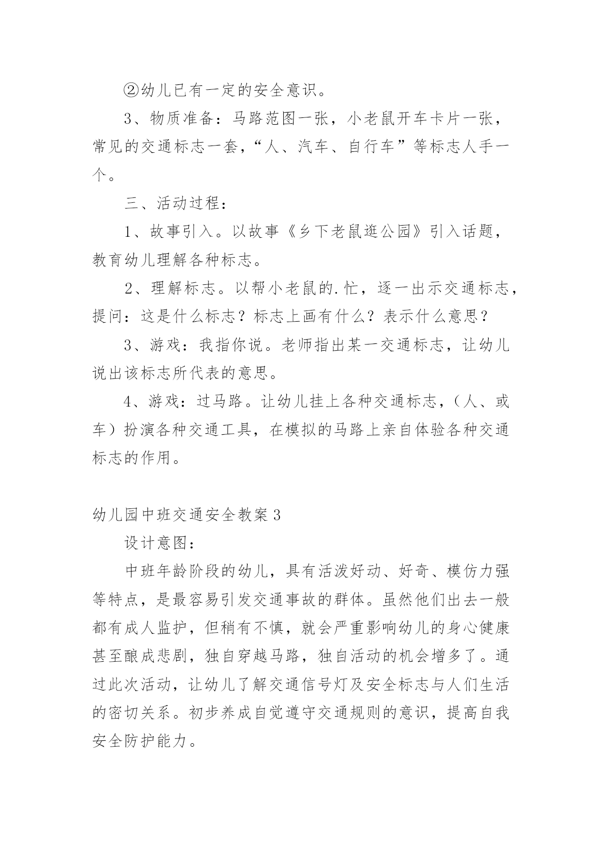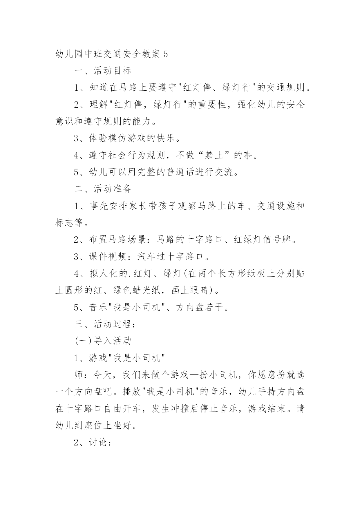 幼儿园中班交通安全教案幼儿园中班交通安全教案【热】作为一名教师,就不得不需要编写教案,通过教案准备可以更好地根据具体情况对教学进程做适当的必要的调整。怎样写教案才更能起到其作用呢?下面是小编整理的幼儿园中班交通安全教案,供大家参考借鉴,希望可以帮助到有需要的朋友。幼儿园中班交通安全教案1教学目标:1、使幼儿知道交警叔叔工作很辛苦,很重要,教育幼儿要热爱他们。2、让幼儿初步了解红绿灯和人行横道的作用,能根据信号做动作,听从红绿灯的指挥,教育他们不要在马路上乱跑,提醒幼儿注意安全。3、培养幼儿自我保护能力。4、培养幼儿动脑思考问题、解决问题的能力。5、能积极参加游戏教学,并学会自我保护。教学准备:1、交警叔叔的图片一张。2、孩子们以前做的手工礼物。3、准备交警帽子一顶。教学过程:一、以刚出厂的小汽车请求帮助引出课题。老师:有辆小汽车刚从汽车制造厂里出来,对一切都感到很奇怪,它看到马路上这么热闹,开心得“滴滴”直叫,正走着呢,他看见马路中间站着一个人(出示交警叔叔图片)1、这是谁?2、他在干什么?3、他会对小汽车说什么?二、坚守岗位的交警叔叔。(出示幻灯片)出示交警冒雨雪执勤以及扶盲人过马路的图片,让幼儿感受交警工作的辛苦,激发对交警叔叔的热爱。提问:1、交警叔叔都作了哪些事情?2、你们喜欢他吗?3、请每位幼儿跟交警叔叔说一句甜甜的话。三、给交警叔叔送礼物让幼儿自选一种礼物,然后跟老师出去一起把礼物送给交警叔叔,把幼儿带出场地。(在此期间要提醒幼儿出去送礼物的时候要注意安全,过马路要走人行横道)。教学反思:孩子们对交通安全有一定的认知,能较客观的认定其他人行为的对与错。在教学中,幼儿的语言表达能力有了很大的进步,尤其是对于自己比较了解的`事情,语言的条理性很强。由此可见,生活经验的积累对幼儿的思维、语言发展起着很重要的作用。但通常这样的教学,多数幼儿是围绕老师的指导来达成安全知识的学习的,缺乏一定的趣味性,不利于幼儿主动性和参与性的发挥。因此,在此教学中加入了情境表演的环节,使原本比较枯燥的数学教学因为融入了孩子比较熟悉并且比较感兴趣的内容,而显得格外有趣。在情景表演中,孩子们都表现得很认真和投入,孩子们的积极性也被极大的调动了起来。由此可见,教师在设计教学的时候,要把孩子的兴趣因素更多地考虑进去,牢记“兴趣是幼儿学习的动力”这一观点。在以后的教学中,教师应该多尝试使用这种教学形式,引发幼儿的讨论。幼儿园中班交通安全教案2一、活动目标:1、让幼儿知道汽车及其他交通工具行驶时都有特定的范围和特定的规则。2、使幼儿懂得人们必须自觉遵守交通规则,注意交通安全。3、引导幼儿理解各种交通标志。二、活动准备:1、环境布置:①小环境布置一幅“热闹的马路”的主题墙饰。②室外创设一条“模拟马路”。2、知识准备:①幼儿对马路上的交通标志有了初步的感性理解。②幼儿已有一定的安全意识。3、物质准备:马路范图一张,小老鼠开车卡片一张,常见的交通标志一套,“人、汽车、自行车”等标志人手一个。三、活动过程:1、故事引入。以故事《乡下老鼠逛公园》引入话题,教育幼儿理解各种标志。2、理解标志。以帮小老鼠的.忙,逐一出示交通标志,提问:这是什么标志?标志上画有什么?表示什么意思?3、游戏:我指你说。老师指出某一交通标志,让幼儿说出该标志所代表的意思。4、游戏:过马路。让幼儿挂上各种交通标志,(人、或车)扮演各种交通工具,在模拟的马路上亲自体验各种交通标志的作用。幼儿园中班交通安全教案3设计意图:中班年龄阶段的幼儿,具有活泼好动、好奇、模仿力强等特点,是最容易引发交通事故的群体。虽然他们出去一般都有成人监护,但稍有不慎,就会严重影响幼儿的身心健康甚至酿成悲剧,独自穿越马路,独自活动的机会增多了。通过此次活动,让幼儿了解交通信号灯及安全标志与人们生活的密切关系。初步养成自觉遵守交通规则的意识,提高自我安全防护能力。活动目标:1、认识信号等标识了解基本的交通规则。2、认识几种常见的交通标志,了解交通安全标志与人们生活的密切关系。3、在游戏活动中体验交通规则的重要性,养成自觉遵守交通规则的意识,提高自我安全防护能力。4、培养幼儿勇敢、活泼的个性。5、鼓励幼儿大胆说话和积极应答。活动准备:1、儿歌《小小孩学常识》动画。2、交通安全标志图片,信号灯标识卡片,自制方向盘一个。3、课件:幼儿交通安全宣传片《上学路上》。4、布置场地:十字路口、人行横道、停车场等。活动过程:一、导入1、观看画面,引起幼儿思考。师:小朋友我们一起来看看画面里发生了什么事情?(画面1:几个小朋友在翻越车行道中间的护栏。画面2:一个人跨越护栏横穿马路被飞驰而来的汽车撞倒。)2、师:"小朋友刚才你们看到了什么?""是什么原因造成危险事情的发生?"小结:这是多么危险可怕的'事,为了我们自己的生命安全我们一定要