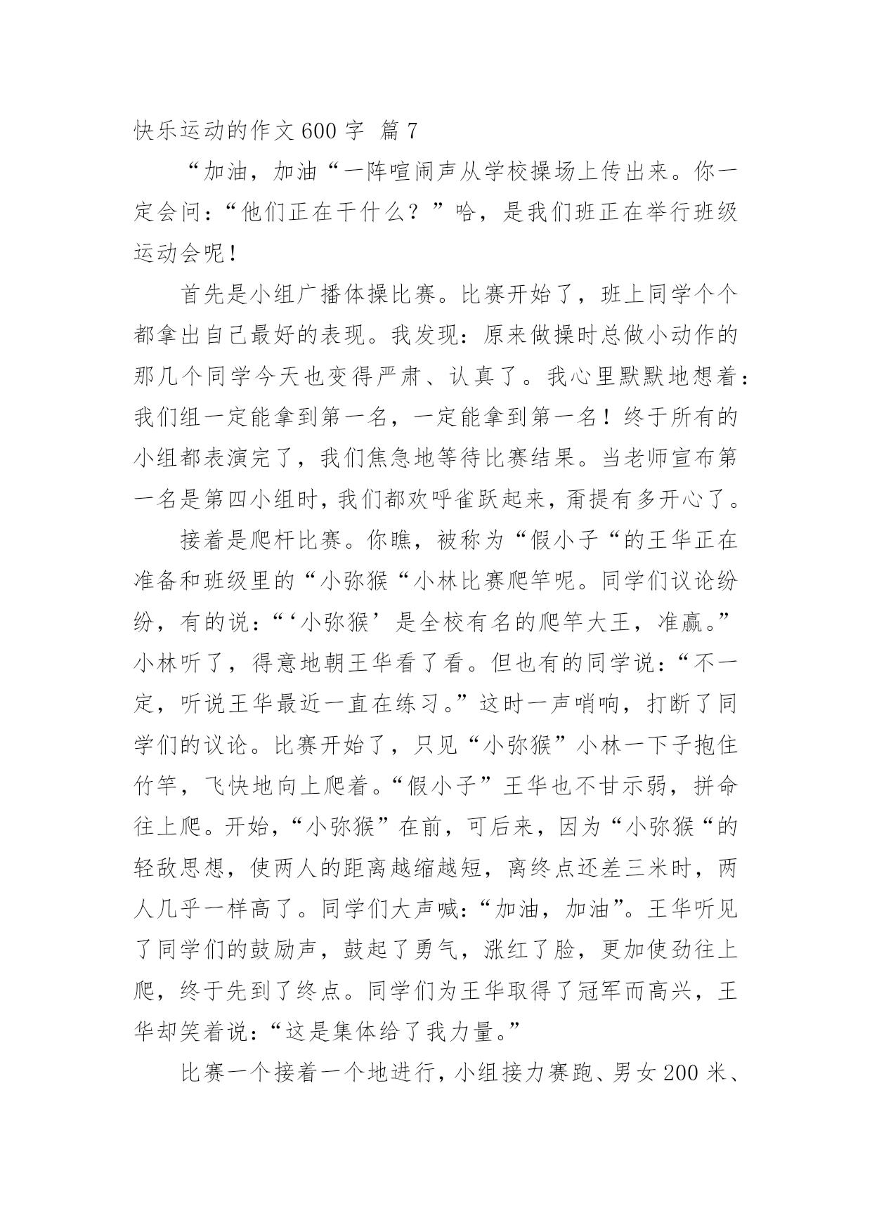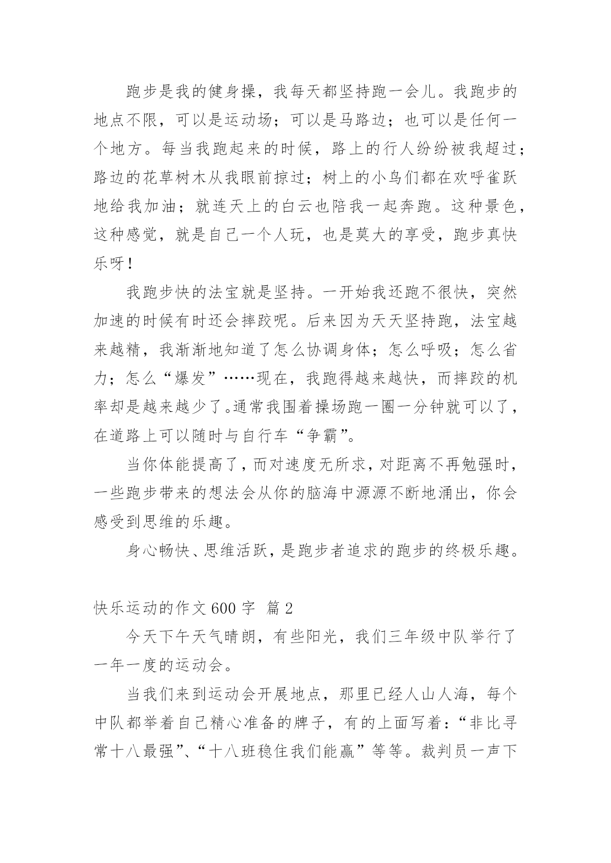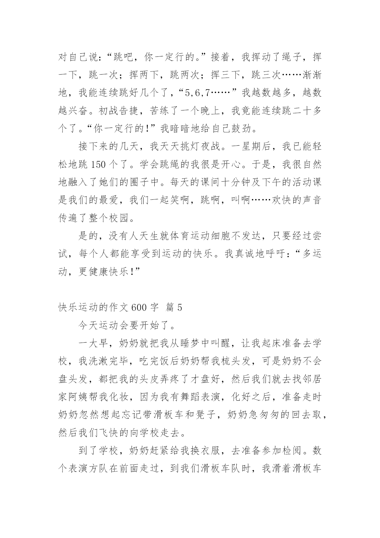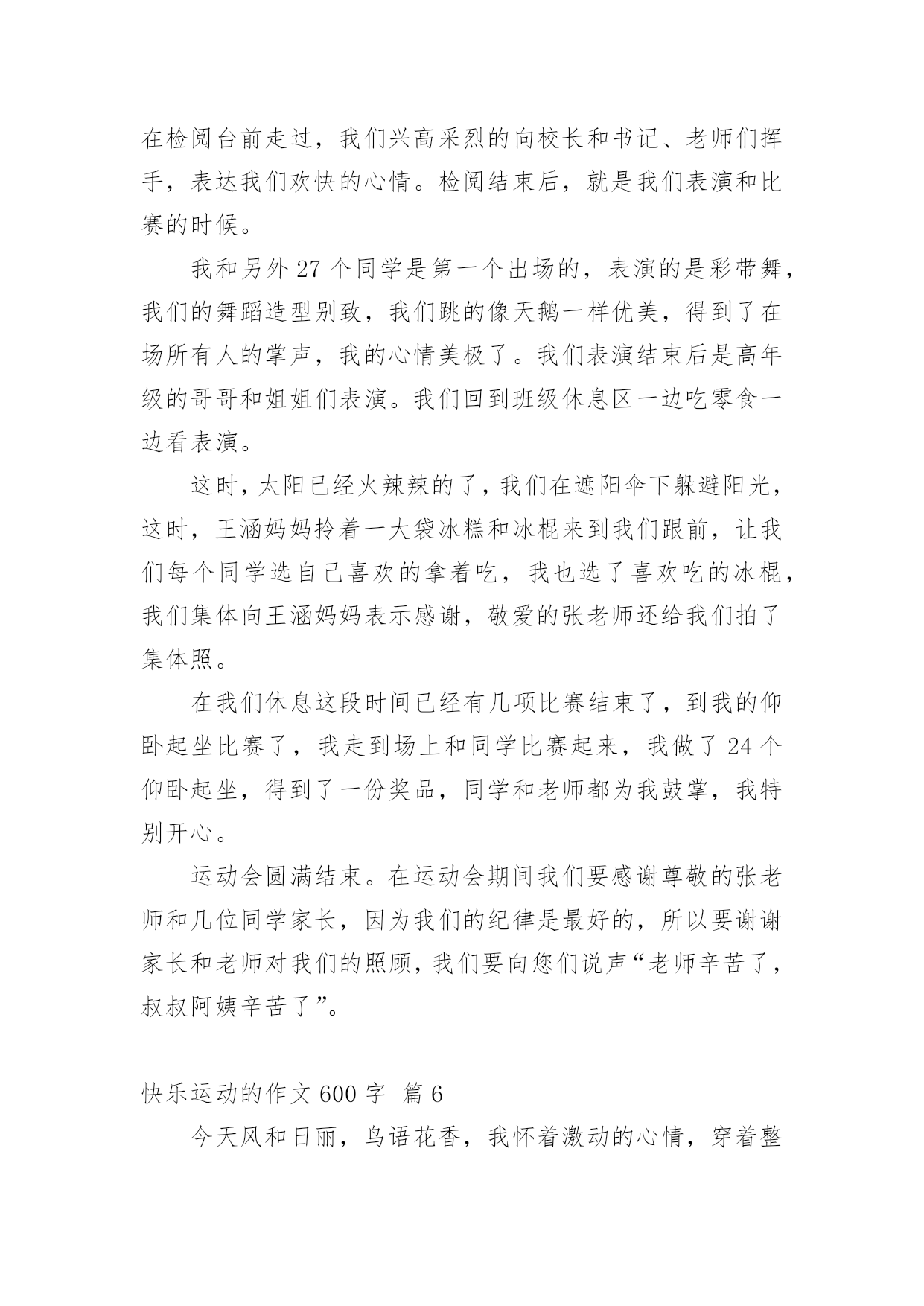 快乐运动的作文600字关于快乐运动的作文600字(通用30篇)在现实生活或工作学习中,大家总免不了要接触或使用作文吧,通过作文可以把我们那些零零散散的思想,聚集在一块。怎么写作文才能避免踩雷呢?下面是小编为大家收集的快乐运动的作文600字,仅供参考,大家一起来看看吧。快乐运动的作文600字篇1跑步者与非跑步者最大的区别,就是能否在跑步中感受到乐趣。跑步者觉得有无限的乐趣让他留在运动场或公路上。跑步的乐趣很多,就看你是否沉入其中。跑步的乐趣对于有些人,也许他不屑一顾,但有些乐趣来自生活之源。如果忽视它,只能说你对生活太麻木了。多数人对跑步敬而远之,是因为跑步不但单调乏味,而且还要承受身体的痛苦。而跑步者并不这么认为,正是从身体承受到的痛苦中,跑步者感受到了跑步的乐趣。跑步乐趣很多,只要你有足够的细心,就可以在跑步中找到乐趣。跑步的乐趣也需要培养。跑步者就是在长期的跑步锻炼中培养了跑步的乐趣,所以才对在旁人看来索然无味的跑步兴趣盎然,乐在其中。我最开使跑的时后经常是跑一阵歇一阵,后来我慢慢适应,最后爱上了跑步。跑步是我的健身操,我每天都坚持跑一会儿。我跑步的地点不限,可以是运动场;可以是马路边;也可以是任何一个地方。每当我跑起来的时候,路上的行人纷纷被我超过;路边的花草树木从我眼前掠过;树上的小鸟们都在欢呼雀跃地给我加油;就连天上的白云也陪我一起奔跑。这种景色,这种感觉,就是自己一个人玩,也是莫大的享受,跑步真快乐呀!我跑步快的法宝就是坚持。一开始我还跑不很快,突然加速的时候有时还会摔跤呢。后来因为天天坚持跑,法宝越来越精,我渐渐地知道了怎么协调身体;怎么呼吸;怎么省力;怎么“爆发”……现在,我跑得越来越快,而摔跤的机率却是越来越少了。通常我围着操场跑一圈一分钟就可以了,在道路上可以随时与自行车“争霸”。当你体能提高了,而对速度无所求,对距离不再勉强时,一些跑步带来的想法会从你的脑海中源源不断地涌出,你会感受到思维的乐趣。身心畅快、思维活跃,是跑步者追求的跑步的终极乐趣。快乐运动的作文600字篇2今天下午天气晴朗,有些阳光,我们三年级中队举行了一年一度的运动会。当我们来到运动会开展地点,那里已经人山人海,每个中队都举着自己精心准备的牌子,有的上面写着:“非比寻常十八最强”、“十八班稳住我们能赢”等等。裁判员一声下令拉开序幕,一开始进行的是个人赛,比赛项目有:绕杆运动、仰卧起坐,比赛热火朝天地进行着,场上气势十分激烈,场下的啦啦队卖力地叫喊着:“加油、加油”,给场上的运动员打气。操场上运动声、呐喊声交织在一起,彷佛在演奏着一曲交响乐。个人项目在这欢快的声音中结束了。接下来进行的是团体赛,比赛项目包括:长跳绳、接力赛,我参加的是长跳绳比赛,很快就要轮到我上场了,我的心情显得有点紧张,“砰、砰、砰”直跳,我的小心脏好像要跑出来了。我做了下深呼吸,平复下自己紧张的情绪,然后马上全神的投入到比赛中。裁判员的哨声吹响了,比赛正式开始,前面的同学一个接着一个快速的跳过了快速转动的绳子,终于轮到我了,我尝试了一次、二次都没有成功,我稍微调整了下自己的心态,我看了看场上一起合作的同学以及场下为我加油的老师和同学,他们都给我投来了鼓励的眼神和加油鼓劲声,这彷佛给我注入了无穷的力量,一鼓作气,终于在第三次成功跳过了绳子。经过紧张激烈的比拼,我们318中队在大家的共同合作努力下,拿下了运动会的第1名,当得知这个消息的时候大家都高兴得跳了起来。这场运动会为我们紧张激烈得学业提供了很好得放松机会,同时也增强了我们的体质,提高了我们的运动能力,培养了大家的团结精神。这是一次多么难忘的运动会啊!它给我留下了深刻的印象,也带给我无限的快乐!快乐运动的作文600字篇3从小,我就很爱运动。每次周末,都爱和爸爸一起在广场上打羽毛球,虽然每次都打得汗流浃背,可我很是快乐,可能每个小孩的天性就是爱和大人玩,特别是父母。在我11岁时,父亲为我买了辆自行车作为礼物。于是,我又迷上了骑自行车,每次放学,我都要独自在广场上骑车,可能父亲不放心我一个人骑,他便也买了一辆。周末,父亲领我去郊外,我总是吃力地骑着车,尾随父亲。一天下来,脚非常地痛,但我并没有叫苦,反而越来越喜欢。我认为一切运动都有很大魔力,他吸引着我,可以带给我无尽快乐。上了初中,接触到的运动也越来越多,可我却喜欢上了长跑,也许是由于每天晚上班主任老师领我们长跑的原因吧。虽然每次跑步都感觉累得不行了,感觉心脏跳动得十分剧烈,以至于停止,也感觉周围的一切都成了浮云,可我依然正视前方在,一切的思想都消失了,眼中只有那一条遥远而孤单的终点线,脚步沉重地踏在操场上,我的全身也随之震动。终于,我跨过了终点线,瞬间感觉全身无力地瘫在操场上,嘴巴大口大口地呼吸着空气。我终于听到了心跳声,回头看看终点线,再看看自己跑过的操场,嘴角不