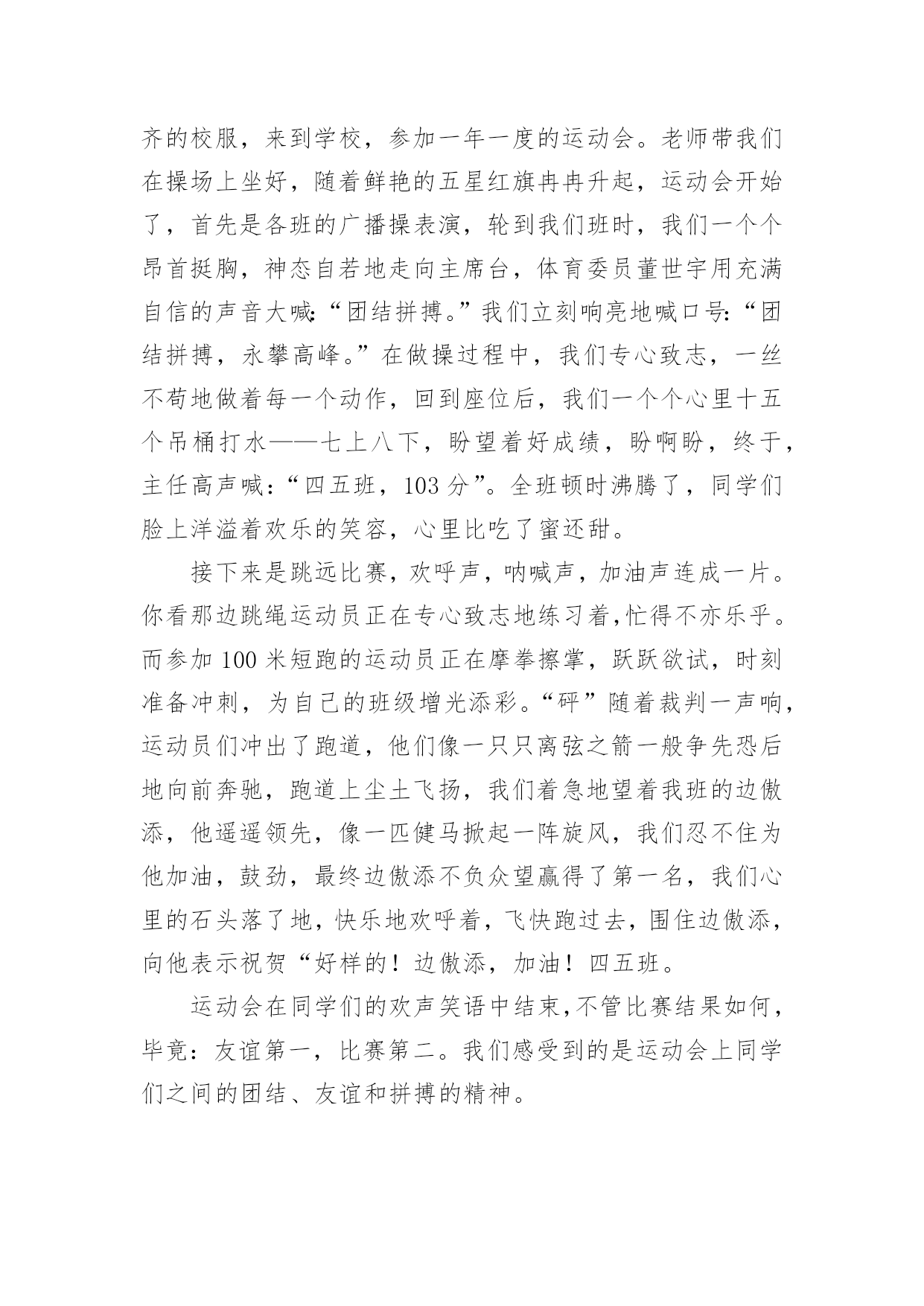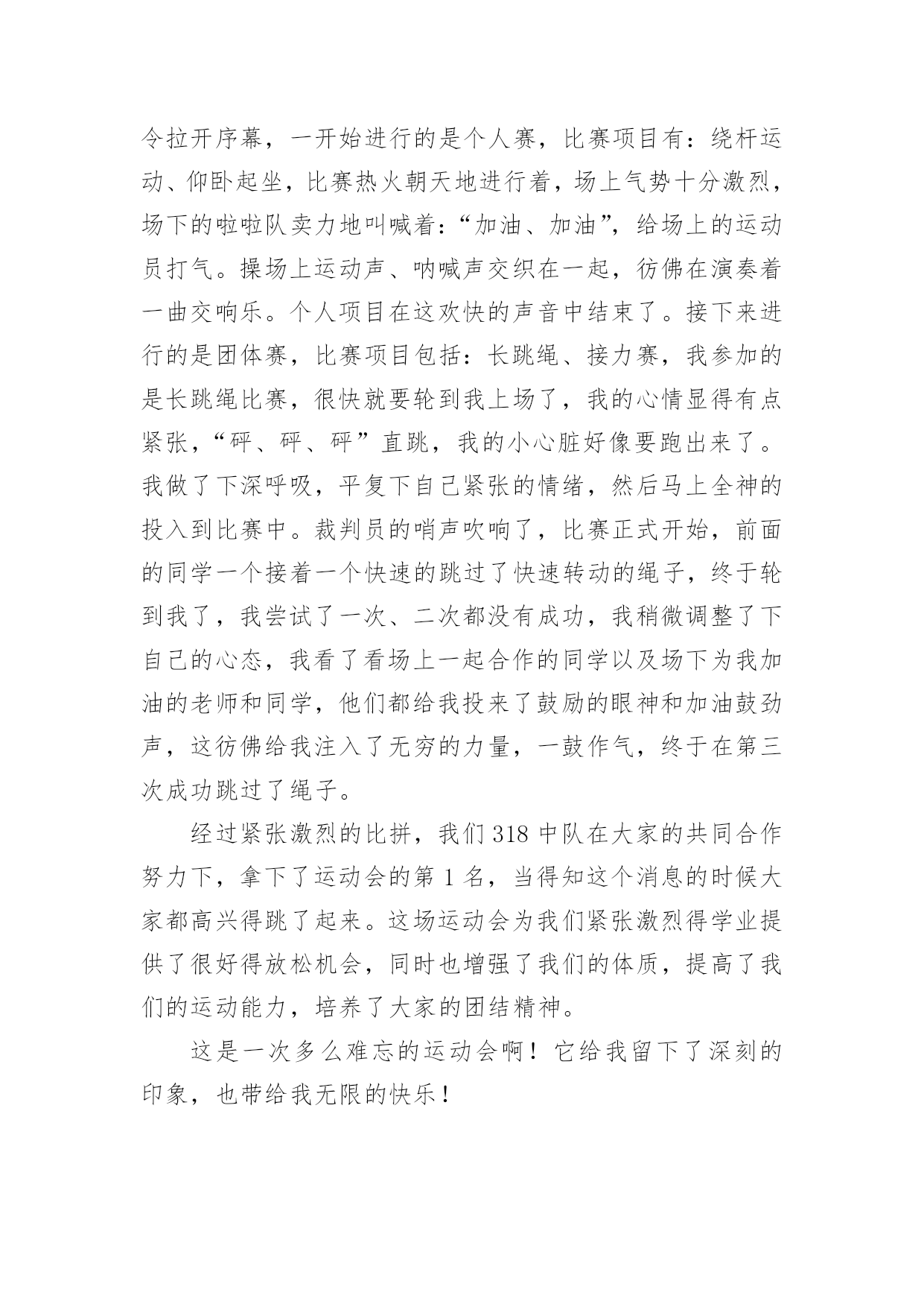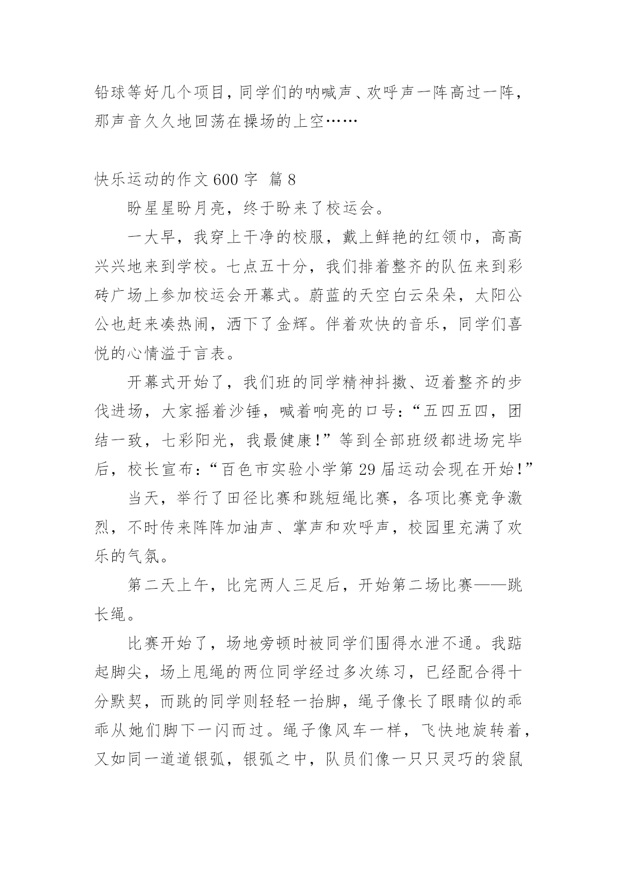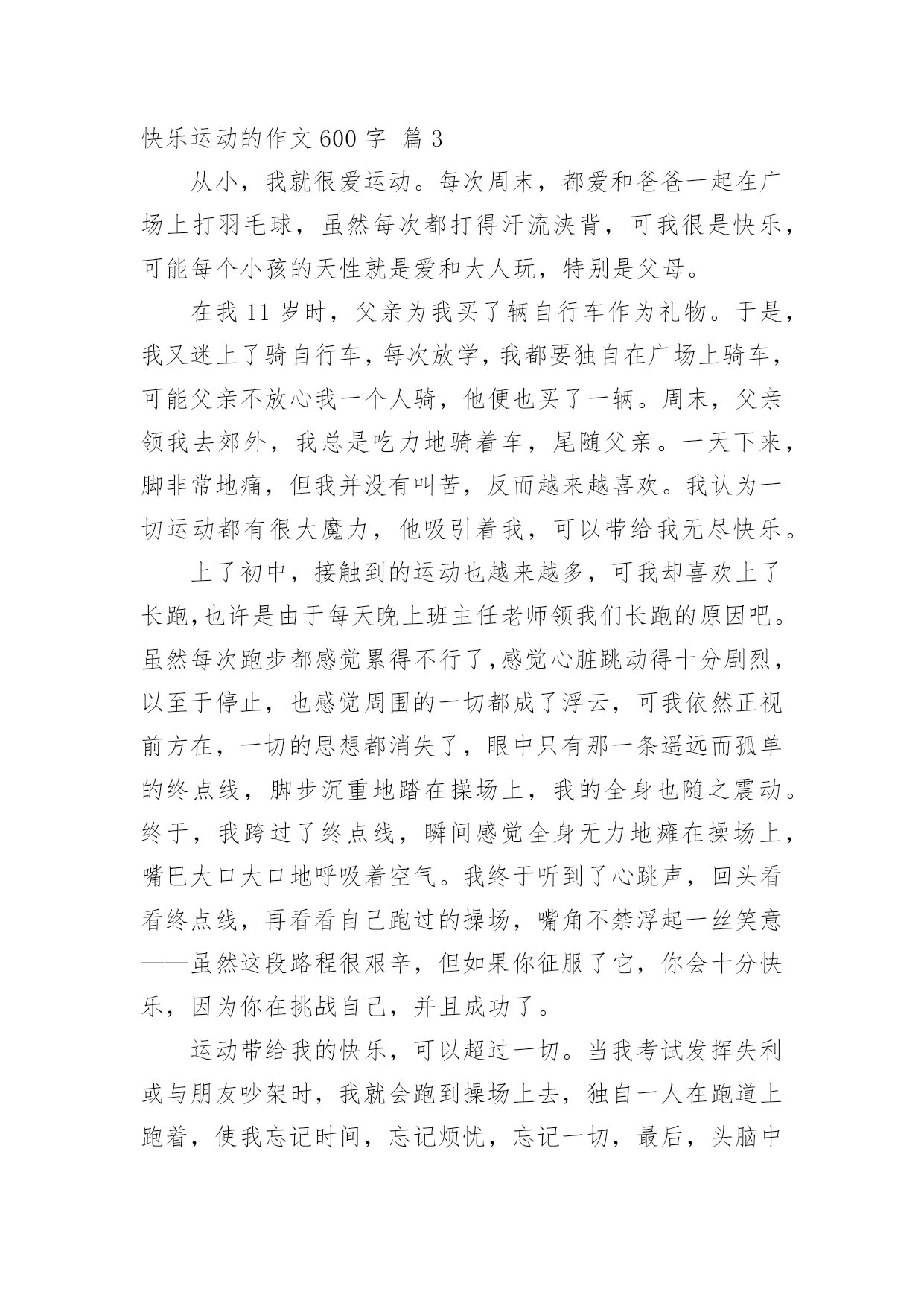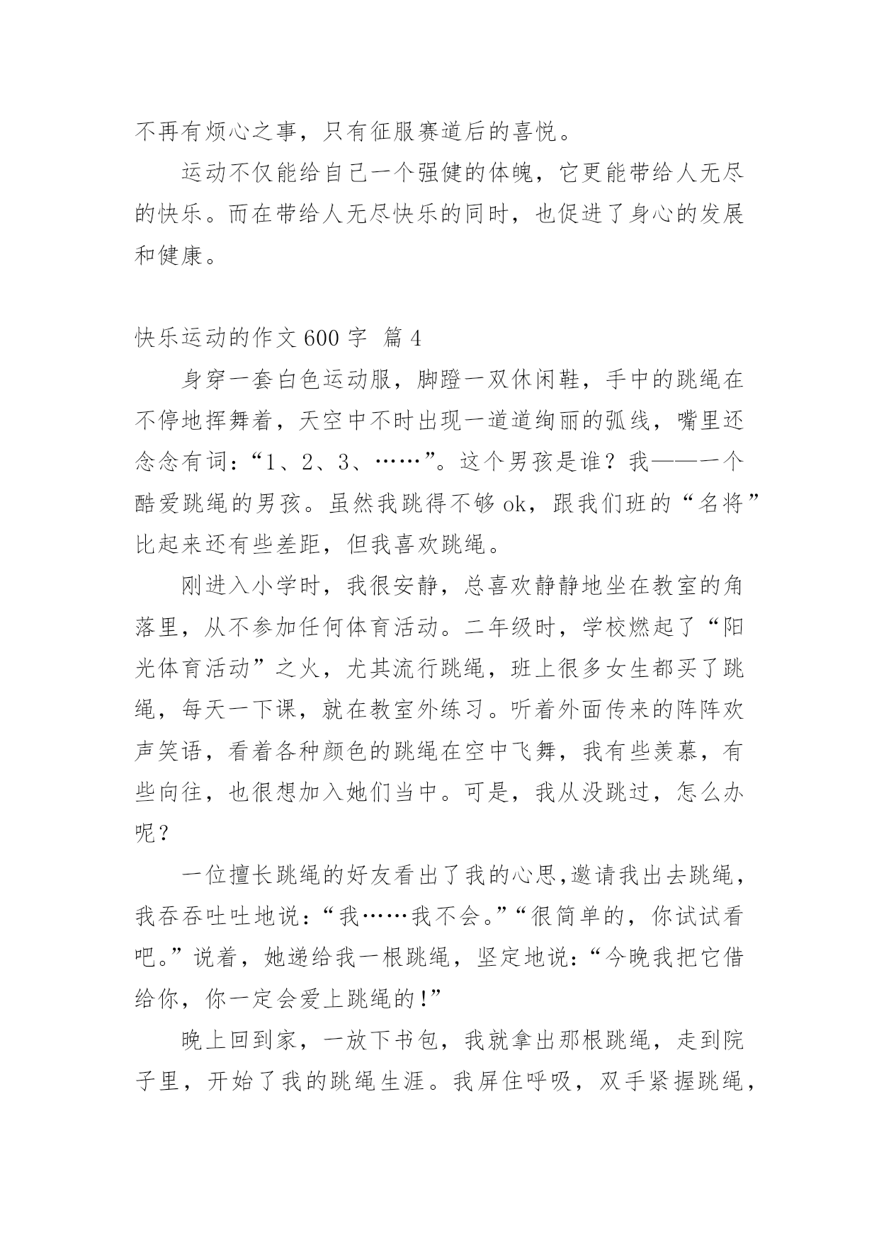 快乐运动的作文600字关于快乐运动的作文600字(通用30篇)在现实生活或工作学习中,大家总免不了要接触或使用作文吧,通过作文可以把我们那些零零散散的思想,聚集在一块。怎么写作文才能避免踩雷呢?下面是小编为大家收集的快乐运动的作文600字,仅供参考,大家一起来看看吧。快乐运动的作文600字篇1跑步者与非跑步者最大的区别,就是能否在跑步中感受到乐趣。跑步者觉得有无限的乐趣让他留在运动场或公路上。跑步的乐趣很多,就看你是否沉入其中。跑步的乐趣对于有些人,也许他不屑一顾,但有些乐趣来自生活之源。如果忽视它,只能说你对生活太麻木了。多数人对跑步敬而远之,是因为跑步不但单调乏味,而且还要承受身体的痛苦。而跑步者并不这么认为,正是从身体承受到的痛苦中,跑步者感受到了跑步的乐趣。跑步乐趣很多,只要你有足够的细心,就可以在跑步中找到乐趣。跑步的乐趣也需要培养。跑步者就是在长期的跑步锻炼中培养了跑步的乐趣,所以才对在旁人看来索然无味的跑步兴趣盎然,乐在其中。我最开使跑的时后经常是跑一阵歇一阵,后来我慢慢适应,最后爱上了跑步。跑步是我的健身操,我每天都坚持跑一会儿。我跑步的地点不限,可以是运动场;可以是马路边;也可以是任何一个地方。每当我跑起来的时候,路上的行人纷纷被我超过;路边的花草树木从我眼前掠过;树上的小鸟们都在欢呼雀跃地给我加油;就连天上的白云也陪我一起奔跑。这种景色,这种感觉,就是自己一个人玩,也是莫大的享受,跑步真快乐呀!我跑步快的法宝就是坚持。一开始我还跑不很快,突然加速的时候有时还会摔跤呢。后来因为天天坚持跑,法宝越来越精,我渐渐地知道了怎么协调身体;怎么呼吸;怎么省力;怎么“爆发”……现在,我跑得越来越快,而摔跤的机率却是越来越少了。通常我围着操场跑一圈一分钟就可以了,在道路上可以随时与自行车“争霸”。当你体能提高了,而对速度无所求,对距离不再勉强时,一些跑步带来的想法会从你的脑海中源源不断地涌出,你会感受到思维的乐趣。身心畅快、思维活跃,是跑步者追求的跑步的终极乐趣。快乐运动的作文600字篇2今天下午天气晴朗,有些阳光,我们三年级中队举行了一年一度的运动会。当我们来到运动会开展地点,那里已经人山人海,每个中队都举着自己精心准备的牌子,有的上面写着:“非比寻常十八最强”、“十八班稳住我们能赢”等等。裁判员一声下令拉开序幕,一开始进行的是个人赛,比赛项目有:绕杆运动、仰卧起坐,比赛热火朝天地进行着,场上气势十分激烈,场下的啦啦队卖力地叫喊着:“加油、加油”,给场上的运动员打气。操场上运动声、呐喊声交织在一起,彷佛在演奏着一曲交响乐。个人项目在这欢快的声音中结束了。接下来进行的是团体赛,比赛项目包括:长跳绳、接力赛,我参加的是长跳绳比赛,很快就要轮到我上场了,我的心情显得有点紧张,“砰、砰、砰”直跳,我的小心脏好像要跑出来了。我做了下深呼吸,平复下自己紧张的情绪,然后马上全神的投入到比赛中。裁判员的哨声吹响了,比赛正式开始,前面的同学一个接着一个快速的跳过了快速转动的绳子,终于轮到我了,我尝试了一次、二次都没有成功,我稍微调整了下自己的心态,我看了看场上一起合作的同学以及场下为我加油的老师和同学,他们都给我投来了鼓励的眼神和加油鼓劲声,这彷佛给我注入了无穷的力量,一鼓作气,终于在第三次成功跳过了绳子。经过紧张激烈的比拼,我们318中队在大家的共同合作努力下,拿下了运动会的第1名,当得知这个消息的时候大家都高兴得跳了起来。这场运动会为我们紧张激烈得学业提供了很好得放松机会,同时也增强了我们的体质,提高了我们的运动能力,培养了大家的团结精神。这是一次多么难忘的运动会啊!它给我留下了深刻的印象,也带给我无限的快乐!快乐运动的作文600字篇3从小,我就很爱运动。每次周末,都爱和爸爸一起在广场上打羽毛球,虽然每次都打得汗流浃背,可我很是快乐,可能每个小孩的天性就是爱和大人玩,特别是父母。在我11岁时,父亲为我买了辆自行车作为礼物。于是,我又迷上了骑自行车,每次放学,我都要独自在广场上骑车,可能父亲不放心我一个人骑,他便也买了一辆。周末,父亲领我去郊外,我总是吃力地骑着车,尾随父亲。一天下来,脚非常地痛,但我并没有叫苦,反而越来越喜欢。我认为一切运动都有很大魔力,他吸引着我,可以带给我无尽快乐。上了初中,接触到的运动也越来越多,可我却喜欢上了长跑,也许是由于每天晚上班主任老师领我们长跑的原因吧。虽然每次跑步都感觉累得不行了,感觉心脏跳动得十分剧烈,以至于停止,也感觉周围的一切都成了浮云,可我依然正视前方在,一切的思想都消失了,眼中只有那一条遥远而孤单的终点线,脚步沉重地踏在操场上,我的全身也随之震动。终于,我跨过了终点线,瞬间感觉全身无力地瘫在操场上,嘴巴大口大口地呼吸着空气。我终于听到了心跳声,回头看看终点线,再看看自己跑过的操场,嘴角不