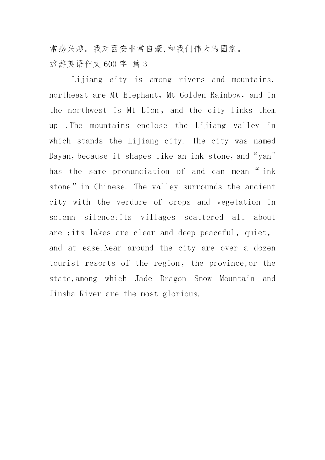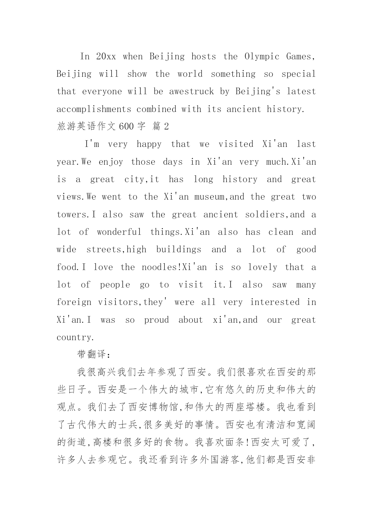 旅游英语作文600字【热门】旅游英语作文600字三篇在日复一日的学习、工作或生活中,大家都经常接触到作文吧,作文是由文字组成,经过人的思想考虑,通过语言组织来表达一个主题意义的'文体。作文的注意事项有许多,你确定会写吗?下面是小编帮大家整理的旅游英语作文600字3篇,欢迎阅读,希望大家能够喜欢。旅游英语作文600字篇1AsthecapitalofthePeople'sRepublicofChina,Beijingisthenation'spolitical,economic,culturalandeducationalcenteraswellasbeingthemostimportantcenterinChinaforinternationaltradeandcommunications.Ithasbeentheheartandsoulofpoliticsandsocietythroughoutitslonghistory.BythetimeoftheWarringStatesPeriod(476BC-221BC),itwasservingasthecapitaloftheYanKingdom.BecauseofitsroleinthelifeandgrowthofChina,thereisanunequalledwealthavailablefortravelerstodiscoverasyouexploreBeijing'sancientpastandenjoyitsexciting21stCenturyworld.In20xxwhenBeijinghoststheOlympicGames,BeijingwillshowtheworldsomethingsospecialthateveryonewillbeawestruckbyBeijing'slatestaccomplishmentscombinedwithitsancienthistory.旅游英语作文600字篇2I'mveryhappythatwevisitedXi'anlastyear.WeenjoythosedaysinXi'anverymuch.Xi'anisagreatcity,ithaslonghistoryandgreatviews.WewenttotheXi'anmuseum,andthegreattwotowers.Ialsosawthegreatancientsoldiers,andalotofwonderfulthings.Xi'analsohascleanandwidestreets,highbuildingsandalotofgoodfood.Ilovethenoodles!Xi'anissolovelythatalotofpeoplegotovisitit.Ialsosawmanyforeignvisitors,they'wereallveryinterestedinXi'an.Iwassoproudaboutxi'an,andourgreatcountry.带翻译:我很高兴我们去年参观了西安。我们很喜欢在西安的那些日子。西安是一个伟大的城市,它有悠久的历史和伟大的观点。我们去了西安博物馆,和伟大的两座塔楼。我也看到了古代伟大的士兵,很多美好的事情。西安也有清洁和宽阔的街道,高楼和很多好的食物。我喜欢面条!西安太可爱了,许多人去参观它。我还看到许多外国游客,他们都是西安非常感兴趣。我对西安非常自豪,和我们伟大的国家。旅游英语作文600字篇3Lijiangcityisamongriversandmountains.northeastareMtElephant,MtGoldenRainbow,andinthenorthwestisMtLion,andthecitylinksthemup.ThemountainsenclosetheLijiangvalleyinwhichstandstheLijiangcity.ThecitywasnamedDayan,becauseitshapeslikeaninkstone,and“yan"hasthesamepronunciationofandcanmean“inkstone”inChinese.Thevalleysurroundstheancientcitywiththeverdureofcropsandvegetationinsolemnsilence;itsvillagesscatteredallaboutare;itslakesareclearanddeeppeaceful,quiet,andatease.Neararoundthecityareoveradozentouristresortso