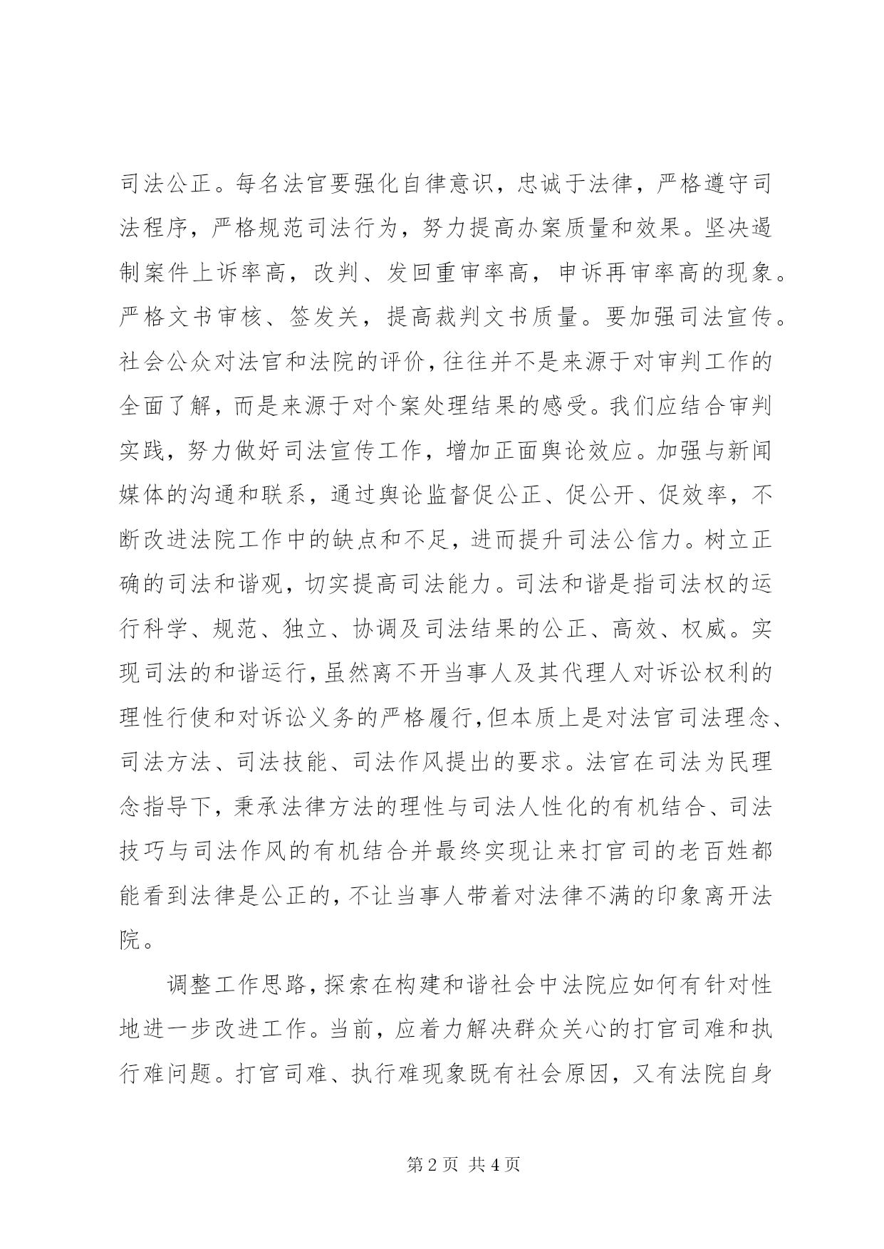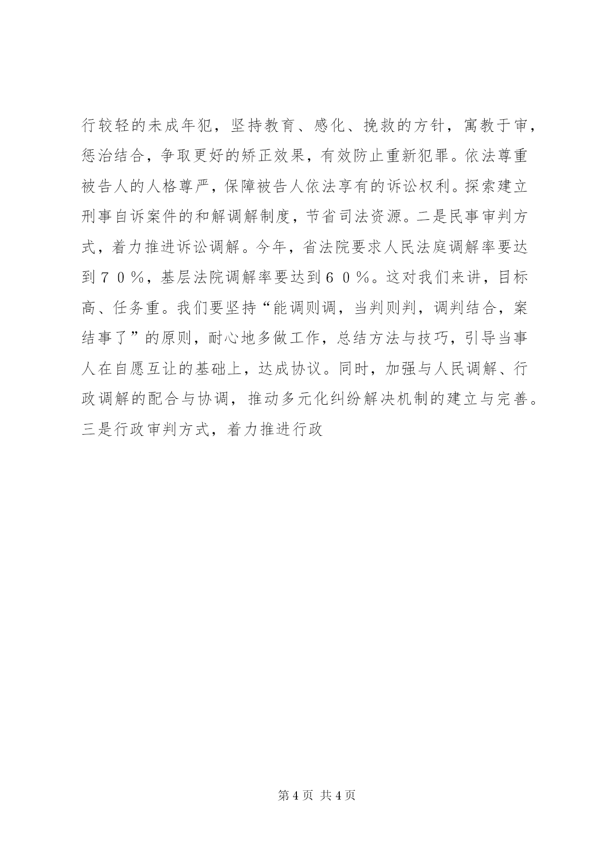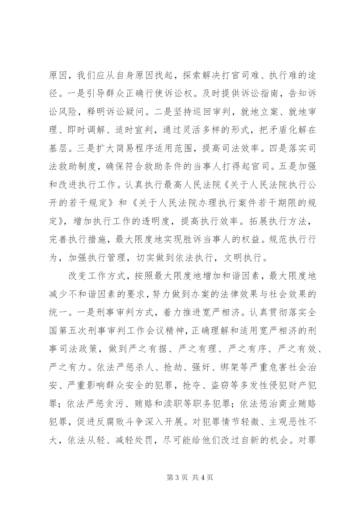 第PAGE\*Arabic\*MERGEFORMAT4页共NUMPAGES\*MERGEFORMAT4页以公正司法促和谐社会建设转变思想观念,把思想观念从维护社会稳定提升到维护社会和谐上来。树立正确的纠纷解决观,做到案结事了、定纷止争、胜败皆明。把每一件纠纷的调处,都作为促进社会和谐的一次具体实践。一是严格依法审查立案。做到当立则快立,特别是涉及群体性纠纷和敏感性纠纷,要通过合议、审判委员会讨论等形式加强把关。二是坚持依法办案。不论是判决,还是其它的纠纷解决方式,都不能违背事实、法律和原则和稀泥,甚至枉法裁判。三是坚持纠纷解决的公开性和透明度。每个案子不仅要严格遵守程序,公正审理,而且要把道理说清楚,真正做到案结事了,定纷止争,胜败皆明。树立正确的服务大局观,坚持为发展这个第一要务服务。服务大局是人民法院工作的重大政治责任。我们的每一名干警,要按照岗位职责的要求,认真履职尽责,做好每一项工作,办好每一起案件,自觉从身边工作干起,从具体的工作着手,实实在在为大局服务。同时,正确处理好服务大局与严格依法履行职责的关系、全局利益与局部利益的关系、执法的法律效果与社会效果之间的关系,正确有效地服务好大局。树立正确的群众利益观,坚持司法为民。认真执行最高人民法院关于司法为民的11项制度和23项具体措施,最大限度满足人民群众的诉求,最大限度保障人民群众的利益。树立正确的司法权威观,切实维护司法公正。每名法官要强化自律意识,忠诚于法律,严格遵守司法程序,严格规范司法行为,努力提高办案质量和效果。坚决遏制案件上诉率高,改判、发回重审率高,申诉再审率高的现象。严格文书审核、签发关,提高裁判文书质量。要加强司法宣传。社会公众对法官和法院的评价,往往并不是来源于对审判工作的全面了解,而是来源于对个案处理结果的感受。我们应结合审判实践,努力做好司法宣传工作,增加正面舆论效应。加强与新闻媒体的沟通和联系,通过舆论监督促公正、促公开、促效率,不断改进法院工作中的缺点和不足,进而提升司法公信力。树立正确的司法和谐观,切实提高司法能力。司法和谐是指司法权的运行科学、规范、独立、协调及司法结果的公正、高效、权威。实现司法的和谐运行,虽然离不开当事人及其代理人对诉讼权利的理性行使和对诉讼义务的严格履行,但本质上是对法官司法理念、司法方法、司法技能、司法作风提出的要求。法官在司法为民理念指导下,秉承法律方法的理性与司法人性化的有机结合、司法技巧与司法作风的有机结合并最终实现让来打官司的老百姓都能看到法律是公正的,不让当事人带着对法律不满的印象离开法院。调整工作思路,探索在构建和谐社会中法院应如何有针对性地进一步改进工作。当前,应着力解决群众关心的打官司难和执行难问题。打官司难、执行难现象既有社会原因,又有法院自身原因,我们应从自身原因找起,探索解决打官司难、执行难的途径。一是引导群众正确行使诉讼权。及时提供诉讼指南,告知诉讼风险,释明诉讼疑问。二是坚持巡回审判,就地立案、就地审理、即时调解、适时宣判,通过灵活多样的形式,把矛盾化解在基层。三是扩大简易程序适用范围,提高司法效率。四是落实司法救助制度,确保符合救助条件的当事人打得起官司。五是加强和改进执行工作。认真执行最高人民法院《关于人民法院执行公开的若干规定》和《关于人民法院办理执行案件若干期限的规定》,增加执行工作的透明度,提高执行效率。拓展执行方法,完善执行措施,最大限度地实现胜诉当事人的权益。规范执行行为,加强执行管理,切实做到依法执行,文明执行。改变工作方式,按照最大限度地增加和谐因素,最大限度地减少不和谐因素的要求,努力做到办案的法律效果与社会效果的统一。一是刑事审判方式,着力推进宽严相济。认真贯彻落实全国第五次刑事审判工作会议精神,正确理解和适用宽严相济的刑事司法政策,做到严之有据、严之有理、严之有序、严之有效、严之有力。依法严惩杀人、抢劫、强奸、绑架等严重危害社会治安、严重影响群众安全的犯罪,抢夺、盗窃等多发性侵犯财产犯罪;依法严惩贪污、贿赂和渎职等职务犯罪;依法惩治商业贿赂犯罪,促进反腐败斗争深入开展。对犯罪情节轻微、主观恶性不大,依法从轻、减轻处罚,尽可能给他们改过自新的机会。对罪行较轻的未成年犯,坚持教育、感化、挽救的方针,寓教于审,惩治结合,争取更好的矫正效果,有效防止重新犯罪。依法尊重被告人的人格尊严,保障被告人依法享有的诉讼权利。探索建立刑事自诉案件的和解调解制度,节省司法资源。二是民事审判方式,着力推进诉讼调解。今年,省法院要求人民法庭调解率要达到70%,基层法院调解率要达到60%。这对我们来讲,目标高、任务重。我们要坚持“能调则调,当判则判,调判结合,案结事了”的原则,耐心地多做工作,总结方法与技巧,引导当事人在自愿互让的基础上,达成协议。同时,加强与人民调