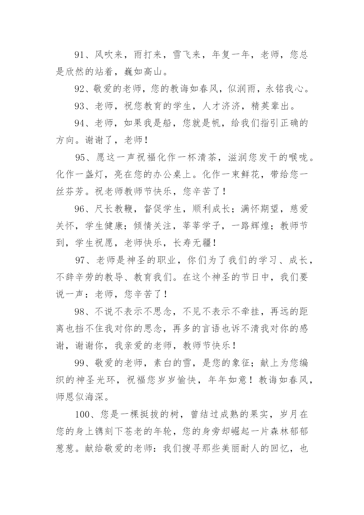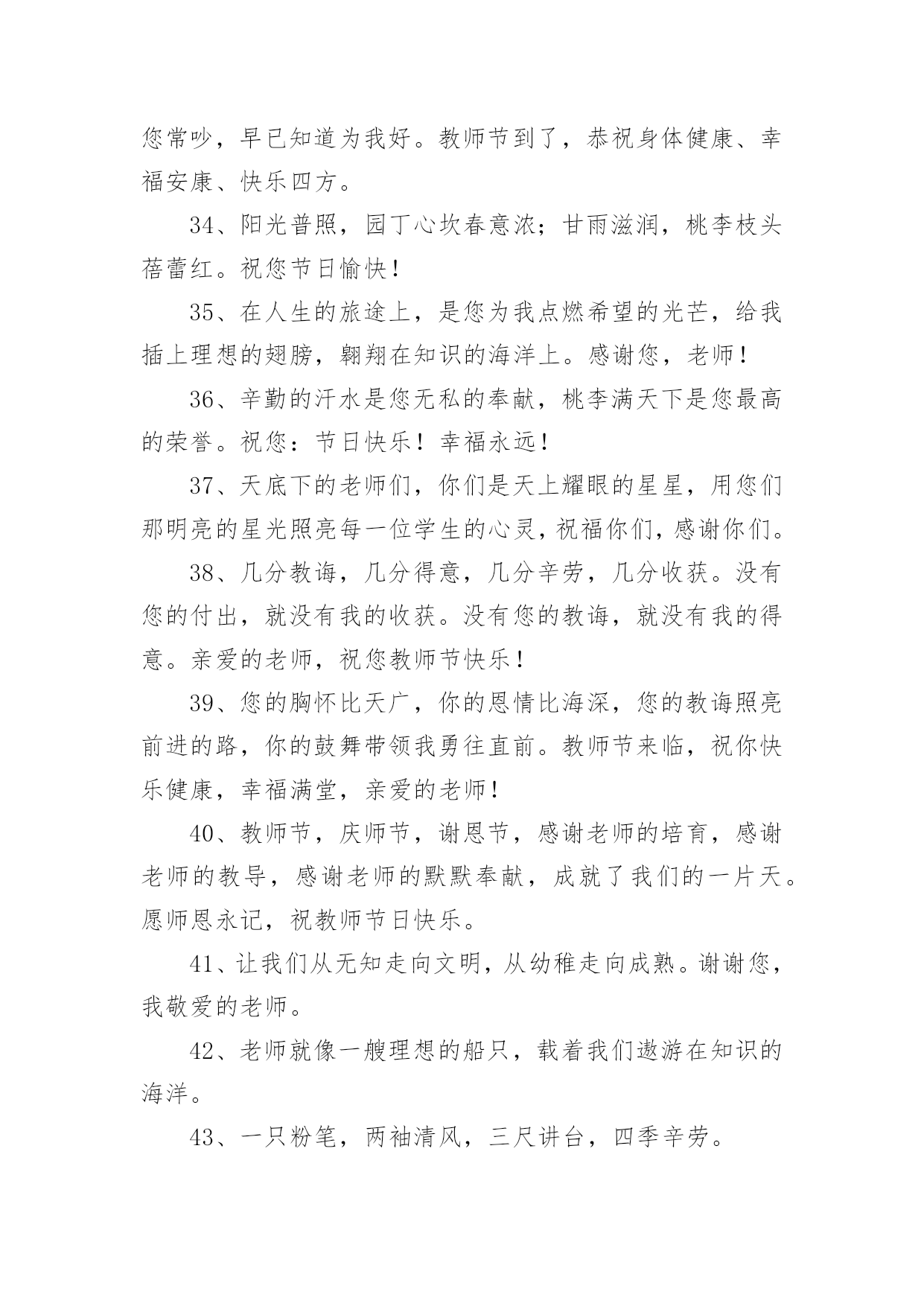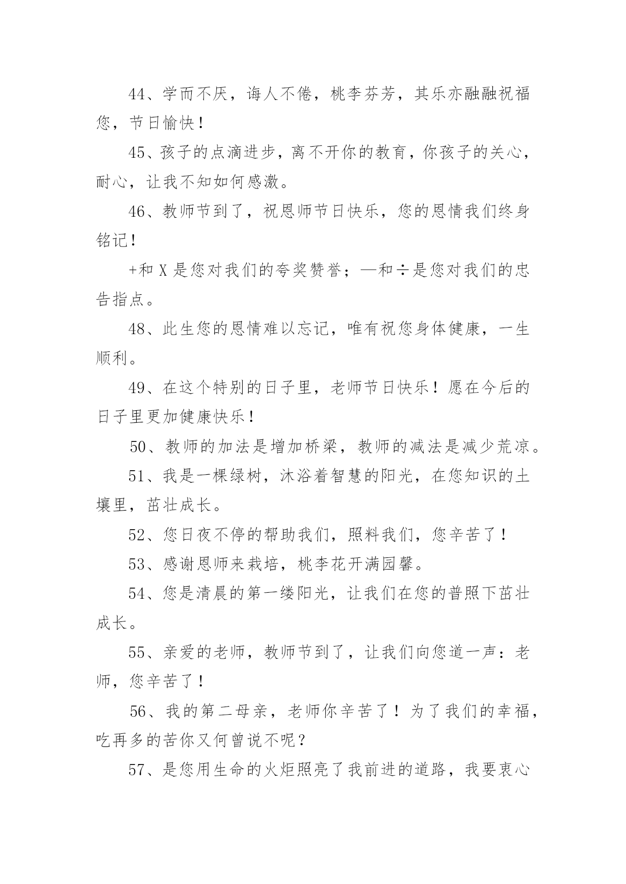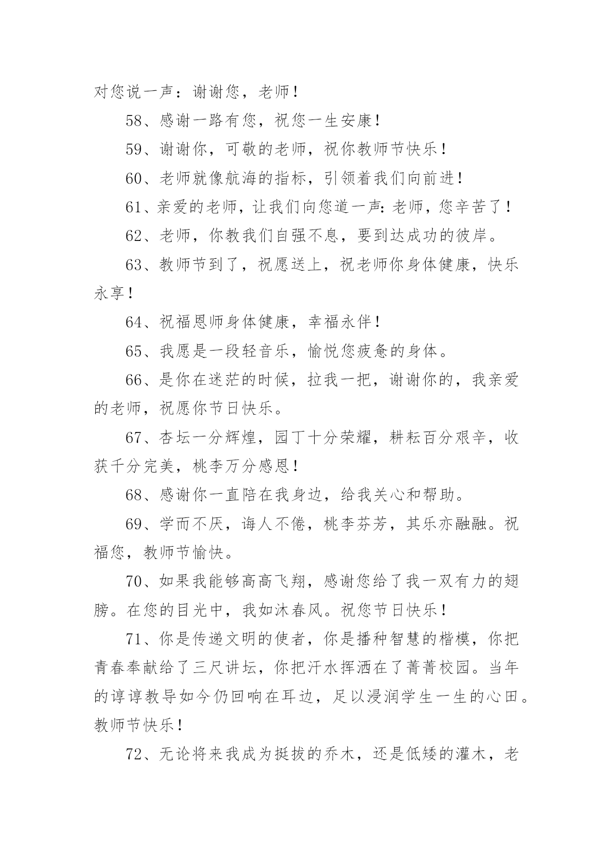 教师节不送礼物的文案教师节不送礼物的文案(精选340句)在我们平凡的日常里,大家最不陌生的就是文案了吧,文案用于分享快乐,宣泄伤感。什么样的文案才经典呢?下面是小编帮大家整理的教师节不送礼物的文案(精选340句),仅供参考,大家一起来看看吧。1、老师,您是美的耕耘者,美的播种者。是您用美的阳光普照,用美的雨露滋润,我们的心田才绿草如茵,繁花似锦!2、师恩之情深似海,在华丽的语言也描述不出对你的敬意,在动听的音乐也凑不出对你的谢意。在巍峨的高山也抵不过你无私奉献的伟大。祝:节日快乐,幸福。3、教师节即将到来,我将祝福捻成绒线,为您织成暖暖的坎肩,前身是健康,后身是平安,开心在领口,幸福在两肩,陪您度过凉秋和寒冬,温暖您天天。4、祝福是真心意,不用千言,不用万语,默默唱着心曲,祝教师节日快乐!5、桃李开了一茬又一茬,学生走了一届又一届,日历翻了一页又一页,皱纹深了一辙又一辙。亲爱的老师,教师节到了,让我们向您道一声:老师,您辛苦了!6、时间在轮转,重复着轨迹。教书育人路,永远不位移。情意清如许,浓淡总相宜。放得下名利,报酬举不起。教师节来临,学校的时光永远铭记,在此,只愿老师您的生活无限美丽!7、感谢每一位出现在我们生命中的老师,是你们成就了现在的我们!8、想您,从曾经到如今;念您,从过去到现今;我用一颗真心,抚一慰您一生的劳辛;教师节衷心祝愿老师您永远幸福安宁!9、教师节,祝福早:一祝永健康,二祝胃口秒,三祝事事顺,四祝效率高,五祝多钞票,六祝不变老,七祝全家好,八祝好运罩,九祝您久久幸福天天笑。10、老师是一盏明灯,照亮我们前行的方向;老师是一叶轻舟,载我们去幸福的彼岸。教师节,祝福亲爱的老师,节日快乐,幸福平安!11、亲爱的老师,虽然我不常去看您,可是每当想到您,我的心头都会掠过一丝温暖。祝您天天快乐!12、老师:每一缕阳光是我对您的祝福,每一颗星星是我看您的眼睛,每一丝细雨牵着我对您深深思念,想念您。13、耕耘精神的田园,播撒知识的种子。倾泻关爱的阳光,浇灌责任的清泉。孕育智慧的芬芳,助力梦想的远帆。老师,今天是你的节日,愿你健康幸福。14、老师,您好比一对伟大的翅膀,安插在我们的身上,带我们飞向天空。谢谢您!15、没有强壮臂膀,却有广博胸怀,你用你的心血,播下新蕊朵朵;没有金钱满屋,却有知识无穷,你用你的真心,给予我们鼓舞。教师节之际,愿你幸福满溢!16、一句温暖的祝福话,一句表达感谢的话,送给孩子的老师们,愿这个美好的教师节,你们能收获更多的祝福,收获更多的快乐。17、老师,我对您的了解不深,可是,我还是要说一句:谢谢,多注意身体,别为孩子们太劳累了。18、祝全天下老师身体健康,万事如意,学生学业有成,终成栋梁之才!19、老师您好!九月开学了,也应来了教师节!老师您辛苦了!老师你是我一生最难忘的人,因为有了你,让我的生活出现了乐趣,有了你我的人生出现转折,谢谢你!20、引领着我们走过那段青春的旅程,用岁月的剪刀裁出精彩片段,让驿动的心能在和风细雨中欣赏无限风光。亲爱的老师,谢谢您,祝您节日快乐。21、亲爱的老师,您智慧的思想照亮我前行路,您悉心的教导温暖我成长心,您给我力量,理想。教师节,让我祝您幸福快乐!22、教师节谨祝:快乐像同学校友越来越多,友谊像领导讲话越来越长,祝福像突击检查说到就到。教师节,别忘了给老师问候!23、一个个日子升起又降落,一届届学生走来又走过。不变的是您深沉的爱和灿烂的笑容,祝福您,亲爱的老师!24、祝福曾经给予我们智慧和知识的师长,教师节快乐。向人类一切探索的,分享的,真善美的灵魂致敬!25、老师的教育,让我从孩子的身上看到了希望,看到了孩子的未来,谢谢老师的辛勤教导!26、老师,您用您的一生教我们懂得为何要有追求,为何要有理想,为何要超越自己。老师,您把最美的笑容留给这精彩的世界,您是我们心中最美的神话。教师节到了,亲爱的老师,祝您永远幸福。27、红花离不开绿叶的扶持,鱼儿离不开溪水的相伴,花儿离不开泥土的滋润,学生离不开老师的教导。今天教师节,老师,谢谢您,您辛苦了!28、忘不了,您在三尺讲台辛勤耕耘的身影;忘不了,您在课堂上孜孜不倦的叮咛;忘不了,您在教室里神采飞扬的激情。教师节到了,祝您节日快乐!29、不管换过多少次号码,依然不会忘记联络;不管身处何地有何成就,都难忘校园的教导;亲爱的老师,最近好吗?美丽日子,学生给你问好了:教师节快乐!30、老师如海,宽容做舟,方知海之宽阔;老师如山,宽容为径,循径登山,方知山之高大,师生交心,心心相印,方知心之高尚,祝您教师节快乐!31、在一个入秋的日子,我把剑兰花的怀念,百合花的纯洁,康乃馨的温馨,满天星的喜悦,送给牵挂的你,祝你教师节拥抱美好。32、给您一条信息,传递我的真情,给您一份祝愿,表达我的心愿,恩师,今天是您的节日,祝愿你快乐安