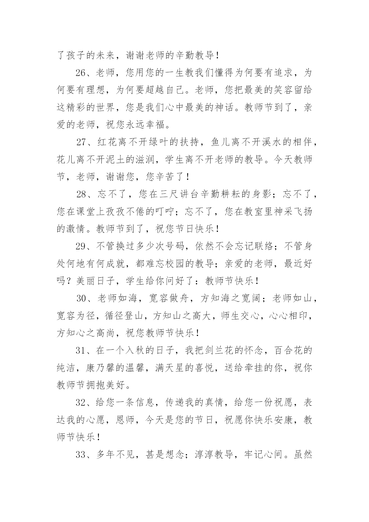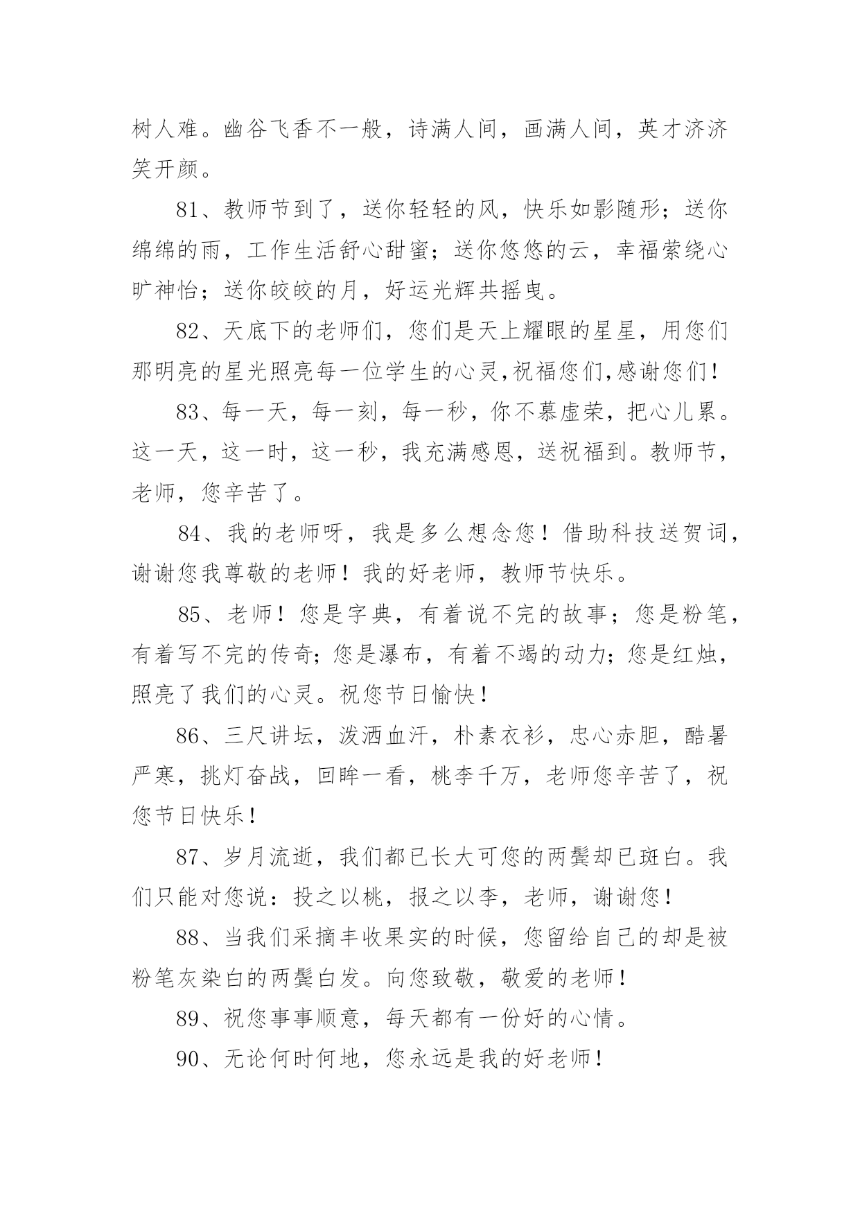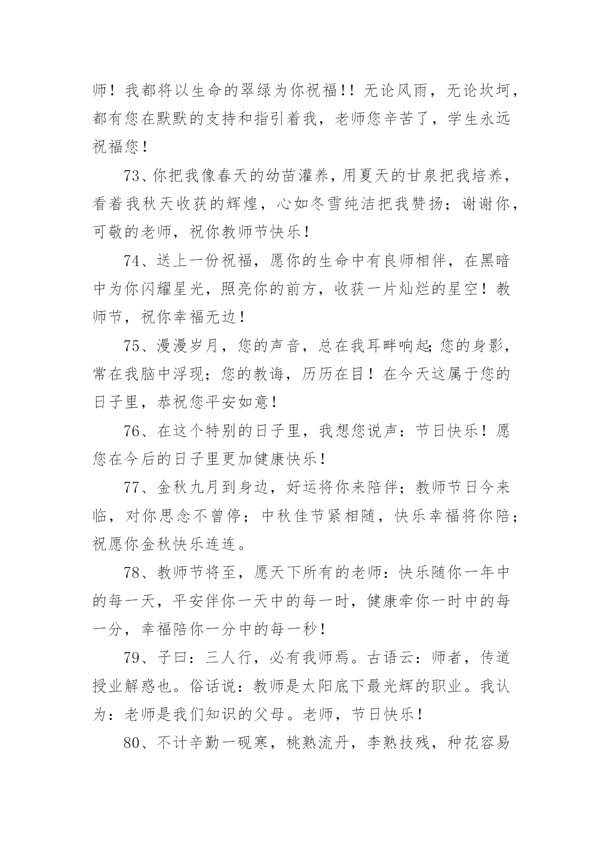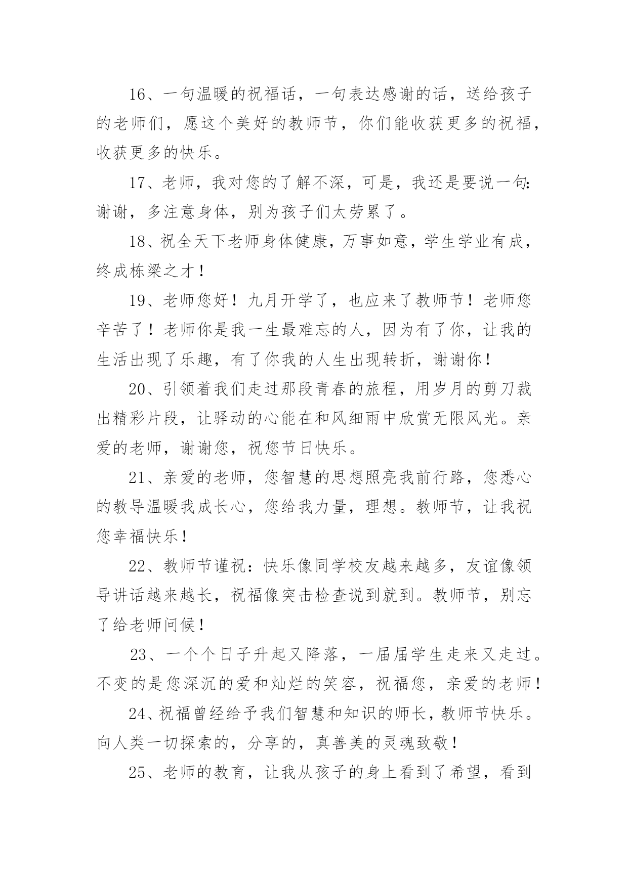 教师节不送礼物的文案教师节不送礼物的文案(精选340句)在我们平凡的日常里,大家最不陌生的就是文案了吧,文案用于分享快乐,宣泄伤感。什么样的文案才经典呢?下面是小编帮大家整理的教师节不送礼物的文案(精选340句),仅供参考,大家一起来看看吧。1、老师,您是美的耕耘者,美的播种者。是您用美的阳光普照,用美的雨露滋润,我们的心田才绿草如茵,繁花似锦!2、师恩之情深似海,在华丽的语言也描述不出对你的敬意,在动听的音乐也凑不出对你的谢意。在巍峨的高山也抵不过你无私奉献的伟大。祝:节日快乐,幸福。3、教师节即将到来,我将祝福捻成绒线,为您织成暖暖的坎肩,前身是健康,后身是平安,开心在领口,幸福在两肩,陪您度过凉秋和寒冬,温暖您天天。4、祝福是真心意,不用千言,不用万语,默默唱着心曲,祝教师节日快乐!5、桃李开了一茬又一茬,学生走了一届又一届,日历翻了一页又一页,皱纹深了一辙又一辙。亲爱的老师,教师节到了,让我们向您道一声:老师,您辛苦了!6、时间在轮转,重复着轨迹。教书育人路,永远不位移。情意清如许,浓淡总相宜。放得下名利,报酬举不起。教师节来临,学校的时光永远铭记,在此,只愿老师您的生活无限美丽!7、感谢每一位出现在我们生命中的老师,是你们成就了现在的我们!8、想您,从曾经到如今;念您,从过去到现今;我用一颗真心,抚一慰您一生的劳辛;教师节衷心祝愿老师您永远幸福安宁!9、教师节,祝福早:一祝永健康,二祝胃口秒,三祝事事顺,四祝效率高,五祝多钞票,六祝不变老,七祝全家好,八祝好运罩,九祝您久久幸福天天笑。10、老师是一盏明灯,照亮我们前行的方向;老师是一叶轻舟,载我们去幸福的彼岸。教师节,祝福亲爱的老师,节日快乐,幸福平安!11、亲爱的老师,虽然我不常去看您,可是每当想到您,我的心头都会掠过一丝温暖。祝您天天快乐!12、老师:每一缕阳光是我对您的祝福,每一颗星星是我看您的眼睛,每一丝细雨牵着我对您深深思念,想念您。13、耕耘精神的田园,播撒知识的种子。倾泻关爱的阳光,浇灌责任的清泉。孕育智慧的芬芳,助力梦想的远帆。老师,今天是你的节日,愿你健康幸福。14、老师,您好比一对伟大的翅膀,安插在我们的身上,带我们飞向天空。谢谢您!15、没有强壮臂膀,却有广博胸怀,你用你的心血,播下新蕊朵朵;没有金钱满屋,却有知识无穷,你用你的真心,给予我们鼓舞。教师节之际,愿你幸福满溢!16、一句温暖的祝福话,一句表达感谢的话,送给孩子的老师们,愿这个美好的教师节,你们能收获更多的祝福,收获更多的快乐。17、老师,我对您的了解不深,可是,我还是要说一句:谢谢,多注意身体,别为孩子们太劳累了。18、祝全天下老师身体健康,万事如意,学生学业有成,终成栋梁之才!19、老师您好!九月开学了,也应来了教师节!老师您辛苦了!老师你是我一生最难忘的人,因为有了你,让我的生活出现了乐趣,有了你我的人生出现转折,谢谢你!20、引领着我们走过那段青春的旅程,用岁月的剪刀裁出精彩片段,让驿动的心能在和风细雨中欣赏无限风光。亲爱的老师,谢谢您,祝您节日快乐。21、亲爱的老师,您智慧的思想照亮我前行路,您悉心的教导温暖我成长心,您给我力量,理想。教师节,让我祝您幸福快乐!22、教师节谨祝:快乐像同学校友越来越多,友谊像领导讲话越来越长,祝福像突击检查说到就到。教师节,别忘了给老师问候!23、一个个日子升起又降落,一届届学生走来又走过。不变的是您深沉的爱和灿烂的笑容,祝福您,亲爱的老师!24、祝福曾经给予我们智慧和知识的师长,教师节快乐。向人类一切探索的,分享的,真善美的灵魂致敬!25、老师的教育,让我从孩子的身上看到了希望,看到了孩子的未来,谢谢老师的辛勤教导!26、老师,您用您的一生教我们懂得为何要有追求,为何要有理想,为何要超越自己。老师,您把最美的笑容留给这精彩的世界,您是我们心中最美的神话。教师节到了,亲爱的老师,祝您永远幸福。27、红花离不开绿叶的扶持,鱼儿离不开溪水的相伴,花儿离不开泥土的滋润,学生离不开老师的教导。今天教师节,老师,谢谢您,您辛苦了!28、忘不了,您在三尺讲台辛勤耕耘的身影;忘不了,您在课堂上孜孜不倦的叮咛;忘不了,您在教室里神采飞扬的激情。教师节到了,祝您节日快乐!29、不管换过多少次号码,依然不会忘记联络;不管身处何地有何成就,都难忘校园的教导;亲爱的老师,最近好吗?美丽日子,学生给你问好了:教师节快乐!30、老师如海,宽容做舟,方知海之宽阔;老师如山,宽容为径,循径登山,方知山之高大,师生交心,心心相印,方知心之高尚,祝您教师节快乐!31、在一个入秋的日子,我把剑兰花的怀念,百合花的纯洁,康乃馨的温馨,满天星的喜悦,送给牵挂的你,祝你教师节拥抱美好。32、给您一条信息,传递我的真情,给您一份祝愿,表达我的心愿,恩师,今天是您的节日,祝愿你快乐安