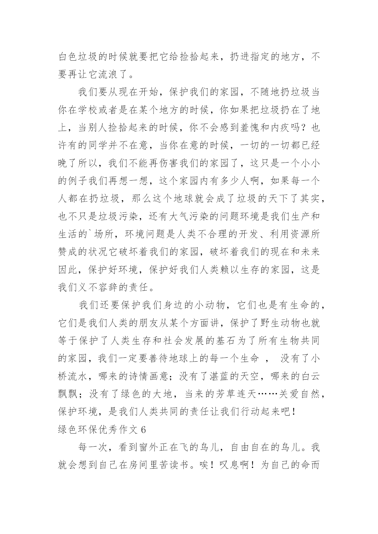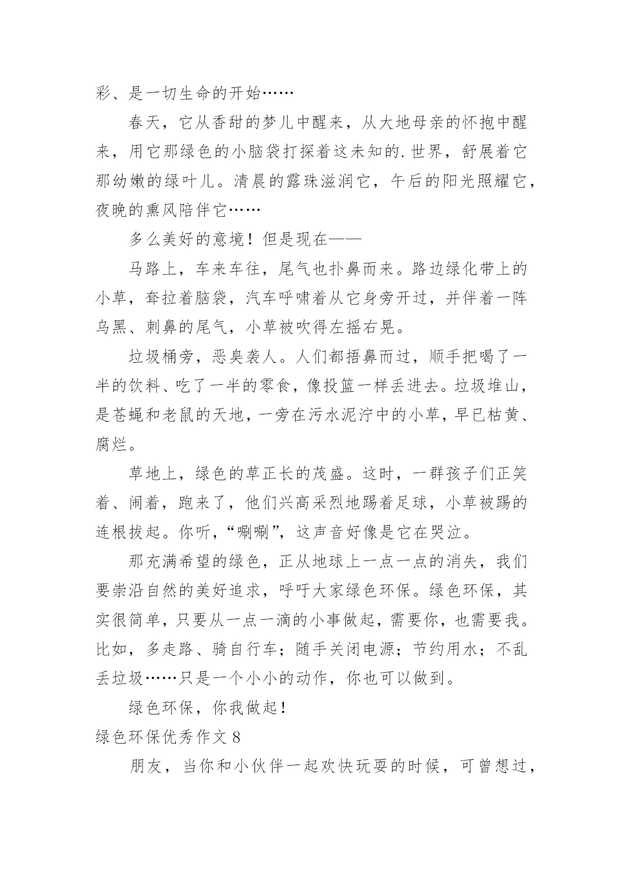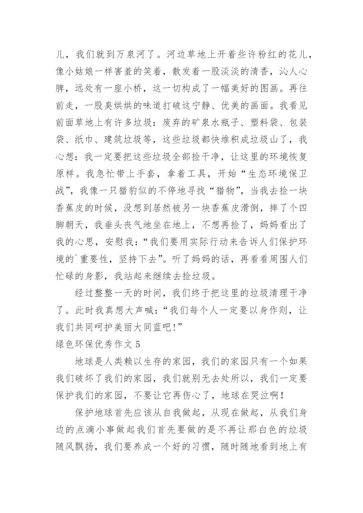 绿色环保优秀作文绿色环保优秀作文在我们平凡的日常里,大家都不可避免地要接触到作文吧,作文是通过文字来表达一个主题意义的记叙方法。还是对作文一筹莫展吗?以下是小编为大家收集的绿色环保优秀作文,欢迎大家分享。绿色环保优秀作文1我以前住的小区前面有一条清澈见底的小河,小河的一旁有很多美丽的小花和翠绿的小草还有那高大挺直的大树,最好的是还有那特别清晰的空气,我们家的那座楼就在最前面我们向外望去及叫人惊叹,又叫人舒服,看上去就和一幅美丽的自然风景画似的。过了很长很长的时间我们搬家了,我们离开了那美丽的.地方,来到了离那很远很远的地方。我们来到的地方也很美但远远不如我以前的那家。不久我们的生活也越来越好,交通也已经很发达了,家家户户都有了汽车,人人都有了汽车并不一定是一件好事,比如汽车的尾气,它是由一氧化碳、碳氢化合物、氮氧化合物、二氧化硫、烟尘微粒(某些重金属化合物、铅化合物、黑烟及油雾)、臭气(甲醛等)。她能导致与血红蛋白相结合,形成碳氧血红蛋白,降低血液的载氧能力,削弱血液对人体组织的供氧量,导致组织缺氧,从而引起头痛等症状,重者窒息死亡。所以我们应该少开车多坐共公汽车。有一次,我路过那条我以前住的那个地方,我一看变化真是太大了小草基本都快没了,小花就甭提了,树也快砍光了,清澈见底的小河已经成了臭气熏天的小河,路过的人有时会捂住鼻子,以前的东西全没了。我看到这一幕以后我对爸爸说我一定要绿色环保,我长大了还要告诉人们绿色环保我先行!绿色环保优秀作文2我们在玩儿的时候,经常爬树、摘花……,都没有意识到这是不对的行为。星期五,教师叫我们当一次环保小卫士,目的是让我们懂得保护花草树木,任务是给校园的树木挂上提示牌,浇水并除杂草。我们一组为一队,我和兰昊天、悦悦等六人一组,我们的目标是操场旁边的五棵柳树,我的任务是除杂草和浇水。上午第四节课,老师说:绿色环保行动开始啦!同学们一窝蜂地冲出教室,浇水的浇水,挂牌子的挂牌子,我们干的热火朝天。我急忙提着满满一桶水往操场跑去,我给每棵树浇上一点水,对小树说:“你们每人先少喝一点水吧,”小树们很快就喝完了,这时郑老师走过来说先对着一棵树浇,然后再浇别的。我按老师的提示,先浇好一棵树,再浇其他的,我来来回回跑了十几次,可把我累坏了。兰昊天在校长的`帮助下挂提示牌。拨草时,我左手抓住一把,右手抓住一把,使劲一拽,杂草连根拔起了,就这杂草很快就被我们一扫而光,我一看我的手,变成绿色的了。我看着喝饱了水的小树,看着一个个标识牌:“伤害树木就是伤害我们”、“保护花草人人有责,”我觉得我们做了一件很有意义的事情,小树摇摆着枝条,好像在对我说:“谢谢你们,环保小卫士。”我一下子觉得不累了。我们人人要做到保护花草树木,不去破坏它,共同创造美好家园。绿色环保优秀作文3我是从姨妈送我一个她手工做的布包开始我的低碳生活的,我记得非常清楚,因为那个布包非常好看,好看到我认为我必须得过上和姨妈一样的低碳生活,才配得上它的好看。我的姨妈,是低碳生活的代表。在举国上下刚提出低碳生活的时候,我们围在电视机前感叹,这低碳生活不就是姨妈过得生活吗?原来姨妈从多年前就已经有了低碳的意识,并且已经在低碳生活里过了那么多年了。过去我们还总怪姨妈太节省,生活的过于“拮据”,没想到当这个概念推出来时,我们才懂得姨妈那根本不是“拮据”,而是自有她的打算的一种低碳生活。姨妈家的很多东西都非常好看,最要命的是她那些好看的东西还都不是市场上买来的,而是她把过去那些不准备再穿的衣服或者过去那些不准备再用的东西拆了,改出来的。姨妈那一双巧手,好像所有的东西到了她的手里都能够变废为宝,没有不可能,只有她愿不愿意。姨妈送我那个手工布包,当然不是像电视里提倡的过低碳生活,仅仅是因为她觉得好看,又觉得那样的布包只适合我这样的高中生背着,于是就送给了我。现在看来,姨妈才是那个不赶时髦,让时髦追着她跑的那个人。她自己还没有这方面的知觉,只是凭着她的本能在那里过日子,把东西都充分利用好,秉着不浪费的心态把日子过好过舒服。像姨妈这样让时髦追着她跑的.人,也难怪她会对我们过去所有人对她的“指点”不管不顾,要是那么容易被我们这些爱面子的人所左右,她也就不会是低碳生活追着跑的那个最初的低碳者了。看着姨妈送我的布包,那么好看的布包,我也有了要成为低碳者的打算,我希望我以后也能够过上如姨妈那样的低碳生活,不浪费生活中的一寸一尺,认真对待生活。绿色环保优秀作文4马克思说:“人创造环境,同样环境也能创造人。”这句话告诉我们环境对人类的影响,以及保护环境的重要。为了提高我的环保意识,妈妈经常带我参加环保公益活动。20xx年5月4日,我参加了大同市生态环境环保协会组织的“关爱母亲河,万泉河河道”清理大型公益环保实践活动。我们把环保袋和手套放在车厢里,然后急忙坐上大巴车,去往万泉河。沿途的