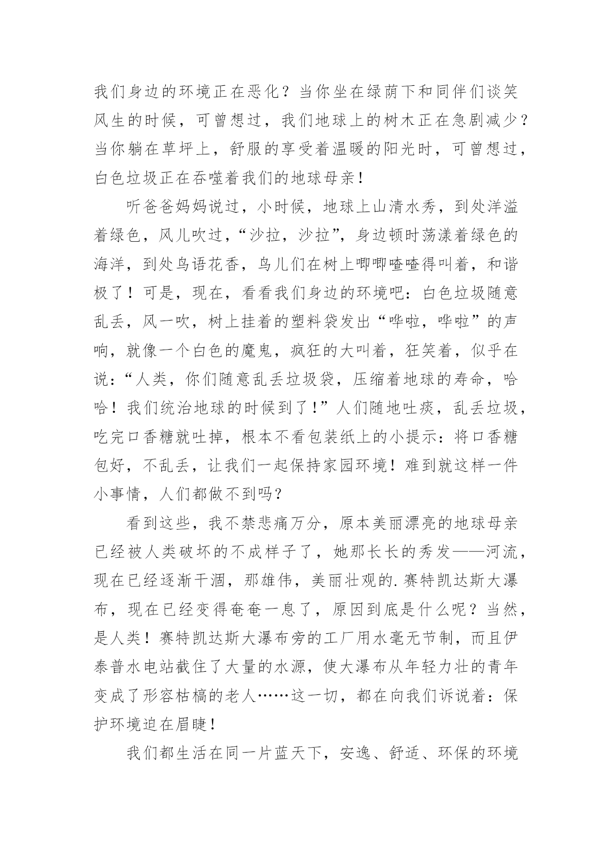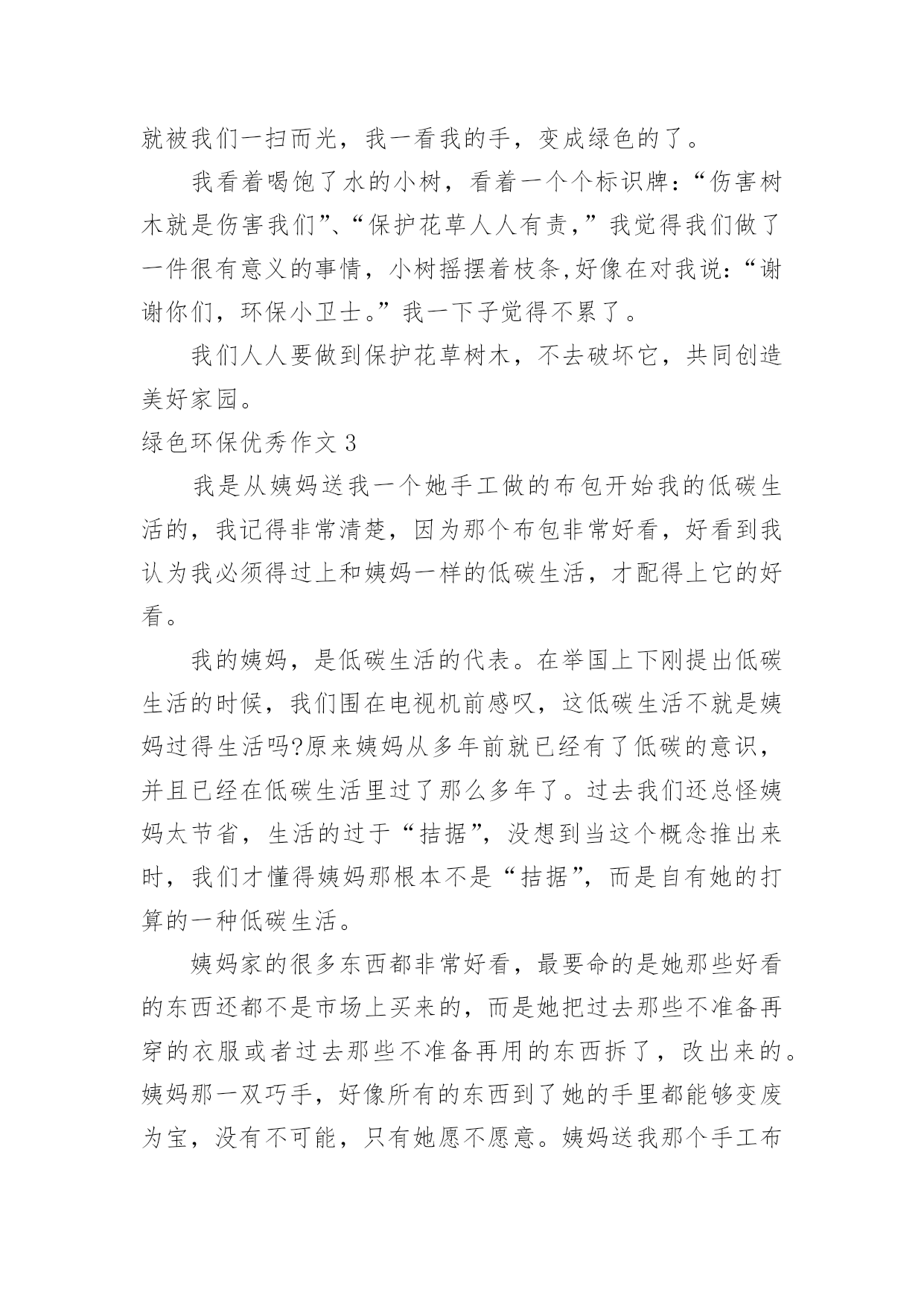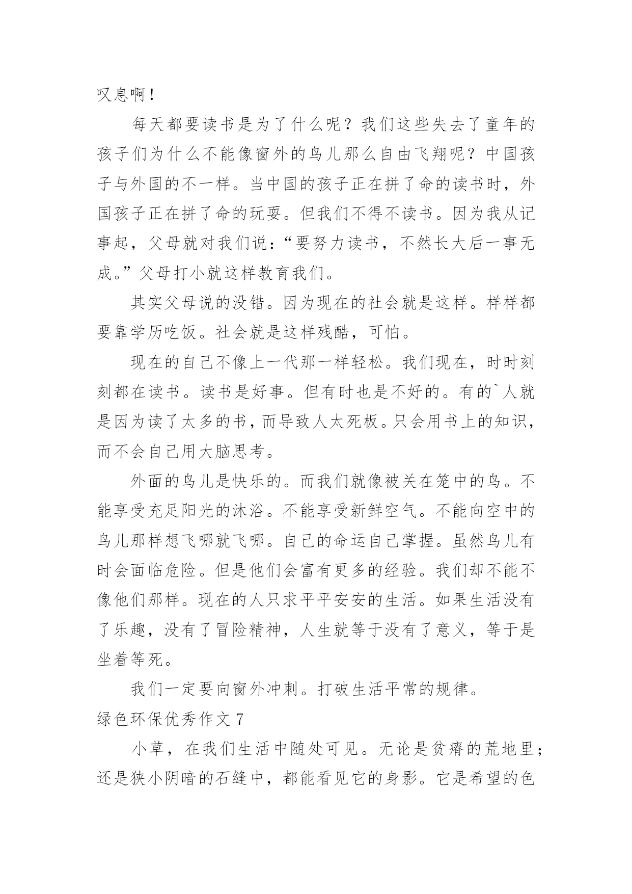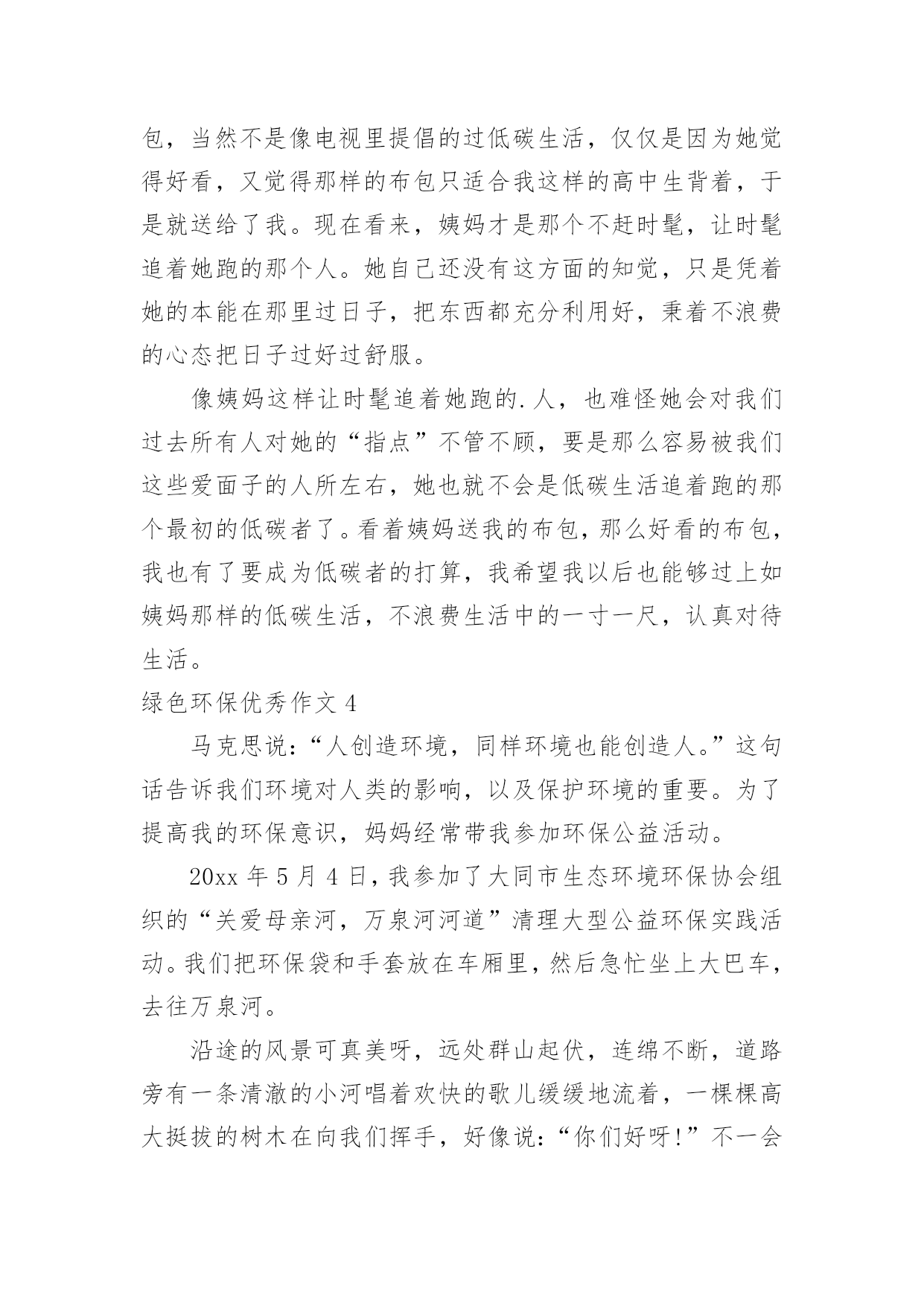 绿色环保优秀作文绿色环保优秀作文在我们平凡的日常里,大家都不可避免地要接触到作文吧,作文是通过文字来表达一个主题意义的记叙方法。还是对作文一筹莫展吗?以下是小编为大家收集的绿色环保优秀作文,欢迎大家分享。绿色环保优秀作文1我以前住的小区前面有一条清澈见底的小河,小河的一旁有很多美丽的小花和翠绿的小草还有那高大挺直的大树,最好的是还有那特别清晰的空气,我们家的那座楼就在最前面我们向外望去及叫人惊叹,又叫人舒服,看上去就和一幅美丽的自然风景画似的。过了很长很长的时间我们搬家了,我们离开了那美丽的.地方,来到了离那很远很远的地方。我们来到的地方也很美但远远不如我以前的那家。不久我们的生活也越来越好,交通也已经很发达了,家家户户都有了汽车,人人都有了汽车并不一定是一件好事,比如汽车的尾气,它是由一氧化碳、碳氢化合物、氮氧化合物、二氧化硫、烟尘微粒(某些重金属化合物、铅化合物、黑烟及油雾)、臭气(甲醛等)。她能导致与血红蛋白相结合,形成碳氧血红蛋白,降低血液的载氧能力,削弱血液对人体组织的供氧量,导致组织缺氧,从而引起头痛等症状,重者窒息死亡。所以我们应该少开车多坐共公汽车。有一次,我路过那条我以前住的那个地方,我一看变化真是太大了小草基本都快没了,小花就甭提了,树也快砍光了,清澈见底的小河已经成了臭气熏天的小河,路过的人有时会捂住鼻子,以前的东西全没了。我看到这一幕以后我对爸爸说我一定要绿色环保,我长大了还要告诉人们绿色环保我先行!绿色环保优秀作文2我们在玩儿的时候,经常爬树、摘花……,都没有意识到这是不对的行为。星期五,教师叫我们当一次环保小卫士,目的是让我们懂得保护花草树木,任务是给校园的树木挂上提示牌,浇水并除杂草。我们一组为一队,我和兰昊天、悦悦等六人一组,我们的目标是操场旁边的五棵柳树,我的任务是除杂草和浇水。上午第四节课,老师说:绿色环保行动开始啦!同学们一窝蜂地冲出教室,浇水的浇水,挂牌子的挂牌子,我们干的热火朝天。我急忙提着满满一桶水往操场跑去,我给每棵树浇上一点水,对小树说:“你们每人先少喝一点水吧,”小树们很快就喝完了,这时郑老师走过来说先对着一棵树浇,然后再浇别的。我按老师的提示,先浇好一棵树,再浇其他的,我来来回回跑了十几次,可把我累坏了。兰昊天在校长的`帮助下挂提示牌。拨草时,我左手抓住一把,右手抓住一把,使劲一拽,杂草连根拔起了,就这杂草很快就被我们一扫而光,我一看我的手,变成绿色的了。我看着喝饱了水的小树,看着一个个标识牌:“伤害树木就是伤害我们”、“保护花草人人有责,”我觉得我们做了一件很有意义的事情,小树摇摆着枝条,好像在对我说:“谢谢你们,环保小卫士。”我一下子觉得不累了。我们人人要做到保护花草树木,不去破坏它,共同创造美好家园。绿色环保优秀作文3我是从姨妈送我一个她手工做的布包开始我的低碳生活的,我记得非常清楚,因为那个布包非常好看,好看到我认为我必须得过上和姨妈一样的低碳生活,才配得上它的好看。我的姨妈,是低碳生活的代表。在举国上下刚提出低碳生活的时候,我们围在电视机前感叹,这低碳生活不就是姨妈过得生活吗?原来姨妈从多年前就已经有了低碳的意识,并且已经在低碳生活里过了那么多年了。过去我们还总怪姨妈太节省,生活的过于“拮据”,没想到当这个概念推出来时,我们才懂得姨妈那根本不是“拮据”,而是自有她的打算的一种低碳生活。姨妈家的很多东西都非常好看,最要命的是她那些好看的东西还都不是市场上买来的,而是她把过去那些不准备再穿的衣服或者过去那些不准备再用的东西拆了,改出来的。姨妈那一双巧手,好像所有的东西到了她的手里都能够变废为宝,没有不可能,只有她愿不愿意。姨妈送我那个手工布包,当然不是像电视里提倡的过低碳生活,仅仅是因为她觉得好看,又觉得那样的布包只适合我这样的高中生背着,于是就送给了我。现在看来,姨妈才是那个不赶时髦,让时髦追着她跑的那个人。她自己还没有这方面的知觉,只是凭着她的本能在那里过日子,把东西都充分利用好,秉着不浪费的心态把日子过好过舒服。像姨妈这样让时髦追着她跑的.人,也难怪她会对我们过去所有人对她的“指点”不管不顾,要是那么容易被我们这些爱面子的人所左右,她也就不会是低碳生活追着跑的那个最初的低碳者了。看着姨妈送我的布包,那么好看的布包,我也有了要成为低碳者的打算,我希望我以后也能够过上如姨妈那样的低碳生活,不浪费生活中的一寸一尺,认真对待生活。绿色环保优秀作文4马克思说:“人创造环境,同样环境也能创造人。”这句话告诉我们环境对人类的影响,以及保护环境的重要。为了提高我的环保意识,妈妈经常带我参加环保公益活动。20xx年5月4日,我参加了大同市生态环境环保协会组织的“关爱母亲河,万泉河河道”清理大型公益环保实践活动。我们把环保袋和手套放在车厢里,然后急忙坐上大巴车,去往万泉河。沿途的
