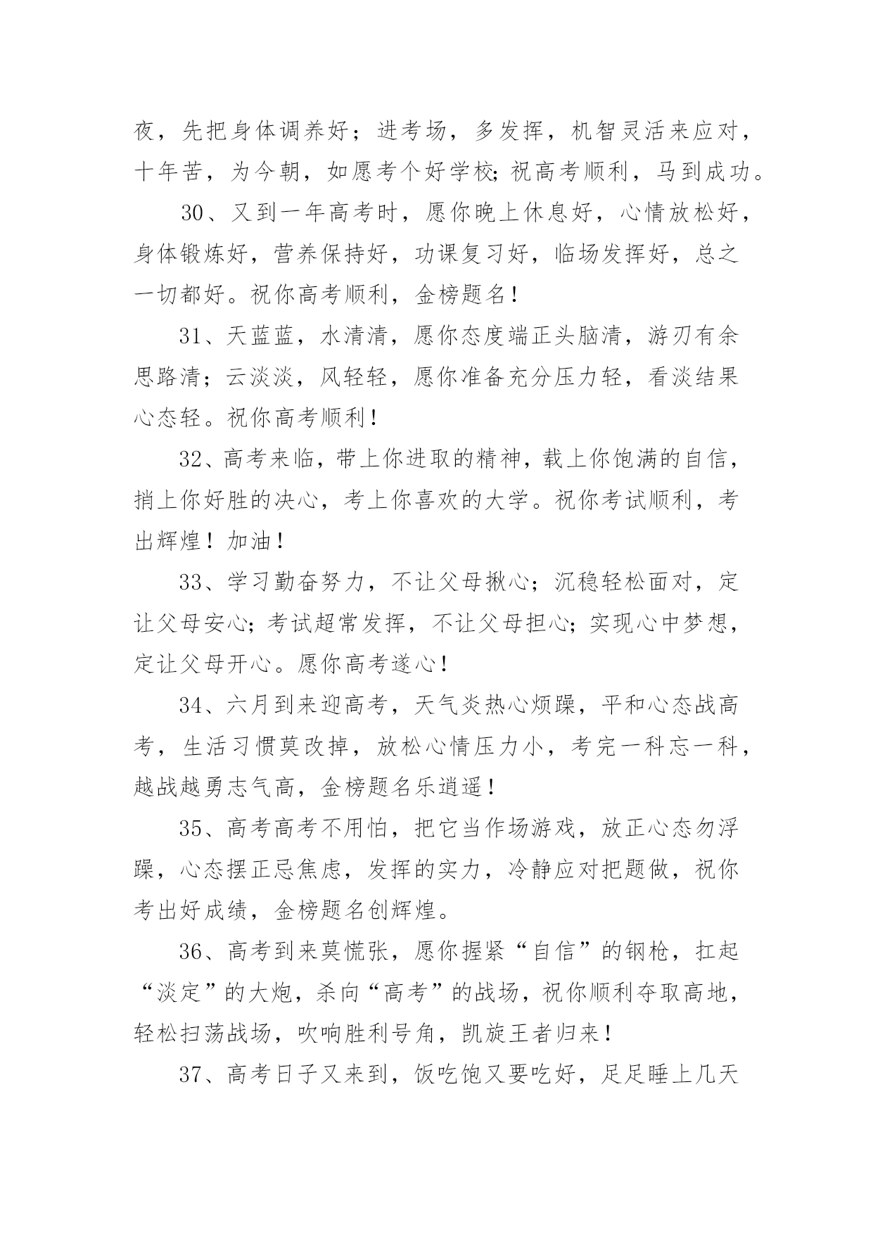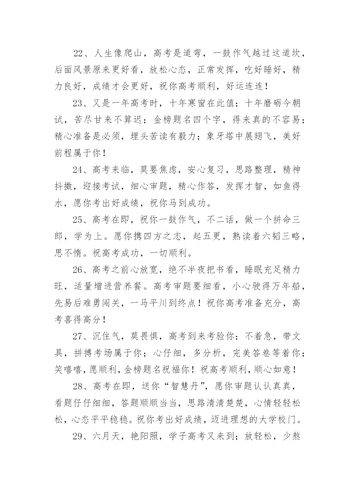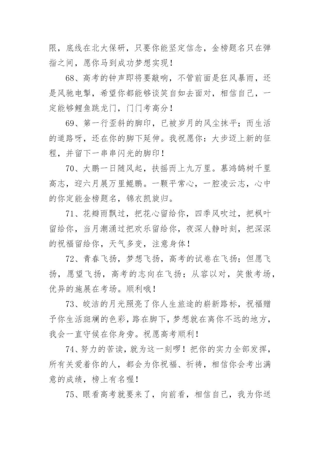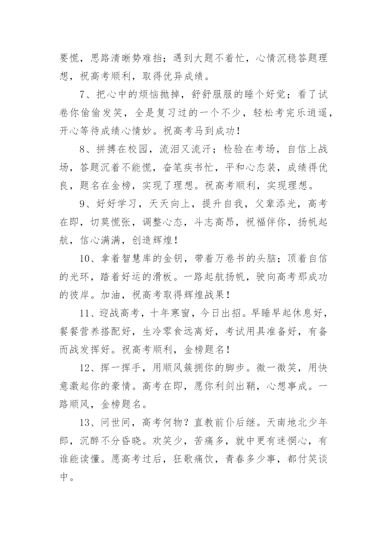 祝福高考生金句祝福高考生金句300句无论是在学校还是在社会中,大家一定都接触过一些使用较为普遍的句子吧,根据用途和语气,句子可以分为陈述句、疑问句、祈使句、感叹句。你还在找寻优秀经典的句子吗?以下是小编精心整理的祝福高考生金句,欢迎阅读,希望大家能够喜欢。1、用“轻松”理顺思路,用“自信”解决难题,用“平和”稳住心慌,用“认真”删除难题,用“顺利”写完答卷,用“祝福”迎接优异成绩,祝高考顺利,金榜题名。2、六月七日迎高考,沉着心态不可少;寒窗苦读很重要,知识储备少不了;心情放松感觉妙,场上才能发挥好;金榜题名看明朝;莘莘学子开口笑!3、十年寒窗苦读,只为今朝一搏,前途光芒道路,需用高考测量,轻松进入考场,努力发挥才智,愿你梦想成真,祝你金榜题名。4、高考在即,我用“智慧”编辑短信,祝福你,思路活跃似舞龙,答题快速似流星,反应灵活赛苍鹰,超常发挥金榜题名,祝你好运,高考顺利。5、种下希望,培育理想和未来。播洒汗水,浇灌梦想和成功。放松心态,缓解挫折和压力。不懈追求,收获幸福和快乐。愿你考上理想的大学。祝高考成功。6、偏题怪题不要怕,认真审题沉着应答;遇到难题不要慌,思路清晰势难挡;遇到大题不着忙,心情沉稳答题理想,祝高考顺利,取得优异成绩。7、把心中的烦恼抛掉,舒舒服服的睡个好觉;看了试卷你偷偷发笑,全是复习过的一个不少,轻松考完乐逍遥,开心等待成绩心情妙。祝高考马到成功!8、拼搏在校园,流泪又流汗;检验在考场,自信上战场,答题沉着不能慌,奋笔疾书忙,平和心态装,成绩得优良,题名在金榜,实现了理想。祝高考顺利,实现理想。9、好好学习,天天向上,提升自我,父辈添光,高考在即,切莫慌张,调整心态,斗志高昂,祝福伴你,扬帆起航,信心满满,创造辉煌!10、拿着智慧库的金钥,带着万卷书的头脑;顶着自信的光环,踏着好运的滑板。一路起航扬帆,驶向高考那成功的彼岸。加油,祝高考取得辉煌战果!11、迎战高考,十年寒窗,今日出招。早睡早起休息好,餐餐营养搭配好,生冷零食远离好,考试用具准备好,有备而战发挥好。祝高考顺利,金榜题名!12、挥一挥手,用顺风簇拥你的脚步。微一微笑,用快意激起你的豪情。高考在即,愿你利剑出鞘,心想事成。一路顺风,金榜题名。13、问世间,高考何物?直教前仆后继。天南地北少年郎,沉醉不分昏晓。欢笑少,苦痛多,就中更有迷惘心,有谁能读懂。愿高考过后,狂歌痛饮,青春多少事,都付笑谈中。14、高考在即,送去祝福,祝你在考场上,自信稳扎稳打,思路翻江倒海,智慧龙飞凤舞,大脑活蹦乱跳,心态四平八稳,钢笔翻飞疾书,成绩名列前茅,理想近在眼前。15、十年寒窗埋头苦读,一朝高考做如意郎,愿你如大鹏一日随风起,扶摇而上九万里。在考试的日子里,愿你吃的舒心,睡的温馨,考的顺心,笑得开心。高考顺利!16、不必后悔走过的足迹,只要努力过,就无需在意是好,还是坏,不必彷徨明日的风景,只要坚持过,就无需害怕前景是明,还是暗。庆幸,走过高考,成就自己。17、充满自信,把智慧凝聚;发挥才智,考出好成绩;良好心态,是取胜关键;短信祝福,愿金榜题名;祝高考学子一切顺利,梦想成真。18、忆往昔三年,朝九晚五,埋头在书本之间,奋斗在高考一线;而今,怀揣梦想,坚定信念,成功就在不远前。祝你能够金榜题名,考试高中!19、高考日到来了,送你三句话:保持平常心,考出分;保持心细如针,做题步步给满分;保持健康如往常,考试给力成绩好。祝高考成功。20、努力定有回报,自信相当重要;烦恼多多少少,放松必不可少;给自己一个微笑,迎来的将是一片美好。祝高考顺利,冲上云霄!21、付出终有收获,努力会有结果,高考来临之际,莫要着急焦虑,放松心态应对,良好才智发挥,愿你金榜题名,成就大学之梦,祝你顺利成功,未来勇攀高峰。22、人生像爬山,高考是道弯,一鼓作气越过这道坎,后面风景原来更好看,放松心态,正常发挥,吃好睡好,精力良好,成绩才会更好,祝你高考顺利,好运连连!23、又是一年高考时,十年寒窗在此值;十年磨砺今朝试,苦尽甘来不算迟;金榜题名四个字,得来真的不容易;精心准备是必须,埋头苦读有毅力;象牙塔中展翅飞,美好前程属于你!24、高考来临,莫要焦虑,安心复习,思路整理,精神抖擞,迎接考试,细心审题,精心作答,发挥才智,如鱼得水,愿你考出好成绩,祝你马到成功。25、高考在即,祝你一鼓作气,不二话,做一个拼命三郎,学为上。愿你携四方之志,起五更,熟读着六韬三略,思不惰。祝高考成功,一切顺利。26、高考之前心放宽,绝不半夜把书看,睡眠充足精力旺,适量增进营养餐。高考审题要细看,小心驶得万年船,先易后难勇闯关,一马平川到终点!祝你高考准备充分,高考喜得高分!27、沉住气,莫畏惧,高考到来考验你;不着急,带文具,拼搏考场属于你;心仔细,多分析,完美答卷等着你;笑嘻嘻,愿顺利,金榜题名祝福你!祝
