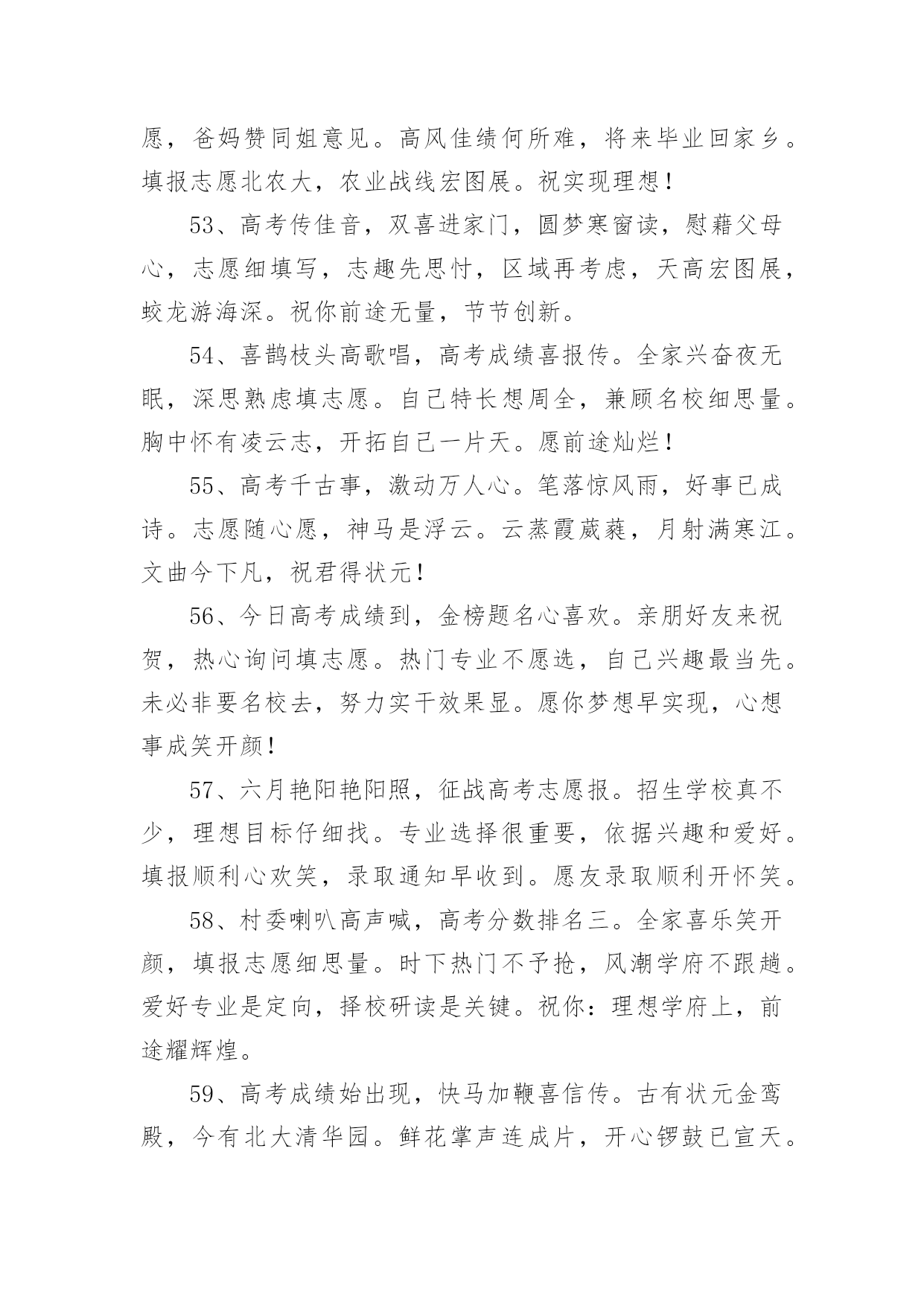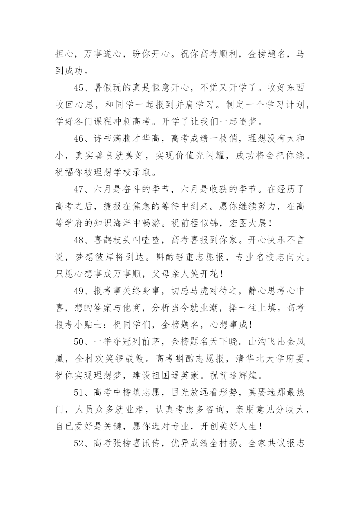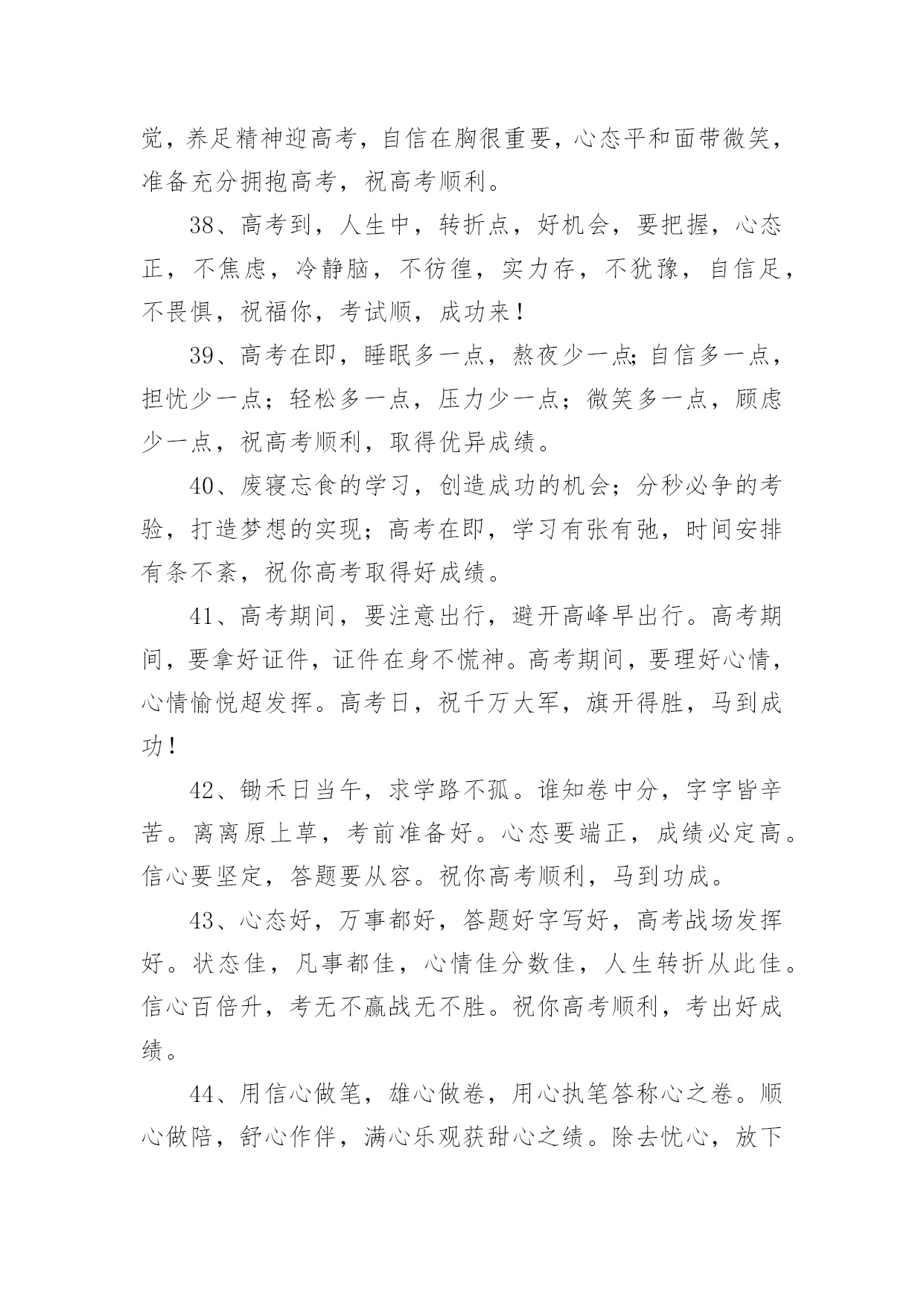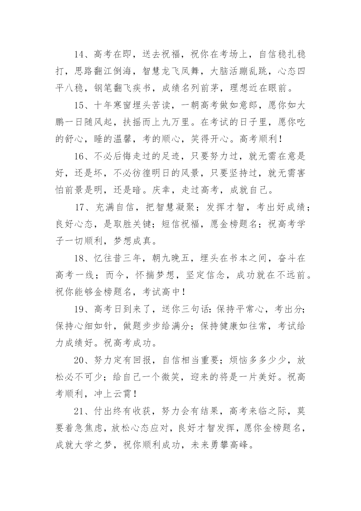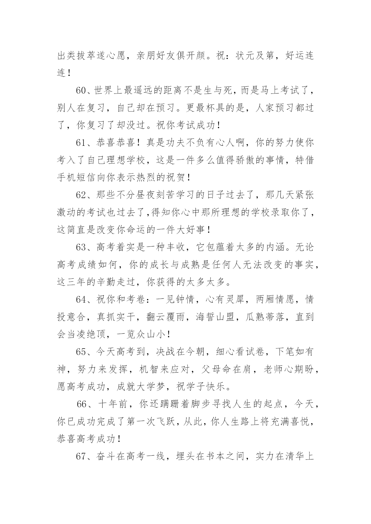 祝福高考生金句祝福高考生金句300句无论是在学校还是在社会中,大家一定都接触过一些使用较为普遍的句子吧,根据用途和语气,句子可以分为陈述句、疑问句、祈使句、感叹句。你还在找寻优秀经典的句子吗?以下是小编精心整理的祝福高考生金句,欢迎阅读,希望大家能够喜欢。1、用“轻松”理顺思路,用“自信”解决难题,用“平和”稳住心慌,用“认真”删除难题,用“顺利”写完答卷,用“祝福”迎接优异成绩,祝高考顺利,金榜题名。2、六月七日迎高考,沉着心态不可少;寒窗苦读很重要,知识储备少不了;心情放松感觉妙,场上才能发挥好;金榜题名看明朝;莘莘学子开口笑!3、十年寒窗苦读,只为今朝一搏,前途光芒道路,需用高考测量,轻松进入考场,努力发挥才智,愿你梦想成真,祝你金榜题名。4、高考在即,我用“智慧”编辑短信,祝福你,思路活跃似舞龙,答题快速似流星,反应灵活赛苍鹰,超常发挥金榜题名,祝你好运,高考顺利。5、种下希望,培育理想和未来。播洒汗水,浇灌梦想和成功。放松心态,缓解挫折和压力。不懈追求,收获幸福和快乐。愿你考上理想的大学。祝高考成功。6、偏题怪题不要怕,认真审题沉着应答;遇到难题不要慌,思路清晰势难挡;遇到大题不着忙,心情沉稳答题理想,祝高考顺利,取得优异成绩。7、把心中的烦恼抛掉,舒舒服服的睡个好觉;看了试卷你偷偷发笑,全是复习过的一个不少,轻松考完乐逍遥,开心等待成绩心情妙。祝高考马到成功!8、拼搏在校园,流泪又流汗;检验在考场,自信上战场,答题沉着不能慌,奋笔疾书忙,平和心态装,成绩得优良,题名在金榜,实现了理想。祝高考顺利,实现理想。9、好好学习,天天向上,提升自我,父辈添光,高考在即,切莫慌张,调整心态,斗志高昂,祝福伴你,扬帆起航,信心满满,创造辉煌!10、拿着智慧库的金钥,带着万卷书的头脑;顶着自信的光环,踏着好运的滑板。一路起航扬帆,驶向高考那成功的彼岸。加油,祝高考取得辉煌战果!11、迎战高考,十年寒窗,今日出招。早睡早起休息好,餐餐营养搭配好,生冷零食远离好,考试用具准备好,有备而战发挥好。祝高考顺利,金榜题名!12、挥一挥手,用顺风簇拥你的脚步。微一微笑,用快意激起你的豪情。高考在即,愿你利剑出鞘,心想事成。一路顺风,金榜题名。13、问世间,高考何物?直教前仆后继。天南地北少年郎,沉醉不分昏晓。欢笑少,苦痛多,就中更有迷惘心,有谁能读懂。愿高考过后,狂歌痛饮,青春多少事,都付笑谈中。14、高考在即,送去祝福,祝你在考场上,自信稳扎稳打,思路翻江倒海,智慧龙飞凤舞,大脑活蹦乱跳,心态四平八稳,钢笔翻飞疾书,成绩名列前茅,理想近在眼前。15、十年寒窗埋头苦读,一朝高考做如意郎,愿你如大鹏一日随风起,扶摇而上九万里。在考试的日子里,愿你吃的舒心,睡的温馨,考的顺心,笑得开心。高考顺利!16、不必后悔走过的足迹,只要努力过,就无需在意是好,还是坏,不必彷徨明日的风景,只要坚持过,就无需害怕前景是明,还是暗。庆幸,走过高考,成就自己。17、充满自信,把智慧凝聚;发挥才智,考出好成绩;良好心态,是取胜关键;短信祝福,愿金榜题名;祝高考学子一切顺利,梦想成真。18、忆往昔三年,朝九晚五,埋头在书本之间,奋斗在高考一线;而今,怀揣梦想,坚定信念,成功就在不远前。祝你能够金榜题名,考试高中!19、高考日到来了,送你三句话:保持平常心,考出分;保持心细如针,做题步步给满分;保持健康如往常,考试给力成绩好。祝高考成功。20、努力定有回报,自信相当重要;烦恼多多少少,放松必不可少;给自己一个微笑,迎来的将是一片美好。祝高考顺利,冲上云霄!21、付出终有收获,努力会有结果,高考来临之际,莫要着急焦虑,放松心态应对,良好才智发挥,愿你金榜题名,成就大学之梦,祝你顺利成功,未来勇攀高峰。22、人生像爬山,高考是道弯,一鼓作气越过这道坎,后面风景原来更好看,放松心态,正常发挥,吃好睡好,精力良好,成绩才会更好,祝你高考顺利,好运连连!23、又是一年高考时,十年寒窗在此值;十年磨砺今朝试,苦尽甘来不算迟;金榜题名四个字,得来真的不容易;精心准备是必须,埋头苦读有毅力;象牙塔中展翅飞,美好前程属于你!24、高考来临,莫要焦虑,安心复习,思路整理,精神抖擞,迎接考试,细心审题,精心作答,发挥才智,如鱼得水,愿你考出好成绩,祝你马到成功。25、高考在即,祝你一鼓作气,不二话,做一个拼命三郎,学为上。愿你携四方之志,起五更,熟读着六韬三略,思不惰。祝高考成功,一切顺利。26、高考之前心放宽,绝不半夜把书看,睡眠充足精力旺,适量增进营养餐。高考审题要细看,小心驶得万年船,先易后难勇闯关,一马平川到终点!祝你高考准备充分,高考喜得高分!27、沉住气,莫畏惧,高考到来考验你;不着急,带文具,拼搏考场属于你;心仔细,多分析,完美答卷等着你;笑嘻嘻,愿顺利,金榜题名祝福你!祝