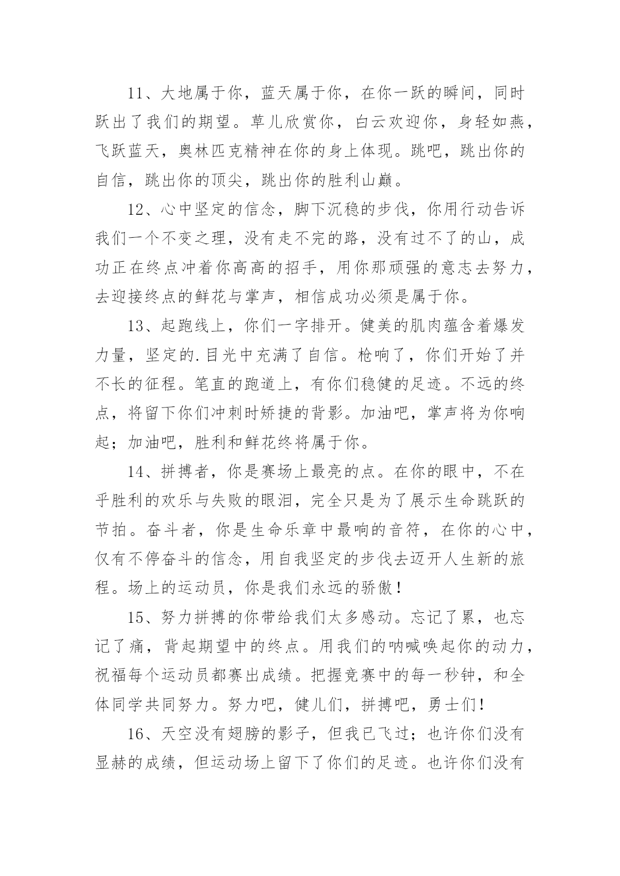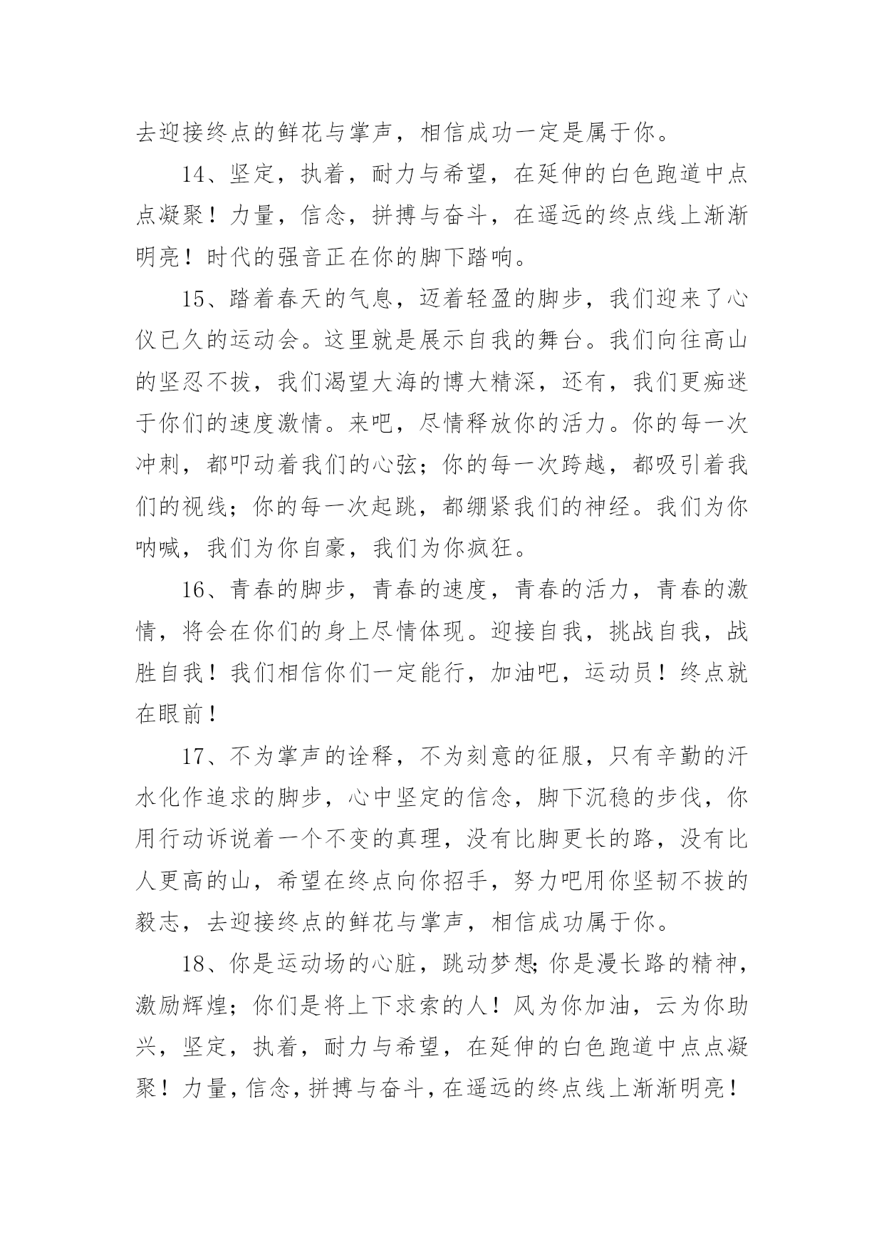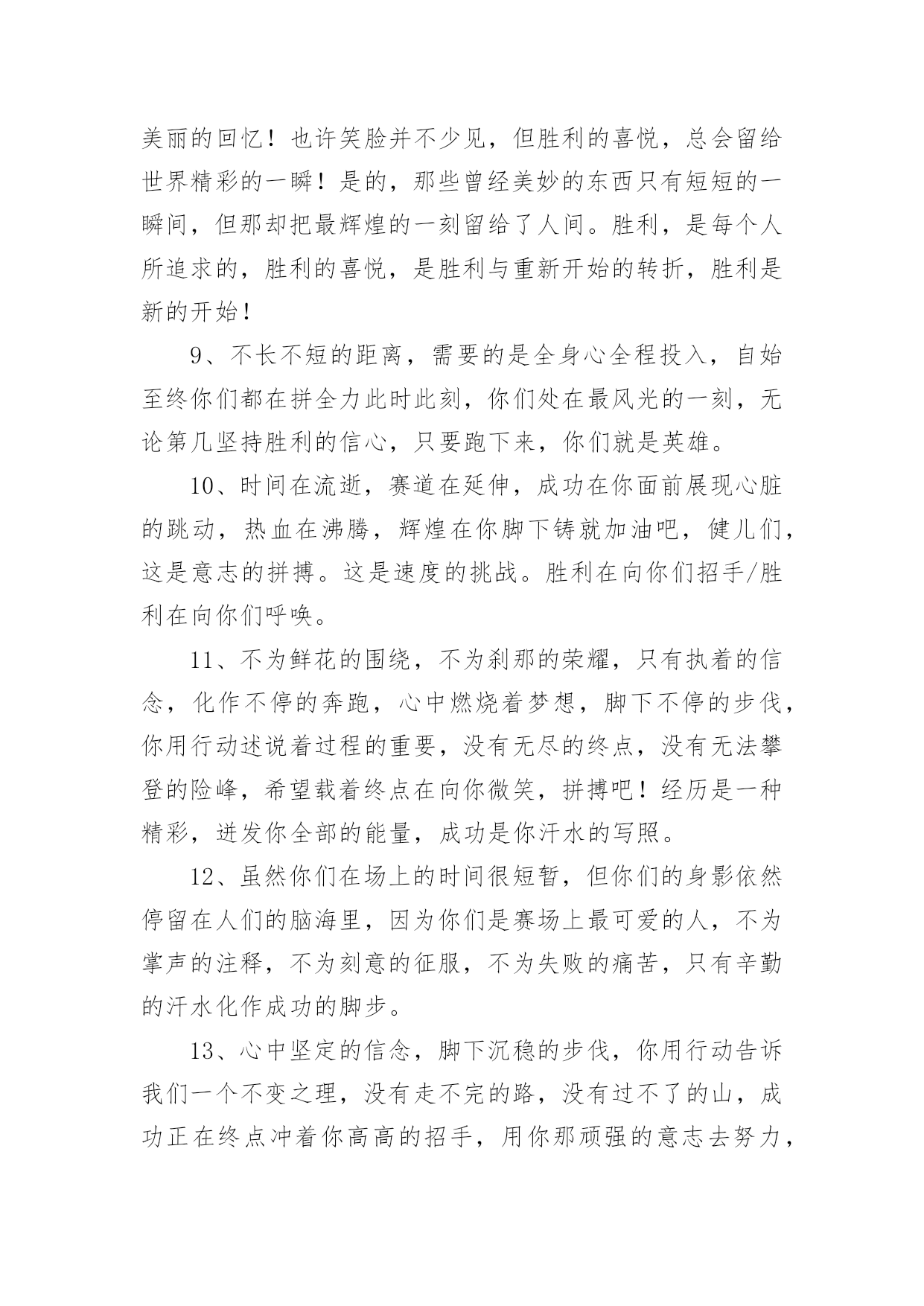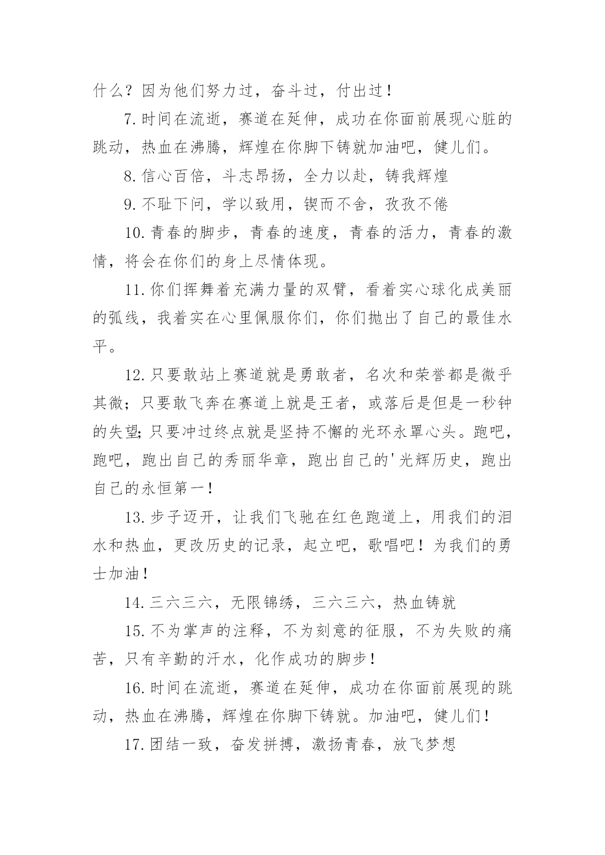 运动会加油稿运动会加油稿[范例15篇]在现实社会中,很多情况下我们需要用到加油稿,加油稿可以强化人们的自我认知,给予人正向的激励作用。那么你有了解过加油稿吗?下面是小编精心整理的运动会加油稿,仅供参考,欢迎大家阅读。运动会加油稿11、在同一片晴空下,我们相聚一齐,或欢乐,或失落,或兴奋,或悲伤,尽数写在我们的脸旁。我们曾一齐悲伤,在那个败北的沙坑上;我们也一齐击掌,在这红色的跑道上。在同一片晴空下,我们拼搏,为美丽的目标;我们奋斗,为班级的辉煌。这就是团结奋进礼貌的企管班。2、只要你努力,辉煌不是空中阁楼;只要你奋斗,辉煌不是若隐若现的星河;只要你拼搏,辉煌不会与你擦肩而过;只要你进取,辉煌自然会与你亲切握手。祝运动场上的全体运动健儿们取得自我满意的好成绩!3、你像一只冲劲十足的箭,枪声响起,你从拉弯的弓上,飞驰出去,虽然箭的冲劲,是短暂的,虽然你的冲劲,只有米,但你全然不顾,为了那些期待眼神,为了完成任务,就像箭一样,向着目标飞去。4、枪声响起,轻轻的一抬脚,便牵动了全场的目光潇洒的迫挥挥手,便满足了那一份无言的等待。迎着朝阳,你们踏歌而去,背着期望,我们等待你们的归来。5、灰暗的天空下有你们的身影,那矫健的身姿在长空下奔驰,向着目标前进。那值得你们洒下汗水的地方,就在你们眼前闪耀,坚持住,你们是最棒的。加油,运动员们!6、离弦箭似的助跑,蚂蚱似的起跳,空中的走步表演,引起阵阵惊叹,落地的瞬间,你触到了沙的柔软,不管怎样,荣誉永远属于你。7、你们不必懊悔,不必悲哀。只要你们微笑,我们班将一向以你们为豪。真得很报歉,不能和你们一起承受。你们好好休息吧,期待你们再一次的微笑。8、于你们的速度激情。来吧,尽情释放你的活力。你的每一次冲刺,都叩动着我们的心弦;你的每一次跨越,都吸引着我们的视线;你的每一次起跳,都绷紧我们的神经。我们为你呐喊,我们为你自豪,我们为你疯狂。9、数不请你跨出了多少坚实的步履,数不请你留下了多少汗滴。只有那悦耳的加油声,在你耳边环绕,激励你超越极限,超越自我。应对成功你从不自傲,应对失败你也只是轻轻一笑,你知道,你是我们永远的骄傲!10、运动场上有你们的飒爽英姿,运动场上有你们拼搏的身影,应对漫漫的征程,你没有畏惧和退缩,任汗水打湿脊背,任疲惫爬满全身,依然分离追赶,仅有一个目标,仅有一个信念,为班级赢得荣誉,拼搏吧,我为你们呐喊,加油!11、大地属于你,蓝天属于你,在你一跃的瞬间,同时跃出了我们的期望。草儿欣赏你,白云欢迎你,身轻如燕,飞跃蓝天,奥林匹克精神在你的身上体现。跳吧,跳出你的自信,跳出你的顶尖,跳出你的胜利山巅。12、心中坚定的信念,脚下沉稳的步伐,你用行动告诉我们一个不变之理,没有走不完的路,没有过不了的山,成功正在终点冲着你高高的招手,用你那顽强的意志去努力,去迎接终点的鲜花与掌声,相信成功必须是属于你。13、起跑线上,你们一字排开。健美的肌肉蕴含着爆发力量,坚定的.目光中充满了自信。枪响了,你们开始了并不长的征程。笔直的跑道上,有你们稳健的足迹。不远的终点,将留下你们冲刺时矫捷的背影。加油吧,掌声将为你响起;加油吧,胜利和鲜花终将属于你。14、拼搏者,你是赛场上最亮的点。在你的眼中,不在乎胜利的欢乐与失败的眼泪,完全只是为了展示生命跳跃的节拍。奋斗者,你是生命乐章中最响的音符,在你的心中,仅有不停奋斗的信念,用自我坚定的步伐去迈开人生新的旅程。场上的运动员,你是我们永远的骄傲!15、努力拼搏的你带给我们太多感动。忘记了累,也忘记了痛,背起期望中的终点。用我们的呐喊唤起你的动力,祝福每个运动员都赛出成绩。把握竞赛中的每一秒钟,和全体同学共同努力。努力吧,健儿们,拼搏吧,勇士们!16、天空没有翅膀的影子,但我已飞过;也许你们没有显赫的成绩,但运动场上留下了你们的足迹。也许你们没有奖品,但我们心中留下了你们拼搏的身影。所有的努力都是为了迎接这一刹那,所有的拼搏都是为了这一声令下。17、你是否感到,烈日的照射那是烈日对你的祝福;你是否感到,彩旗的摇摆那是彩旗对你的呐喊人们的注视那是人们对你的希望,祝福在你身边呐喊在你耳边希望在你心中。的健儿,愿你们一展雄风,勇夺桂冠!18、坚定的步伐,高昂的斗志,风一样的速度。枪声,吹响战斗的号角。胜利,在重点招手,勇士们在疆场拼搏,汗水,在风中挥洒。追风英雄,我们为你骄傲,我们因你而自豪。运动会加油稿21.不为鲜花的围绕,不为刹那的荣耀,只有执着的信念,化作不停的奔跑,心中燃烧着梦想,脚下不停的步伐。2.真彩青春,活力焕发,勤俭有度,为梦奋发3.信息信息,码农苦逼,修个电脑,开机关机。4.踏上跑道,是一种选择。离开起点,是一种勇气。驰骋赛场,是一种胜利。5.人生的路,有坦途,也有坎坷;做过的岁月,有欢笑,也有苦涩,泪水告诉我一个跌倒的故事,汗水使我多了一份