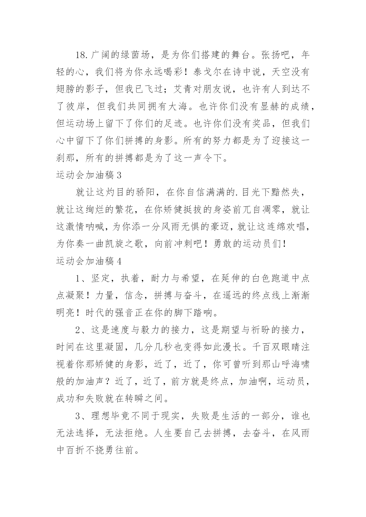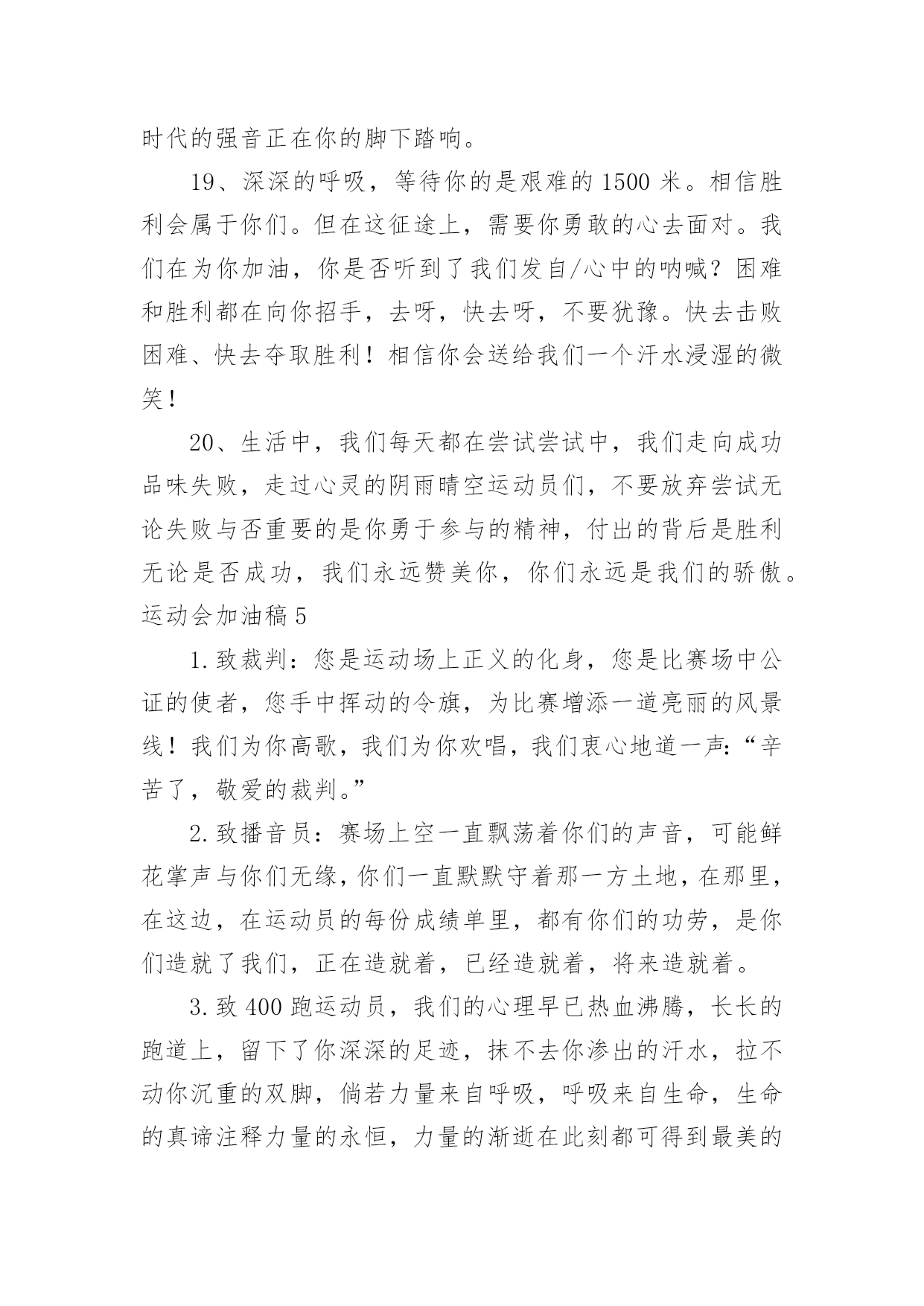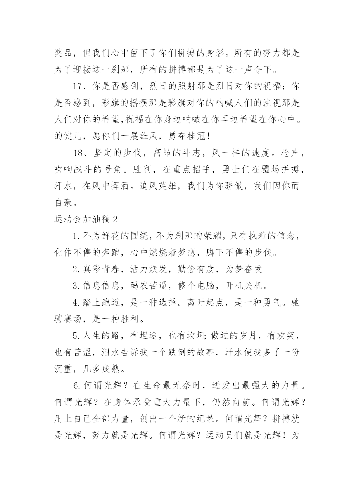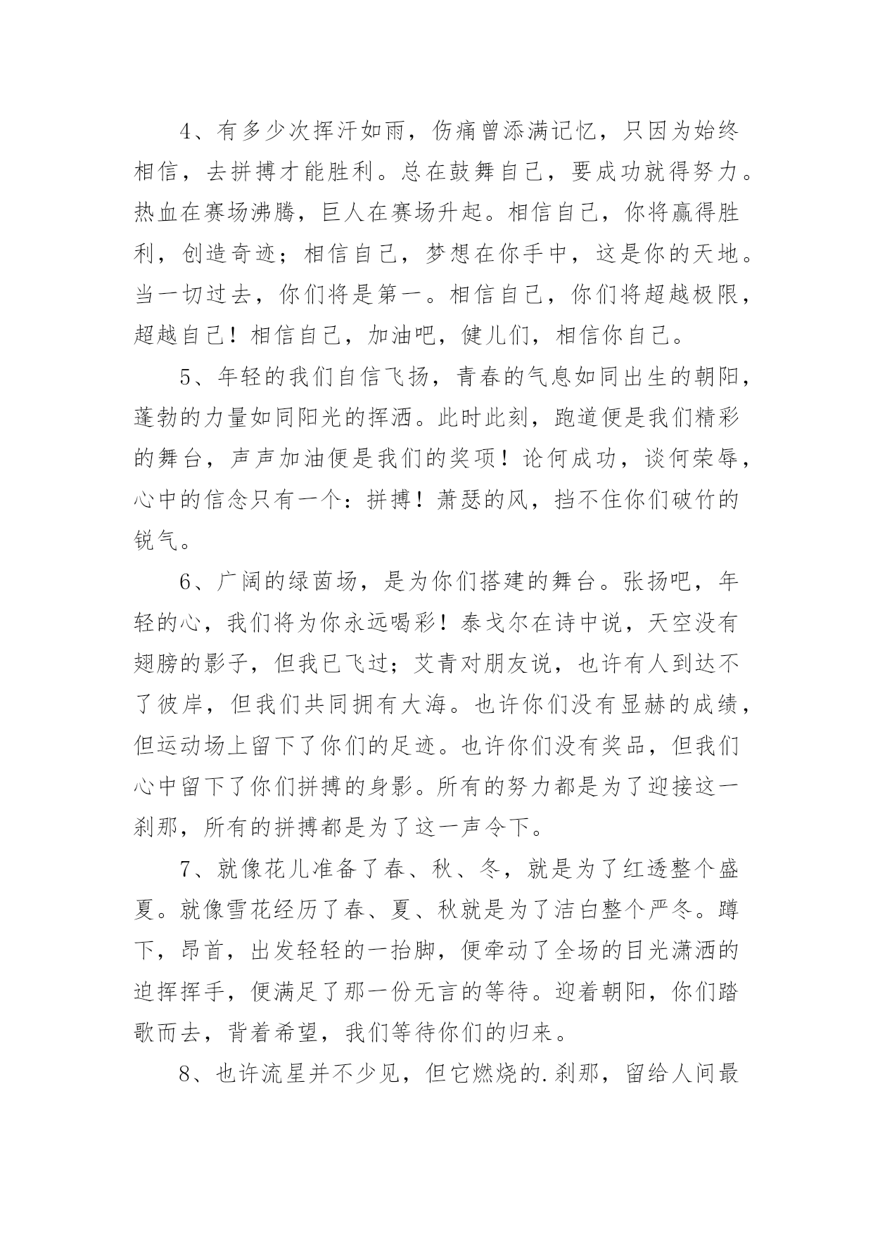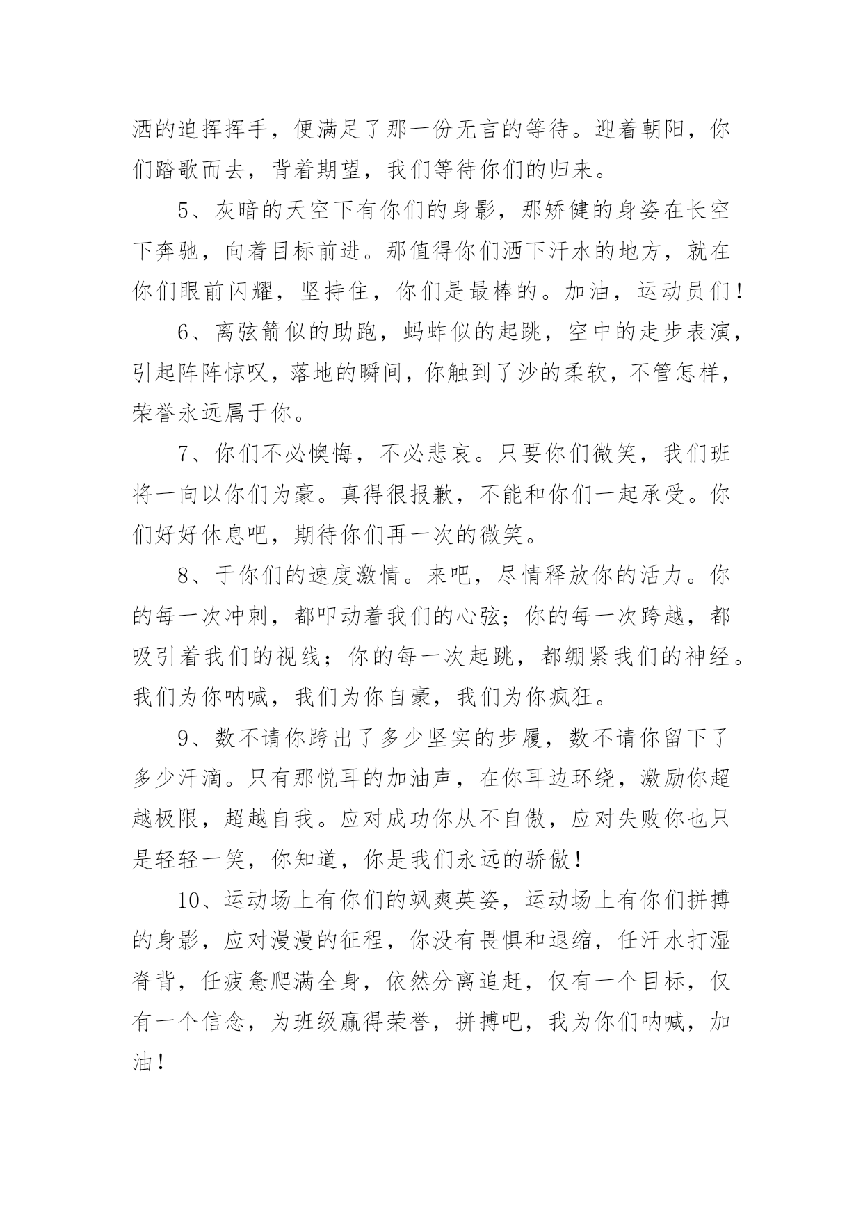 运动会加油稿运动会加油稿[范例15篇]在现实社会中,很多情况下我们需要用到加油稿,加油稿可以强化人们的自我认知,给予人正向的激励作用。那么你有了解过加油稿吗?下面是小编精心整理的运动会加油稿,仅供参考,欢迎大家阅读。运动会加油稿11、在同一片晴空下,我们相聚一齐,或欢乐,或失落,或兴奋,或悲伤,尽数写在我们的脸旁。我们曾一齐悲伤,在那个败北的沙坑上;我们也一齐击掌,在这红色的跑道上。在同一片晴空下,我们拼搏,为美丽的目标;我们奋斗,为班级的辉煌。这就是团结奋进礼貌的企管班。2、只要你努力,辉煌不是空中阁楼;只要你奋斗,辉煌不是若隐若现的星河;只要你拼搏,辉煌不会与你擦肩而过;只要你进取,辉煌自然会与你亲切握手。祝运动场上的全体运动健儿们取得自我满意的好成绩!3、你像一只冲劲十足的箭,枪声响起,你从拉弯的弓上,飞驰出去,虽然箭的冲劲,是短暂的,虽然你的冲劲,只有米,但你全然不顾,为了那些期待眼神,为了完成任务,就像箭一样,向着目标飞去。4、枪声响起,轻轻的一抬脚,便牵动了全场的目光潇洒的迫挥挥手,便满足了那一份无言的等待。迎着朝阳,你们踏歌而去,背着期望,我们等待你们的归来。5、灰暗的天空下有你们的身影,那矫健的身姿在长空下奔驰,向着目标前进。那值得你们洒下汗水的地方,就在你们眼前闪耀,坚持住,你们是最棒的。加油,运动员们!6、离弦箭似的助跑,蚂蚱似的起跳,空中的走步表演,引起阵阵惊叹,落地的瞬间,你触到了沙的柔软,不管怎样,荣誉永远属于你。7、你们不必懊悔,不必悲哀。只要你们微笑,我们班将一向以你们为豪。真得很报歉,不能和你们一起承受。你们好好休息吧,期待你们再一次的微笑。8、于你们的速度激情。来吧,尽情释放你的活力。你的每一次冲刺,都叩动着我们的心弦;你的每一次跨越,都吸引着我们的视线;你的每一次起跳,都绷紧我们的神经。我们为你呐喊,我们为你自豪,我们为你疯狂。9、数不请你跨出了多少坚实的步履,数不请你留下了多少汗滴。只有那悦耳的加油声,在你耳边环绕,激励你超越极限,超越自我。应对成功你从不自傲,应对失败你也只是轻轻一笑,你知道,你是我们永远的骄傲!10、运动场上有你们的飒爽英姿,运动场上有你们拼搏的身影,应对漫漫的征程,你没有畏惧和退缩,任汗水打湿脊背,任疲惫爬满全身,依然分离追赶,仅有一个目标,仅有一个信念,为班级赢得荣誉,拼搏吧,我为你们呐喊,加油!11、大地属于你,蓝天属于你,在你一跃的瞬间,同时跃出了我们的期望。草儿欣赏你,白云欢迎你,身轻如燕,飞跃蓝天,奥林匹克精神在你的身上体现。跳吧,跳出你的自信,跳出你的顶尖,跳出你的胜利山巅。12、心中坚定的信念,脚下沉稳的步伐,你用行动告诉我们一个不变之理,没有走不完的路,没有过不了的山,成功正在终点冲着你高高的招手,用你那顽强的意志去努力,去迎接终点的鲜花与掌声,相信成功必须是属于你。13、起跑线上,你们一字排开。健美的肌肉蕴含着爆发力量,坚定的.目光中充满了自信。枪响了,你们开始了并不长的征程。笔直的跑道上,有你们稳健的足迹。不远的终点,将留下你们冲刺时矫捷的背影。加油吧,掌声将为你响起;加油吧,胜利和鲜花终将属于你。14、拼搏者,你是赛场上最亮的点。在你的眼中,不在乎胜利的欢乐与失败的眼泪,完全只是为了展示生命跳跃的节拍。奋斗者,你是生命乐章中最响的音符,在你的心中,仅有不停奋斗的信念,用自我坚定的步伐去迈开人生新的旅程。场上的运动员,你是我们永远的骄傲!15、努力拼搏的你带给我们太多感动。忘记了累,也忘记了痛,背起期望中的终点。用我们的呐喊唤起你的动力,祝福每个运动员都赛出成绩。把握竞赛中的每一秒钟,和全体同学共同努力。努力吧,健儿们,拼搏吧,勇士们!16、天空没有翅膀的影子,但我已飞过;也许你们没有显赫的成绩,但运动场上留下了你们的足迹。也许你们没有奖品,但我们心中留下了你们拼搏的身影。所有的努力都是为了迎接这一刹那,所有的拼搏都是为了这一声令下。17、你是否感到,烈日的照射那是烈日对你的祝福;你是否感到,彩旗的摇摆那是彩旗对你的呐喊人们的注视那是人们对你的希望,祝福在你身边呐喊在你耳边希望在你心中。的健儿,愿你们一展雄风,勇夺桂冠!18、坚定的步伐,高昂的斗志,风一样的速度。枪声,吹响战斗的号角。胜利,在重点招手,勇士们在疆场拼搏,汗水,在风中挥洒。追风英雄,我们为你骄傲,我们因你而自豪。运动会加油稿21.不为鲜花的围绕,不为刹那的荣耀,只有执着的信念,化作不停的奔跑,心中燃烧着梦想,脚下不停的步伐。2.真彩青春,活力焕发,勤俭有度,为梦奋发3.信息信息,码农苦逼,修个电脑,开机关机。4.踏上跑道,是一种选择。离开起点,是一种勇气。驰骋赛场,是一种胜利。5.人生的路,有坦途,也有坎坷;做过的岁月,有欢笑,也有苦涩,泪水告诉我一个跌倒的故事,汗水使我多了一份