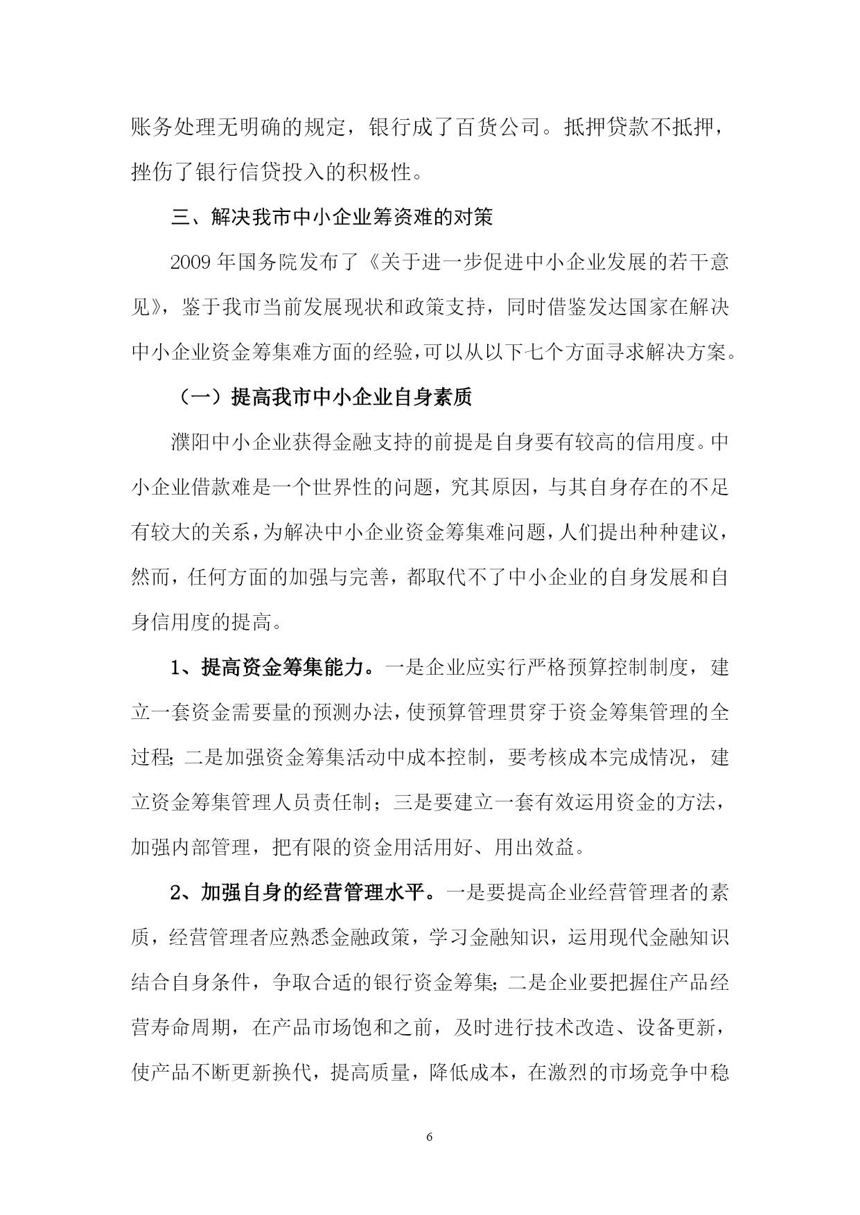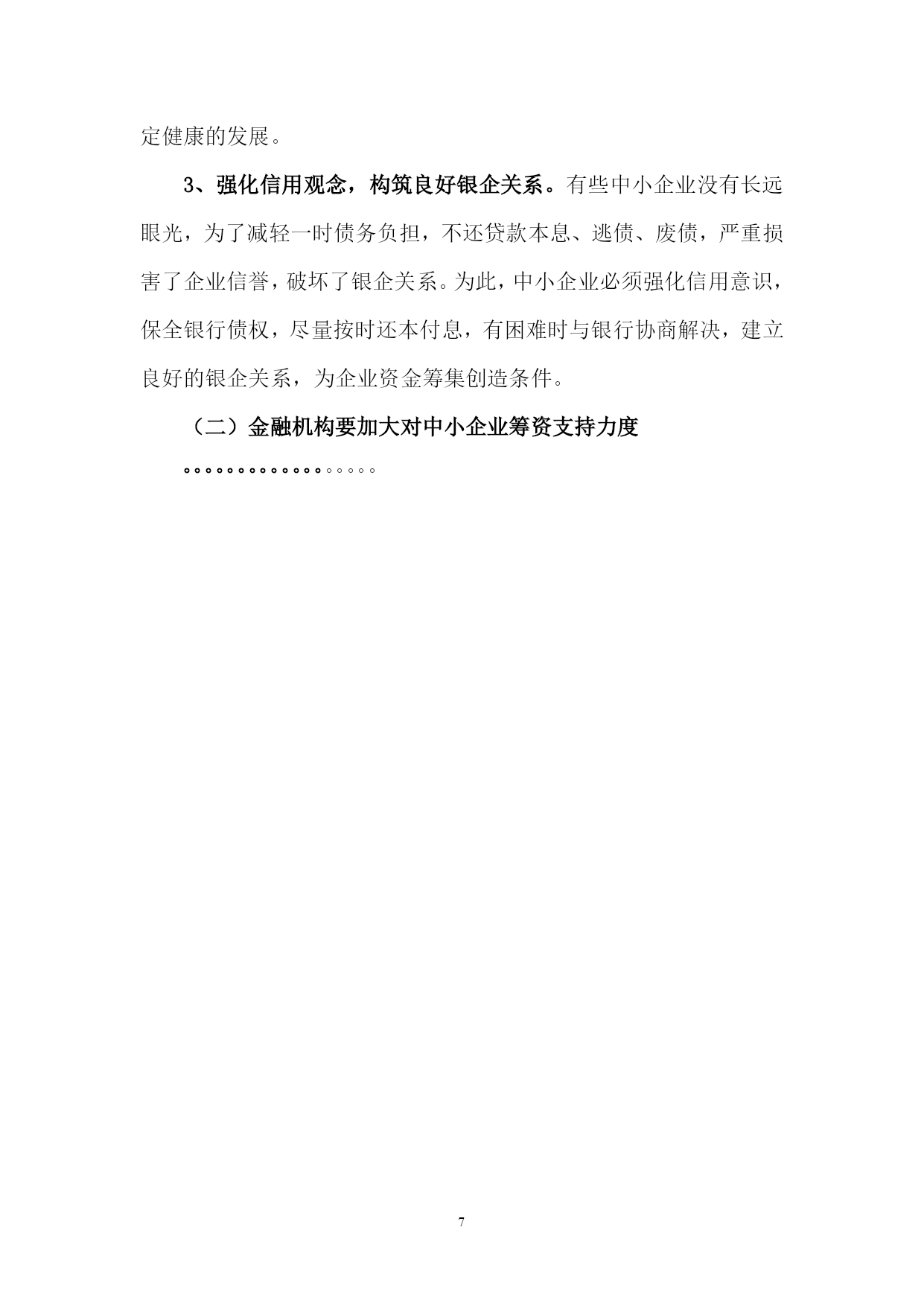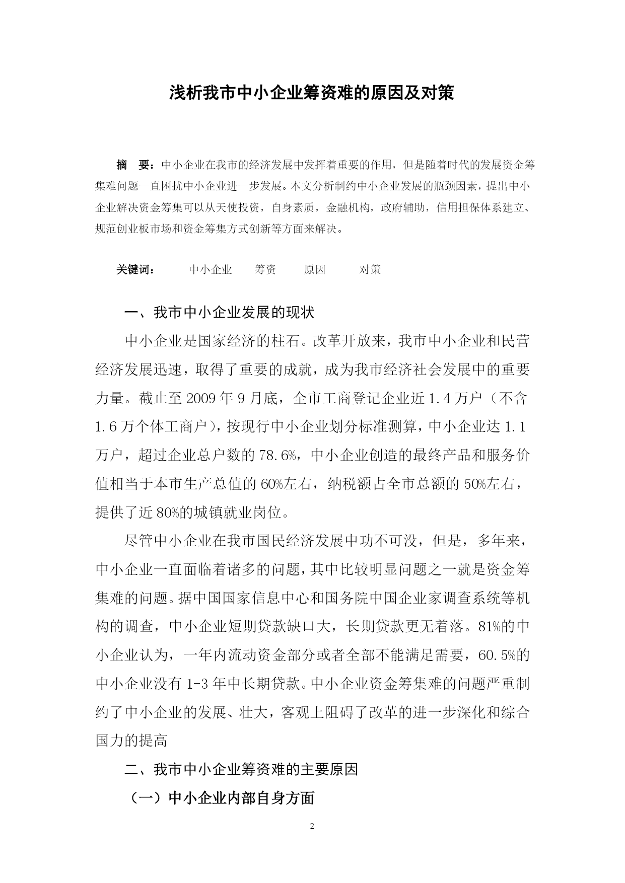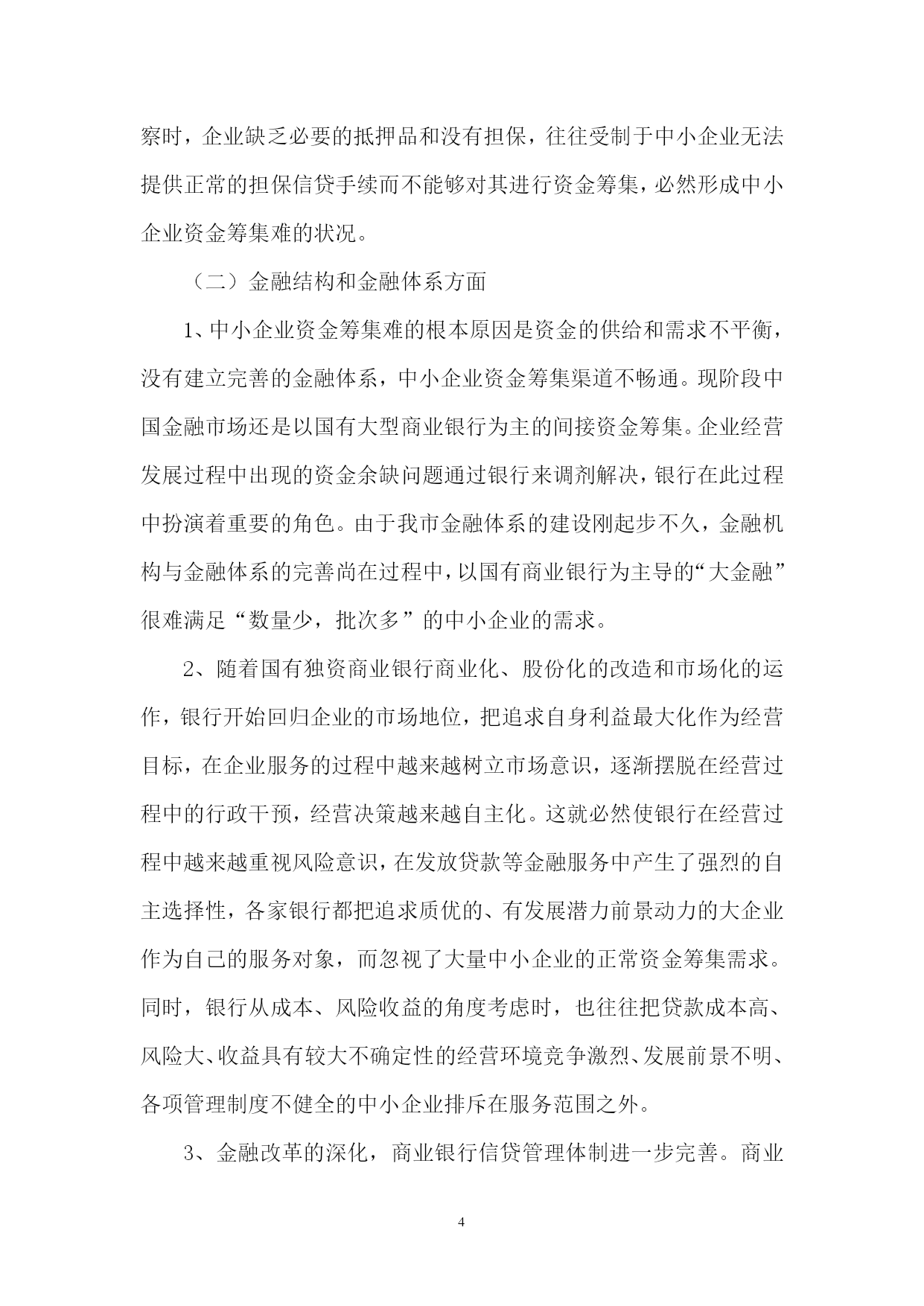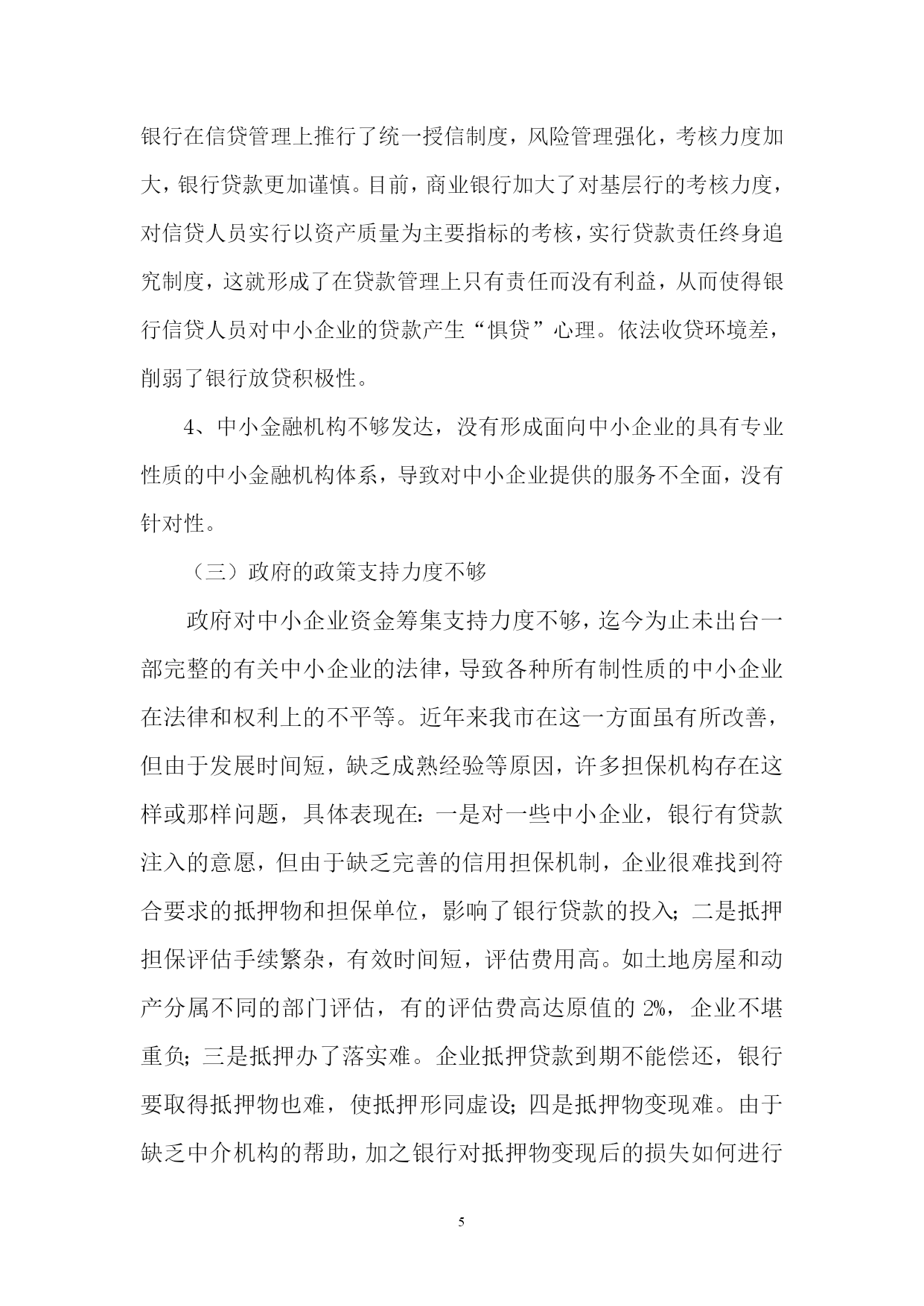中央广播电视大学开放教育工商(本科)毕业论文浅析我市中小企业筹资难的原因及对策目录【◆热心网友说:直接找这个写手帮,他的ΩΩ::1-2-1-0-7-3-4-0-2-3,保证过关】TOC\o"1-3"\h\z\uHYPERLINK\l"_Toc249106258"一、我市中小企业发展的现状PAGEREF_Toc249106258\h6HYPERLINK\l"_Toc249106264"二、我市中小企业筹资难的原因PAGEREF_Toc249106264\h8HYPERLINK\l"_Toc249106265"(一)中小企业内部自身方面PAGEREF_Toc249106265\h8HYPERLINK\l"_Toc249106266"(二)金融结构和金融体系方面PAGEREF_Toc249106266\h8HYPERLINK\l"_Toc249106267"(三)政府的政策支持力度不够是造成中小企业筹资困难的重要原因PAGEREF_Toc249106267\h9HYPERLINK\l"_Toc249106268"三、解决我市中小企业筹资难的对策PAGEREF_Toc249106268\h10HYPERLINK\l"_Toc249106269"(一)提高我市中小企业自身素质PAGEREF_Toc249106269\h11HYPERLINK\l"_Toc249106270"(二)金融机构要加大对中小企业筹资支持力度PAGEREF_Toc249106270\h12HYPERLINK\l"_Toc249106271"(三)完善政府服务职能,为中小企业筹资创造更多机会PAGEREF_Toc249106271\h12HYPERLINK\l"_Toc249106272"(四)建立和完善我市中小企业信用担保体系PAGEREF_Toc249106272\h13HYPERLINK\l"_Toc249106274"(五)创新符合我市特点的中小企业筹资新模式PAGEREF_Toc249106274\h15HYPERLINK\l"_Toc249106277"参考文献……………………………………………………………………………13浅析我市中小企业筹资难的原因及对策摘要:中小企业在我市的经济发展中发挥着重要的作用,但是随着时代的发展资金筹集难问题一直困扰中小企业进一步发展。本文分析制约中小企业发展的瓶颈因素,提出中小企业解决资金筹集可以从天使投资,自身素质,金融机构,政府辅助,信用担保体系建立、规范创业板市场和资金筹集方式创新等方面来解决。关键词:中小企业筹资原因对策一、我市中小企业发展的现状中小企业是国家经济的柱石。改革开放来,我市中小企业和民营经济发展迅速,取得了重要的成就,成为我市经济社会发展中的重要力量。截止至2009年9月底,全市工商登记企业近1.4万户(不含1.6万个体工商户),按现行中小企业划分标准测算,中小企业达1.1万户,超过企业总户数的78.6%,中小企业创造的最终产品和服务价值相当于本市生产总值的60%左右,纳税额占全市总额的50%左右,提供了近80%的城镇就业岗位。尽管中小企业在我市国民经济发展中功不可没,但是,多年来,中小企业一直面临着诸多的问题,其中比较明显问题之一就是资金筹集难的问题。据中国国家信息中心和国务院中国企业家调查系统等机构的调查,中小企业短期贷款缺口大,长期贷款更无着落。81%的中小企业认为,一年内流动资金部分或者全部不能满足需要,60.5%的中小企业没有1-3年中长期贷款。中小企业资金筹集难的问题严重制约了中小企业的发展、壮大,客观上阻碍了改革的进一步深化和综合国力的提高二、我市中小企业筹资难的主要原因(一)中小企业内部自身方面1、中小企业的体制不健全,各项管理制度不完善,造成银企关系中严重的信息不对称,给银行造成严重的损失风险,影响银行给中小企业发放贷款的积极性。很多中小企业,尤其是私营企业仍然沿用的是经验式和家庭式的管理方式,缺乏科学决策机制,且内部管理混乱,财务制度不健全,更无法为银行提供完整的财务报表和信息资料。为避免信息不对称可能导致的逆向选择或道德风险,银行对中小企业的审查格外严格。在严重信息不对称的情况下,银行向中小企业发放贷款必然采取慎之又慎的态度,采取严格的审查标准。这样,很多中小企业不能获得银行提供的贷款和其他金融服务就在情理之中了。2、企业信用观念淡薄,失去了银行支持的信心。企业法人个人信用程度低,造成企业信用行为扭曲,存在着逃债、赖债、甩债等观念;由于历史