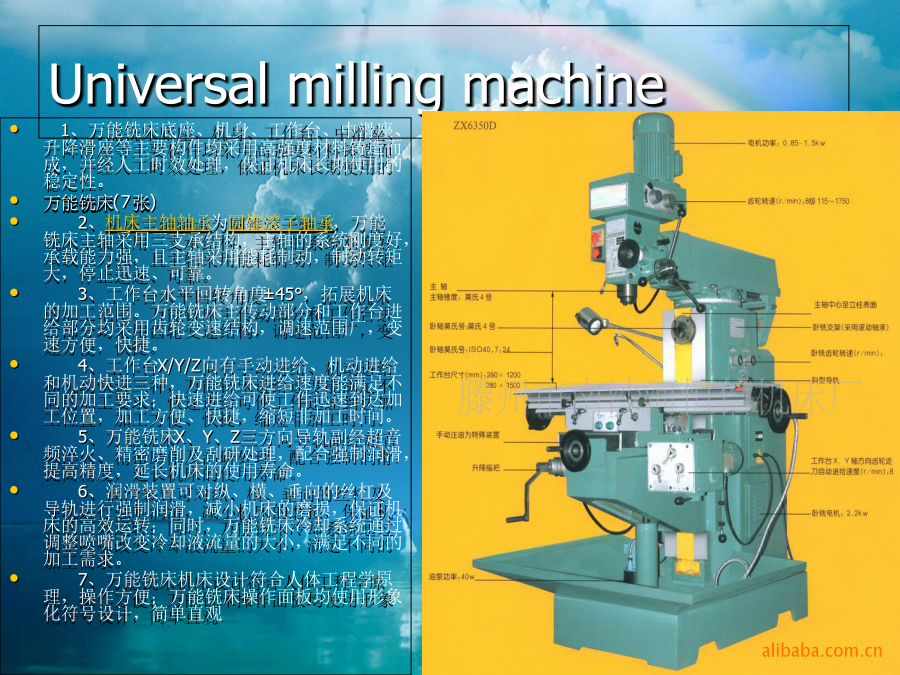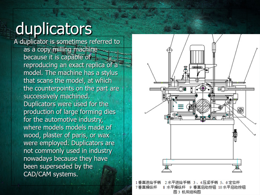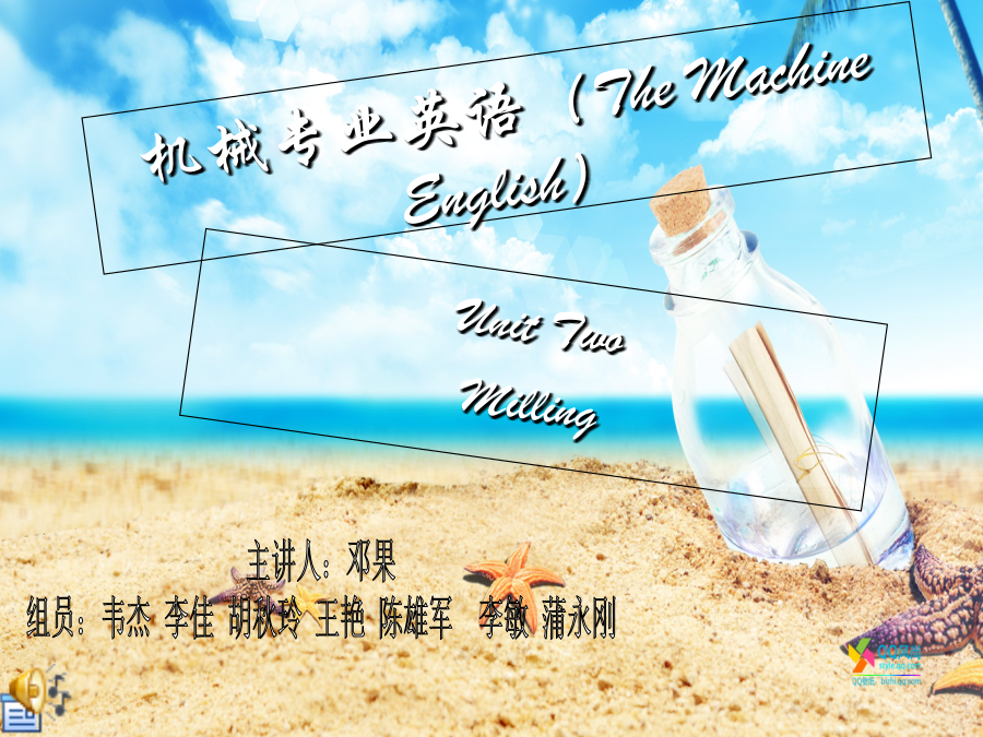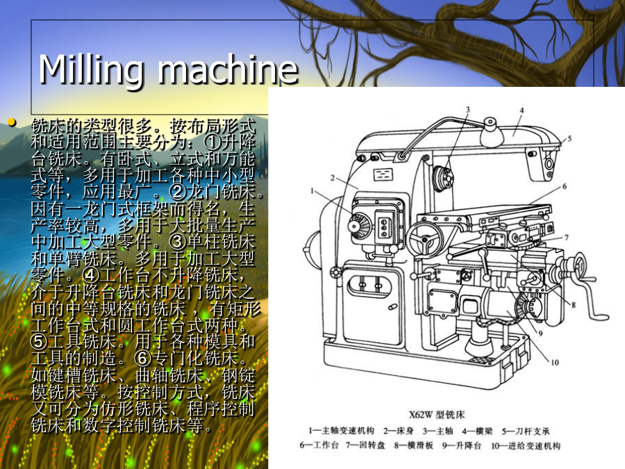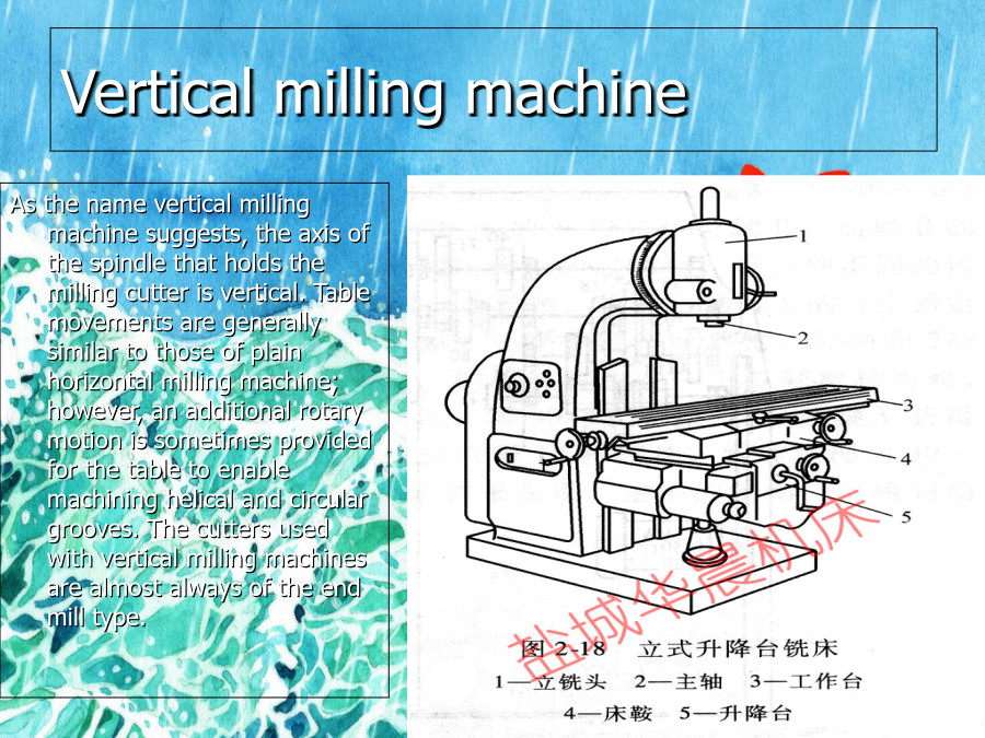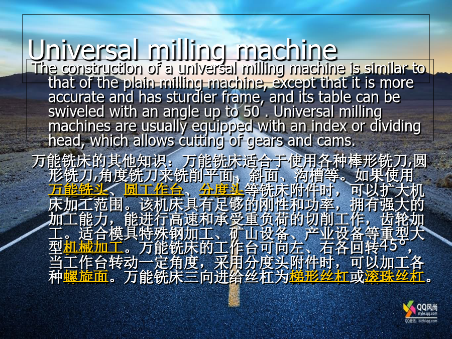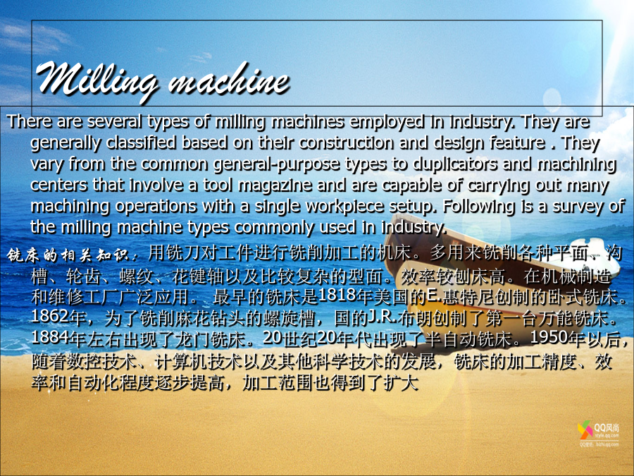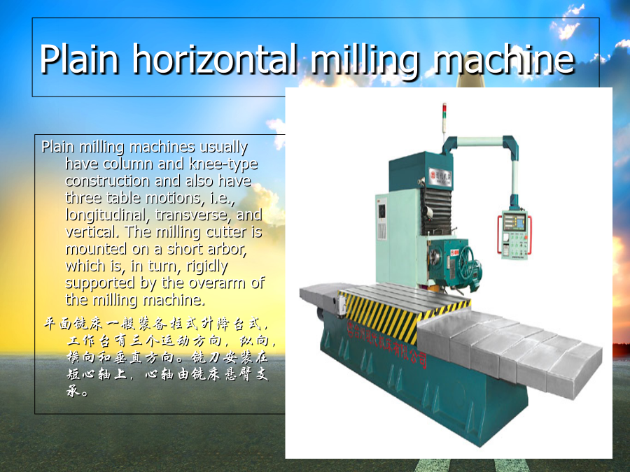 机械专业英语(TheMachineEnglish)MillingmachineMillingmachinePlainhorizontalmillingmachineUniversalmillingmachineUniversalmillingmachineVerticalmillingmachineduplicatorsMachiningcentersTheendThankyou人生