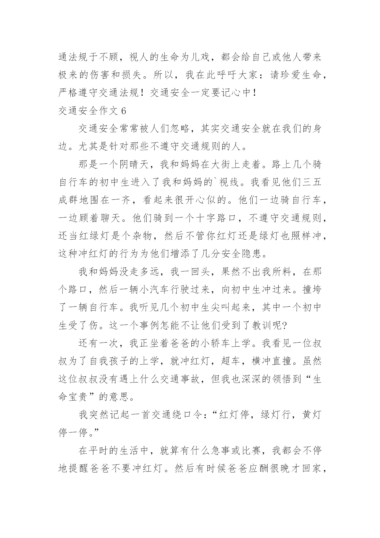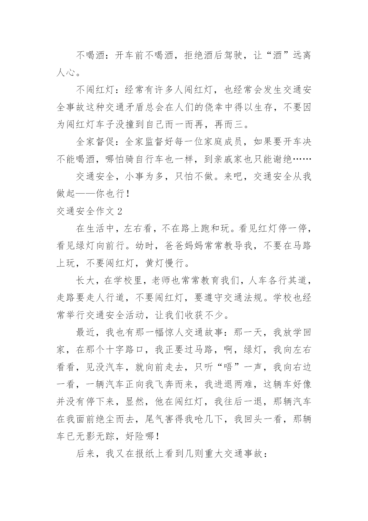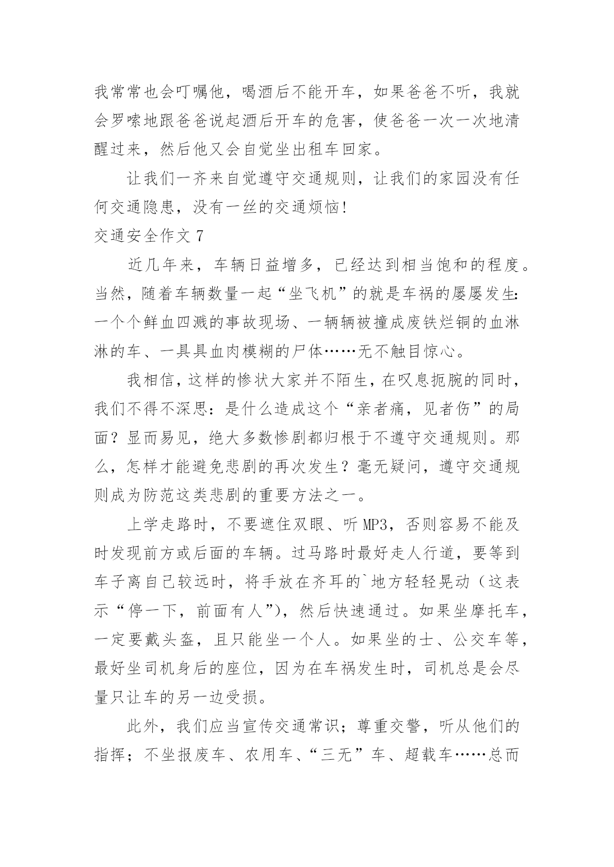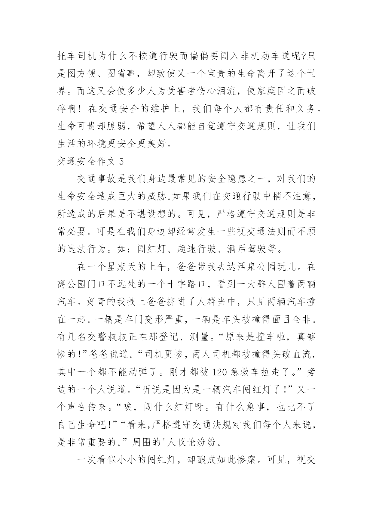 交通安全作文交通安全作文【热】在平凡的学习、工作、生活中,许多人都写过作文吧,作文一定要做到主题集中,围绕同一主题作深入阐述,切忌东拉西扯,主题涣散甚至无主题。如何写一篇有思想、有文采的作文呢?以下是小编为大家整理的交通安全作文,希望对大家有所帮助。交通安全作文1交通安全无人不知,无人不晓。但就是这样家喻户晓法则,许多人还不以为是,甚而一次又一次触犯法律。震惊全国的6.30张明宝案,牵动了多少人的`心!五死四伤的惨案,谁来负责?谁来承担?“张明宝!”!不!是我们大家!如果不是我们大家拼命饮酒,酿成一次又一次酒后驾驶惨祸;如果不是我们大家拼命说“多喝点不要紧!”……会发生这起交通严重醉酒驾驶事故吗?所以,我们每个人都要为这九条生命加张明宝这条生命负责!据统计,全球大约每年有127万人死于交通安全事故,难道这还不够吗?我们一定要携手共创交通安全!交通安全很简单,不喝酒,不闯红灯,不接听手机,不说话,注意力集中……这些都是很普通的小事,只需动动手就可做到,更能避免殃及人命无数的交通安全事故!不喝酒:开车前不喝酒,拒绝酒后驾驶,让“酒”远离人心。不闯红灯:经常有许多人闯红灯,也经常会发生交通安全事故这种交通矛盾总会在人们的侥幸中得以生存,不要因为闯红灯车子没撞到自己而一而再,再而三。全家督促:全家监督好每一位家庭成员,如果要开车决不能喝酒,哪怕骑自行车也一样,到亲戚家也只能谢绝……交通安全,小事为多,只怕不做。来吧,交通安全从我做起——你也行!交通安全作文2在生活中,左右看,不在路上跑和玩。看见红灯停一停,看见绿灯向前行。幼时,爸爸妈妈常常教导我,不要在马路上玩,不要闯红灯,黄灯慢行。长大,在学校里,老师也常常教育我们,人车各行其道,走路要走人行道,不要闯红灯,要遵守交通法规。学校也经常举行交通安全活动,让我们收获不少。最近,我也有那一幅惊人交通故事:那一天,我放学回家,在那个十字路口,我正要过马路,啊,绿灯,我向左右看看,见没汽车,就向前走去,只听“唔”一声,我向右边一看,一辆汽车正向我飞奔而来,我进退两难,这辆车好像并没有停下来,显然,他在闯红灯,我往后一退,那辆汽车在我面前绝尘而去,尾气害得我呛几下,我回头一看,那辆车已无影无踪,好险哪!后来,我又在报纸上看到几则重大交通事故:8月6日,沪昆高速特大交通事故至17人死亡。8月9日傍晚,在日湖公园旁人行道上,13岁蓉蓉被出租车撞,在昏迷中……现在我已经将交通规则牢牢地记在心上:当我们走在繁忙大街上,我会拉着爸爸妈妈手,靠街道右边走;穿过马路时,我们先左右看再走在斑马线上;有一天,爸爸送我上学,嗨!又是红灯,虽然我心急万分,但还是提醒他不要闯红灯,爸爸也是一个遵守交通人。朋友们:让我们一起自觉准受交通规则,让明天,更加美好。交通安全作文3小时候,稚气未泯的我就喜欢站在小板凳上模仿交警叔叔指挥交通。在3月16日那天,我终于如愿以偿地去了交警大队。在去交警大队的路上我就充满了好奇,交警大队里面有什么新鲜的高科技呢?带着这个疑问我来到了交警大队。到了那里,交警大队的宋警官热情地接待了我们。一位警察阿姨带领我们参观了高科技展厅。里面给我印象最深的就是悲伤墙和幸福墙,悲伤墙上都是一些车毁人亡的照片。而幸福墙上都是一家人欢乐玩耍的照片。据讲解员阿姨说,欢乐与悲伤只有一步,但是后果差距很大。最有意思的是一种集对讲机、摄像机于一体的机器,随时可以调查取证、请求支援与通报情况等。这种机器方便了交警叔叔的工作。在其他小记者参观之余,我采访了宋警官:“您从事交警行业多少年了?”“32年了。”宋警官自豪地回答,并且说他不怕艰苦和劳累,非常热爱交通警察这个职业。我又问:您对中小学生违反交通规则有什“么看法呢?”宋警官说:不断给学生讲交通“法规,使其养成遵守交通法规的习惯。”最后,我们在宣誓墙前庄严宣誓,保证做一名遵守交通规则的.人。这次去交警大队,理解了交警叔叔的艰辛,也揭开了交警大队的神秘面纱。交通安全作文4宽阔的马路,先进的道路安全设施,一直在更新的交通法规,难道真能对交通安全起到持久稳固的作用吗?如果是,那为何交通事故还是年年不断的频繁发生?可见交通安全保障并没有达到真正的效果。而这究竟又是谁的错呢?这是人们的错。国家给了我们交通安全的保障,得失我们往往却只顾自己的方便,只顾自己的利益,并未能好好的遵守交通法规。大家想过如此的后果会是怎样的吗?看!那辆超载的大卡车正吃力的前进着,司机见了红灯也不停车,随意乱闯,只是为了赶交差,得一笔工钱,不顾违章的后果。可这位司机知道吗?只是为了这么一笔工钱违反交规,一刹那间就很有可能会葬送生命,而这无价的生命又岂是金钱可以买到的`?看!那场悲剧终究还是上演了,鲜血染红了车轮,受害者的亲人悲痛万分……啊!又是一场悲剧!人行道上,一辆摩托车疾速行驶,将一位老奶奶撞倒在