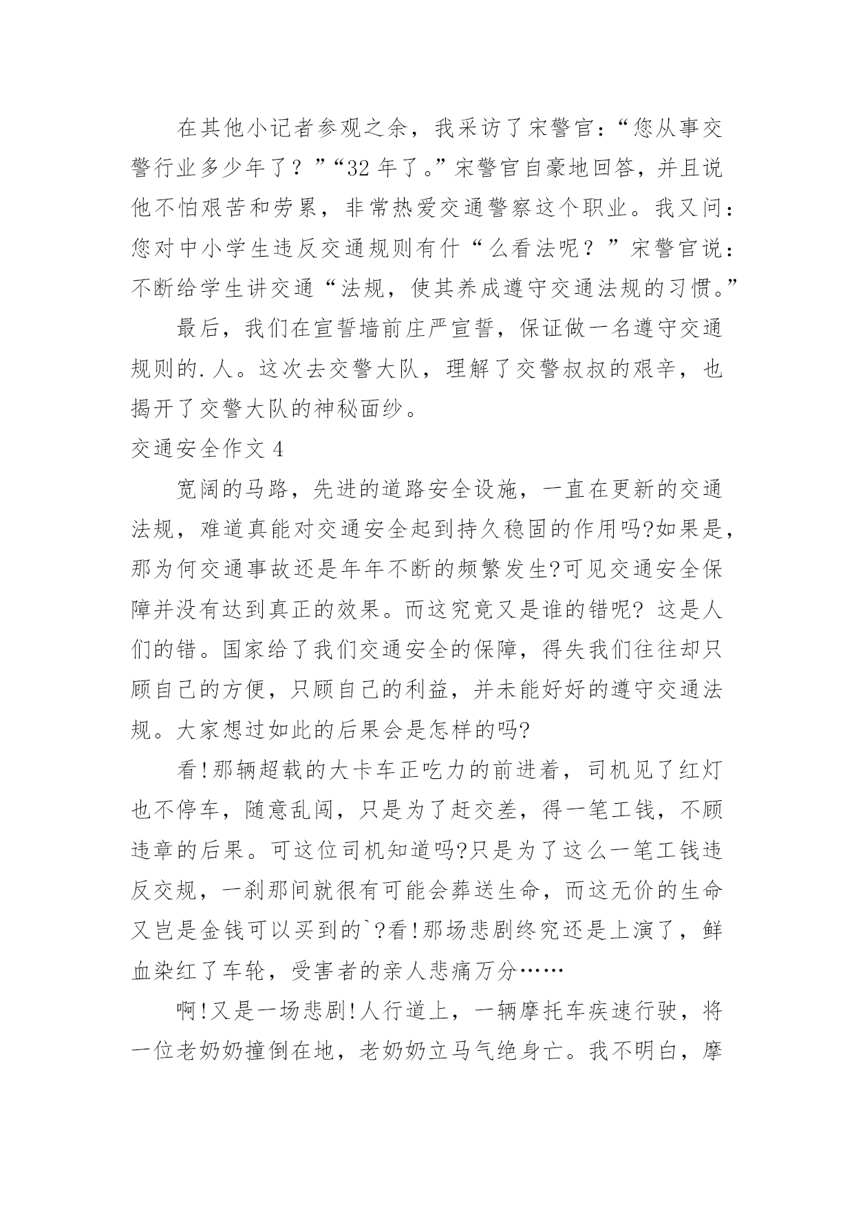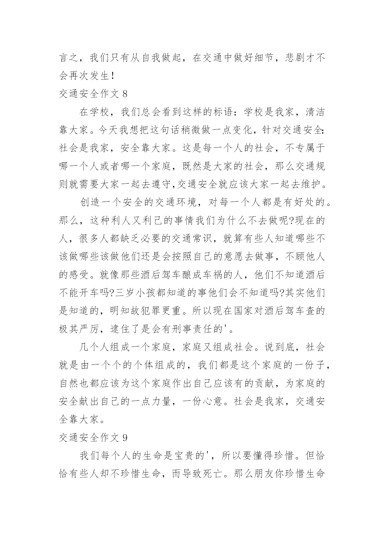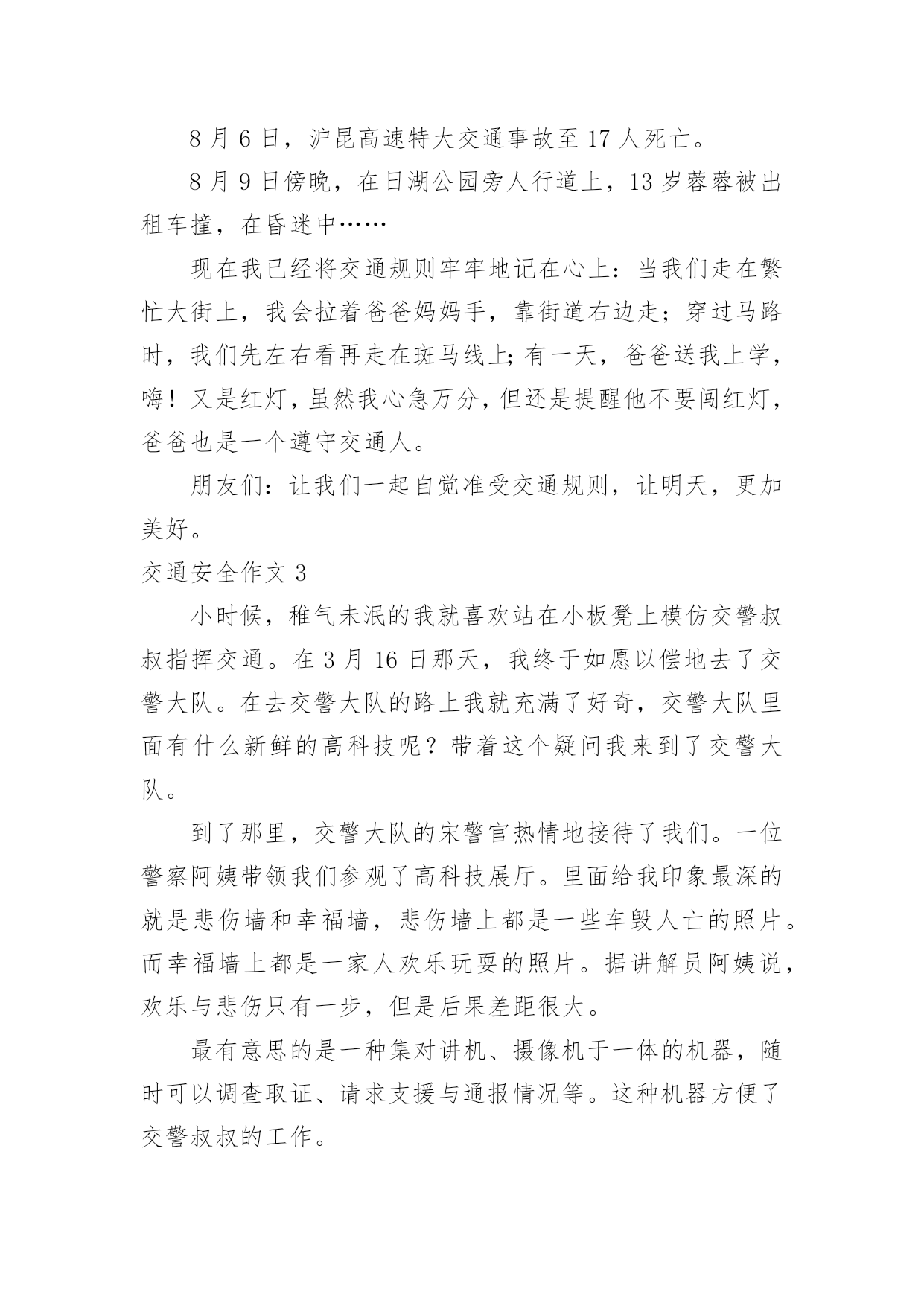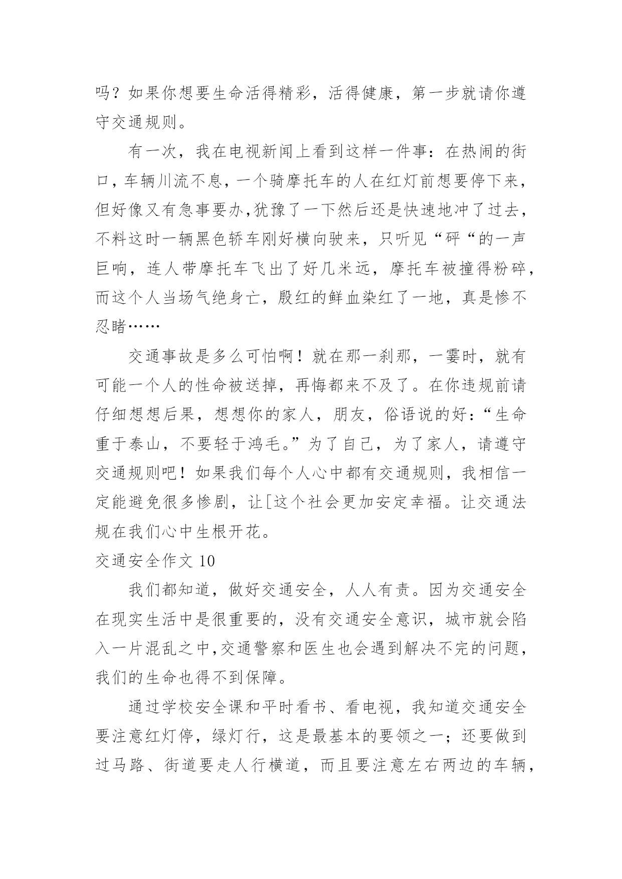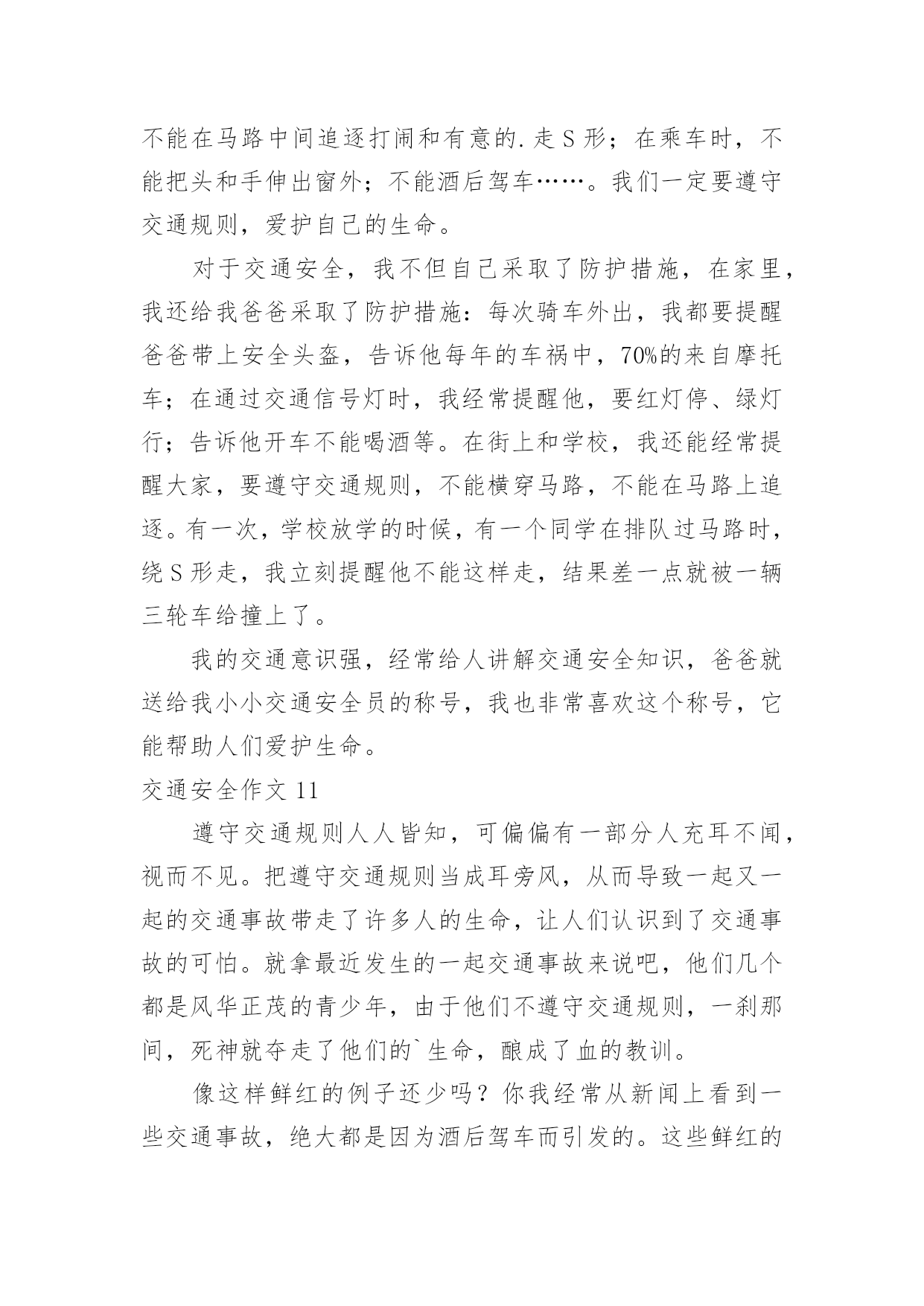 交通安全作文交通安全作文【热】在平凡的学习、工作、生活中,许多人都写过作文吧,作文一定要做到主题集中,围绕同一主题作深入阐述,切忌东拉西扯,主题涣散甚至无主题。如何写一篇有思想、有文采的作文呢?以下是小编为大家整理的交通安全作文,希望对大家有所帮助。交通安全作文1交通安全无人不知,无人不晓。但就是这样家喻户晓法则,许多人还不以为是,甚而一次又一次触犯法律。震惊全国的6.30张明宝案,牵动了多少人的`心!五死四伤的惨案,谁来负责?谁来承担?“张明宝!”!不!是我们大家!如果不是我们大家拼命饮酒,酿成一次又一次酒后驾驶惨祸;如果不是我们大家拼命说“多喝点不要紧!”……会发生这起交通严重醉酒驾驶事故吗?所以,我们每个人都要为这九条生命加张明宝这条生命负责!据统计,全球大约每年有127万人死于交通安全事故,难道这还不够吗?我们一定要携手共创交通安全!交通安全很简单,不喝酒,不闯红灯,不接听手机,不说话,注意力集中……这些都是很普通的小事,只需动动手就可做到,更能避免殃及人命无数的交通安全事故!不喝酒:开车前不喝酒,拒绝酒后驾驶,让“酒”远离人心。不闯红灯:经常有许多人闯红灯,也经常会发生交通安全事故这种交通矛盾总会在人们的侥幸中得以生存,不要因为闯红灯车子没撞到自己而一而再,再而三。全家督促:全家监督好每一位家庭成员,如果要开车决不能喝酒,哪怕骑自行车也一样,到亲戚家也只能谢绝……交通安全,小事为多,只怕不做。来吧,交通安全从我做起——你也行!交通安全作文2在生活中,左右看,不在路上跑和玩。看见红灯停一停,看见绿灯向前行。幼时,爸爸妈妈常常教导我,不要在马路上玩,不要闯红灯,黄灯慢行。长大,在学校里,老师也常常教育我们,人车各行其道,走路要走人行道,不要闯红灯,要遵守交通法规。学校也经常举行交通安全活动,让我们收获不少。最近,我也有那一幅惊人交通故事:那一天,我放学回家,在那个十字路口,我正要过马路,啊,绿灯,我向左右看看,见没汽车,就向前走去,只听“唔”一声,我向右边一看,一辆汽车正向我飞奔而来,我进退两难,这辆车好像并没有停下来,显然,他在闯红灯,我往后一退,那辆汽车在我面前绝尘而去,尾气害得我呛几下,我回头一看,那辆车已无影无踪,好险哪!后来,我又在报纸上看到几则重大交通事故:8月6日,沪昆高速特大交通事故至17人死亡。8月9日傍晚,在日湖公园旁人行道上,13岁蓉蓉被出租车撞,在昏迷中……现在我已经将交通规则牢牢地记在心上:当我们走在繁忙大街上,我会拉着爸爸妈妈手,靠街道右边走;穿过马路时,我们先左右看再走在斑马线上;有一天,爸爸送我上学,嗨!又是红灯,虽然我心急万分,但还是提醒他不要闯红灯,爸爸也是一个遵守交通人。朋友们:让我们一起自觉准受交通规则,让明天,更加美好。交通安全作文3小时候,稚气未泯的我就喜欢站在小板凳上模仿交警叔叔指挥交通。在3月16日那天,我终于如愿以偿地去了交警大队。在去交警大队的路上我就充满了好奇,交警大队里面有什么新鲜的高科技呢?带着这个疑问我来到了交警大队。到了那里,交警大队的宋警官热情地接待了我们。一位警察阿姨带领我们参观了高科技展厅。里面给我印象最深的就是悲伤墙和幸福墙,悲伤墙上都是一些车毁人亡的照片。而幸福墙上都是一家人欢乐玩耍的照片。据讲解员阿姨说,欢乐与悲伤只有一步,但是后果差距很大。最有意思的是一种集对讲机、摄像机于一体的机器,随时可以调查取证、请求支援与通报情况等。这种机器方便了交警叔叔的工作。在其他小记者参观之余,我采访了宋警官:“您从事交警行业多少年了?”“32年了。”宋警官自豪地回答,并且说他不怕艰苦和劳累,非常热爱交通警察这个职业。我又问:您对中小学生违反交通规则有什“么看法呢?”宋警官说:不断给学生讲交通“法规,使其养成遵守交通法规的习惯。”最后,我们在宣誓墙前庄严宣誓,保证做一名遵守交通规则的.人。这次去交警大队,理解了交警叔叔的艰辛,也揭开了交警大队的神秘面纱。交通安全作文4宽阔的马路,先进的道路安全设施,一直在更新的交通法规,难道真能对交通安全起到持久稳固的作用吗?如果是,那为何交通事故还是年年不断的频繁发生?可见交通安全保障并没有达到真正的效果。而这究竟又是谁的错呢?这是人们的错。国家给了我们交通安全的保障,得失我们往往却只顾自己的方便,只顾自己的利益,并未能好好的遵守交通法规。大家想过如此的后果会是怎样的吗?看!那辆超载的大卡车正吃力的前进着,司机见了红灯也不停车,随意乱闯,只是为了赶交差,得一笔工钱,不顾违章的后果。可这位司机知道吗?只是为了这么一笔工钱违反交规,一刹那间就很有可能会葬送生命,而这无价的生命又岂是金钱可以买到的`?看!那场悲剧终究还是上演了,鲜血染红了车轮,受害者的亲人悲痛万分……啊!又是一场悲剧!人行道上,一辆摩托车疾速行驶,将一位老奶奶撞倒在