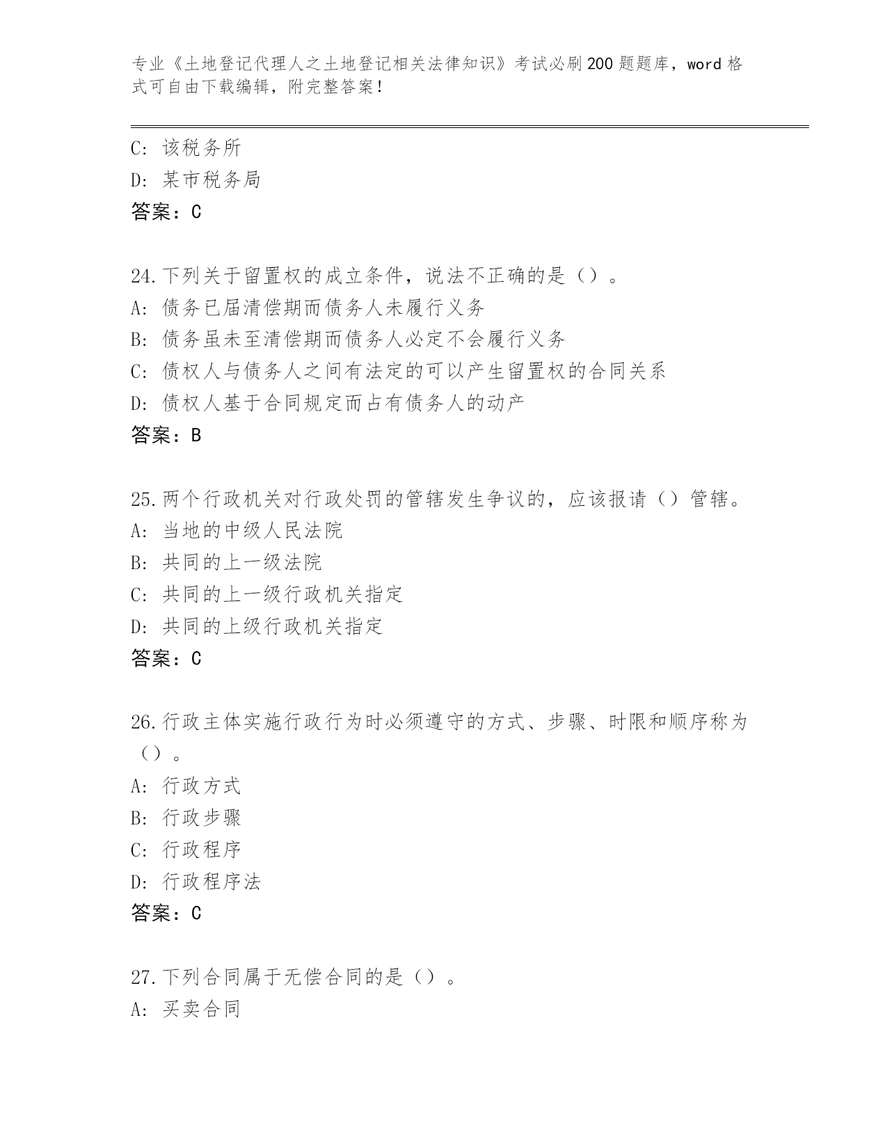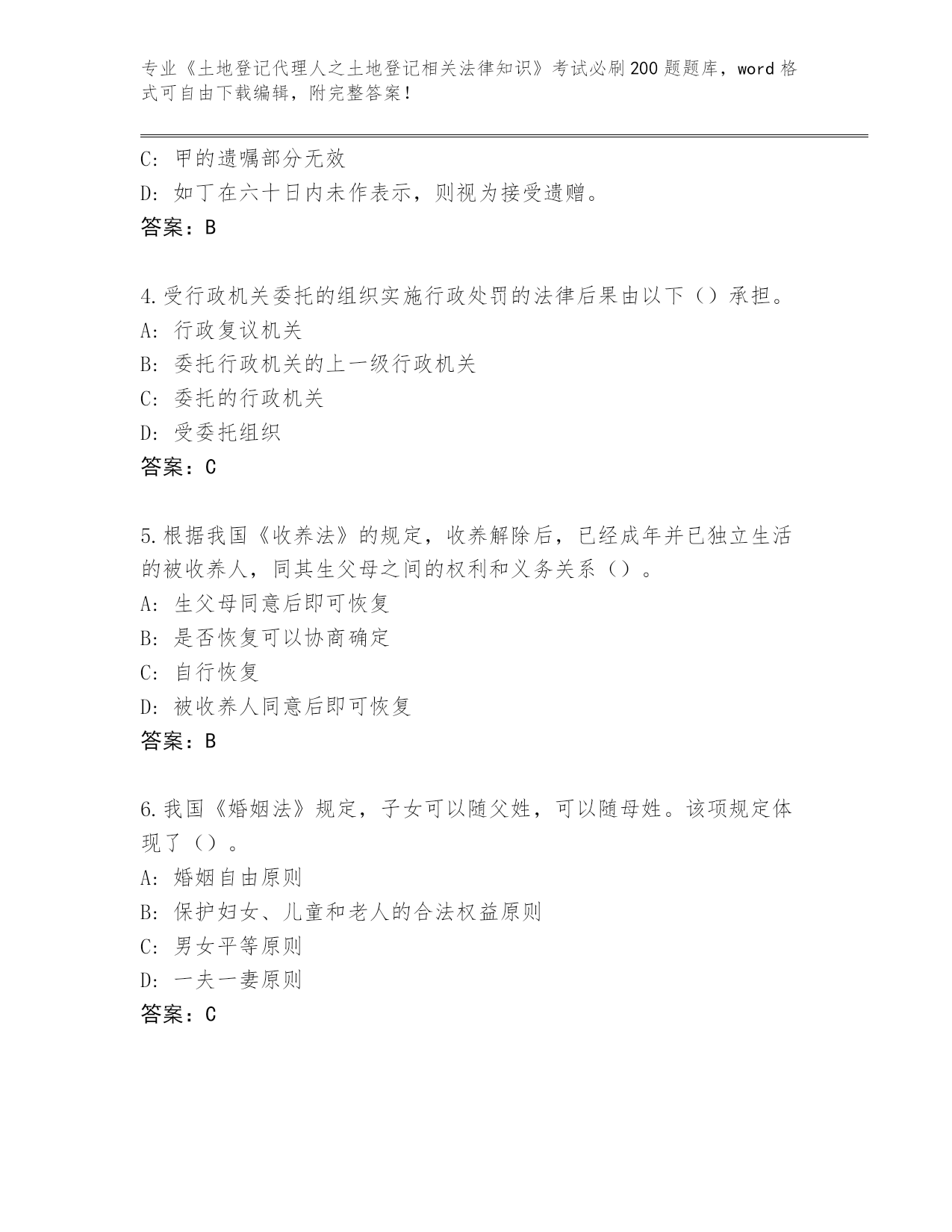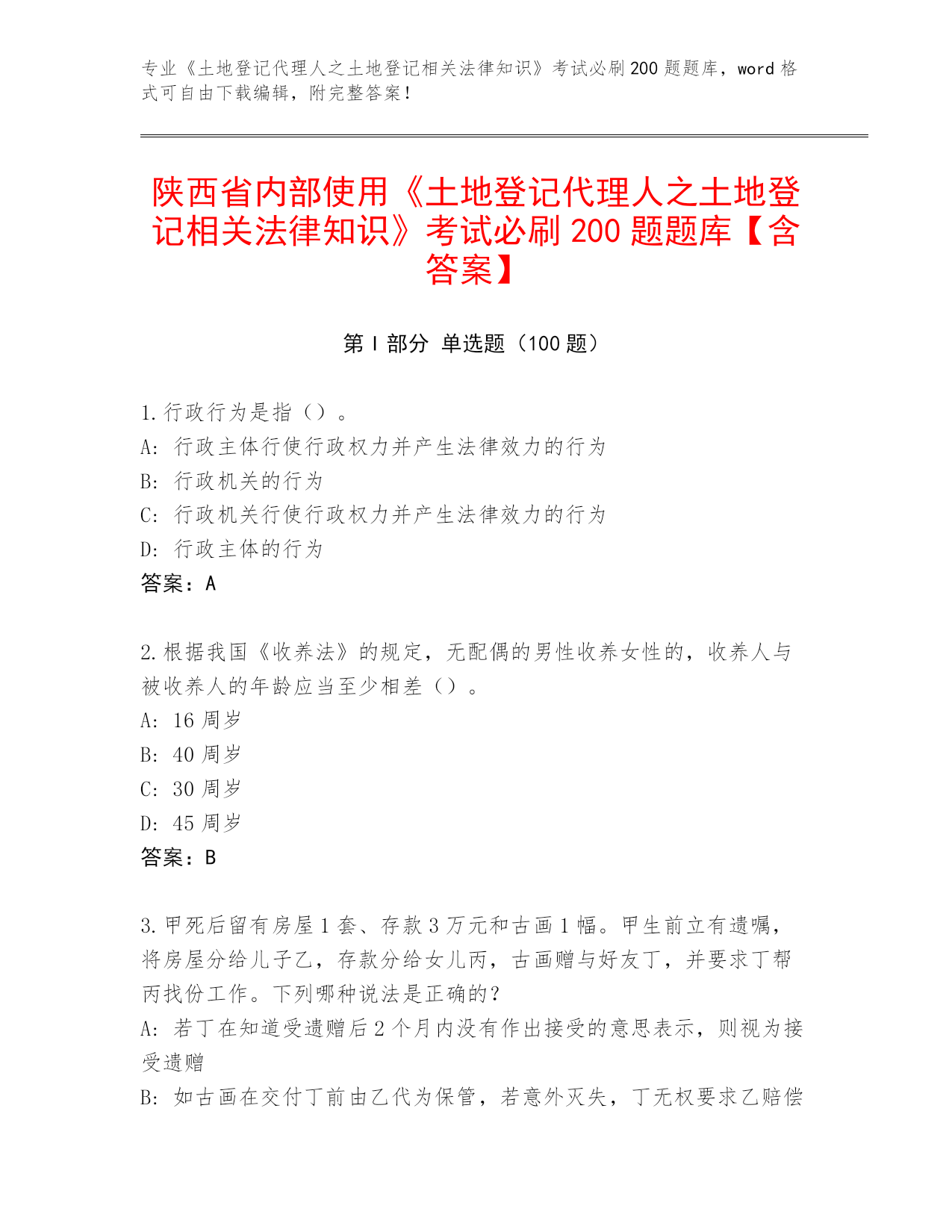 陕西省内部使用《土地登记代理人之土地登记相关法律知识》考试必刷200题题库【含答案】