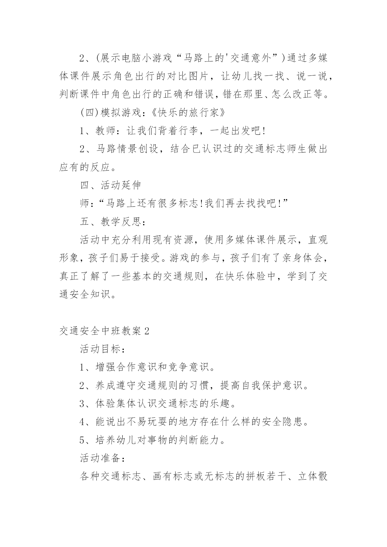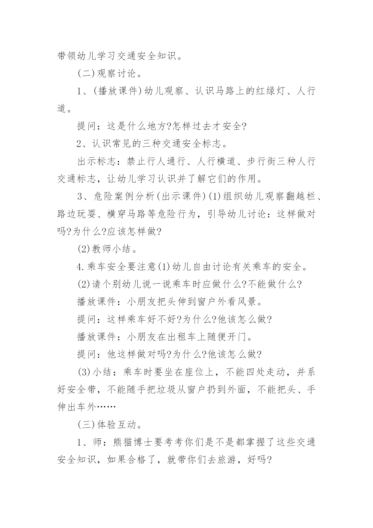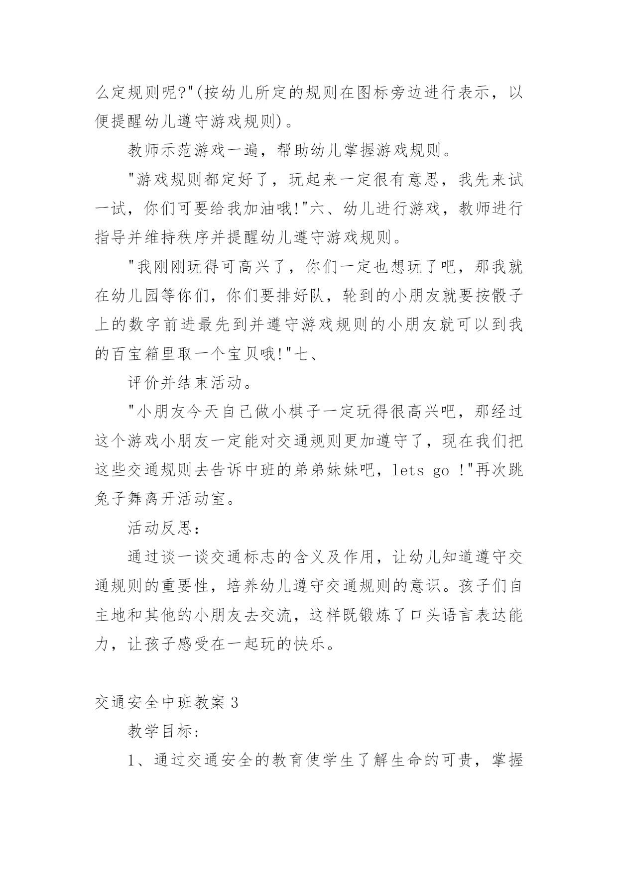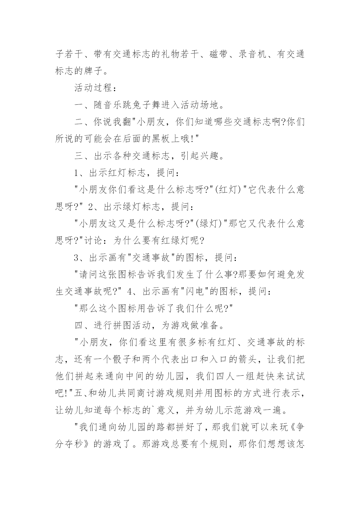 交通安全中班教案作为一位不辞辛劳的人民教师,往往需要进行教案编写工作,编写教案有利于我们科学、合理地支配课堂时间。我们该怎么去写教案呢?下面是小编精心整理的交通安全中班教案,欢迎阅读与收藏。交通安全中班教案1一、活动目标1、引导幼儿认知三种交通标志,初步了解马路上的基本交通安全知识。2、教育幼儿自觉遵守交通法规,提高自我防护能力。3、培养幼儿动脑思考问题、解决问题的能力。4、知道危险来临时如何保护自己,如何逃生。二、活动准备:1、幼儿已有交通生活经验。2、课件:《交通安全很重要》3、实物:交通安全标志图片、玩具方向盘。三、活动过程:(一)引题激趣。1.教师以带领幼儿外出旅行为话题,引入课件。2.(播放课件)幼儿观察课件内容,初步了解过马路的时的危险状况。3.通过课件,引出“熊猫博士”这一交通出行的专家,带领幼儿学习交通安全知识。(二)观察讨论。1、(播放课件)幼儿观察、认识马路上的红绿灯、人行道。提问:这是什么地方?怎样过去才安全?2、认识常见的三种交通安全标志。出示标志:禁止行人通行、人行横道、步行街三种人行交通标志,让幼儿学习认识并了解它们的作用。3、危险案例分析(出示课件)(1)组织幼儿观察翻越栏、路边玩耍、横穿马路等危险行为,引导幼儿讨论:这样做对吗?为什么?应该怎样做?(2)教师小结。4.乘车安全要注意(1)幼儿自由讨论有关乘车的安全。(2)请个别幼儿说一说乘车时应做什么?不能做什么?播放课件:小朋友把头伸到窗户外看风景。提问:这样乘车好不好?为什么?他该怎么做?播放课件:小朋友在出租车上随便开门。提问:他这样做对吗?为什么?他该怎么做?(3)小结:乘车时要坐在座位上,不能四处走动,并系好安全带,不能随手把垃圾从窗户扔到外面,不能把头、手伸出车外……(三)体验互动。1、师:熊猫博士要考考你们是不是都掌握了这些交通安全知识,如果合格了,就带你们去旅游,好吗?2、(展示电脑小游戏“马路上的'交通意外”)通过多媒体课件展示角色出行的对比图片,让幼儿找一找、说一说,判断课件中角色出行的正确和错误,错在那里、怎么改正等。(四)模拟游戏:《快乐的旅行家》1、教师:让我们背着行李,一起出发吧!2、马路情景创设,结合已认识过的交通标志师生做出应有的反应。四、活动延伸师:“马路上还有很多标志!我们再去找找吧!”五、教学反思:活动中充分利用现有资源,使用多媒体课件展示,直观形象,孩子们易于接受。游戏的参与,孩子们有了亲身体会,真正了解了一些基本的交通规则,在快乐体验中,学到了交通安全知识。交通安全中班教案2活动目标:1、增强合作意识和竞争意识。2、养成遵守交通规则的习惯,提高自我保护意识。3、体验集体认识交通标志的乐趣。4、能说出不易玩耍的地方存在什么样的安全隐患。5、培养幼儿对事物的判断能力。活动准备:各种交通标志、画有标志或无标志的拼板若干、立体骰子若干、带有交通标志的礼物若干、磁带、录音机、有交通标志的牌子。活动过程:一、随音乐跳兔子舞进入活动场地。二、你说我翻"小朋友,你们知道哪些交通标志啊?你们所说的可能会在后面的黑板上哦!"三、出示各种交通标志,引起兴趣。1、出示红灯标志,提问:"小朋友你们看这是什么标志呀?"(红灯)"它代表什么意思呀?"2、出示绿灯标志,提问:"小朋友这又是什么标志呀?"(绿灯)"那它又代表什么意思呀?"讨论:为什么要有红绿灯呢?3、出示画有"交通事故"的图标,提问:"请问这张图标告诉我们发生了什么事?那要如何避免发生交通事故呢?"4、出示画有"闪电"的图标,提问:"那么这个图标用告诉了我们什么呢?"四、进行拼图活动,为游戏做准备。"小朋友,你们看这里有很多标有红灯、交通事故的标志,还有一个骰子和两个代表出口和入口的箭头,让我们把他们拼起来通向中间的幼儿园,我们四人一组赶快来试试吧!"五、和幼儿共同商讨游戏规则并用图标的方式进行表示,让幼儿知道每个标志的`意义,并为幼儿示范游戏一遍。"我们通向幼儿园的路都拼好了,那我们就可以来玩《争分夺秒》的游戏了。那游戏总要有个规则,那你们想想该怎么定规则呢?"(按幼儿所定的规则在图标旁边进行表示,以便提醒幼儿遵守游戏规则)。教师示范游戏一遍,帮助幼儿掌握游戏规则。"游戏规则都定好了,玩起来一定很有意思,我先来试一试,你们可要给我加油哦!"六、幼儿进行游戏,教师进行指导并维持秩序并提醒幼儿遵守游戏规则。"我刚刚玩得可高兴了,你们一定也想玩了吧,那我就在幼儿园等你们,你们要排好队,轮到的小朋友就要按骰子上的数字前进最先到并遵守游戏规则的小朋友就可以到我的百宝箱里取一个宝贝哦!"七、评价并结束活动。"小朋友今天自己做小棋子一定玩得很高兴吧,那经过这个游戏小朋友一定能对交通规则更加遵守了,现在我们把这些交通规则去告诉中班的弟弟妹妹吧,letsgo!"再次跳兔子舞离开活动室