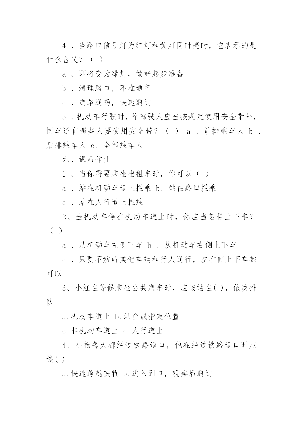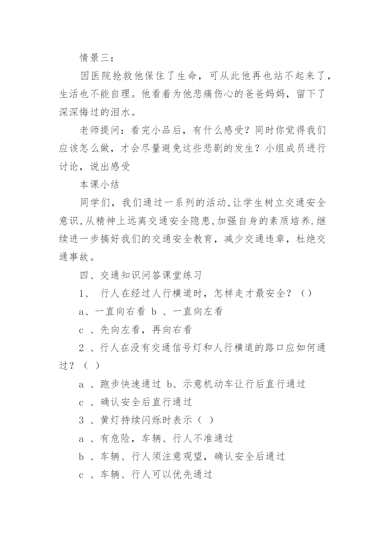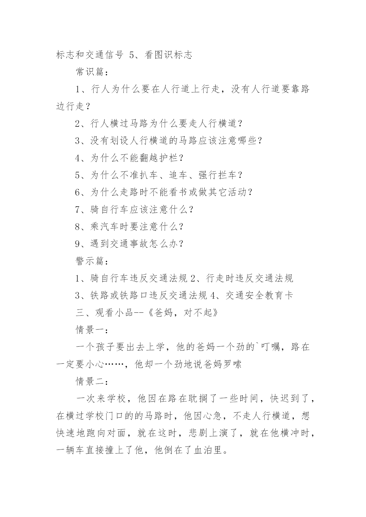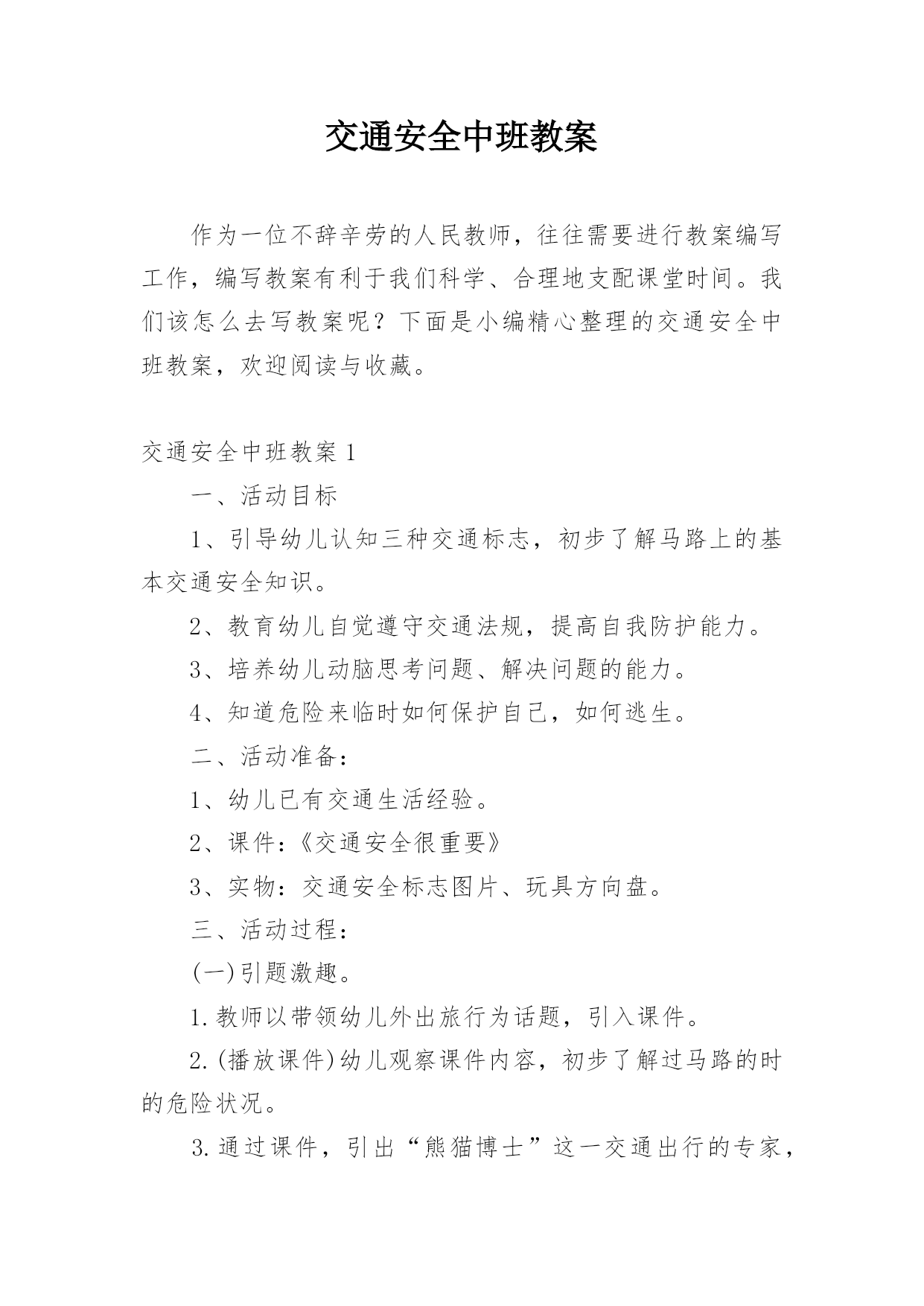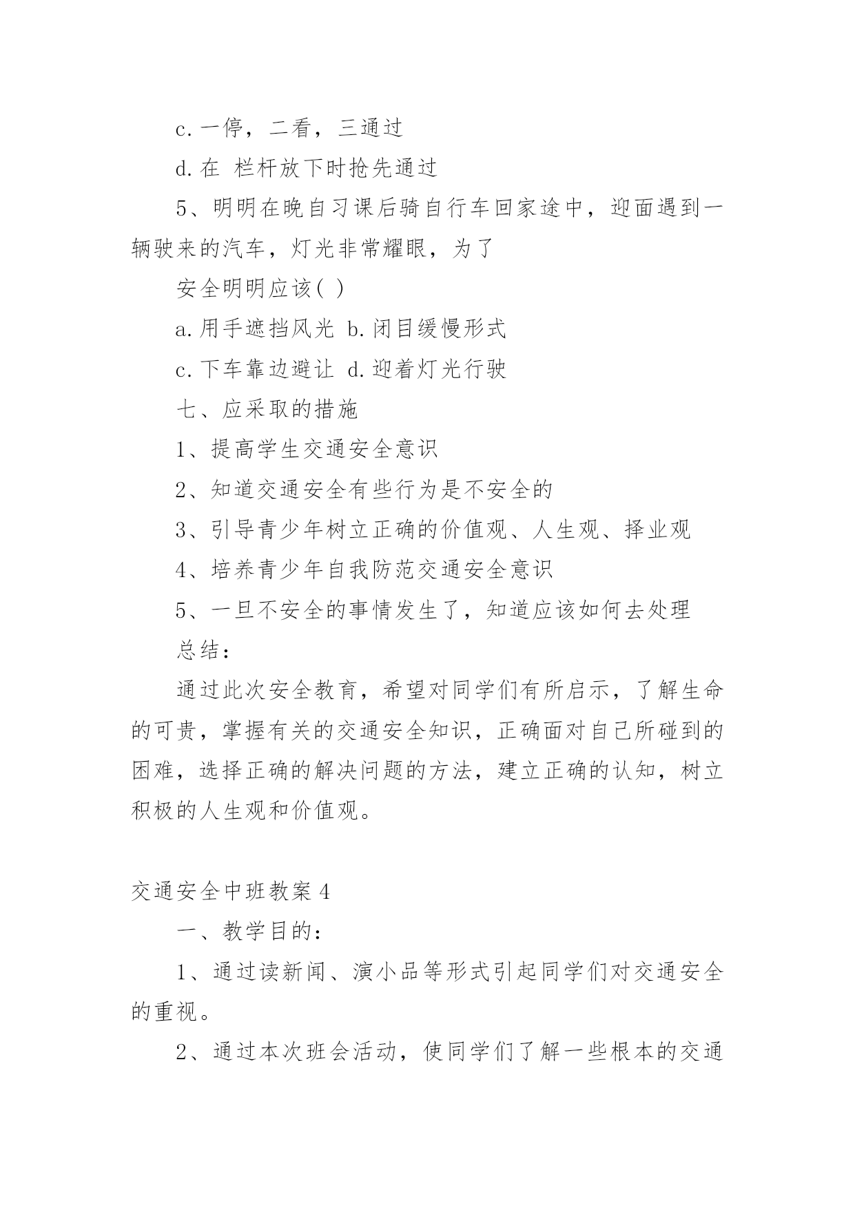 交通安全中班教案作为一位不辞辛劳的人民教师,往往需要进行教案编写工作,编写教案有利于我们科学、合理地支配课堂时间。我们该怎么去写教案呢?下面是小编精心整理的交通安全中班教案,欢迎阅读与收藏。交通安全中班教案1一、活动目标1、引导幼儿认知三种交通标志,初步了解马路上的基本交通安全知识。2、教育幼儿自觉遵守交通法规,提高自我防护能力。3、培养幼儿动脑思考问题、解决问题的能力。4、知道危险来临时如何保护自己,如何逃生。二、活动准备:1、幼儿已有交通生活经验。2、课件:《交通安全很重要》3、实物:交通安全标志图片、玩具方向盘。三、活动过程:(一)引题激趣。1.教师以带领幼儿外出旅行为话题,引入课件。2.(播放课件)幼儿观察课件内容,初步了解过马路的时的危险状况。3.通过课件,引出“熊猫博士”这一交通出行的专家,带领幼儿学习交通安全知识。(二)观察讨论。1、(播放课件)幼儿观察、认识马路上的红绿灯、人行道。提问:这是什么地方?怎样过去才安全?2、认识常见的三种交通安全标志。出示标志:禁止行人通行、人行横道、步行街三种人行交通标志,让幼儿学习认识并了解它们的作用。3、危险案例分析(出示课件)(1)组织幼儿观察翻越栏、路边玩耍、横穿马路等危险行为,引导幼儿讨论:这样做对吗?为什么?应该怎样做?(2)教师小结。4.乘车安全要注意(1)幼儿自由讨论有关乘车的安全。(2)请个别幼儿说一说乘车时应做什么?不能做什么?播放课件:小朋友把头伸到窗户外看风景。提问:这样乘车好不好?为什么?他该怎么做?播放课件:小朋友在出租车上随便开门。提问:他这样做对吗?为什么?他该怎么做?(3)小结:乘车时要坐在座位上,不能四处走动,并系好安全带,不能随手把垃圾从窗户扔到外面,不能把头、手伸出车外……(三)体验互动。1、师:熊猫博士要考考你们是不是都掌握了这些交通安全知识,如果合格了,就带你们去旅游,好吗?2、(展示电脑小游戏“马路上的'交通意外”)通过多媒体课件展示角色出行的对比图片,让幼儿找一找、说一说,判断课件中角色出行的正确和错误,错在那里、怎么改正等。(四)模拟游戏:《快乐的旅行家》1、教师:让我们背着行李,一起出发吧!2、马路情景创设,结合已认识过的交通标志师生做出应有的反应。四、活动延伸师:“马路上还有很多标志!我们再去找找吧!”五、教学反思:活动中充分利用现有资源,使用多媒体课件展示,直观形象,孩子们易于接受。游戏的参与,孩子们有了亲身体会,真正了解了一些基本的交通规则,在快乐体验中,学到了交通安全知识。交通安全中班教案2活动目标:1、增强合作意识和竞争意识。2、养成遵守交通规则的习惯,提高自我保护意识。3、体验集体认识交通标志的乐趣。4、能说出不易玩耍的地方存在什么样的安全隐患。5、培养幼儿对事物的判断能力。活动准备:各种交通标志、画有标志或无标志的拼板若干、立体骰子若干、带有交通标志的礼物若干、磁带、录音机、有交通标志的牌子。活动过程:一、随音乐跳兔子舞进入活动场地。二、你说我翻"小朋友,你们知道哪些交通标志啊?你们所说的可能会在后面的黑板上哦!"三、出示各种交通标志,引起兴趣。1、出示红灯标志,提问:"小朋友你们看这是什么标志呀?"(红灯)"它代表什么意思呀?"2、出示绿灯标志,提问:"小朋友这又是什么标志呀?"(绿灯)"那它又代表什么意思呀?"讨论:为什么要有红绿灯呢?3、出示画有"交通事故"的图标,提问:"请问这张图标告诉我们发生了什么事?那要如何避免发生交通事故呢?"4、出示画有"闪电"的图标,提问:"那么这个图标用告诉了我们什么呢?"四、进行拼图活动,为游戏做准备。"小朋友,你们看这里有很多标有红灯、交通事故的标志,还有一个骰子和两个代表出口和入口的箭头,让我们把他们拼起来通向中间的幼儿园,我们四人一组赶快来试试吧!"五、和幼儿共同商讨游戏规则并用图标的方式进行表示,让幼儿知道每个标志的`意义,并为幼儿示范游戏一遍。"我们通向幼儿园的路都拼好了,那我们就可以来玩《争分夺秒》的游戏了。那游戏总要有个规则,那你们想想该怎么定规则呢?"(按幼儿所定的规则在图标旁边进行表示,以便提醒幼儿遵守游戏规则)。教师示范游戏一遍,帮助幼儿掌握游戏规则。"游戏规则都定好了,玩起来一定很有意思,我先来试一试,你们可要给我加油哦!"六、幼儿进行游戏,教师进行指导并维持秩序并提醒幼儿遵守游戏规则。"我刚刚玩得可高兴了,你们一定也想玩了吧,那我就在幼儿园等你们,你们要排好队,轮到的小朋友就要按骰子上的数字前进最先到并遵守游戏规则的小朋友就可以到我的百宝箱里取一个宝贝哦!"七、评价并结束活动。"小朋友今天自己做小棋子一定玩得很高兴吧,那经过这个游戏小朋友一定能对交通规则更加遵守了,现在我们把这些交通规则去告诉中班的弟弟妹妹吧,letsgo!"再次跳兔子舞离开活动室
