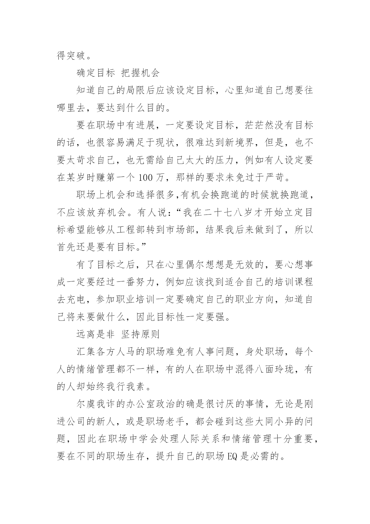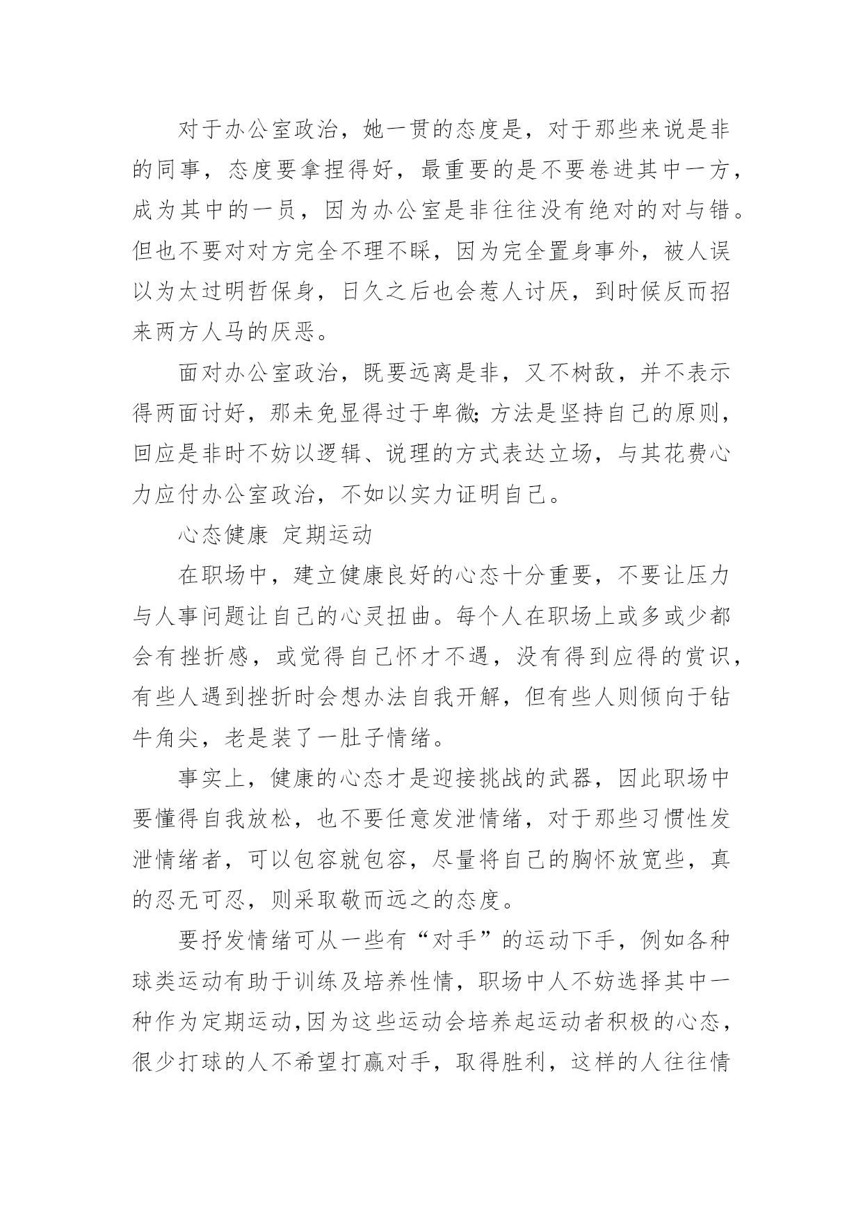 职场秘诀-健康心态职场秘诀-健康心态20岁到35岁是一般人从职场新鲜人到寻求事业发展的重要时期,两名职场过来人告诉你该如何利用职业生涯的这段黄金期。20岁以前大多数人的人生大同小异,大都还在努力完成学业,为未来的职场生涯奠下基础。20岁到35岁是一般人从职场新鲜人到寻求事业发展的重要时期,这时期的职场生涯就像一块海绵,大多数人都是努力吸收,累积职场经验,把握与规划自己的未来。这时期的职场人生,又该如何面对,如何自我磨炼?超越局限扩大视野踏入职场,充分认识自己,了解自己的能力和局限是十分重要的,但了解自己的局限并不是说要甘于局限,而是给自己合理定位,但不要设限,甚至要努力超越局限,建立自己的信心。事实上,每一个成功者都不只是局限于自己的能力,相反的往往是比自己的能力范围还多做一点,也做得比别人期待的还多,职场中要获得成功,就得懂得超越自己原本自以为的局限。20岁到35岁视野应该尝试放远一点,告诉自己面对的是更为宽广的人生,看清楚自己的强处与弱点,更有信心去开创新领域与新工作,只有抱着这样的心态才会在职场上取得突破。确定目标把握机会知道自己的局限后应该设定目标,心里知道自己想要往哪里去,要达到什么目的。要在职场中有进展,一定要设定目标,茫茫然没有目标的话,也很容易满足于现状,很难达到新境界,但是,也不要太苛求自己,也无需给自己太大的压力,例如有人设定要在某岁时赚第一个100万,那样的要求未免过于严苛。职场上机会和选择很多,有机会换跑道的时候就换跑道,不应该放弃机会。有人说:“我在二十七八岁才开始立定目标希望能够从工程部转到市场部,结果我后来做到了,所以首先还是要有目标。”有了目标之后,只在心里偶尔想想是无效的,要心想事成一定要经过一番努力,例如应该找到适合自己的培训课程去充电,参加职业培训一定要确定自己的职业方向,知道自己将来要做什么,因此目标性一定要强。远离是非坚持原则汇集各方人马的职场难免有人事问题,身处职场,每个人的情绪管理都不一样,有的人在职场中混得八面玲珑,有的人却始终我行我素。尔虞我诈的办公室政治的确是很讨厌的事情,无论是刚进公司的新人,或是职场老手,都会碰到这些大同小异的问题,因此在职场中学会处理人际关系和情绪管理十分重要,要在不同的职场生存,提升自己的职场EQ是必需的。对于办公室政治,她一贯的态度是,对于那些来说是非的同事,态度要拿捏得好,最重要的是不要卷进其中一方,成为其中的一员,因为办公室是非往往没有绝对的对与错。但也不要对对方完全不理不睬,因为完全置身事外,被人误以为太过明哲保身,日久之后也会惹人讨厌,到时候反而招来两方人马的厌恶。面对办公室政治,既要远离是非,又不树敌,并不表示得两面讨好,那未免显得过于卑微;方法是坚持自己的原则,回应是非时不妨以逻辑、说理的方式表达立场,与其花费心力应付办公室政治,不如以实力证明自己。心态健康定期运动在职场中,建立健康良好的心态十分重要,不要让压力与人事问题让自己的心灵扭曲。每个人在职场上或多或少都会有挫折感,或觉得自己怀才不遇,没有得到应得的赏识,有些人遇到挫折时会想办法自我开解,但有些人则倾向于钻牛角尖,老是装了一肚子情绪。事实上,健康的心态才是迎接挑战的武器,因此职场中要懂得自我放松,也不要任意发泄情绪,对于那些习惯性发泄情绪者,可以包容就包容,尽量将自己的胸怀放宽些,真的忍无可忍,则采取敬而远之的态度。要抒发情绪可从一些有“对手”的运动下手,例如各种球类运动有助于训练及培养性情,职场中人不妨选择其中一种作为定期运动,因为这些运动会培养起运动者积极的心态,很少打球的人不希望打赢对手,取得胜利,这样的人往往情绪较为正面,而一个人只要有积极的人生态度就不会总是往负面去想,也较不会老是活在怨气中。职场和商场一样,诚信十分重要,只有真诚对待职务和同事,脚踏实地,以自己的真才实学为工作尽力,一定会取得应有的回报。