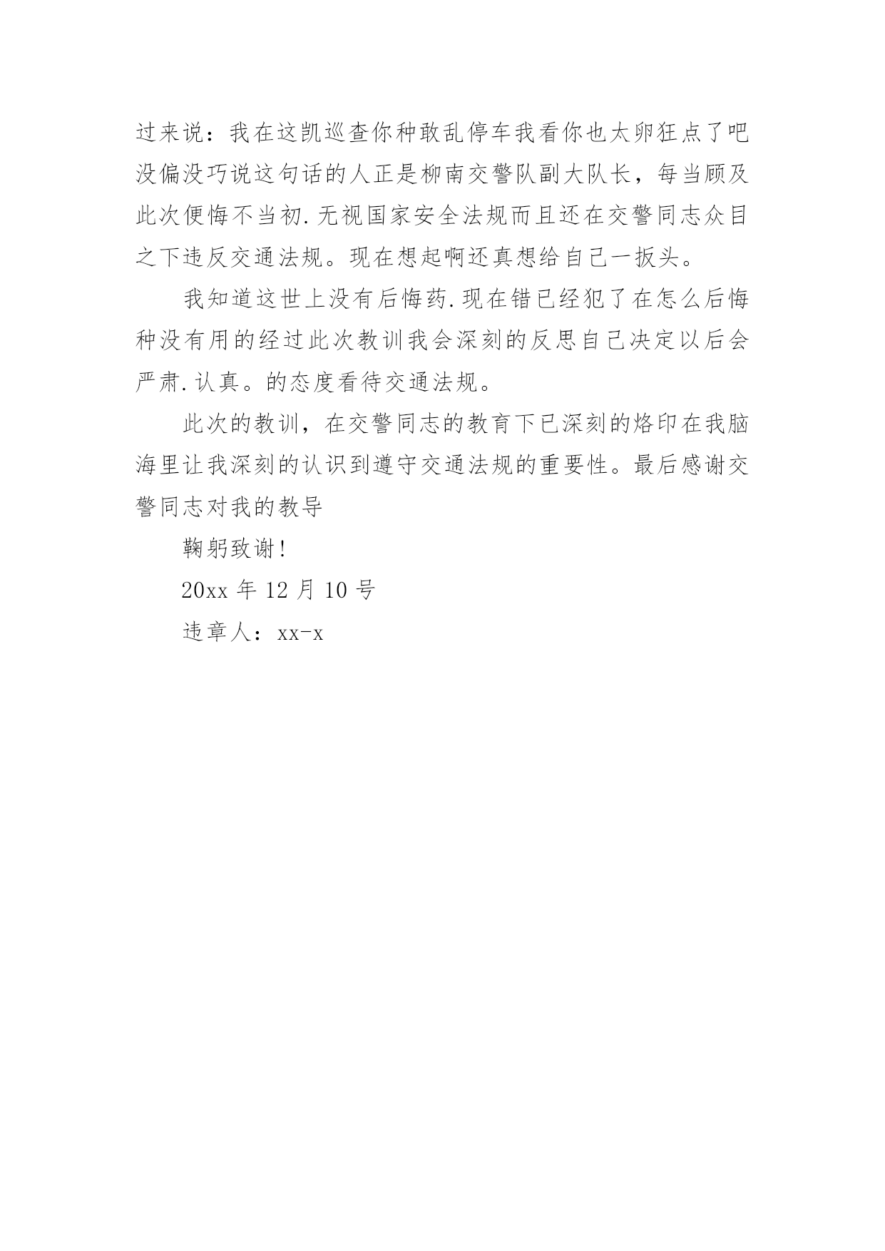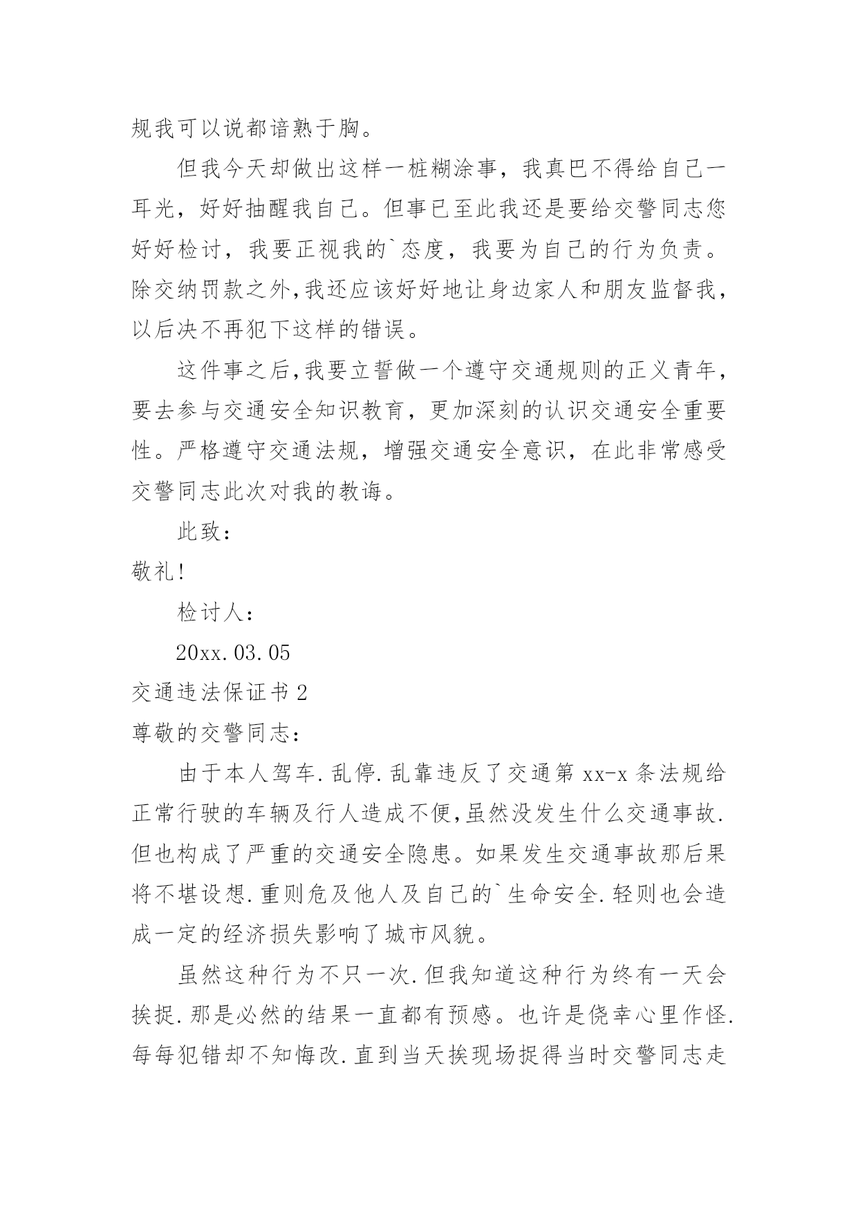 交通违法保证书交通违法保证书在社会发展不断提速的今天,保证书使用的频率越来越高,保证书一般是个人或单位在有所保证时向上级组织或集体发出的一种文书。为了让您不再为写保证书头疼,以下是小编为大家整理的交通违法保证书,欢迎大家借鉴与参考,希望对大家有所帮助。交通违法保证书1尊敬的交警同志:因为我在主观意识上的错误,将我的别克轿车交付给我那还没有驾驶证的朋友去开。严重地违反了交通安全法规,给正常的车辆及行人交通造成不便,造成严重的安全隐患。如果万一发生交通意外,后果将是灾难性的,轻者给车辆和行人造成诸多不便,重则造成严重地人员伤亡和财产损失。如今被交警同志及时抓到,及时制止,及时教育,让我每每考虑到这些问题,心里都感到非常的悔恨和难过。我真的是犯错看,我愧对党和国家的培养,有负于家人朋友的期望。我承认我是一个四肢健全吗,头脑简单的老实人,我做人做事都实实在在。这次违规,我扪心自问是我犯了严重的错误。我也是有几年驾龄的老司机了,各种交通安全法律法规我可以说都谙熟于胸。但我今天却做出这样一桩糊涂事,我真巴不得给自己一耳光,好好抽醒我自己。但事已至此我还是要给交警同志您好好检讨,我要正视我的`态度,我要为自己的行为负责。除交纳罚款之外,我还应该好好地让身边家人和朋友监督我,以后决不再犯下这样的错误。这件事之后,我要立誓做一个遵守交通规则的正义青年,要去参与交通安全知识教育,更加深刻的认识交通安全重要性。严格遵守交通法规,增强交通安全意识,在此非常感受交警同志此次对我的教诲。此致:敬礼!检讨人:20xx.03.05交通违法保证书2尊敬的交警同志:由于本人驾车.乱停.乱靠违反了交通第xx-x条法规给正常行驶的车辆及行人造成不便,虽然没发生什么交通事故.但也构成了严重的交通安全隐患。如果发生交通事故那后果将不堪设想.重则危及他人及自己的`生命安全.轻则也会造成一定的经济损失影响了城市风貌。虽然这种行为不只一次.但我知道这种行为终有一天会挨捉.那是必然的结果一直都有预感。也许是侥幸心里作怪.每每犯错却不知悔改.直到当天挨现场捉得当时交警同志走过来说:我在这凯巡查你种敢乱停车我看你也太卵狂点了吧没偏没巧说这句话的人正是柳南交警队副大队长,每当顾及此次便悔不当初.无视国家安全法规而且还在交警同志众目之下违反交通法规。现在想起啊还真想给自己一扳头。我知道这世上没有后悔药.现在错已经犯了在怎么后悔种没有用的经过此次教训我会深刻的反思自己决定以后会严肃.认真。的态度看待交通法规。此次的教训,在交警同志的教育下已深刻的烙印在我脑海里让我深刻的认识到遵守交通法规的重要性。最后感谢交警同志对我的教导鞠躬致谢!20xx年12月10号违章人:xx-x