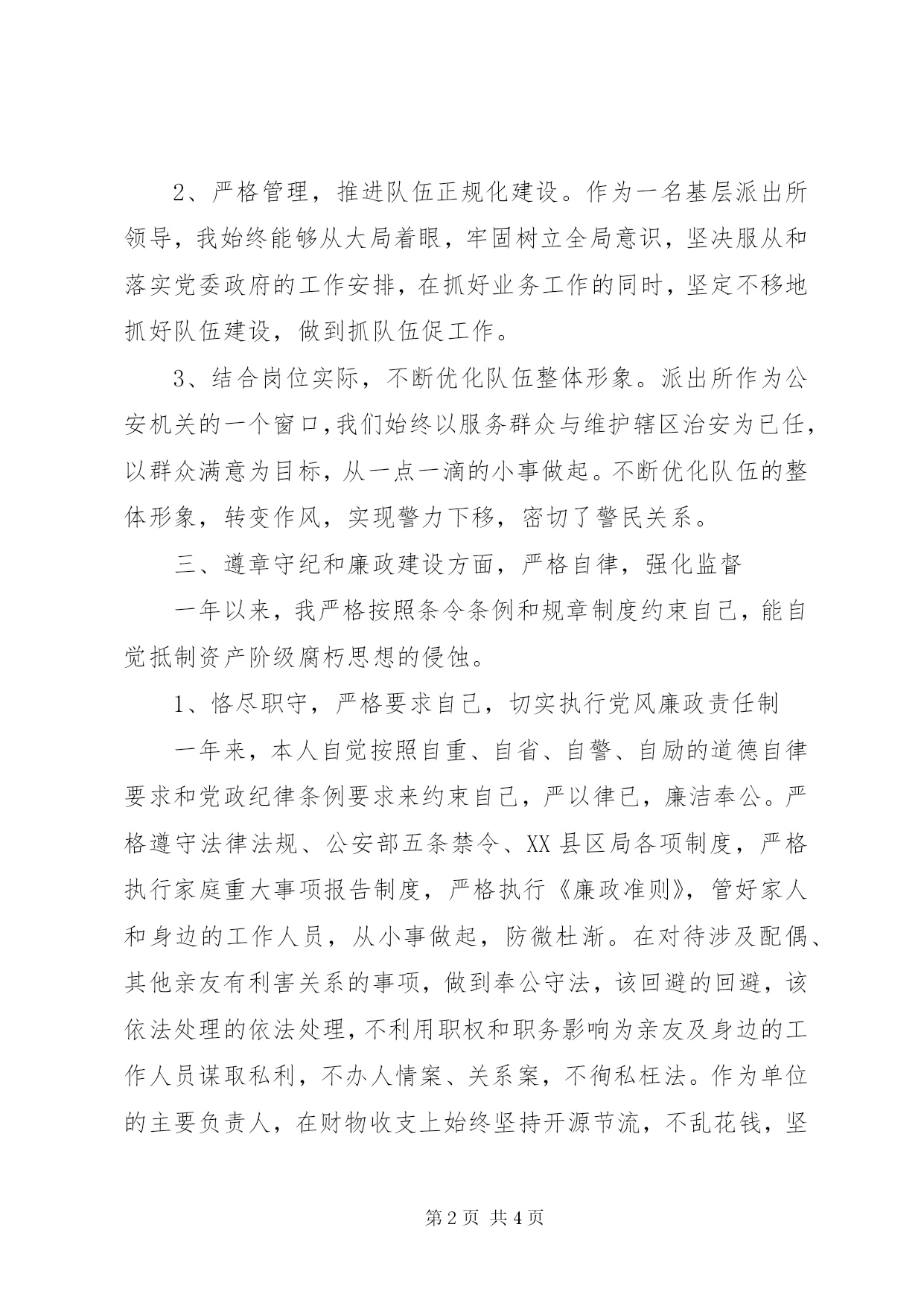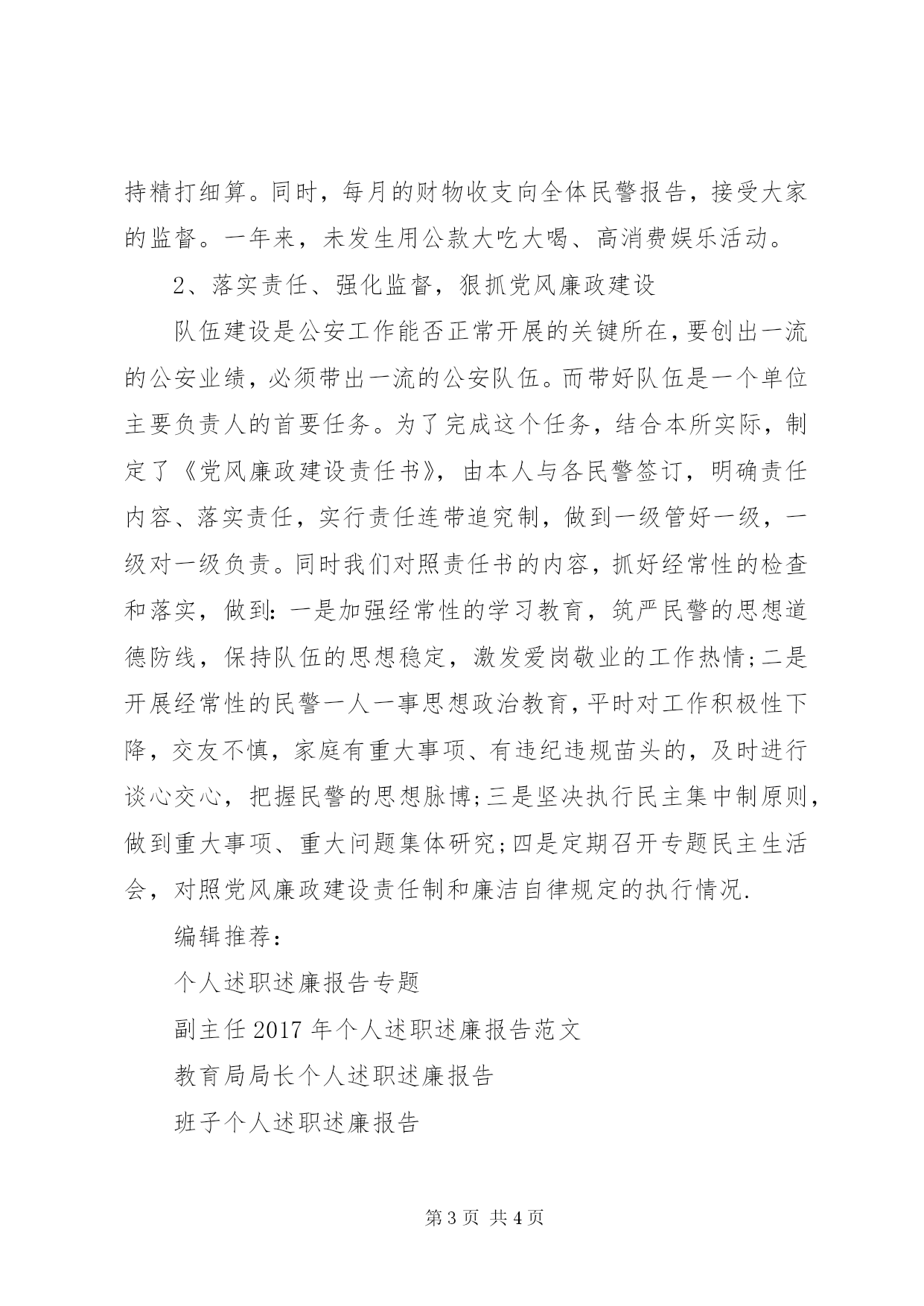 第PAGE\*Arabic\*MERGEFORMAT4页共NUMPAGES\*MERGEFORMAT4页司法警察个人述职述廉报告xx年,本人在监狱党委的正确领导下,紧紧抓住队伍建设这个根本,求真务实,落实责任,强化监督,认真扎实地开展党风廉政建设和反腐败工作,扎实推进特警大队工作的开展,狠抓个人政治理论水平、警务技能提高,严抓民警队伍管理、训练、执勤等各项工作。通过抓教育、严制度、强监督,扎实有效地开展党风廉政建设工作。现将本人一年来党风廉政建设的落实执行情况述职述廉如下:一、认真学习,增强廉政意识,努力提高个人政治素质学习是无止境的。我们应自觉地把学习教育作为终身追求。本人带领全所民警深入学习细化《人民警察法》、《人民警察行为规范》、《公安机关人民警察纪律条令》、《廉政准则》、公安部《五条禁令》等各项法律法规的工作要求,切实加强理想信念、思想政治、纪律作风等各方面的教育,打牢思想政治基础,筑牢思想政治防线。通过警示教育等活动,对新时期加强反腐倡廉的重要性、紧迫性、必要性的认识进一步提高,廉洁从政意识、拒腐防变能力进一步增强,立警为公,执法为民的宗旨思想更趋牢固。二、立足本职岗位,圆满完成各项工作任务1、在实际工作中,我能充分发挥自身作用,推动班子工作稳步前进,自觉发挥一名班子成员的模范带头作用。带头坚持值班制度,组织学习执勤条令,切实增强各类人员执勤意识。2、严格管理,推进队伍正规化建设。作为一名基层派出所领导,我始终能够从大局着眼,牢固树立全局意识,坚决服从和落实党委政府的工作安排,在抓好业务工作的同时,坚定不移地抓好队伍建设,做到抓队伍促工作。3、结合岗位实际,不断优化队伍整体形象。派出所作为公安机关的一个窗口,我们始终以服务群众与维护辖区治安为已任,以群众满意为目标,从一点一滴的小事做起。不断优化队伍的整体形象,转变作风,实现警力下移,密切了警民关系。三、遵章守纪和廉政建设方面,严格自律,强化监督一年以来,我严格按照条令条例和规章制度约束自己,能自觉抵制资产阶级腐朽思想的侵蚀。1、恪尽职守,严格要求自己,切实执行党风廉政责任制一年来,本人自觉按照自重、自省、自警、自励的道德自律要求和党政纪律条例要求来约束自己,严以律已,廉洁奉公。严格遵守法律法规、公安部五条禁令、XX县区局各项制度,严格执行家庭重大事项报告制度,严格执行《廉政准则》,管好家人和身边的工作人员,从小事做起,防微杜渐。在对待涉及配偶、其他亲友有利害关系的事项,做到奉公守法,该回避的回避,该依法处理的依法处理,不利用职权和职务影响为亲友及身边的工作人员谋取私利,不办人情案、关系案,不徇私枉法。作为单位的主要负责人,在财物收支上始终坚持开源节流,不乱花钱,坚持精打细算。同时,每月的财物收支向全体民警报告,接受大家的监督。一年来,未发生用公款大吃大喝、高消费娱乐活动。2、落实责任、强化监督,狠抓党风廉政建设队伍建设是公安工作能否正常开展的关键所在,要创出一流的公安业绩,必须带出一流的公安队伍。而带好队伍是一个单位主要负责人的首要任务。为了完成这个任务,结合本所实际,制定了《党风廉政建设责任书》,由本人与各民警签订,明确责任内容、落实责任,实行责任连带追究制,做到一级管好一级,一级对一级负责。同时我们对照责任书的内容,抓好经常性的检查和落实,做到:一是加强经常性的学习教育,筑严民警的思想道德防线,保持队伍的思想稳定,激发爱岗敬业的工作热情;二是开展经常性的民警一人一事思想政治教育,平时对工作积极性下降,交友不慎,家庭有重大事项、有违纪违规苗头的,及时进行谈心交心,把握民警的思想脉博;三是坚决执行民主集中制原则,做到重大事项、重大问题集体研究;四是定期召开专题民主生活会,对照党风廉政建设责任制和廉洁自律规定的执行情况.编辑推荐:个人述职述廉报告专题副主任2017年个人述职述廉报告范文教育局局长个人述职述廉报告班子个人述职述廉报告2017乡镇干部个人述职述廉报告2017个人述职述廉述德财务科长2017年个人述职述廉报告法院个人述职述廉报告范文2017个人述职述廉述德报告2017个人述职述廉报告所长